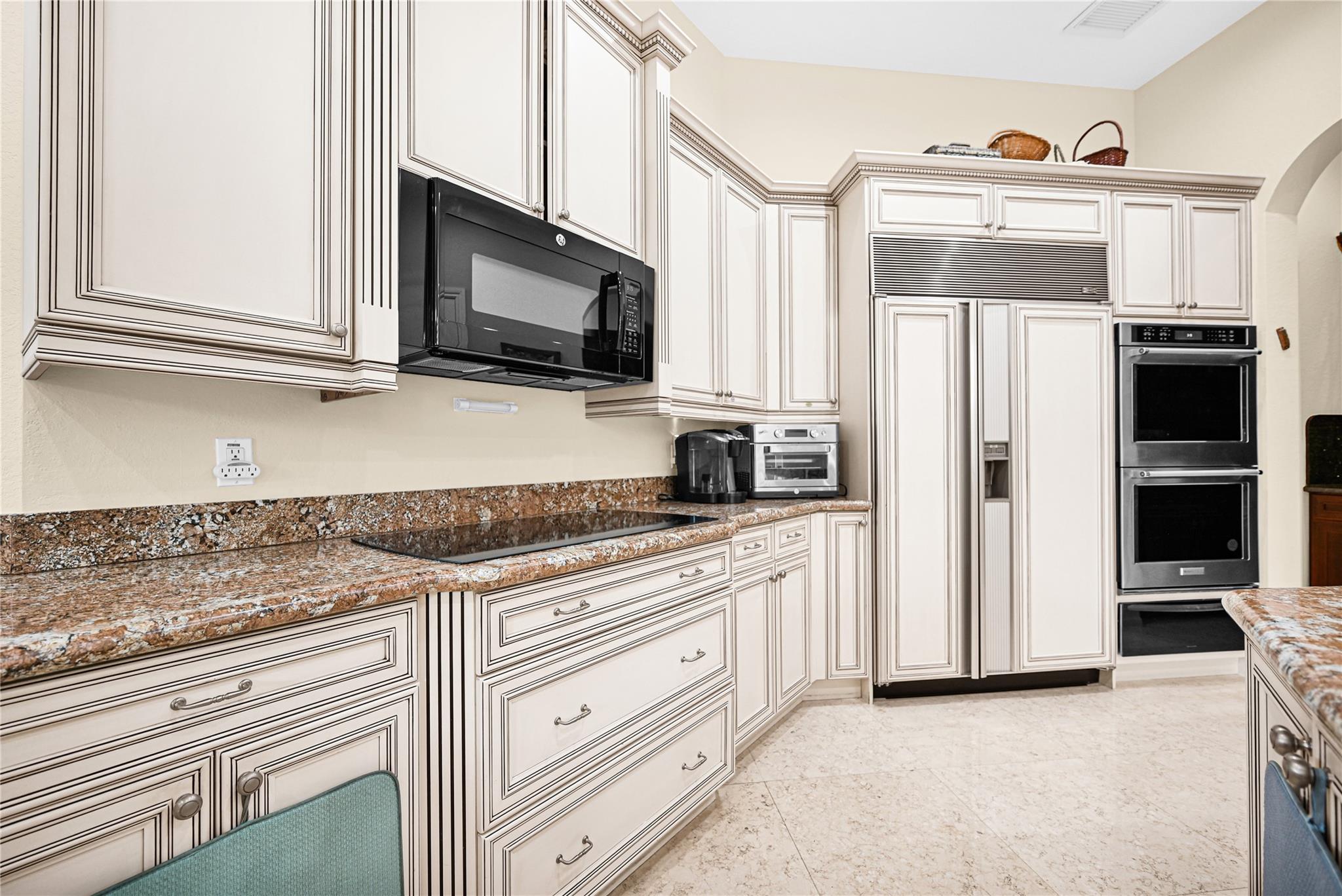 This timeless Mediterranean estate, built in 2003, is located in the prestigious and serene Thornhill Green and blends classic architectural detail with thoughtful, livable luxury. Offering 6 bedrooms, 6 bathrooms, and an oversized 2-car garage, the home features a smooth stucco exterior, a 2022 Spanish tile roof, and a grand arched entryway that sets the tone for what awaits inside. As you enter, architectural detailing abounds—arched doorways, tray and coffered ceilings, and refined millwork create a luxurious yet inviting ambiance. The main level flooring is finished in stunning Jerusalem stone. The heart of the home is the expansive chef’s kitchen, which opens to soaring ceilings and airy double-height windows that fill the space with natural light and lush garden views.