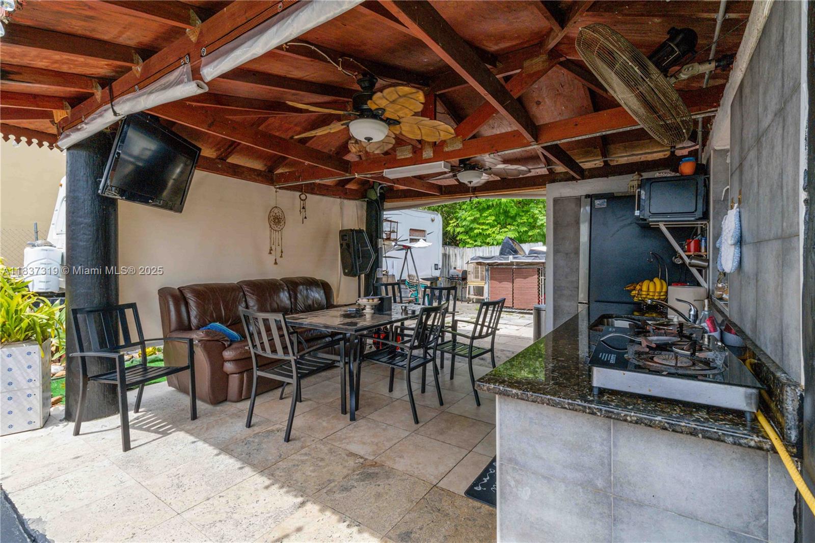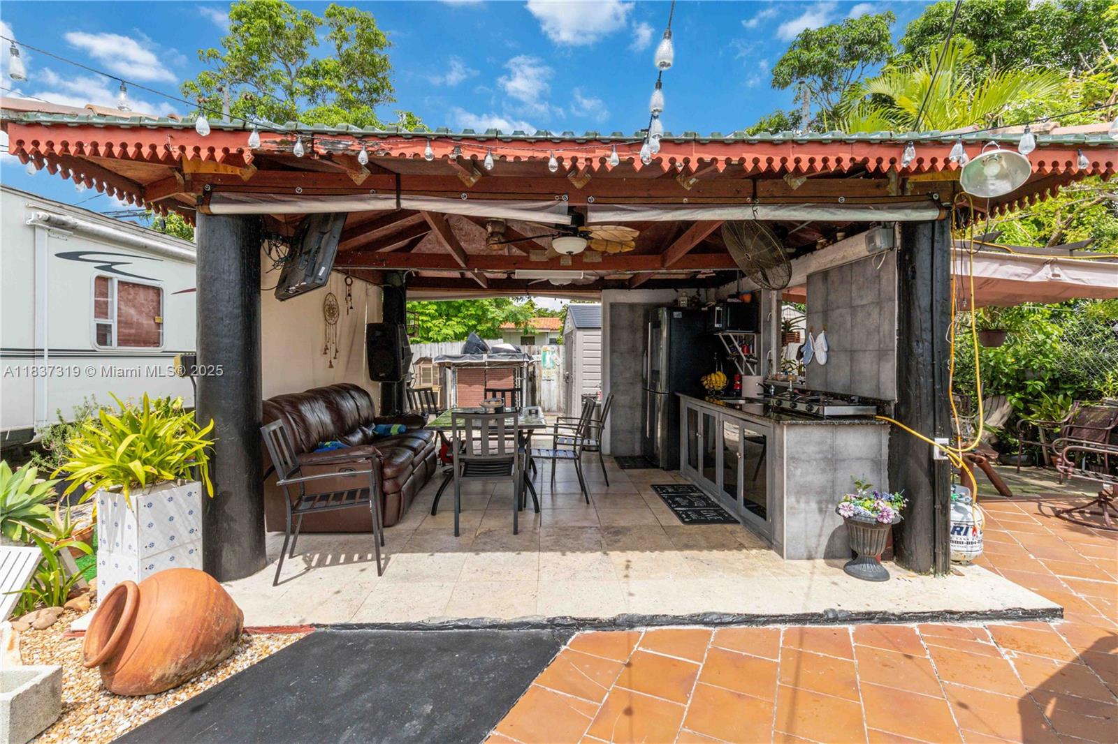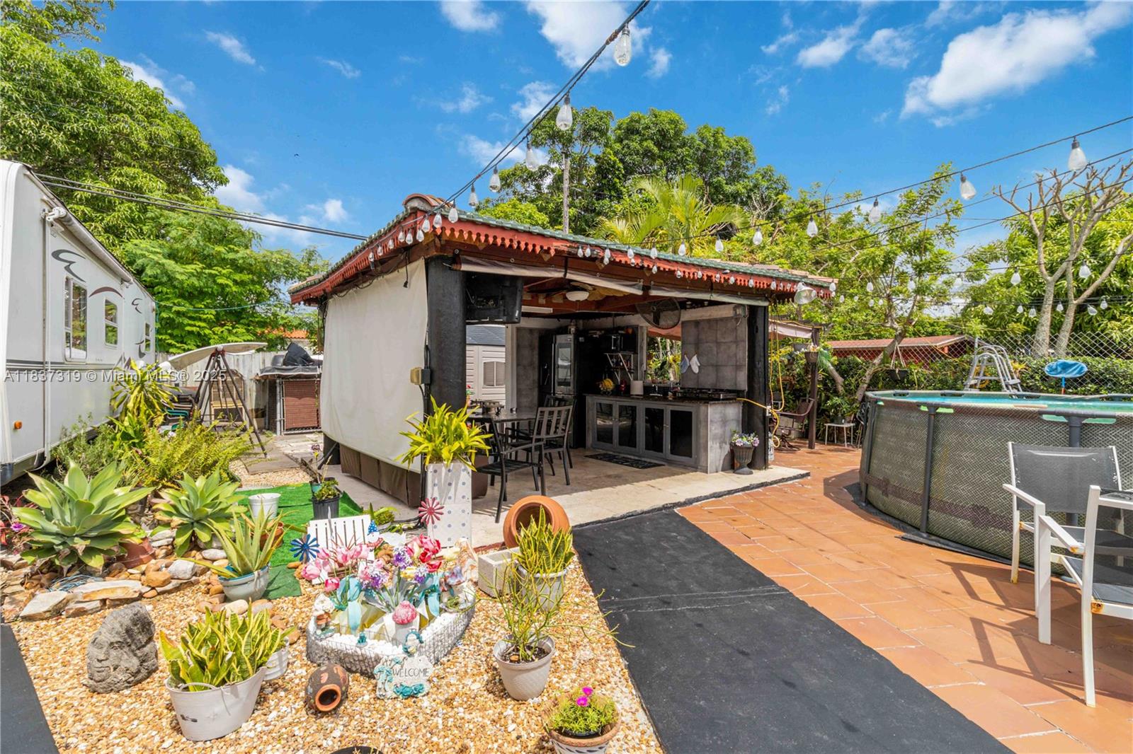 Great updated 3 bed 2 bath home with in-law quarter at back, great for having some additional income. Home remodeled with modern taste. All tile flooring. Spacious kitchen and dining area. The master bedroom has a door to access the backyard, which has a gazebo with a full kitchen. Newer air-conditioning unit. Fenced yard with sliding metal gate at the front. Two newer sheds in the backyard stay with the property. Great opportunity.