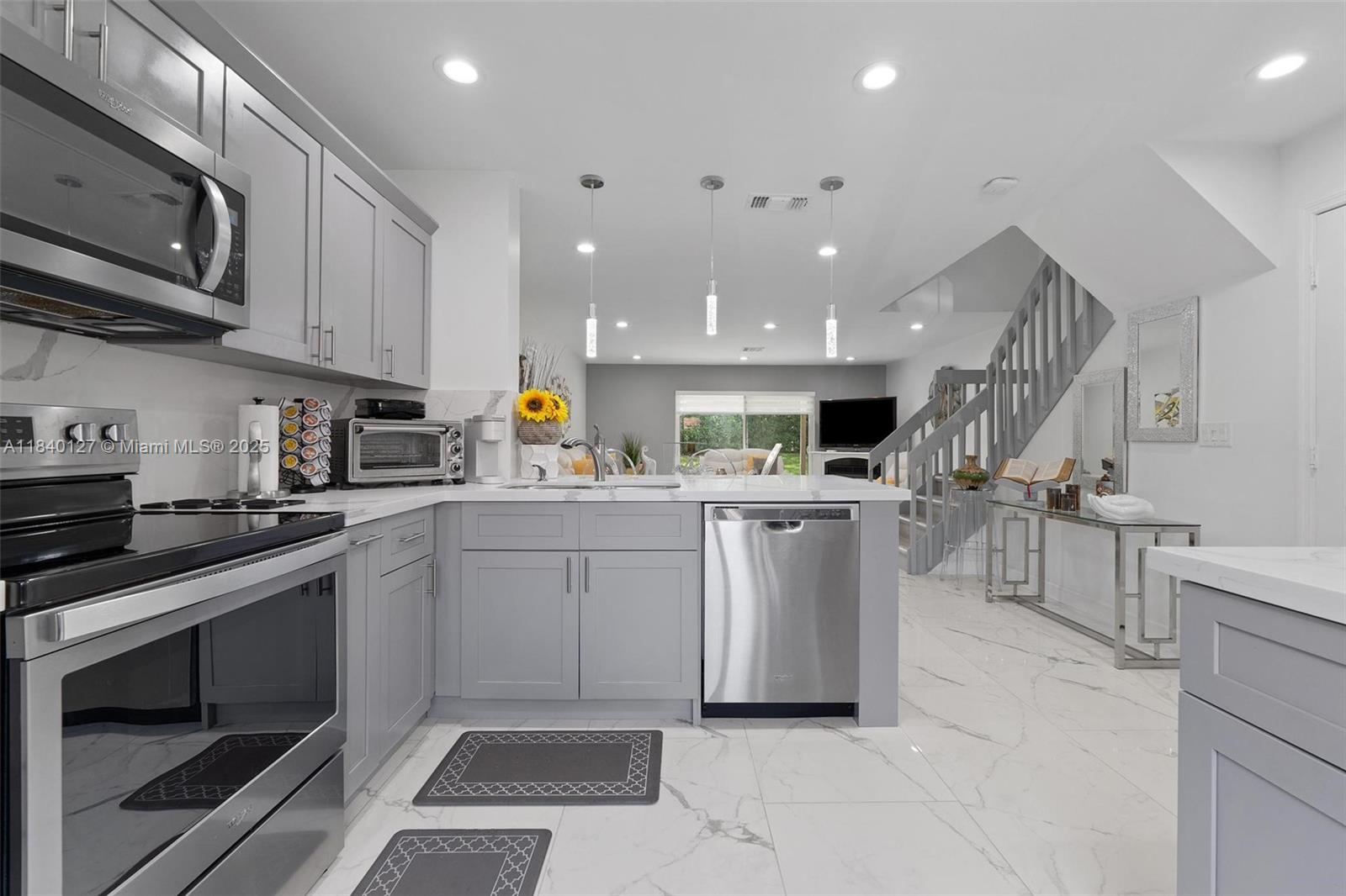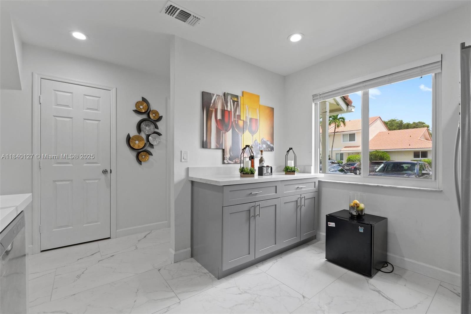 Welcome to this beautiful townhouse nestled in one of Boca Raton's most exclusive areas. This fully remodeled 2-bedroom, 2-bath home is move-in ready and designed for comfortable and modern living. The spacious kitchen features elegant quartz countertops, stainless steel Whirlpool appliances (2021). On the first floor, you will find modern ceramic floors, high-impact windows, zebra blinds In the living room, bright LED lighting, and 10-foot ceilings. The A/C was replaced in 2021. Upstairs, enjoy the master suites with custom closets, laminate flooring, and an abundance of natural light. The electrical panel was updated in 2021, along with the washer and dryer, conveniently located on the second floor. new indoor doors, and updated outlets for peace of mind.