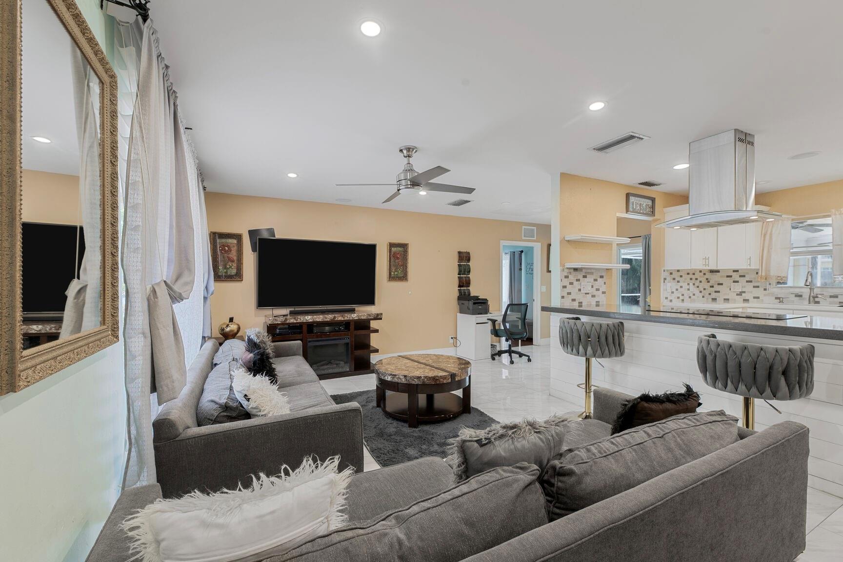 NO HOA! Welcome to this renovated 4 bedroom, 3 bathroom home! Brand-new kitchen complete with vent hood, stove top, quartz countertops, stainless steel appliances. New ROOF. Home features new tile flooring creating a fresh, modern feel. Outside, you'll find a private oasis with a screened pool recently diamond brite, pavers on pool deck, and a fully fenced yard, perfect for relaxing or entertaining. The bathrooms fully updated with new vanities and quartz countertops, glass shower doors. Home features SOLAR PANELS, IMPACT WINDOWS, HURRICANE RATED 2025 GARAGE DOOR with epoxy garage floors , TANKLESS WATER HEATER, NEW AC, landscape lighting. House is wired for speaker. Property is fruited with avocado, coconuts, ackee, apple and mango. Move in ready!