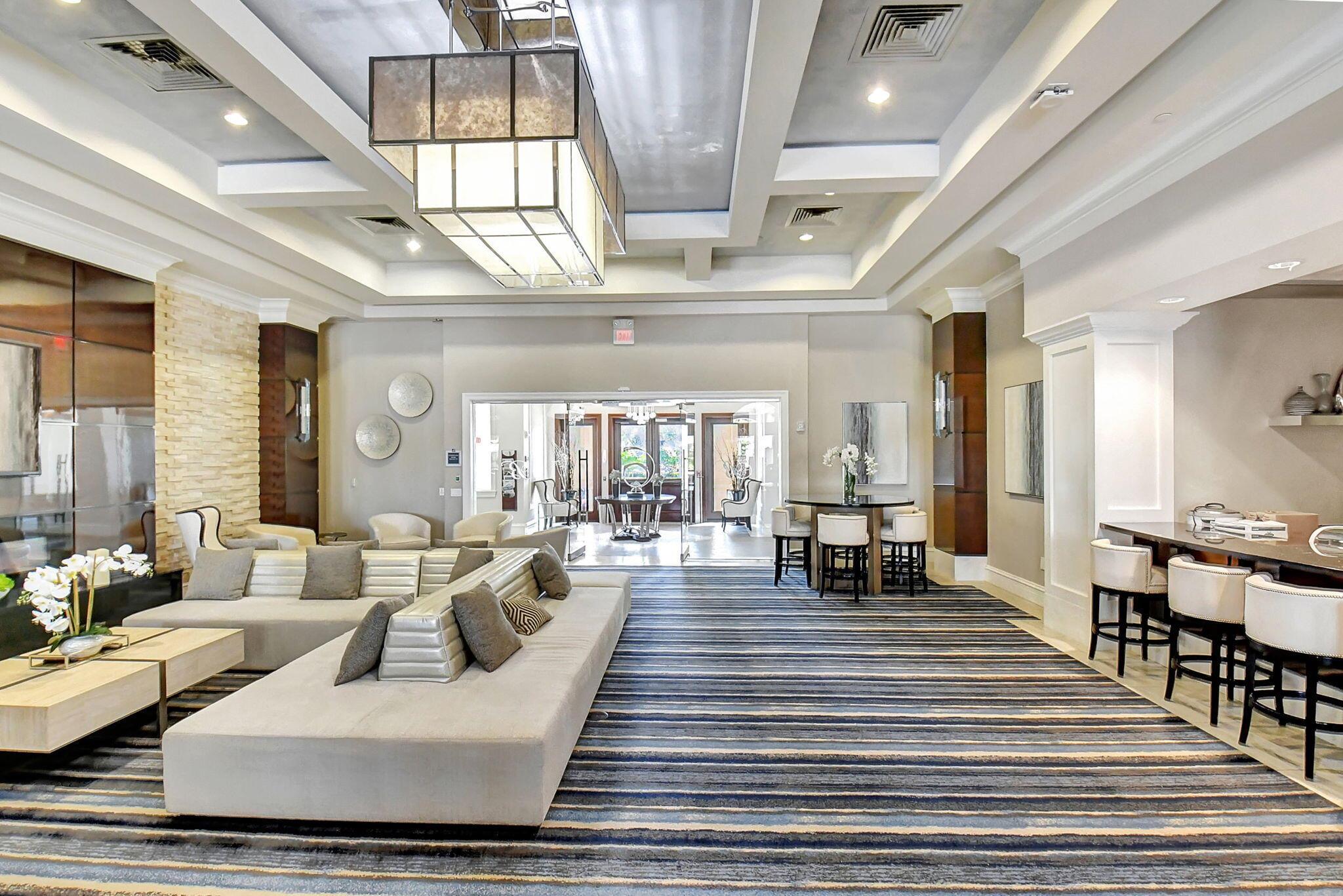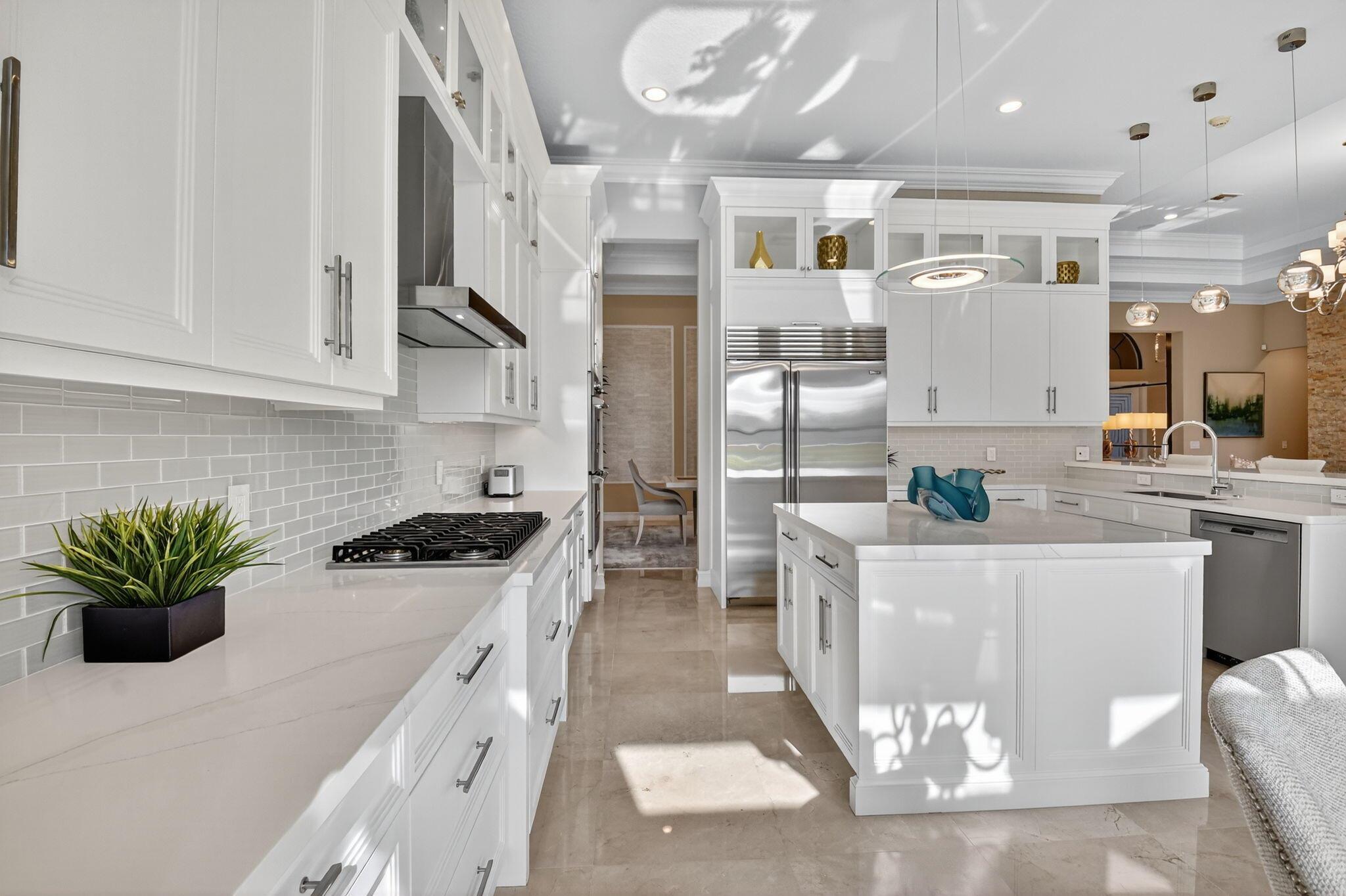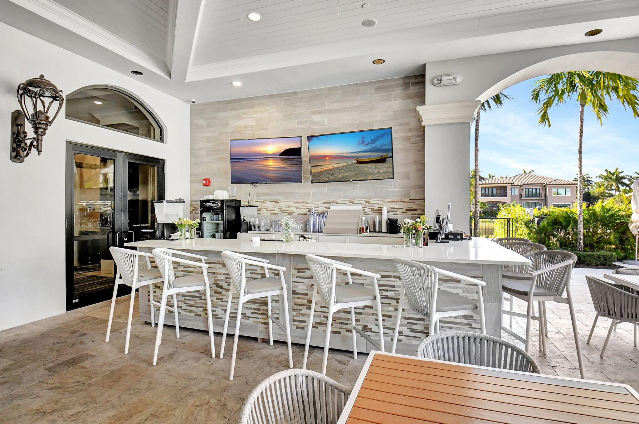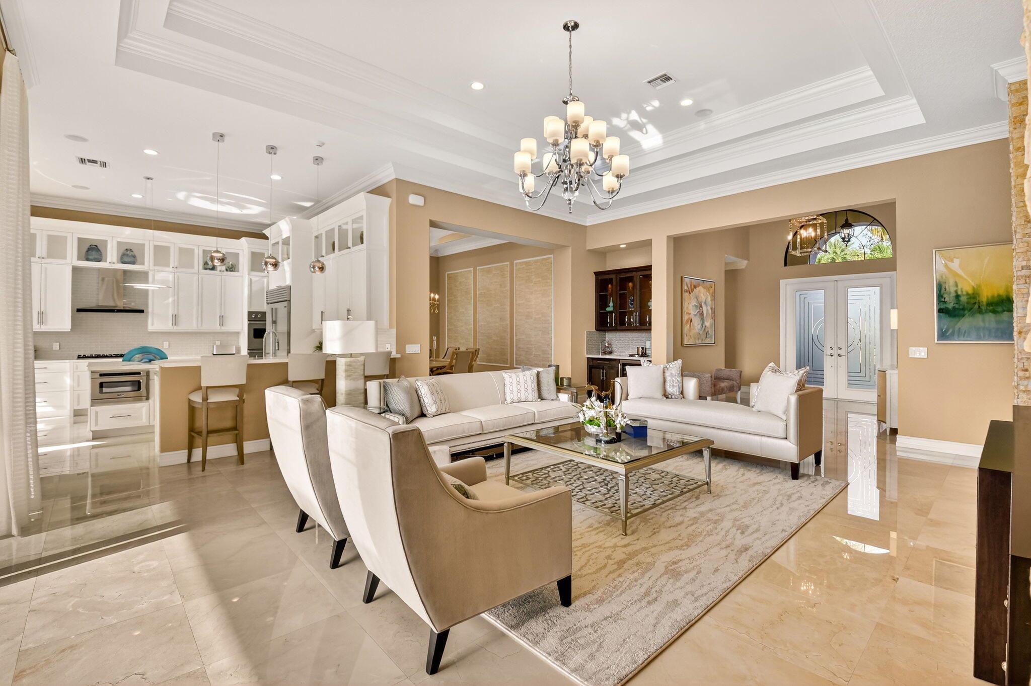 Step into refined luxury in this fully furnished, custom-furnished, designer-upgraded residence located in the prestigious community of The Bridges. Offering 3 bedrooms, 3.5 bathrooms, and a custom clubroom/office, this exceptional home seamlessly blends sophisticated style with modern convenience. A private courtyard entry with etched glass double doors leads to a welcoming foyer, setting the tone for the elegance found throughout. Step into a grand living area featuring gleaming marble floors, impact windows and doors, soaring coffered ceilings, surround sound, and crown molding throughout. The living room is enhanced by a custom wet bar and striking white stone columns, while newly installed oversized sliding glass doors with transom glass panels bathe the space in natural light.