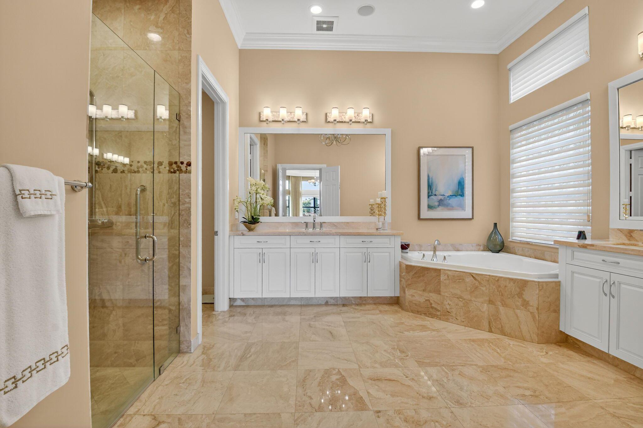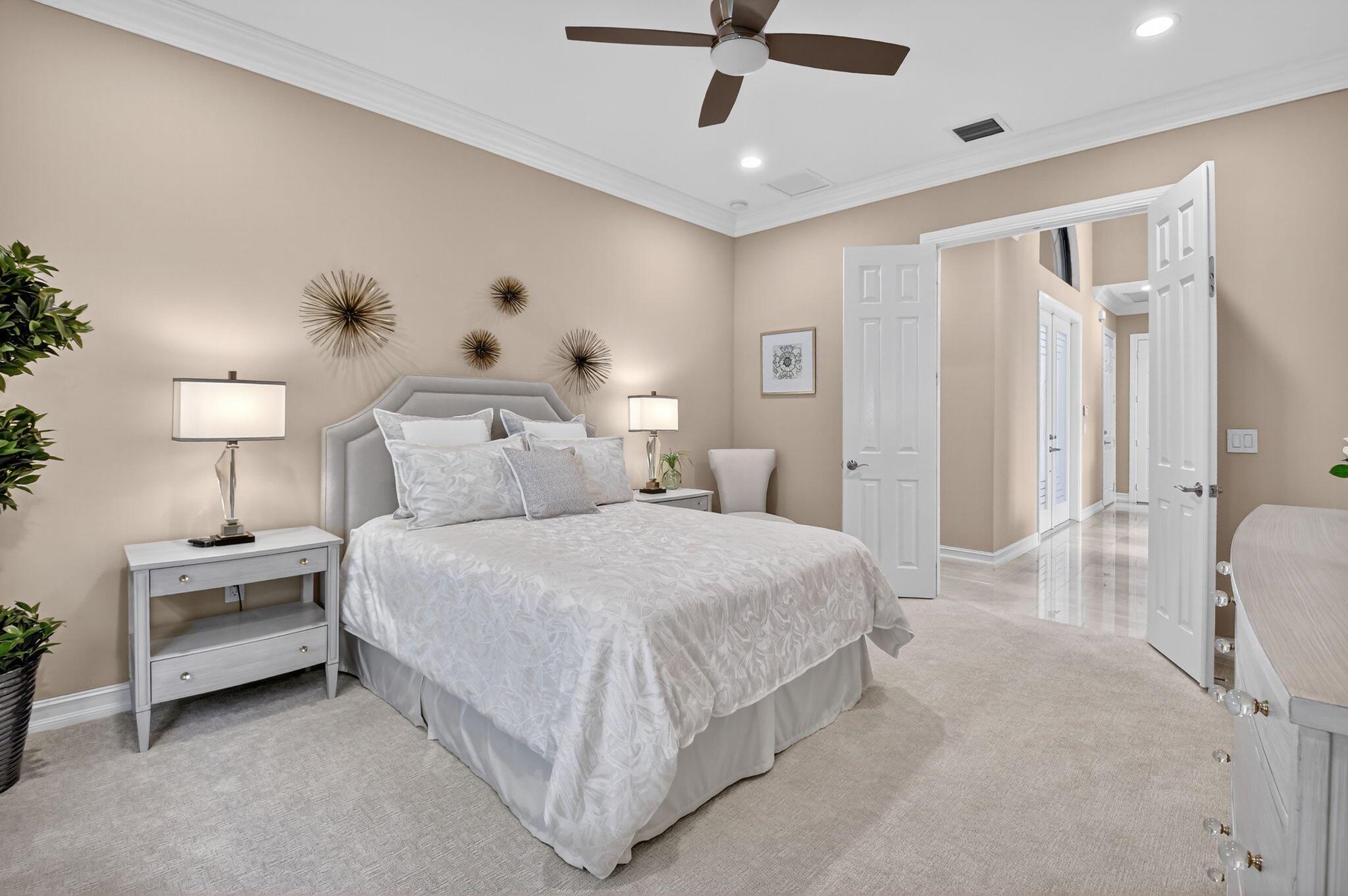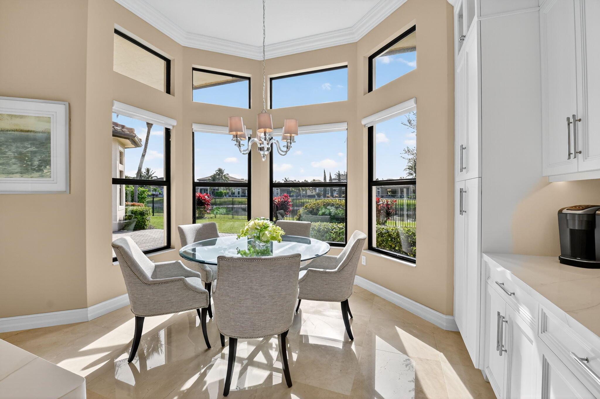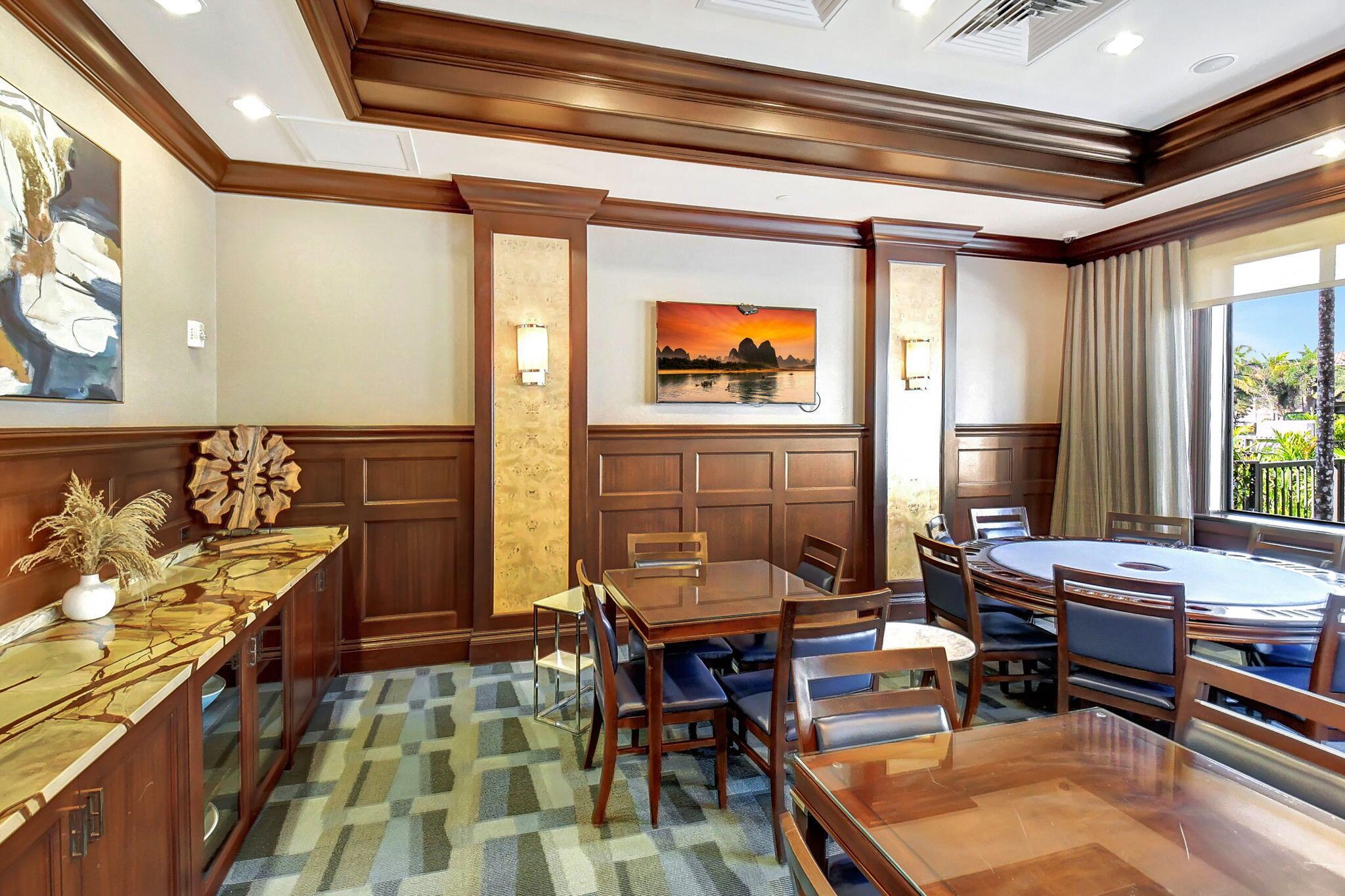 Step into refined luxury in this fully furnished, custom-furnished, designer-upgraded residence located in the prestigious community of The Bridges. Offering 3 bedrooms, 3.5 bathrooms, and a custom clubroom/office, this exceptional home seamlessly blends sophisticated style with modern convenience. A private courtyard entry with etched glass double doors leads to a welcoming foyer, setting the tone for the elegance found throughout. Step into a grand living area featuring gleaming marble floors, impact windows and doors, soaring coffered ceilings, surround sound, and crown molding throughout. The living room is enhanced by a custom wet bar and striking white stone columns, while newly installed oversized sliding glass doors with transom glass panels bathe the space in natural light.