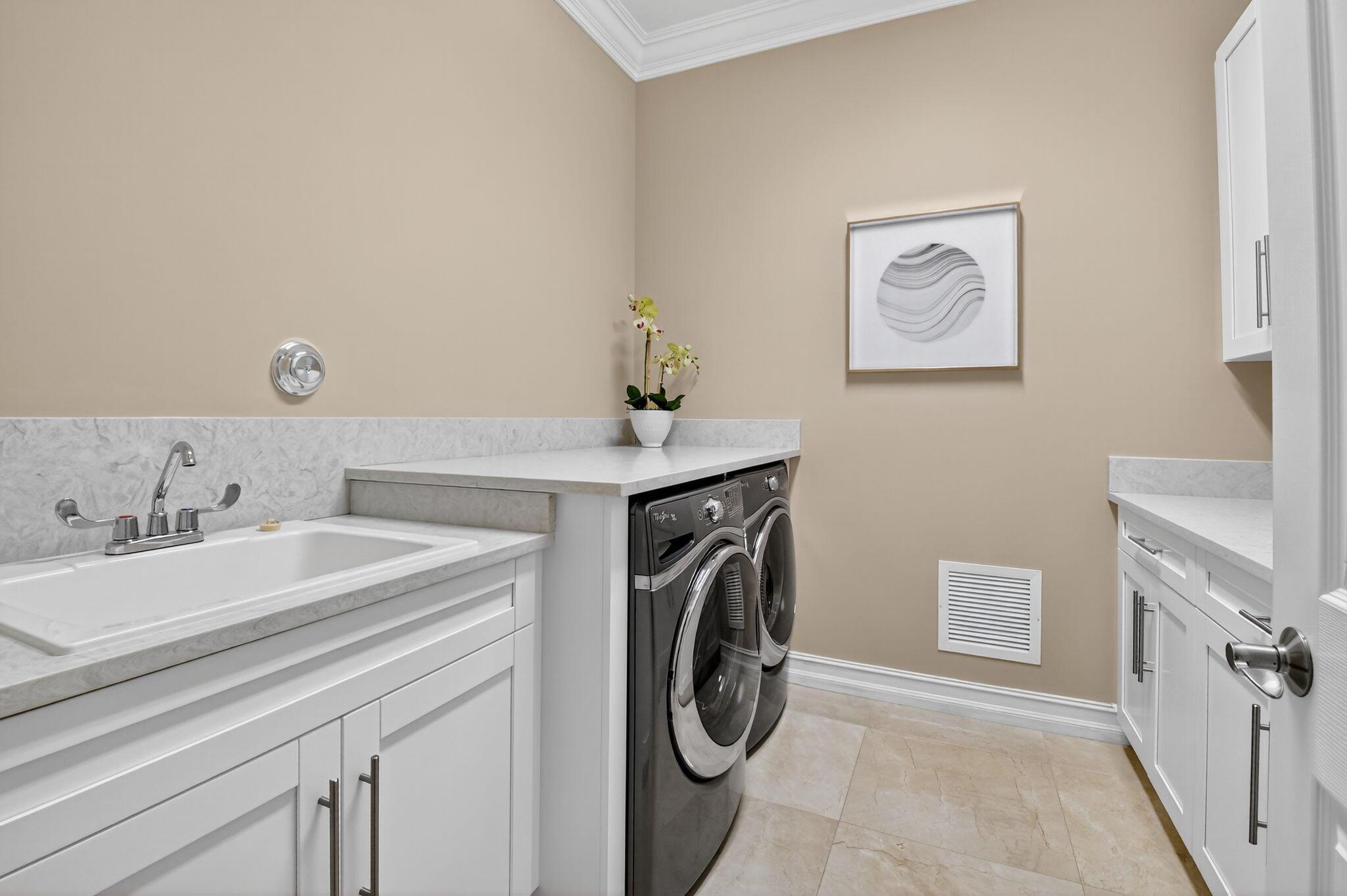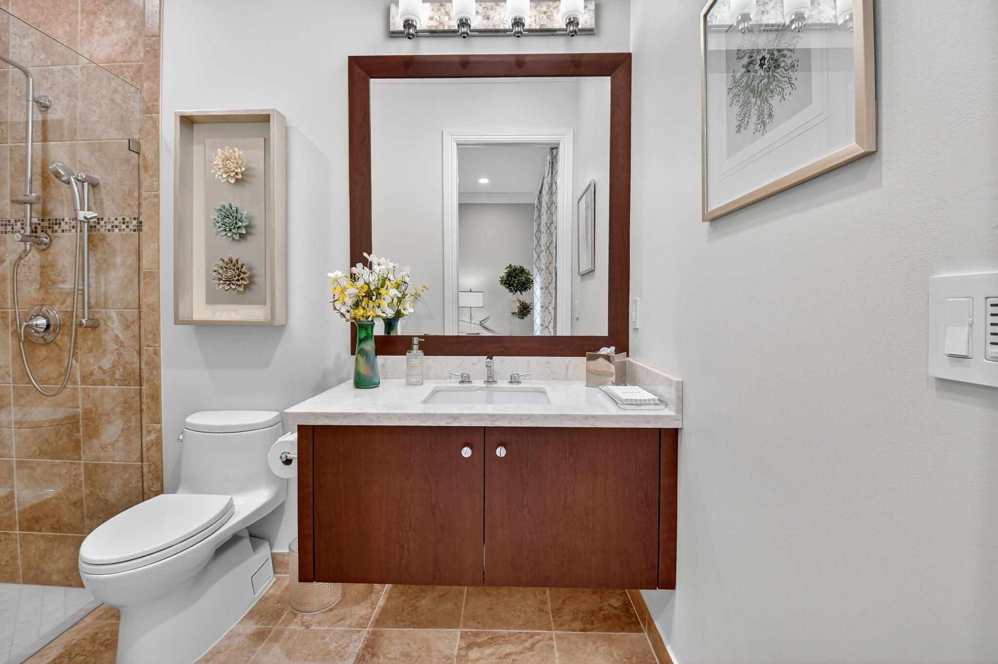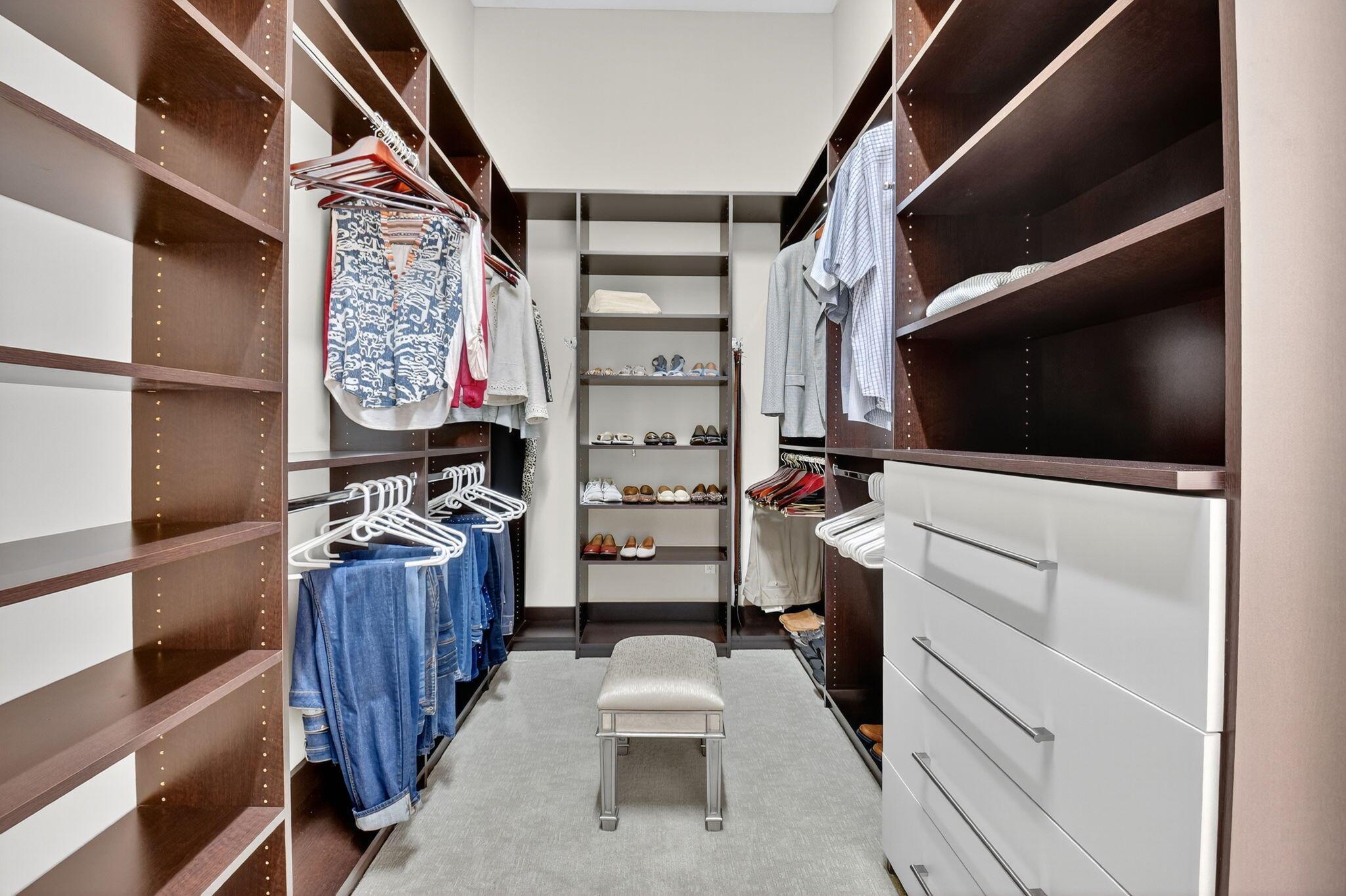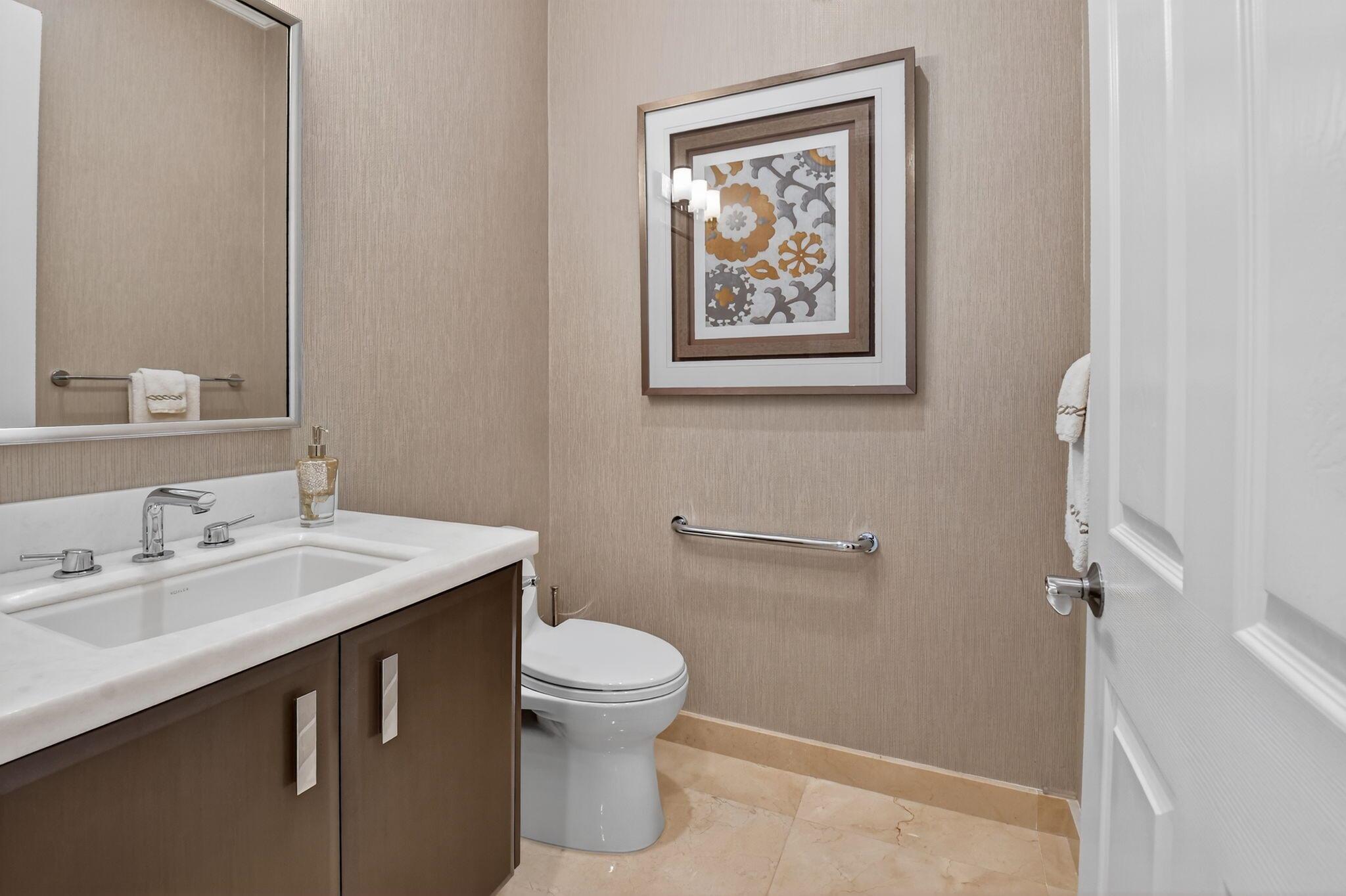 Step into refined luxury in this fully furnished, custom-furnished, designer-upgraded residence located in the prestigious community of The Bridges. Offering 3 bedrooms, 3.5 bathrooms, and a custom clubroom/office, this exceptional home seamlessly blends sophisticated style with modern convenience. A private courtyard entry with etched glass double doors leads to a welcoming foyer, setting the tone for the elegance found throughout. Step into a grand living area featuring gleaming marble floors, impact windows and doors, soaring coffered ceilings, surround sound, and crown molding throughout. The living room is enhanced by a custom wet bar and striking white stone columns, while newly installed oversized sliding glass doors with transom glass panels bathe the space in natural light.