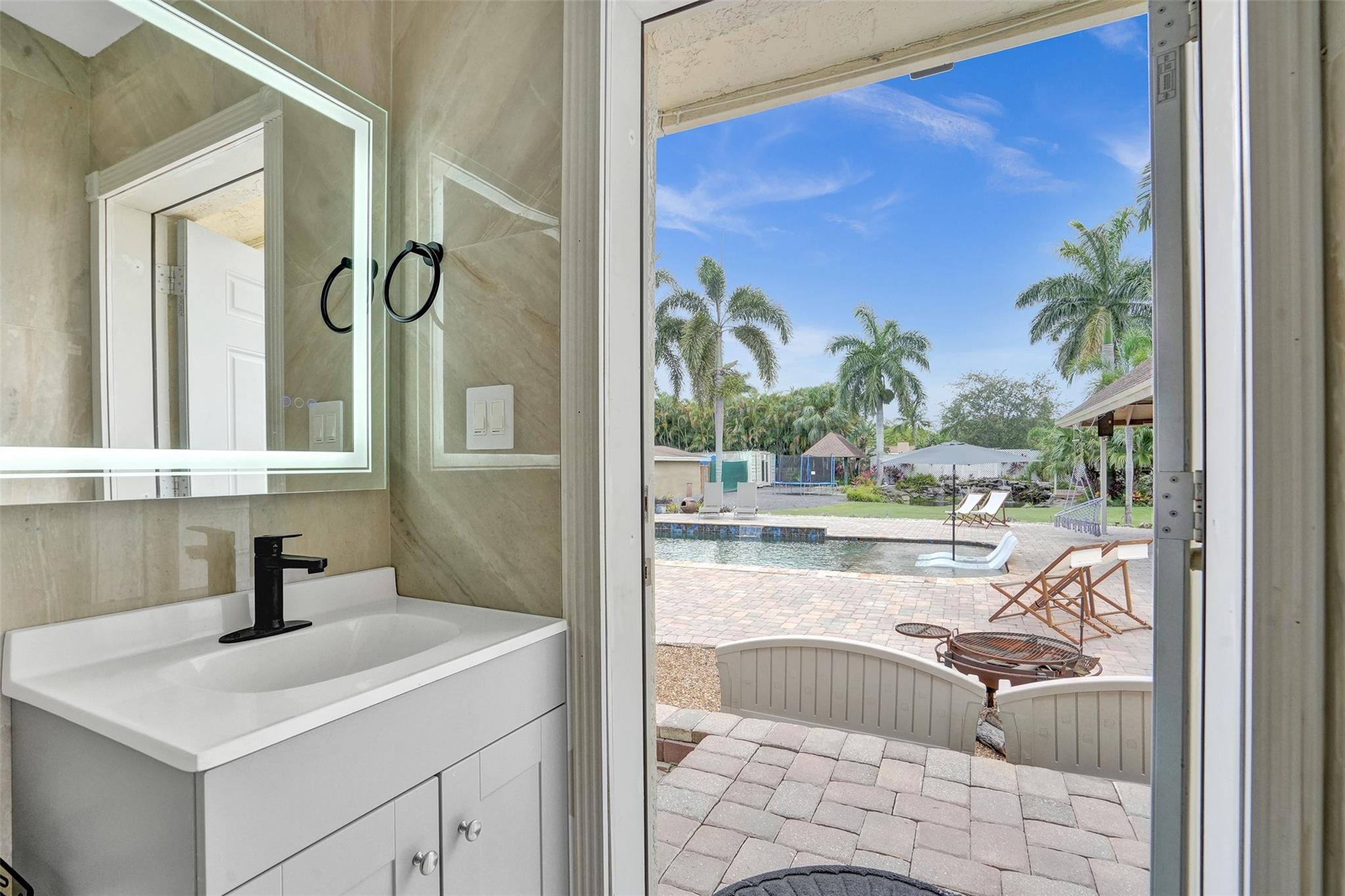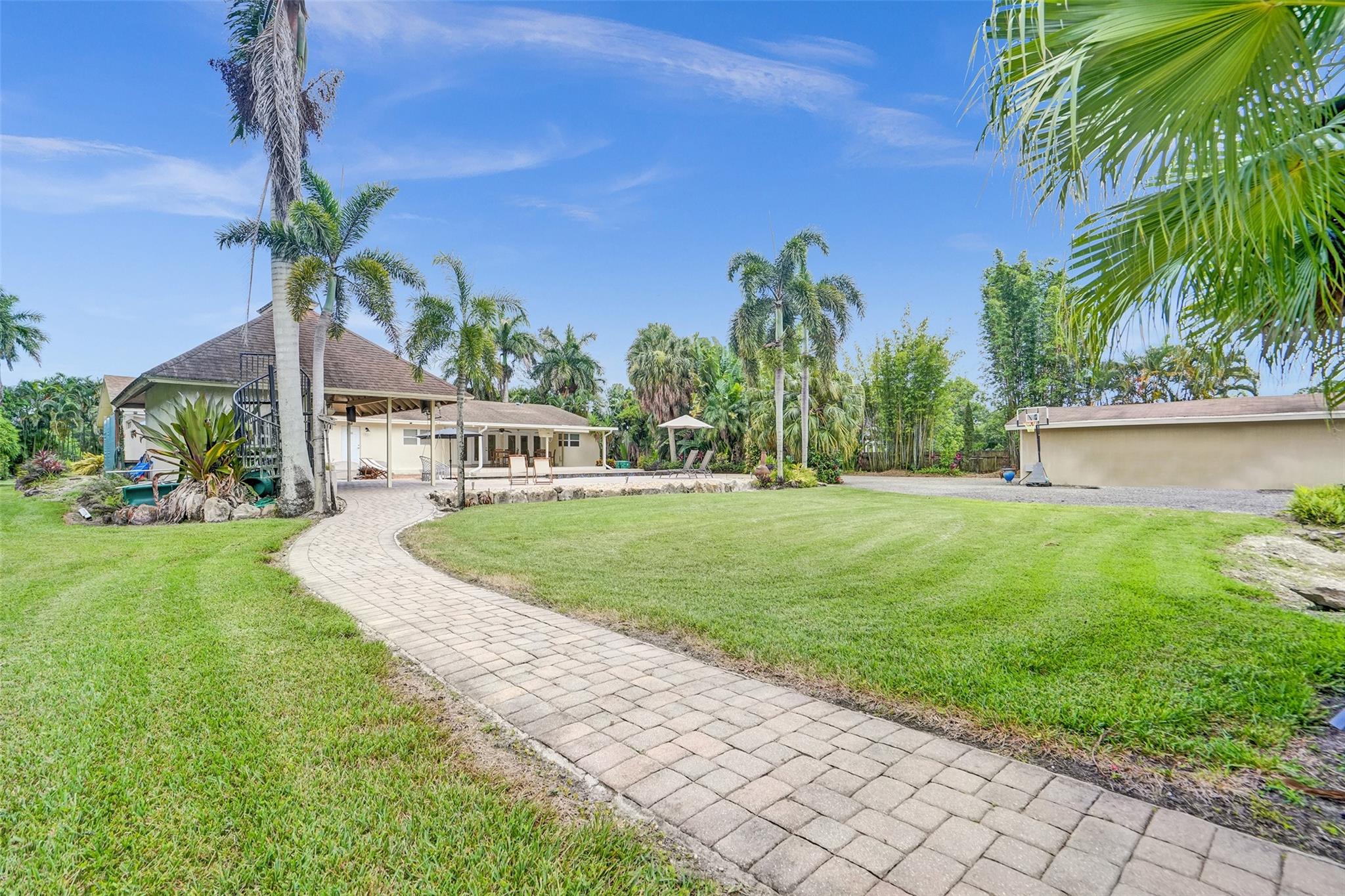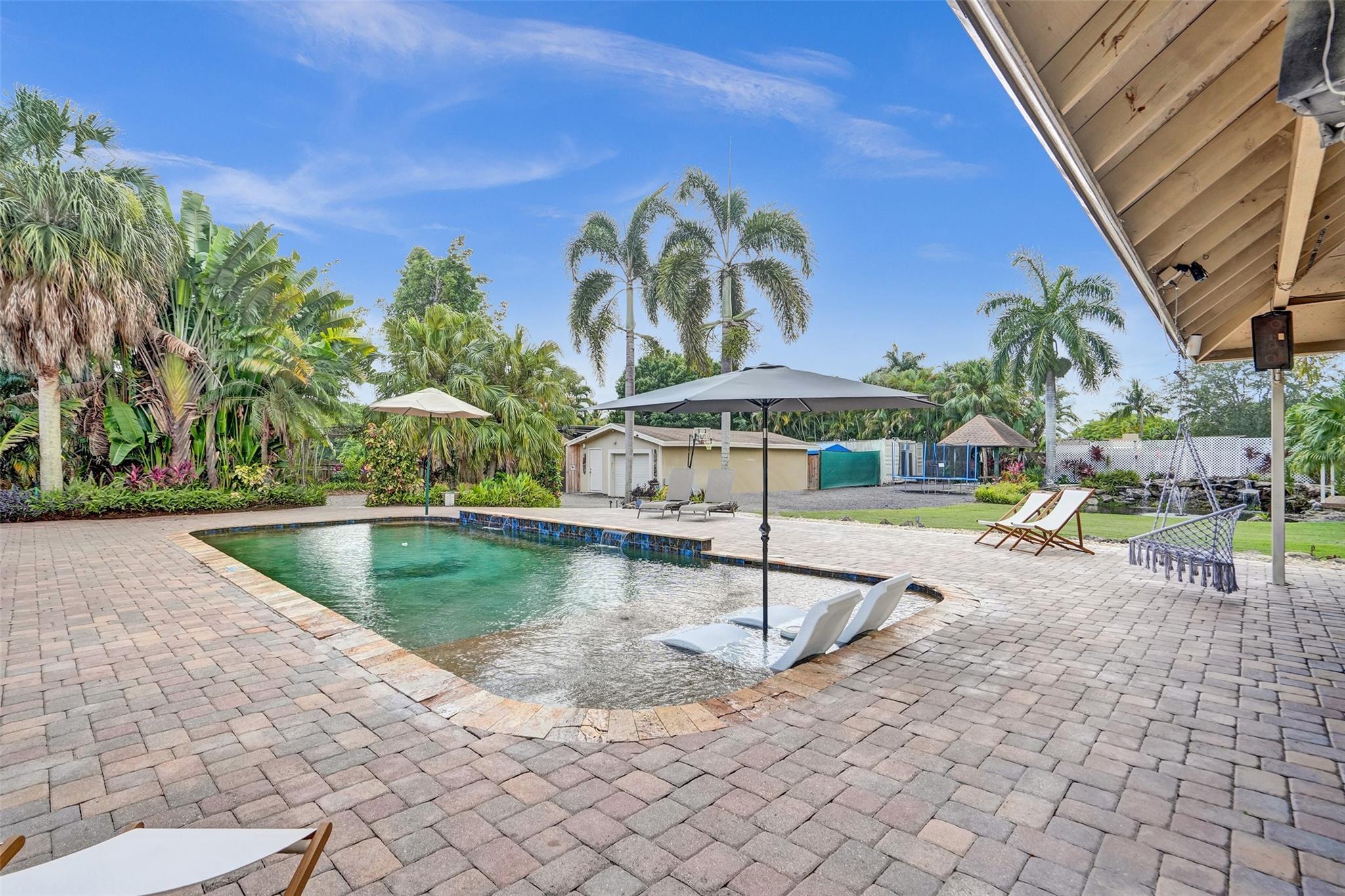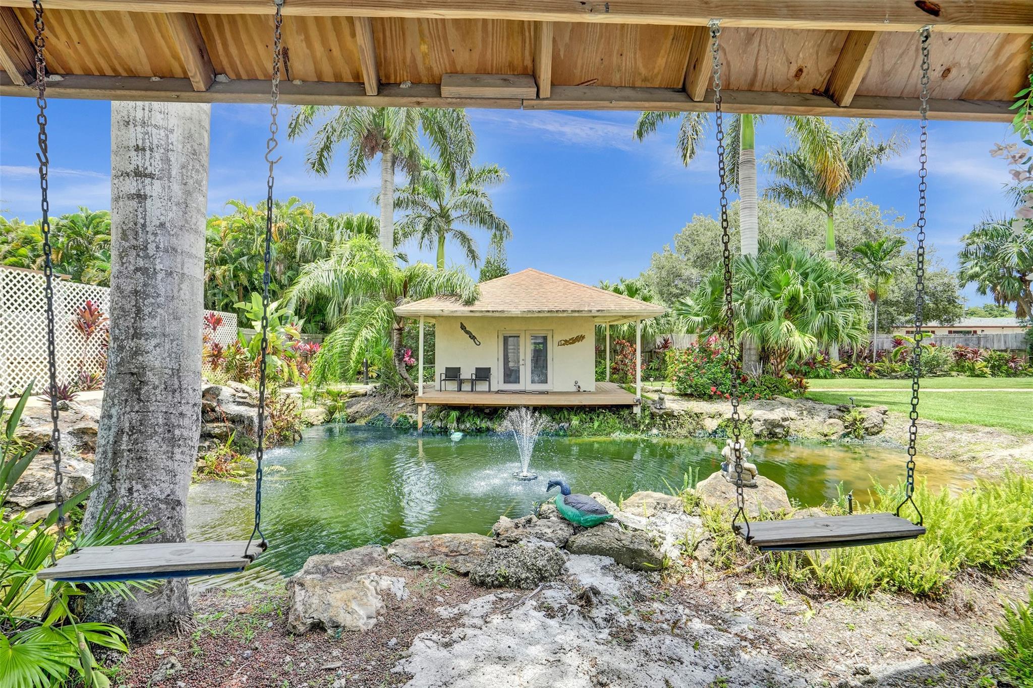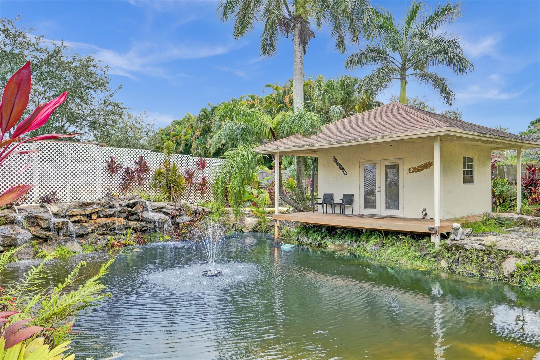 Rare opportunity in prestigious Southwest Ranches. Every inch of this lushly landscaped 1.13 acre estate is utilized, with still endless potential for personal and professional pursuits. This is an outstanding option for contractors, creatives or anyone seeking that work from home lifestyle or expansive multigenerational living. The main house features 5 large bedrooms, 5 full baths. Countless options abound with 2 additional buildings, creating guest room, office or workshop. Enjoy a heated pool and gorgeous tropical sunsets steps from 1 of 2 primary suites. Stroll further west to feed the fish in the “Koi pond” outside the casita. The entirety of the estate is securely fenced. A 2nd hard surface driveway leads to a 20x40 workshop with ample parking for cars, trucks, boats, RVs, etc.