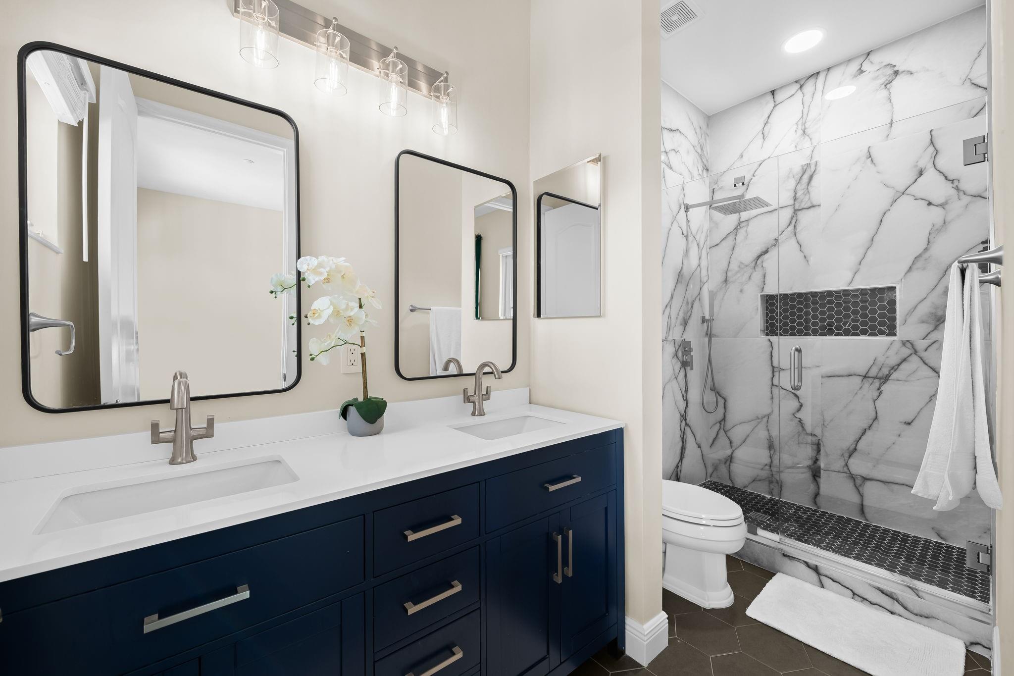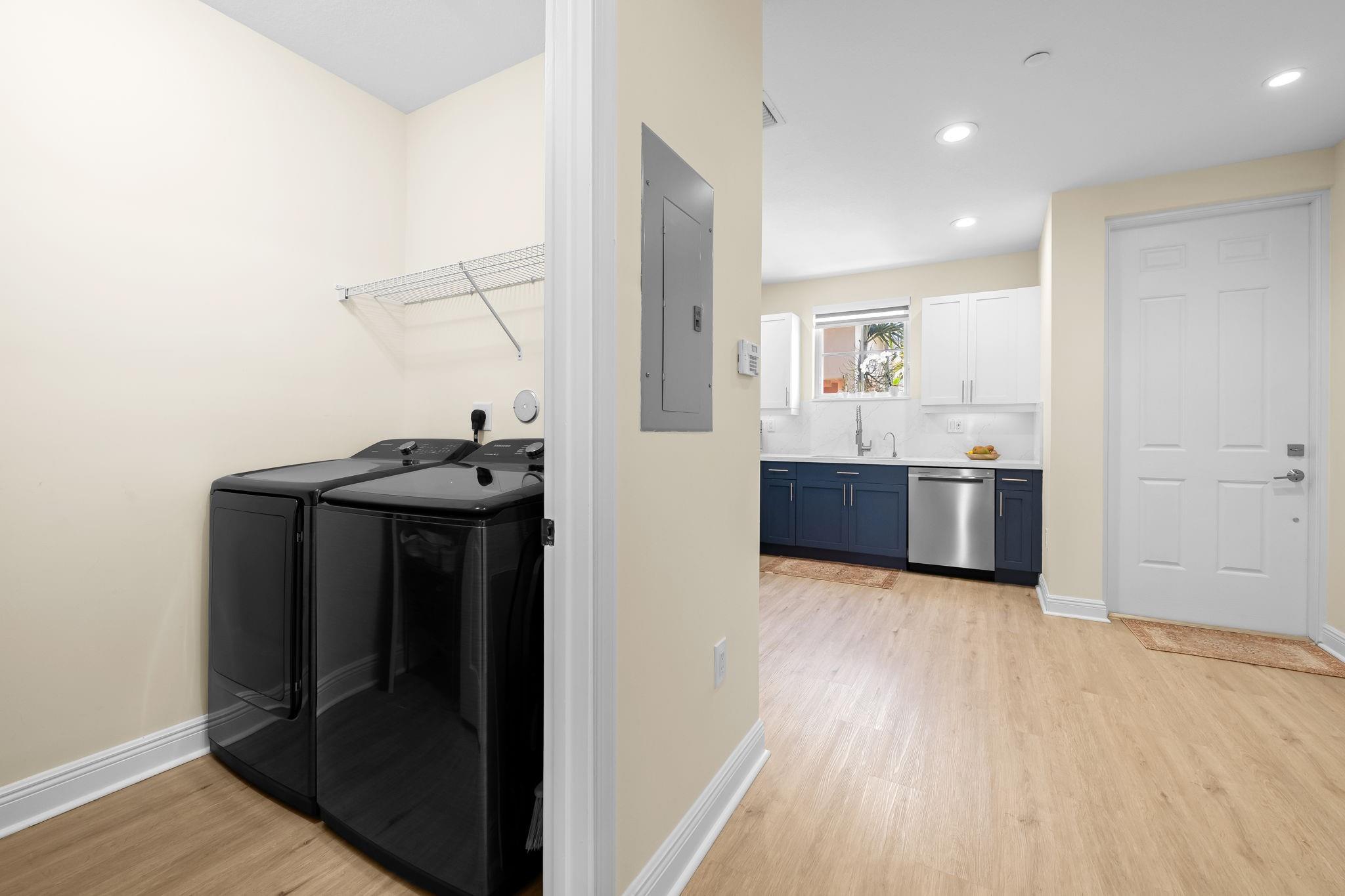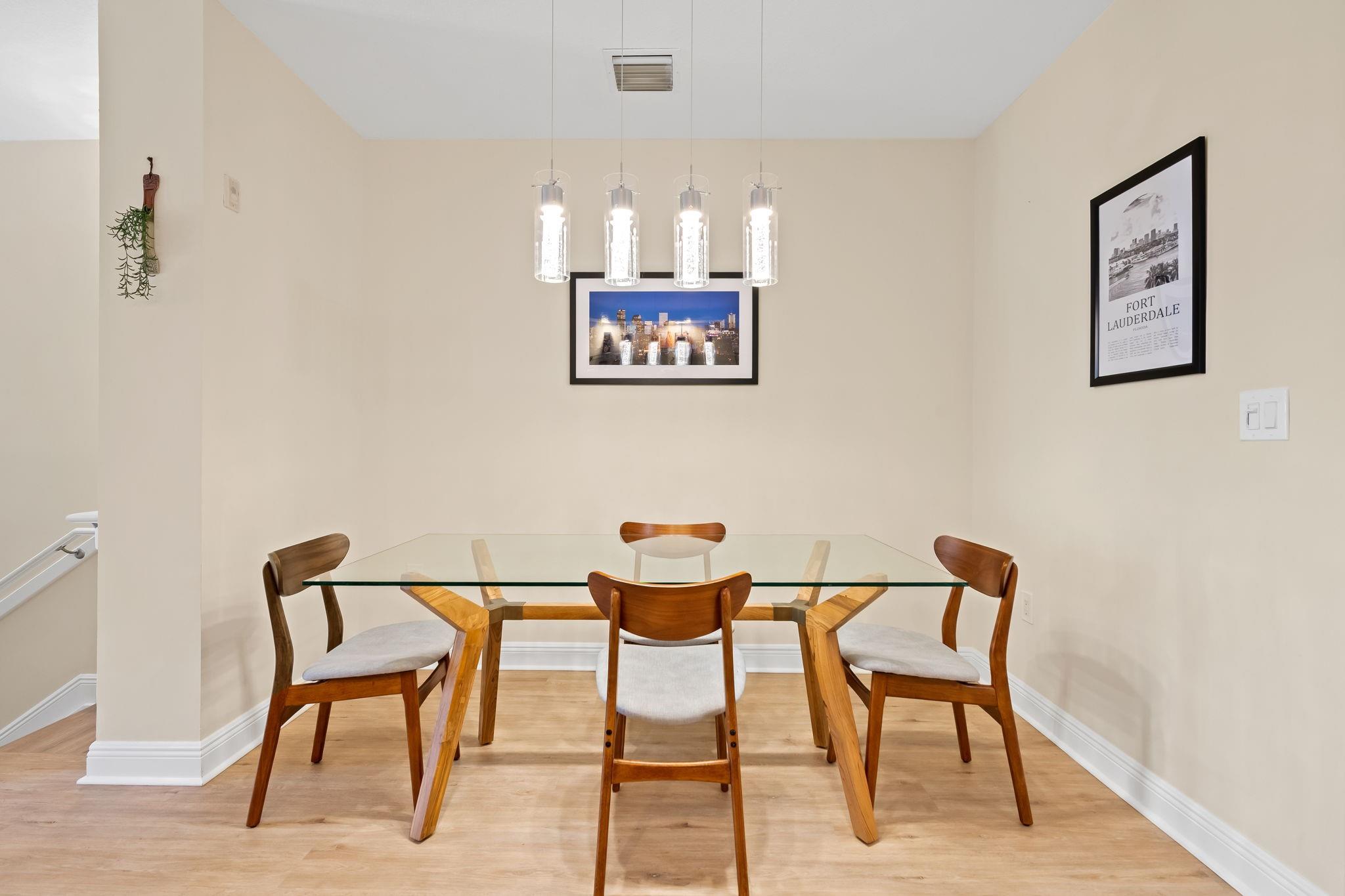 Welcome to modern elegance at 419 Olssen Avenue in Fort Lauderdale's Village of Sailboat Bend. This inviting 2-bedroom, 2.5-bath townhome spans 1,679 square feet of pure delight. Enjoy recently upgraded spaces with fresh paint, chic light fixtures, and a newer A/C and water heater. The revamped kitchen features stylish blue and white cabinets with quartz countertops, while the primary bathroom is fully remodeled. With sophistication throughout, from hardwood and tile floors to modern lighting, the home boasts high ceilings and recessed lighting. Savor the luxury of a double sink bathroom, spacious walk-in closet, and laundry room with a newer washer/dryer. The home includes TVs, featuring a 75-inch in the primary bedroom and a 65-inch in the guest room. Welcome to Fort Lauderdale!
