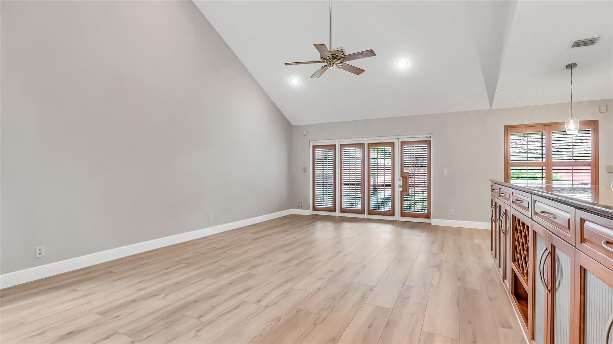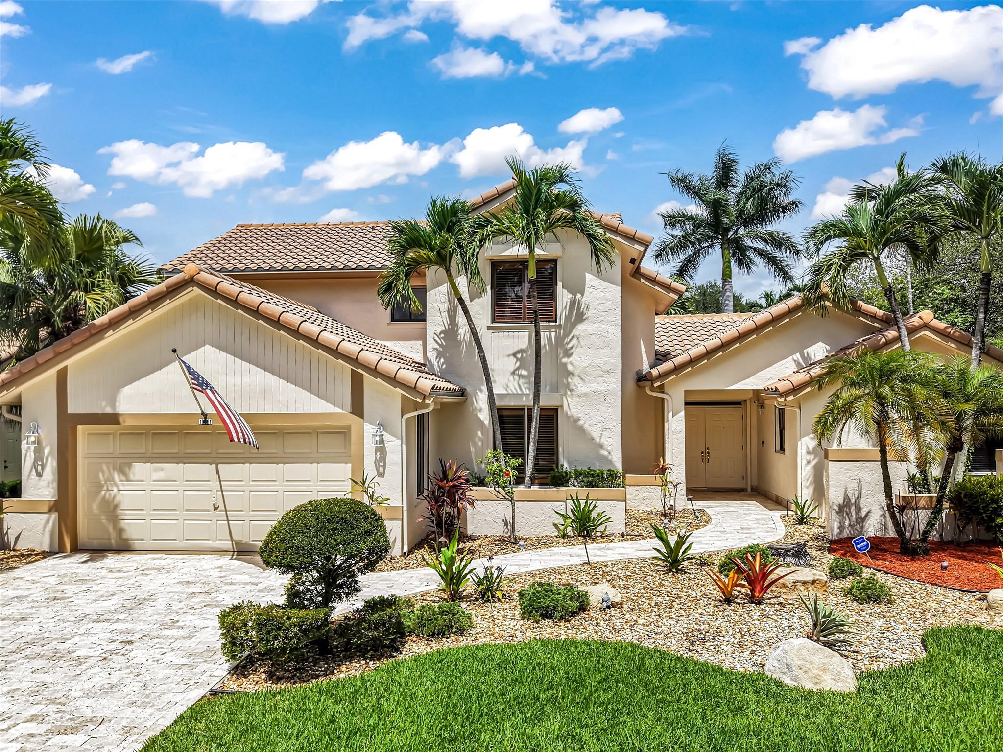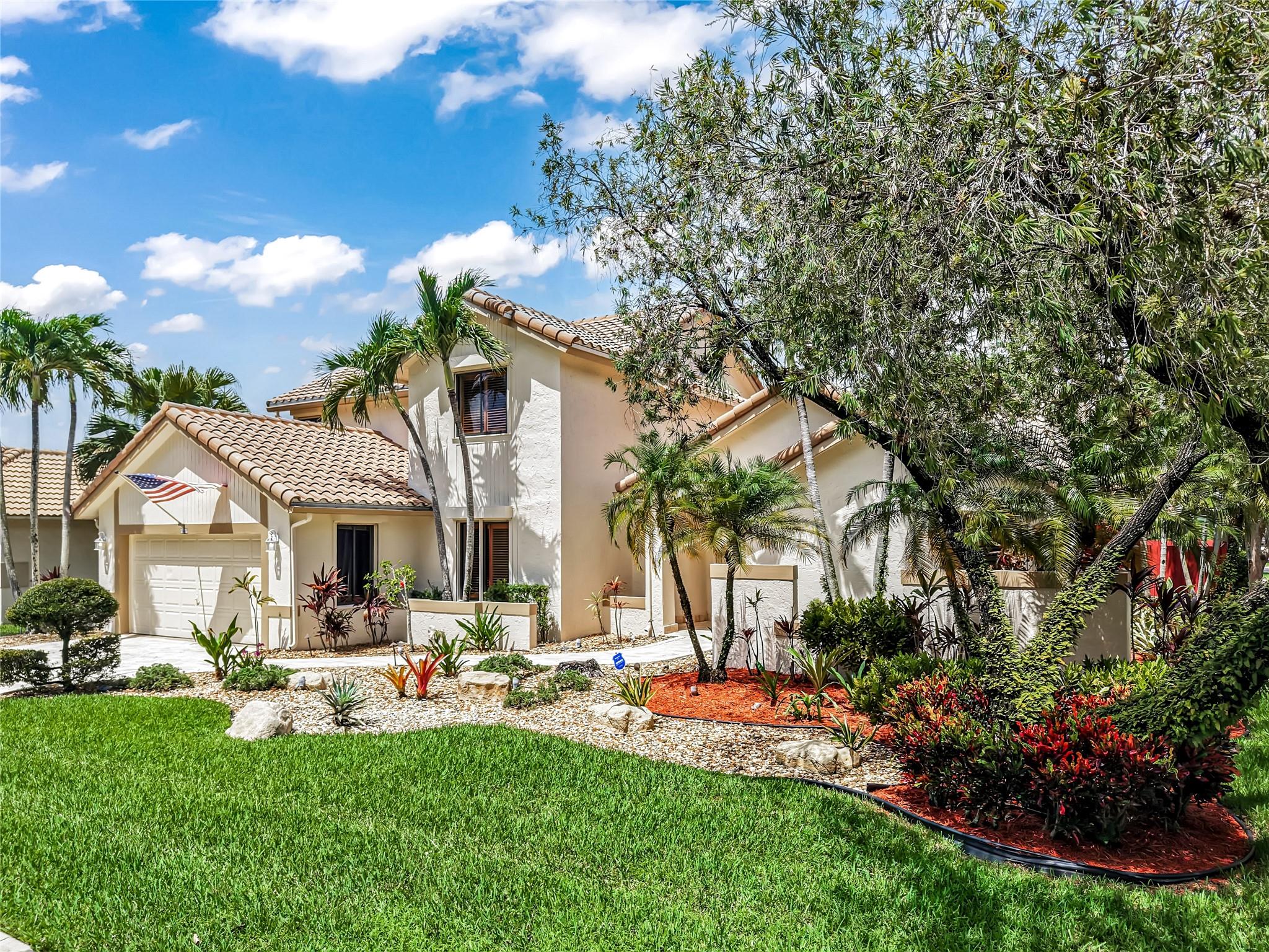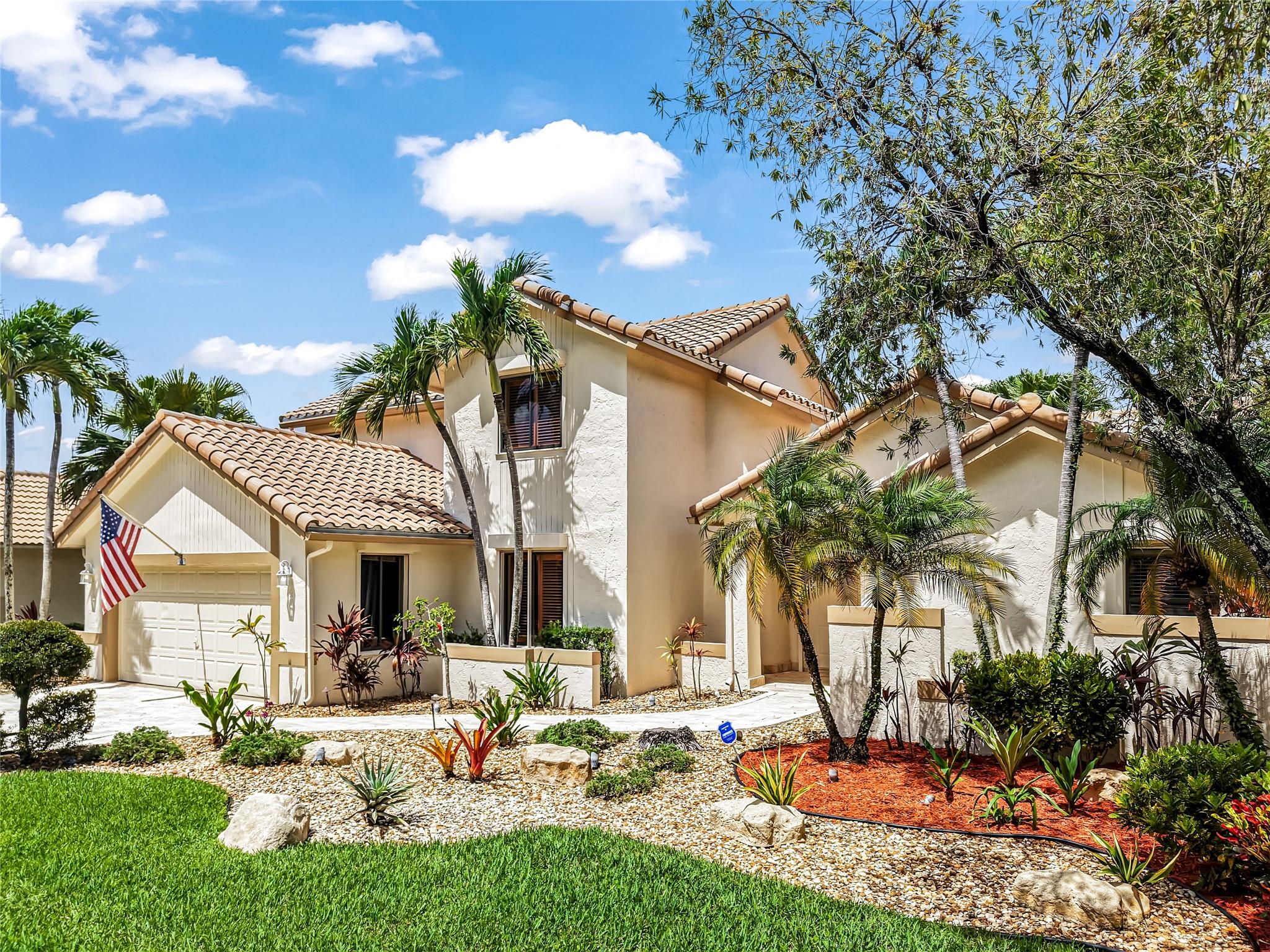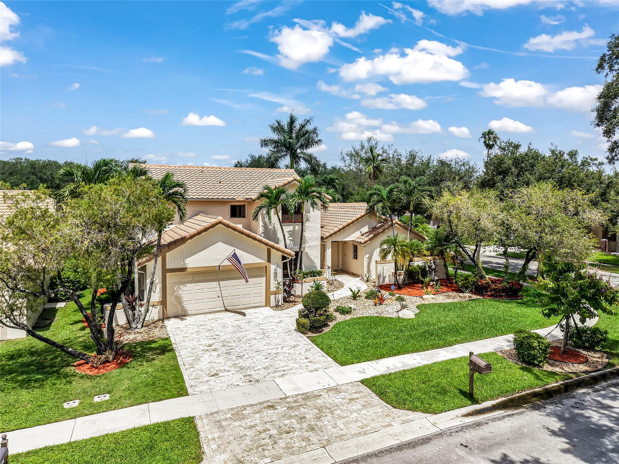 Beautifully updated corner lot home, soaring ceilings, smart, functional layout! 2025 improvements include fresh interior/exterior paint, popcorn ceiling removed & upgraded laminate flooring throughout. First-floor primary suite features: walk-in closet, roman tub, stall shower, quartz vanity, private office/den w/wood floors, built-ins & impact windows Additional downstairs bedroom & full bath; 2 more bedrooms upstairs w/renovated full bath. Kitchen offers granite counters, wood cabinets, pantry pull-outs, under/upper cabinet lighting & abundant recessed lighting. Family room w/dry bar w/quartz counters, inside laundry room & Plantation shutters throughout. Whole-house 22KW propane generator, 2022 A/C, electric rolldown shutters, alarm system w/cameras, lush landscaping complete this home