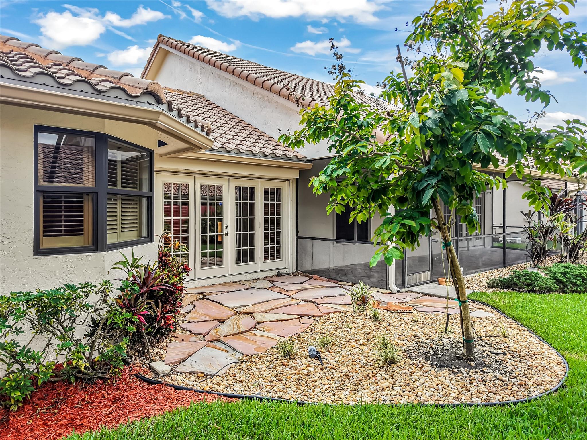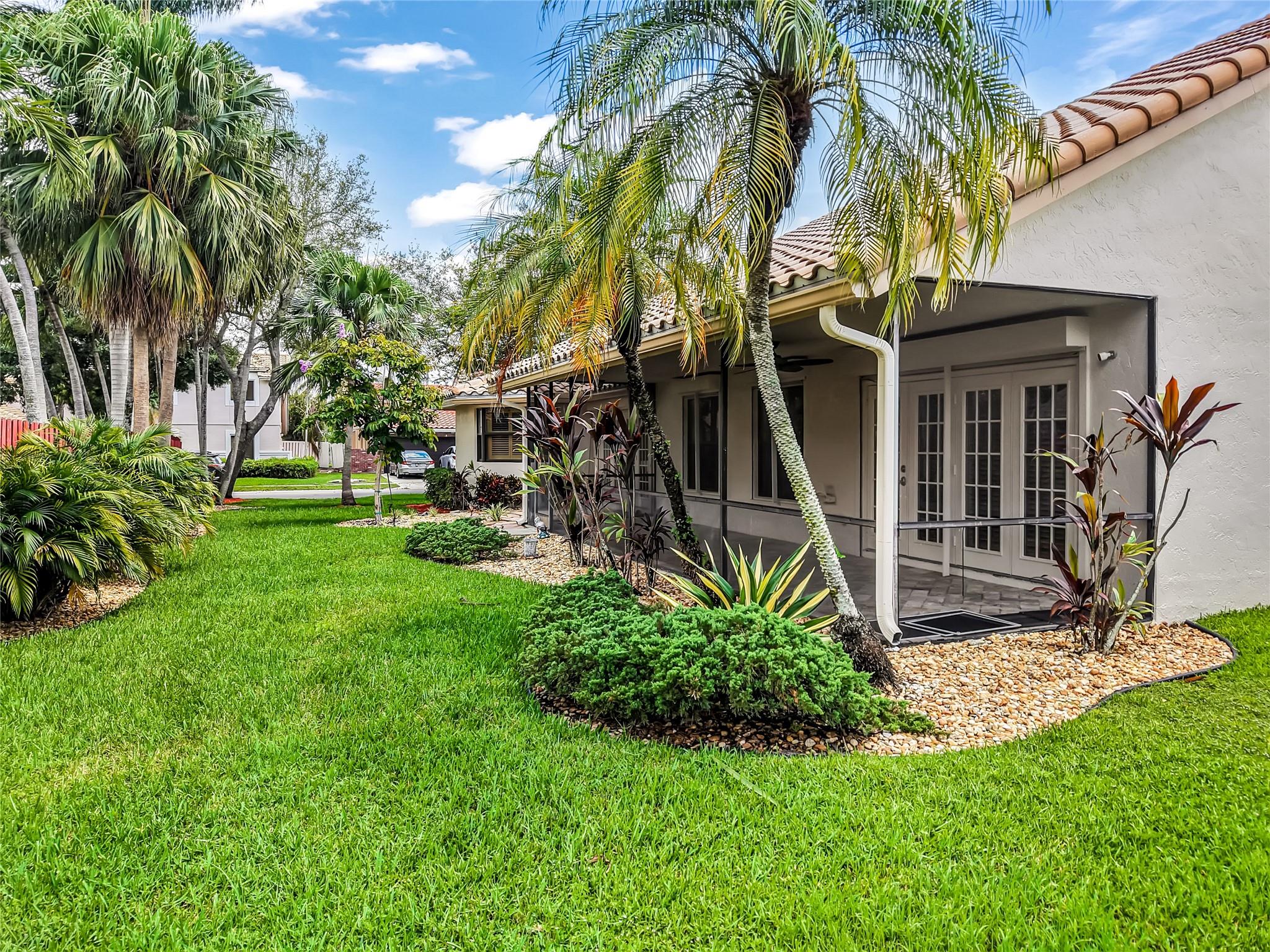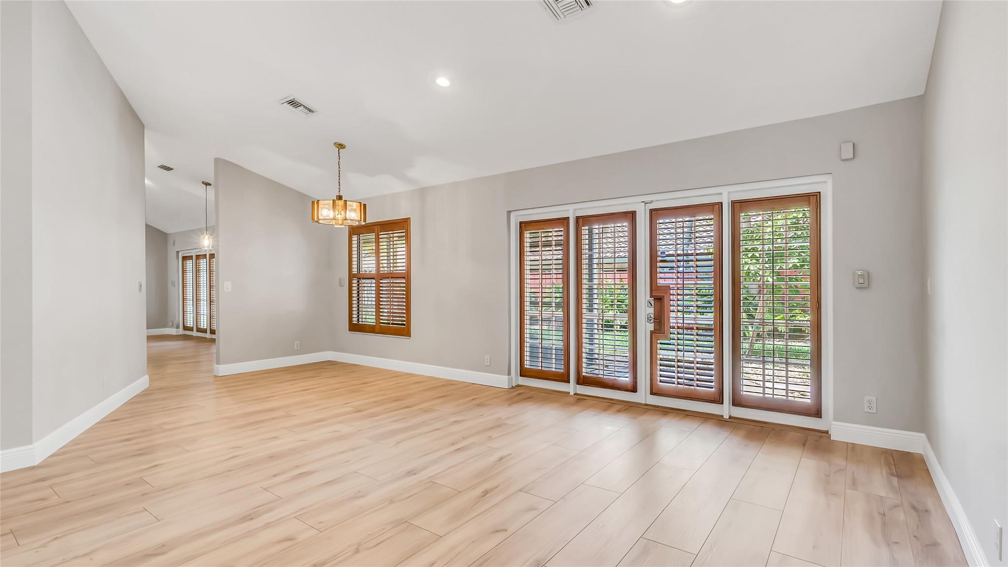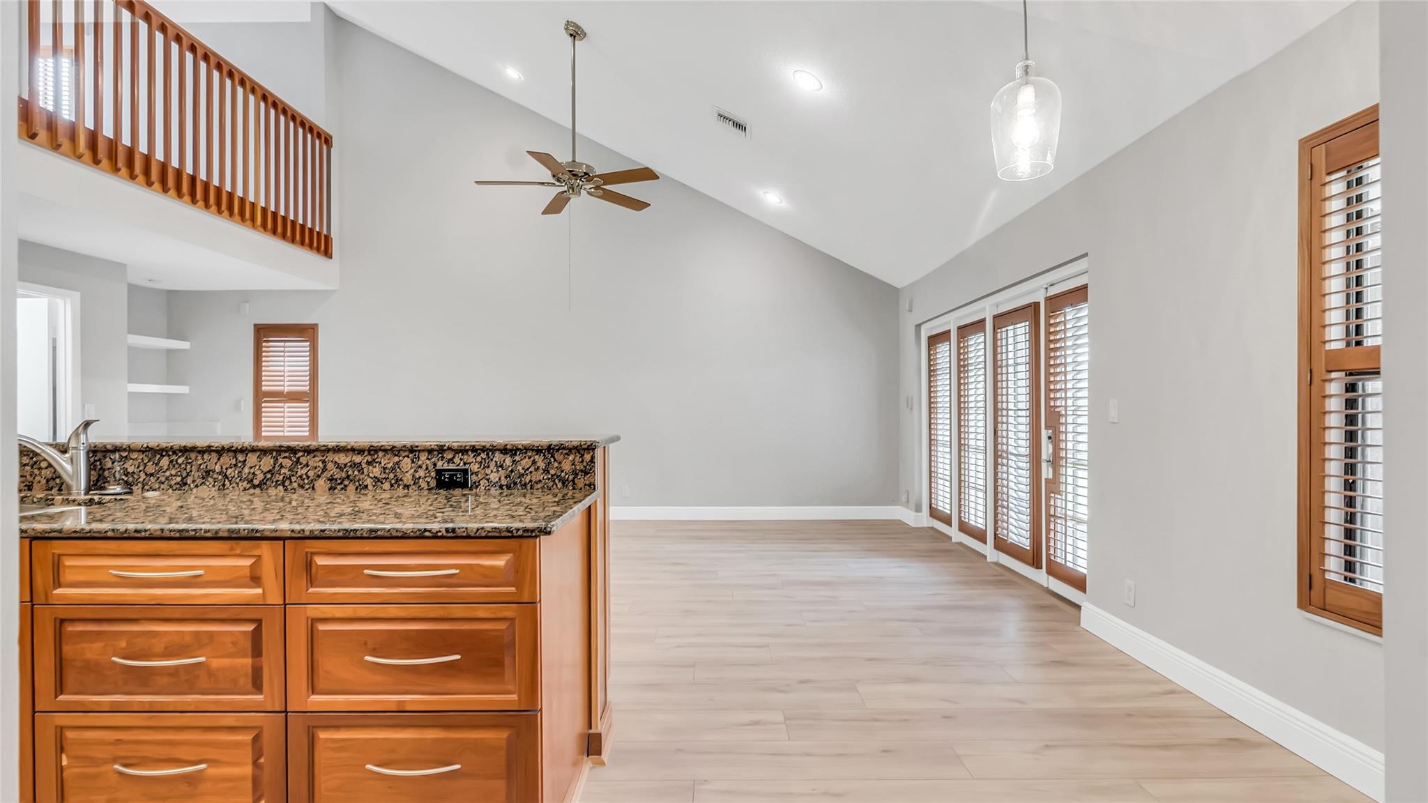 Beautifully updated corner lot home, soaring ceilings, smart, functional layout! 2025 improvements include fresh interior/exterior paint, popcorn ceiling removed & upgraded laminate flooring throughout. First-floor primary suite features: walk-in closet, roman tub, stall shower, quartz vanity, private office/den w/wood floors, built-ins & impact windows Additional downstairs bedroom & full bath; 2 more bedrooms upstairs w/renovated full bath. Kitchen offers granite counters, wood cabinets, pantry pull-outs, under/upper cabinet lighting & abundant recessed lighting. Family room w/dry bar w/quartz counters, inside laundry room & Plantation shutters throughout. Whole-house 22KW propane generator, 2022 A/C, electric rolldown shutters, alarm system w/cameras, lush landscaping complete this home