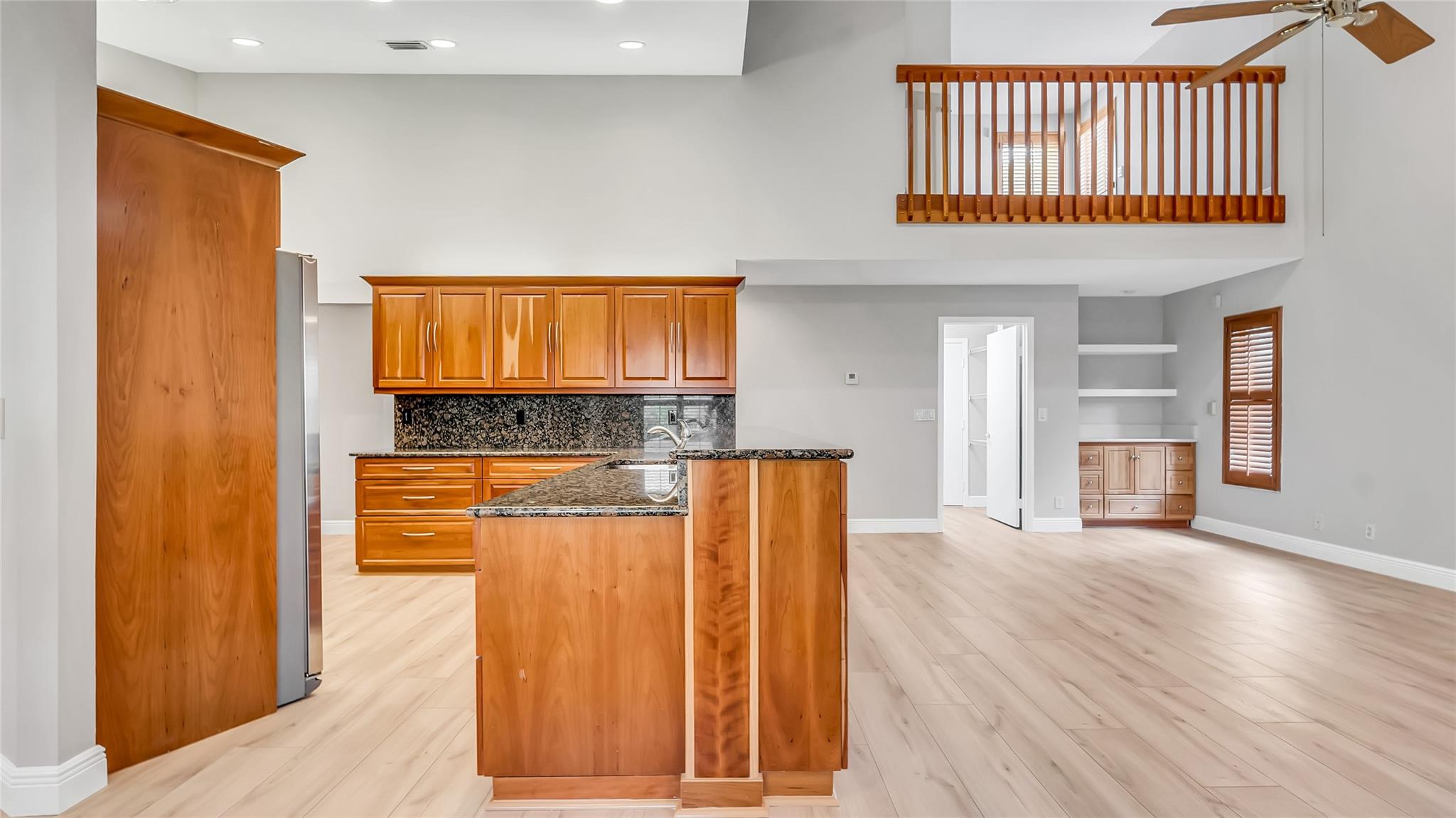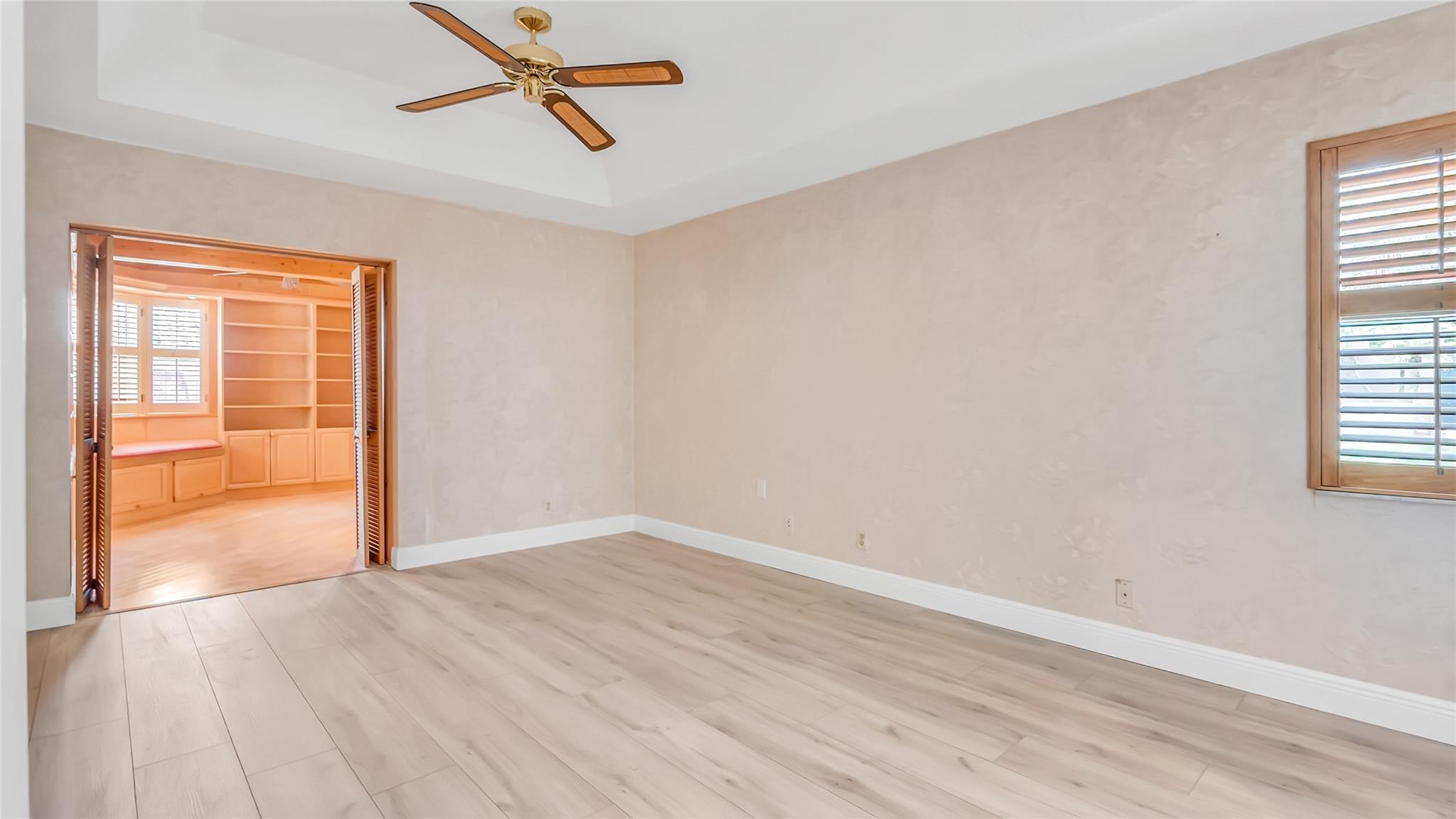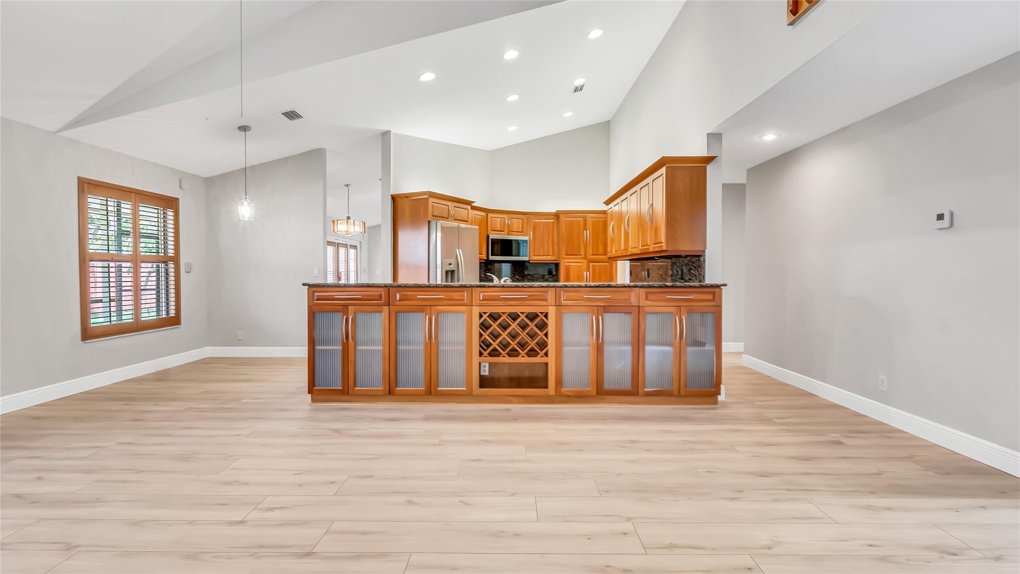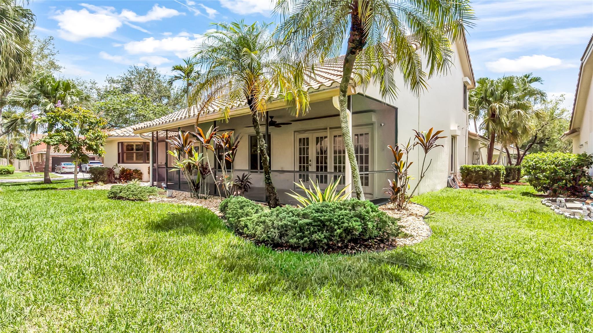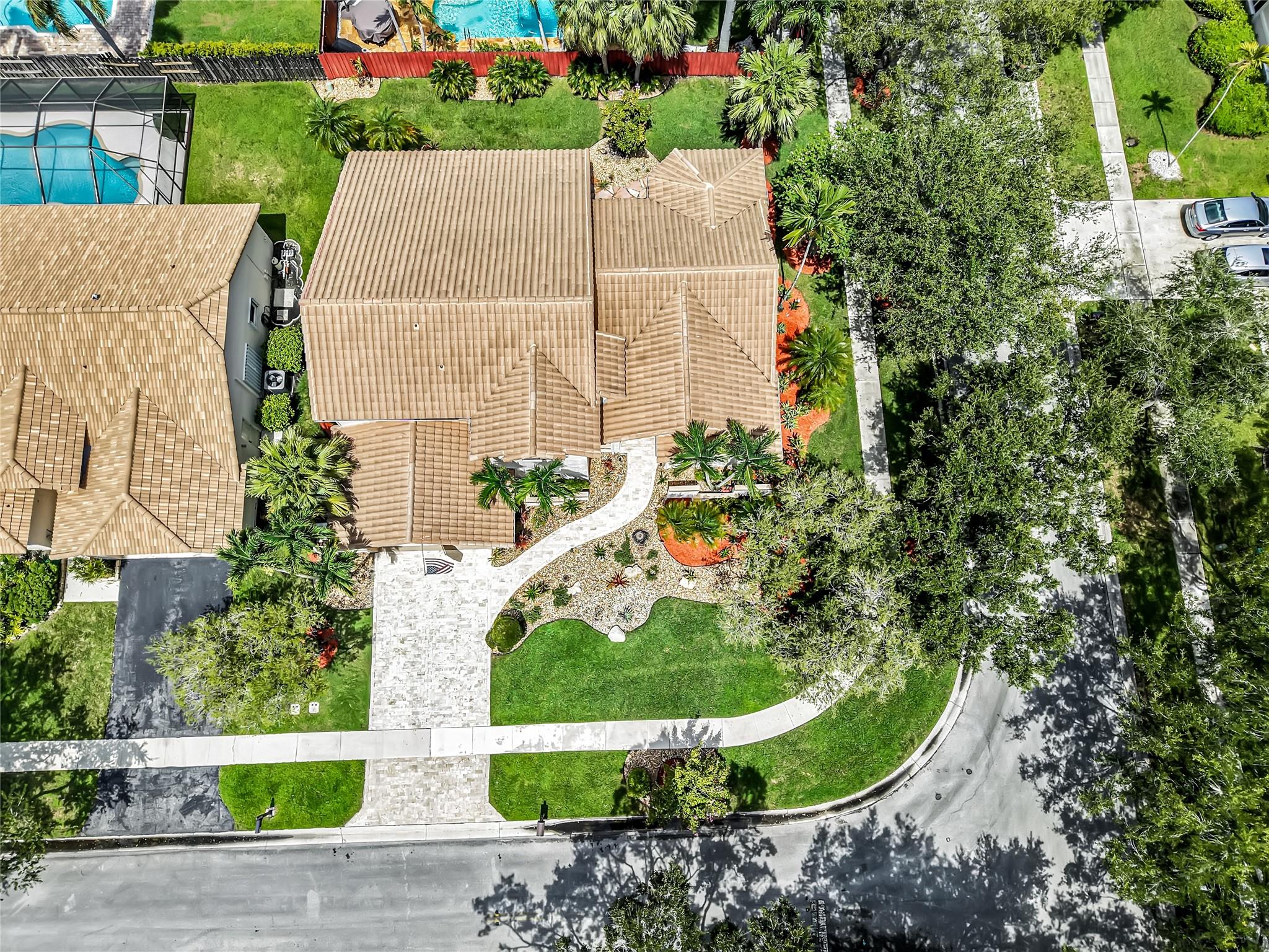 Beautifully updated corner lot home, soaring ceilings, smart, functional layout! 2025 improvements include fresh interior/exterior paint, popcorn ceiling removed & upgraded laminate flooring throughout. First-floor primary suite features: walk-in closet, roman tub, stall shower, quartz vanity, private office/den w/wood floors, built-ins & impact windows Additional downstairs bedroom & full bath; 2 more bedrooms upstairs w/renovated full bath. Kitchen offers granite counters, wood cabinets, pantry pull-outs, under/upper cabinet lighting & abundant recessed lighting. Family room w/dry bar w/quartz counters, inside laundry room & Plantation shutters throughout. Whole-house 22KW propane generator, 2022 A/C, electric rolldown shutters, alarm system w/cameras, lush landscaping complete this home