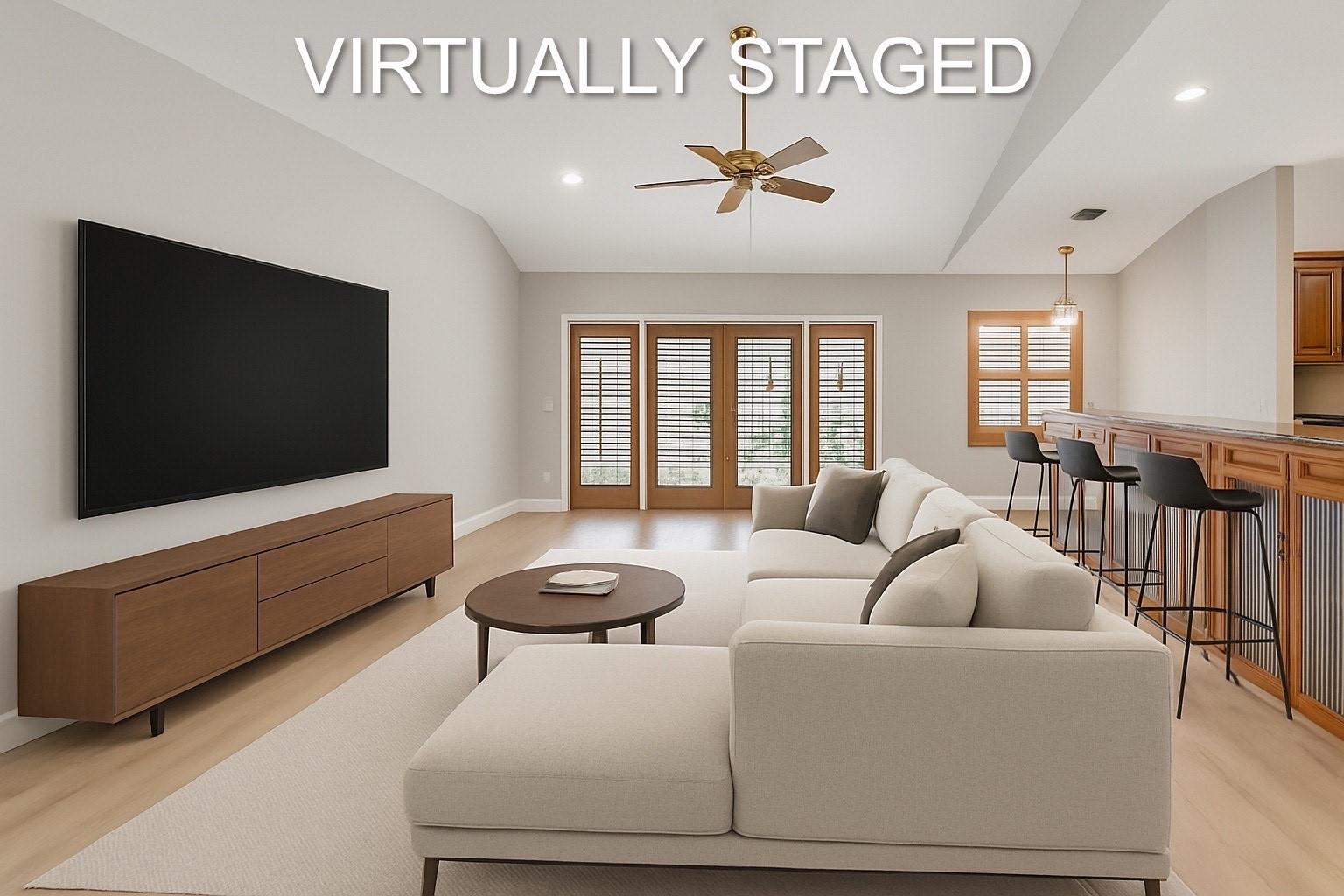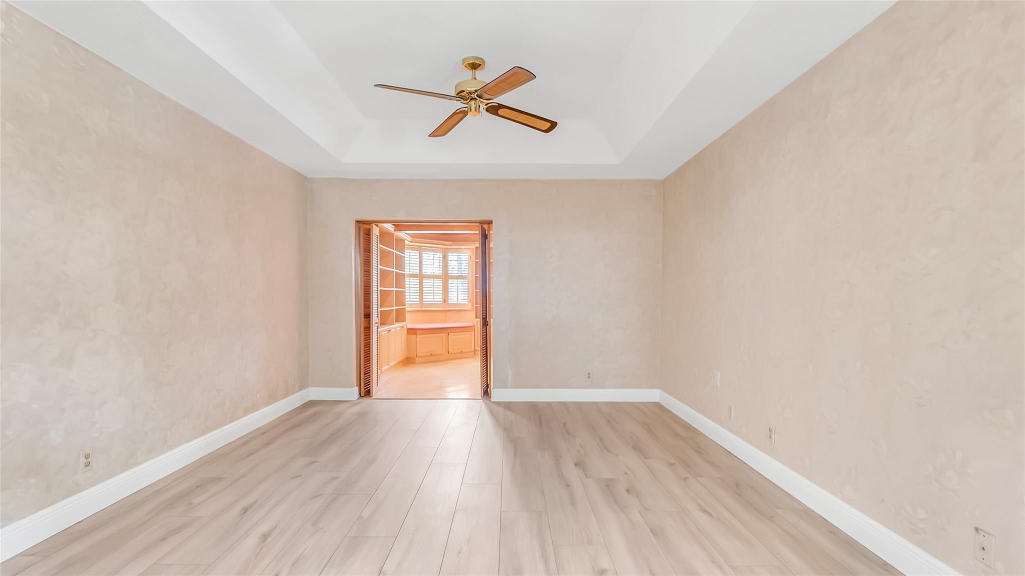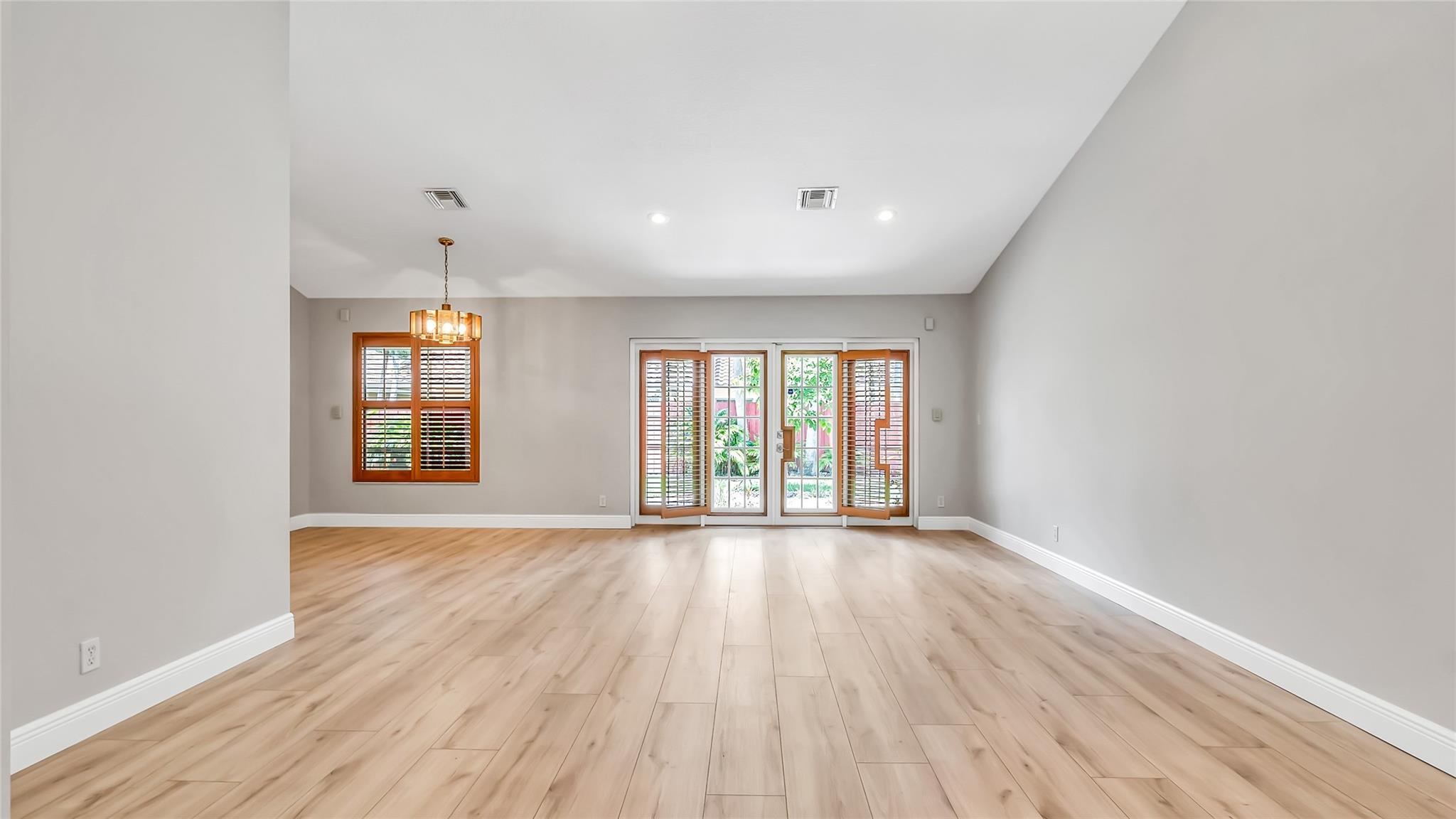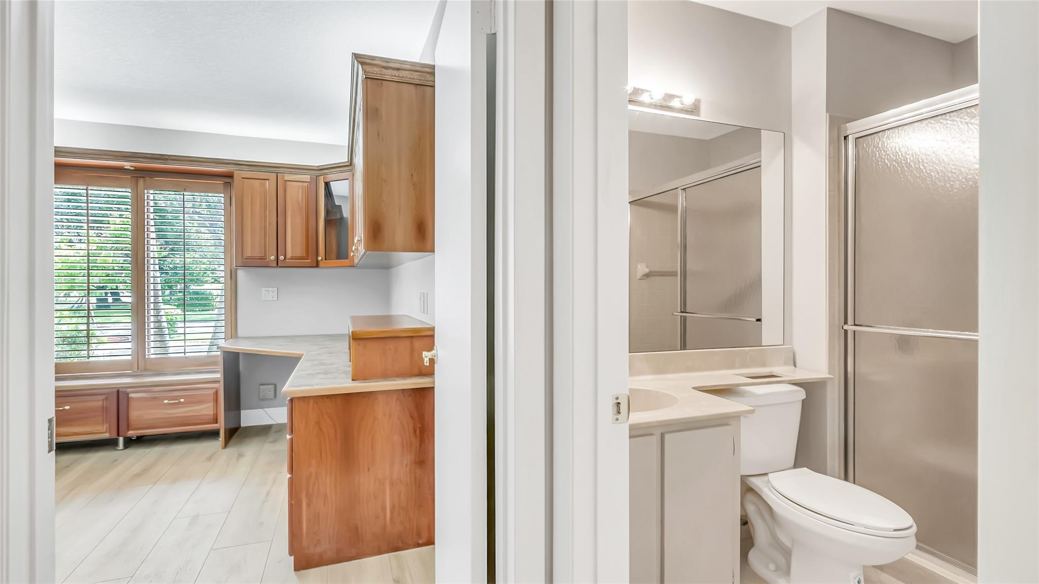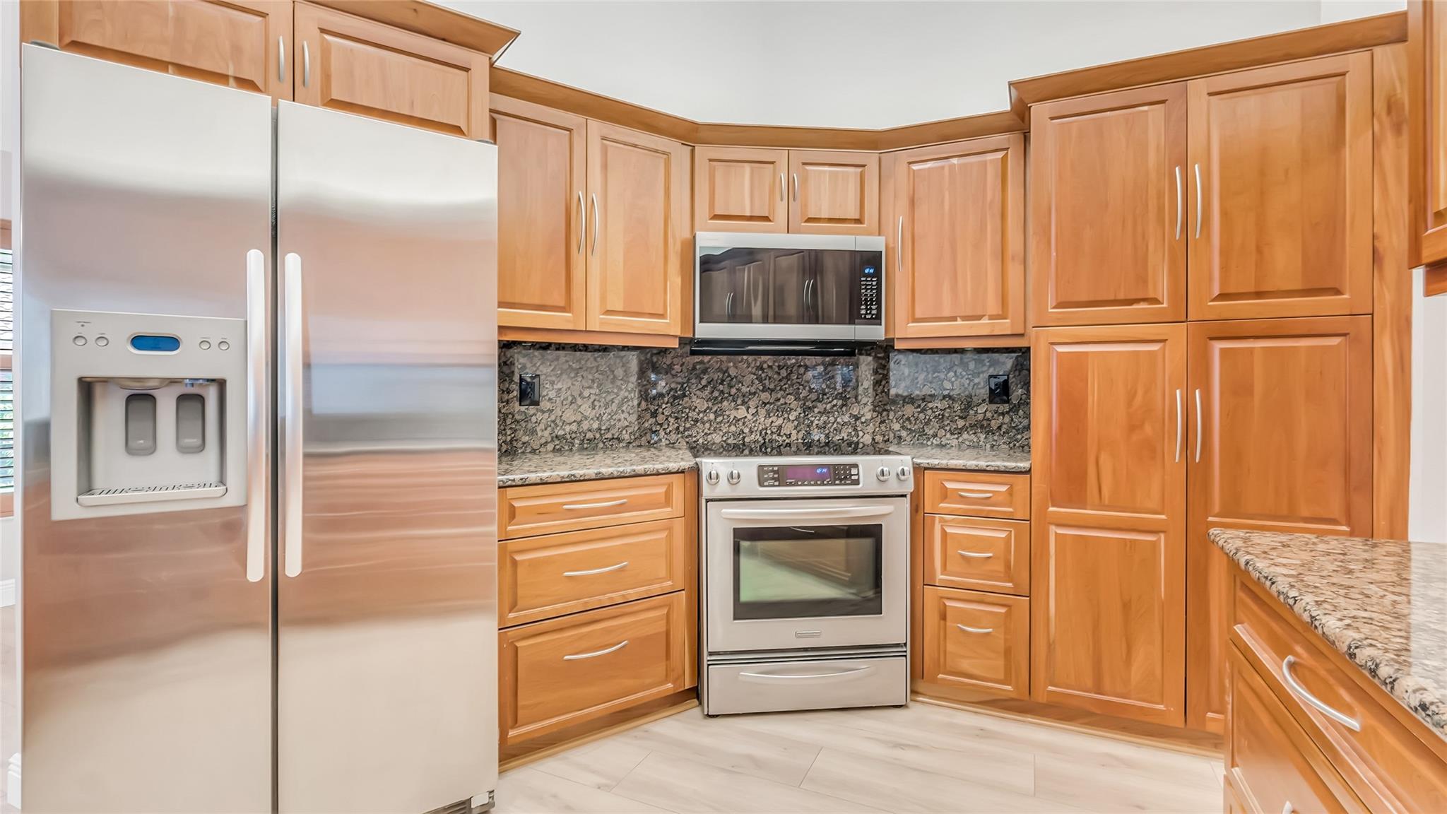 Beautifully updated corner lot home, soaring ceilings, smart, functional layout! 2025 improvements include fresh interior/exterior paint, popcorn ceiling removed & upgraded laminate flooring throughout. First-floor primary suite features: walk-in closet, roman tub, stall shower, quartz vanity, private office/den w/wood floors, built-ins & impact windows Additional downstairs bedroom & full bath; 2 more bedrooms upstairs w/renovated full bath. Kitchen offers granite counters, wood cabinets, pantry pull-outs, under/upper cabinet lighting & abundant recessed lighting. Family room w/dry bar w/quartz counters, inside laundry room & Plantation shutters throughout. Whole-house 22KW propane generator, 2022 A/C, electric rolldown shutters, alarm system w/cameras, lush landscaping complete this home