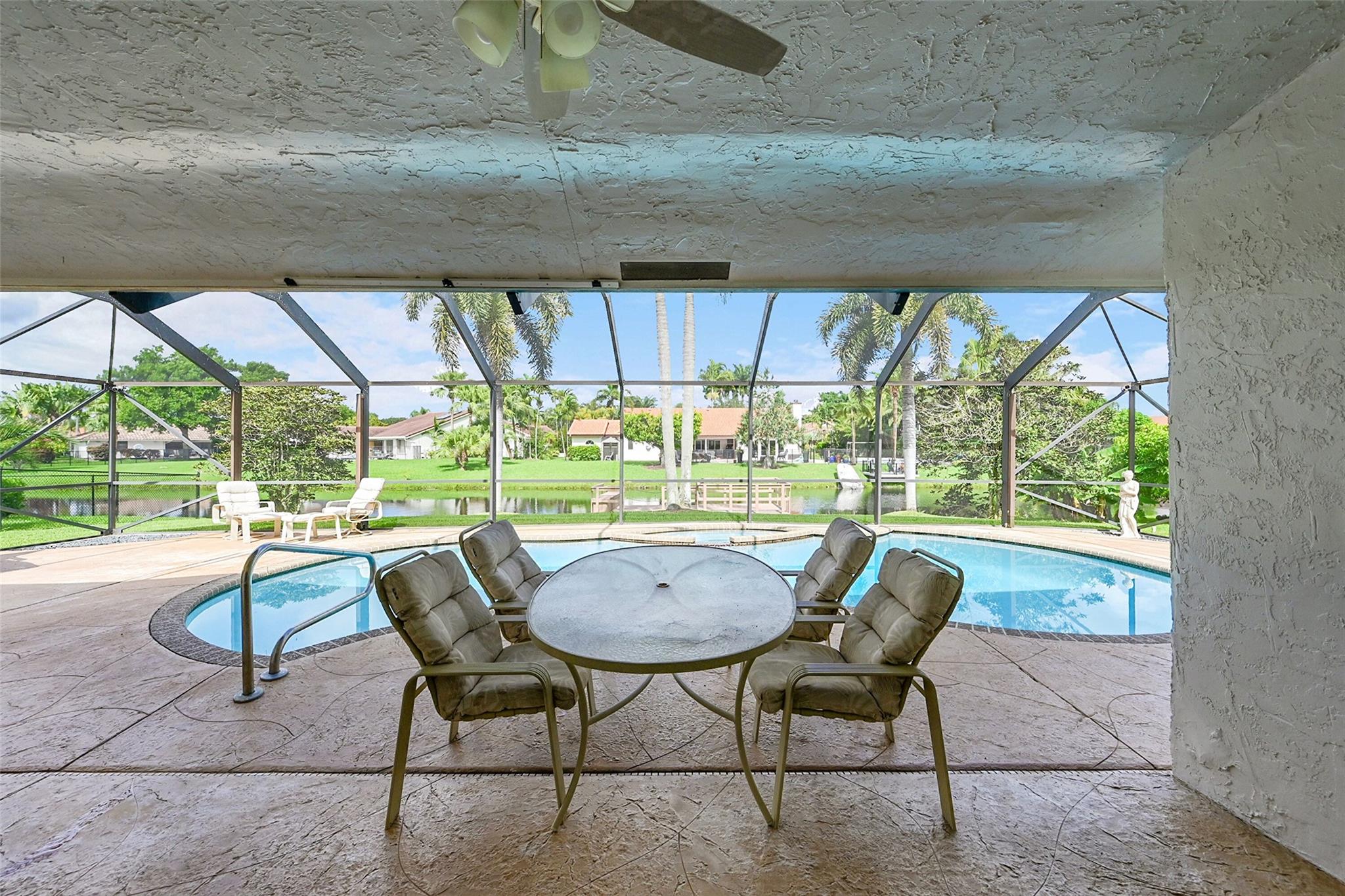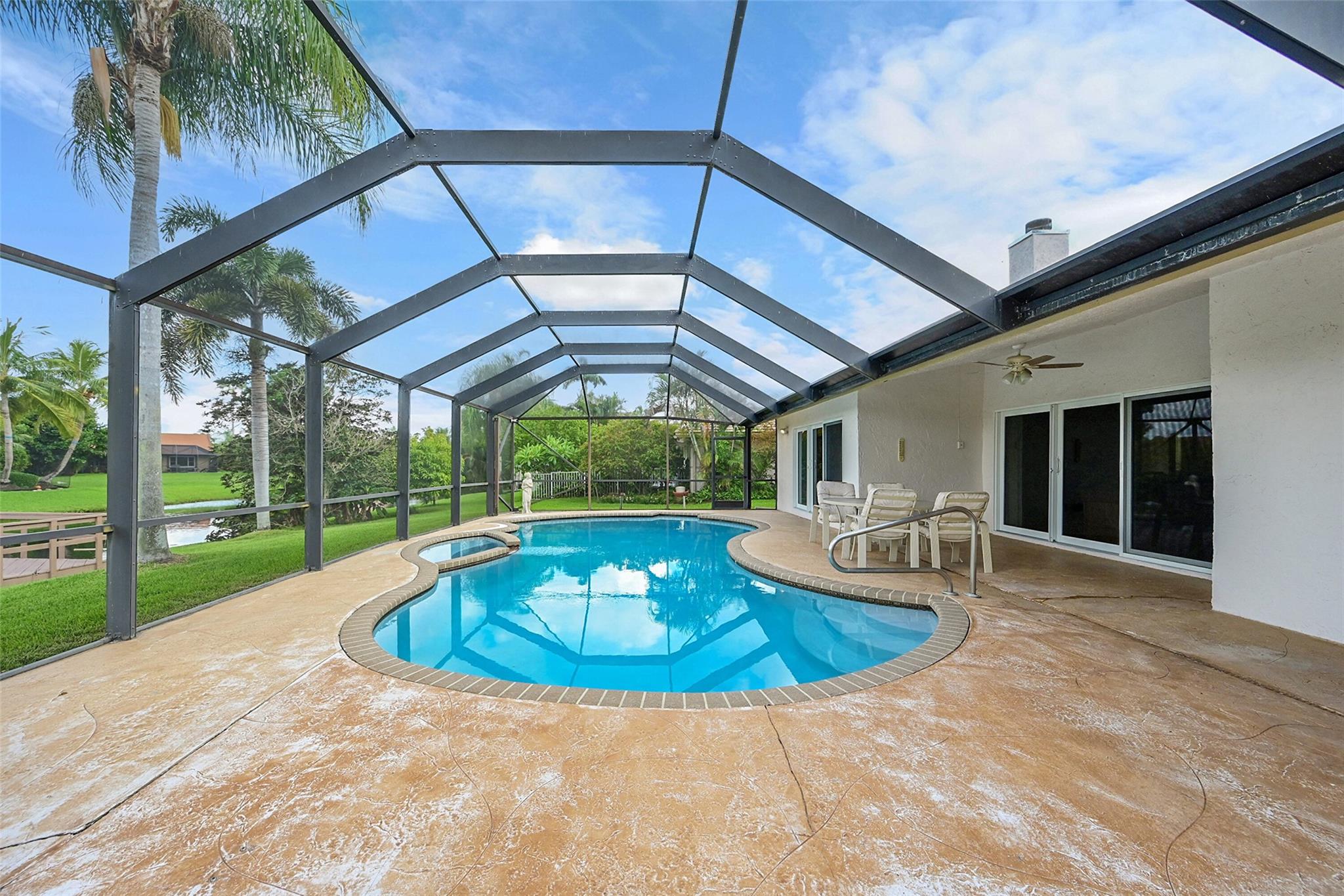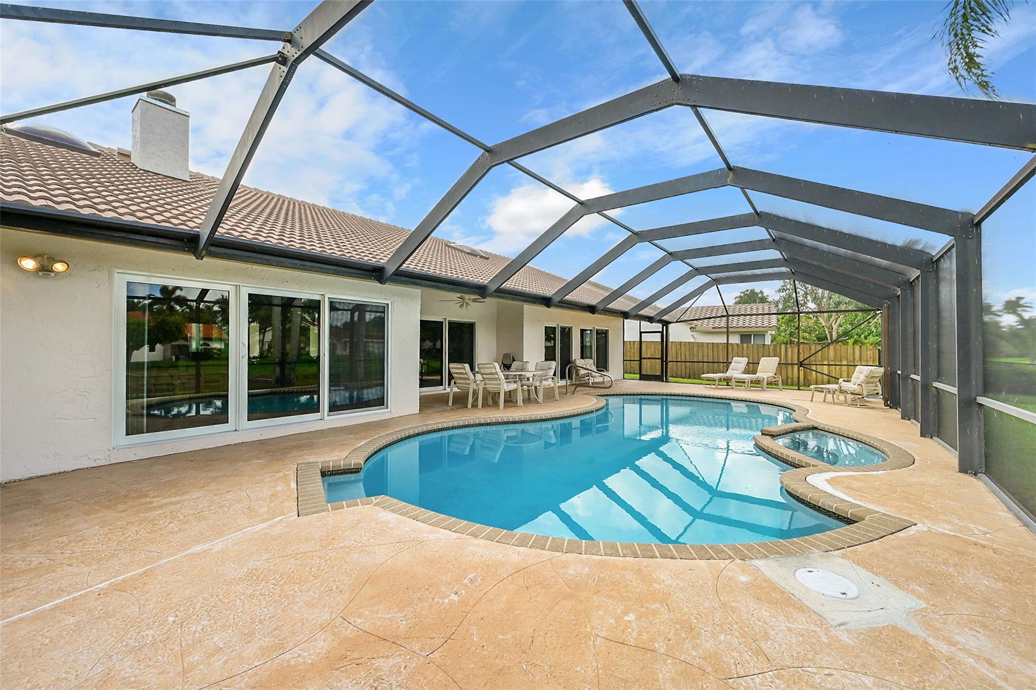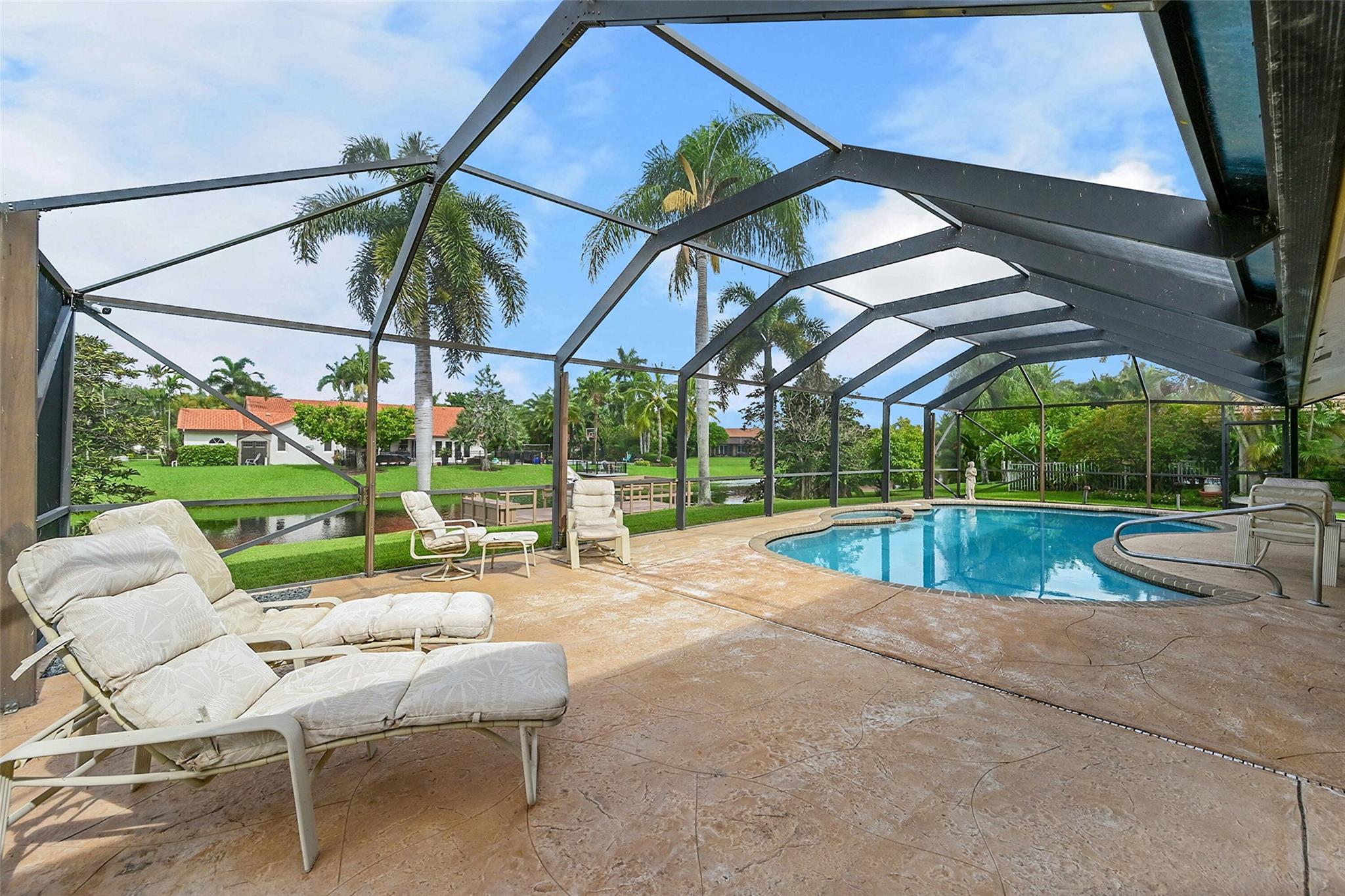 Light, bright & beautifully spacious! Located in sought-after Jacaranda Lakes, this inviting home welcomes you with soaring vaulted ceilings, a formal dining area, open family room, wet bar, and a cozy sunken conversation area with fireplace and natural stone wall. The large kitchen offers a skylight, breakfast nook & private patio—perfect for morning coffee. Enjoy sunset views from the oversized screened pool, ideal for entertaining, overlooking serene waterfront & private dock. 4 beds, 2 baths, NEW barrel tile roof, 2 new A/C units, impact windows/doors, laundry room, 2-car garage & lake-fed sprinkler system. Peaceful streets, friendly neighbors, and lush surroundings make this the perfect place to call home—just bring your personal touch and start making memories!