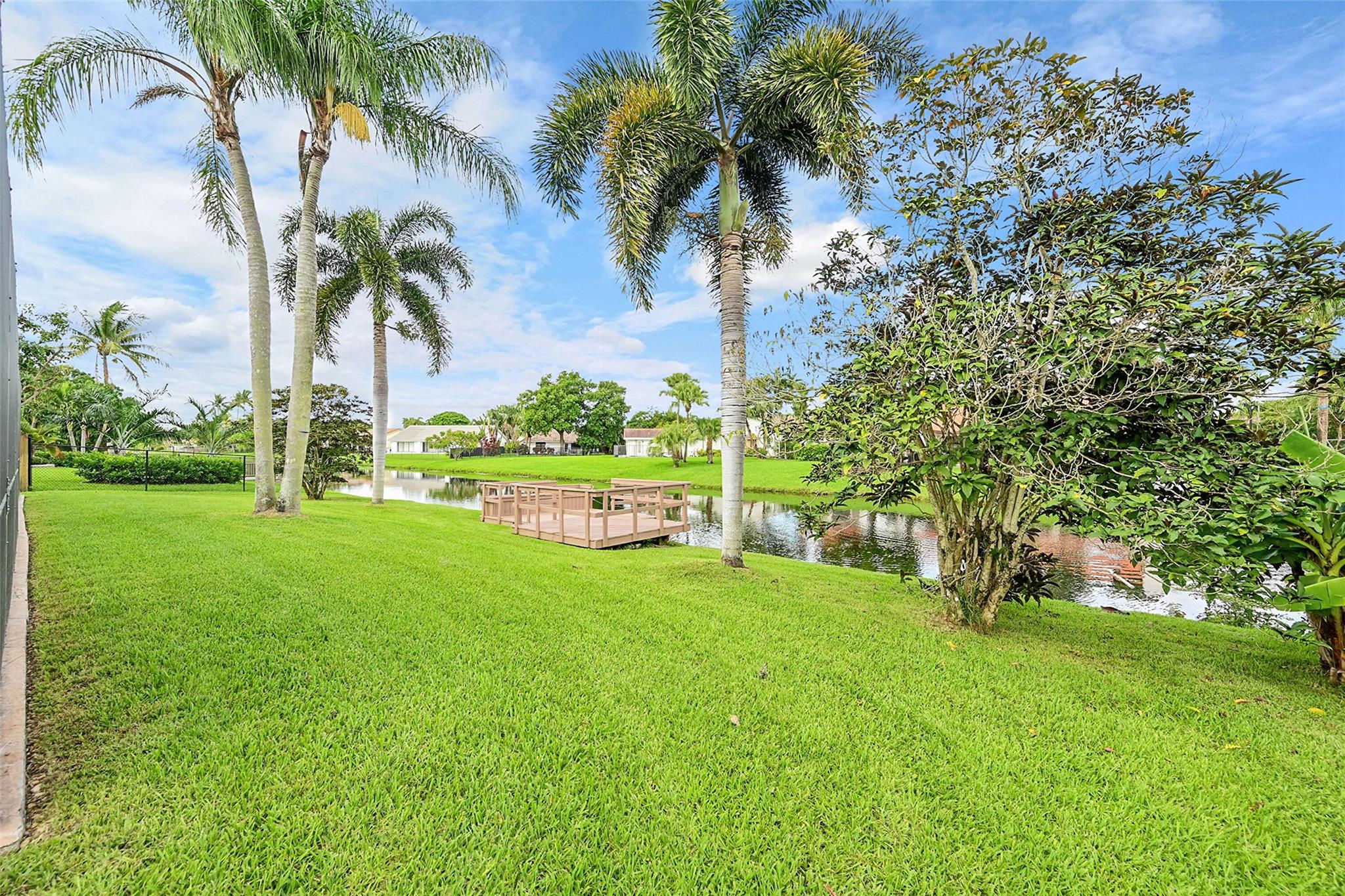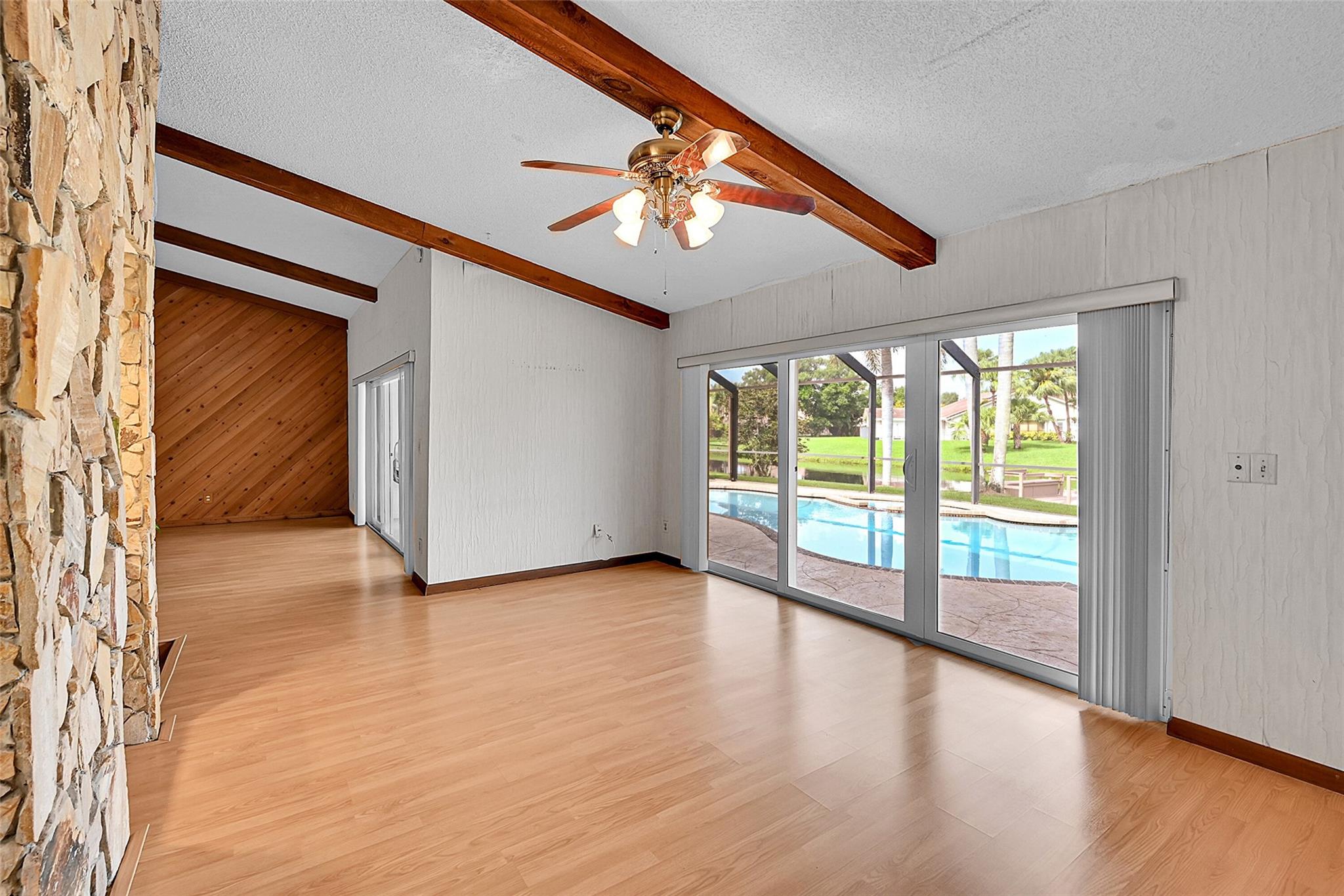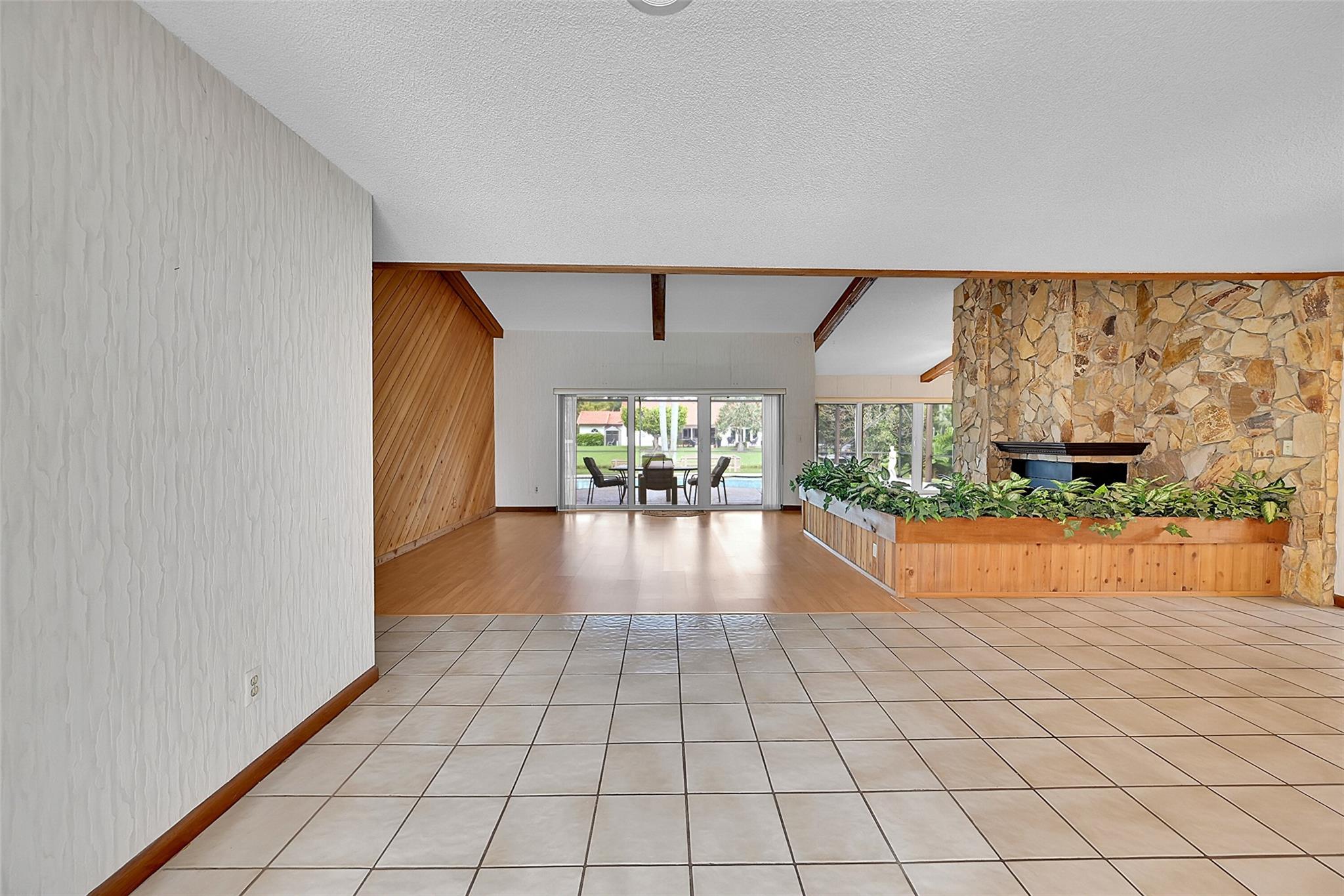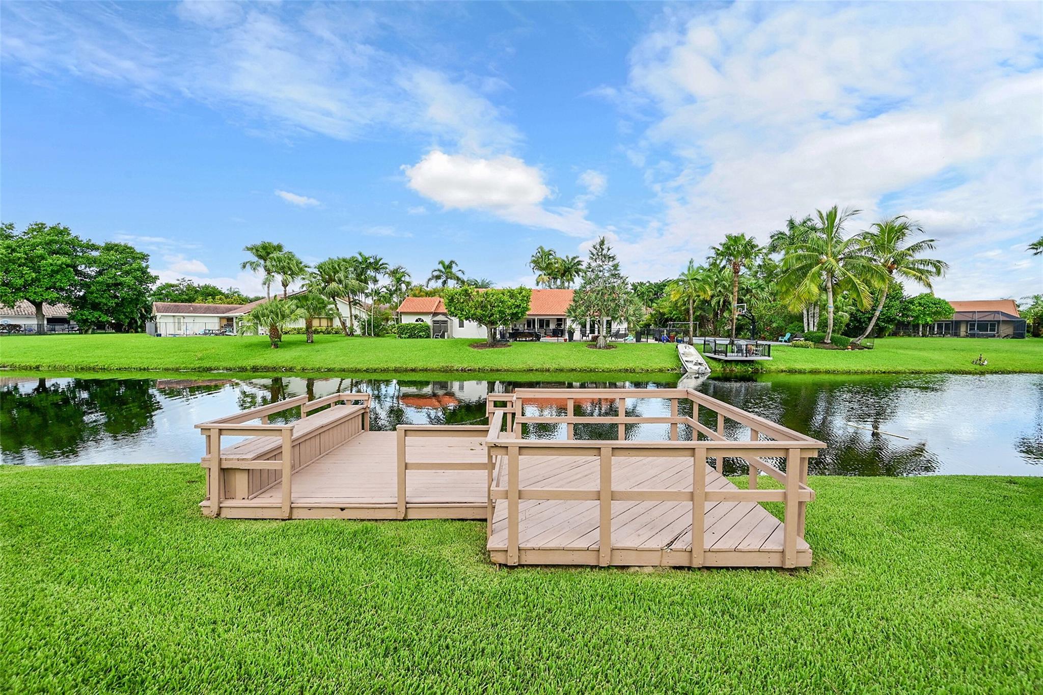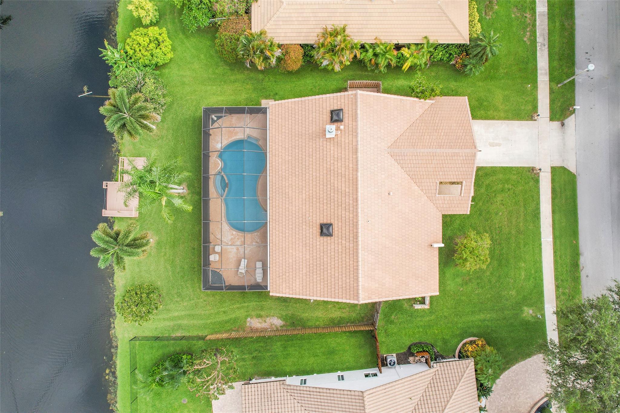 Light, bright & beautifully spacious! Located in sought-after Jacaranda Lakes, this inviting home welcomes you with soaring vaulted ceilings, a formal dining area, open family room, wet bar, and a cozy sunken conversation area with fireplace and natural stone wall. The large kitchen offers a skylight, breakfast nook & private patio—perfect for morning coffee. Enjoy sunset views from the oversized screened pool, ideal for entertaining, overlooking serene waterfront & private dock. 4 beds, 2 baths, NEW barrel tile roof, 2 new A/C units, impact windows/doors, laundry room, 2-car garage & lake-fed sprinkler system. Peaceful streets, friendly neighbors, and lush surroundings make this the perfect place to call home—just bring your personal touch and start making memories!