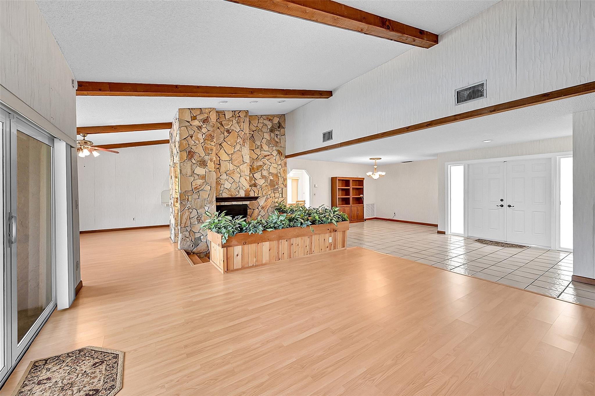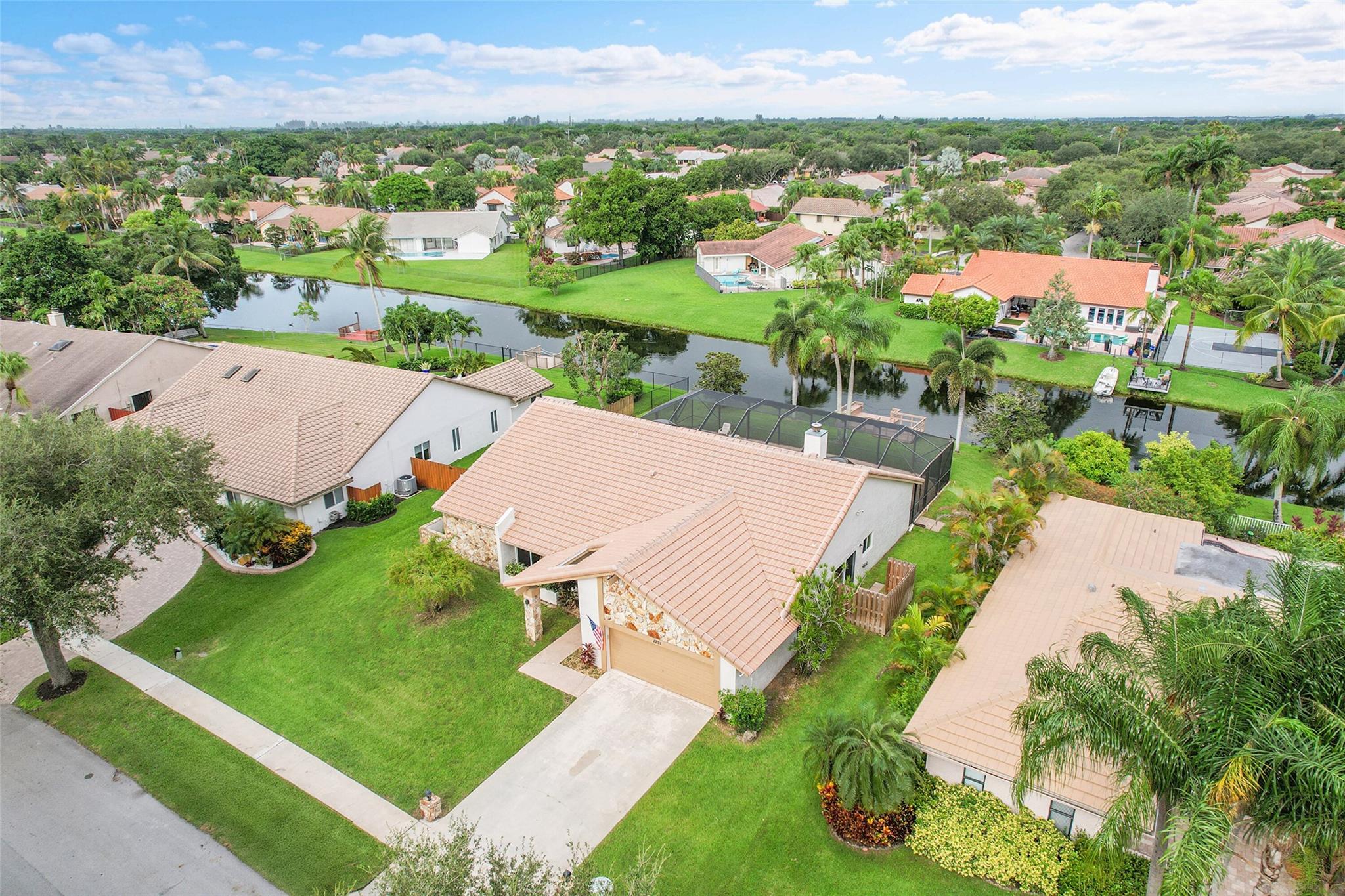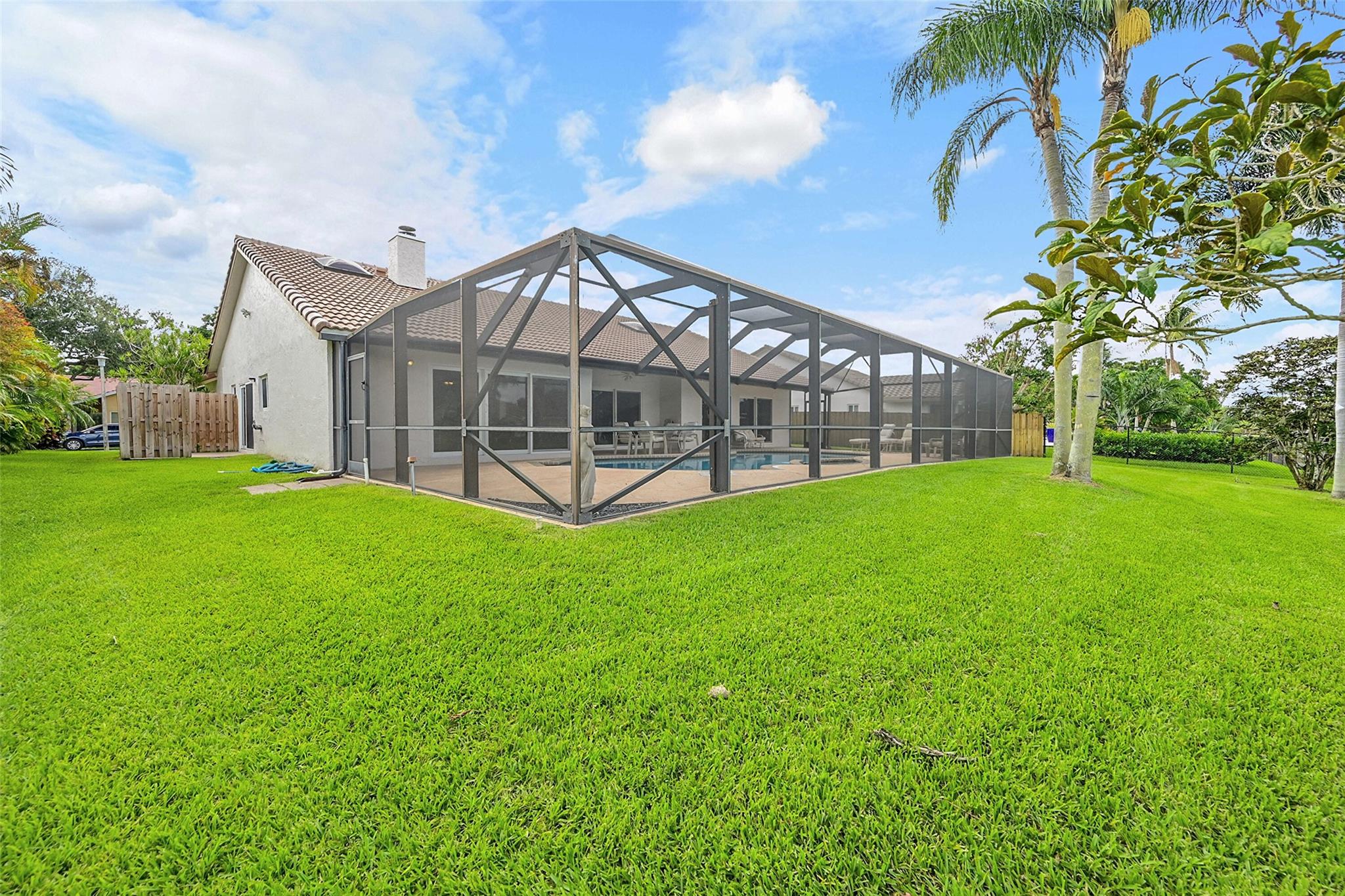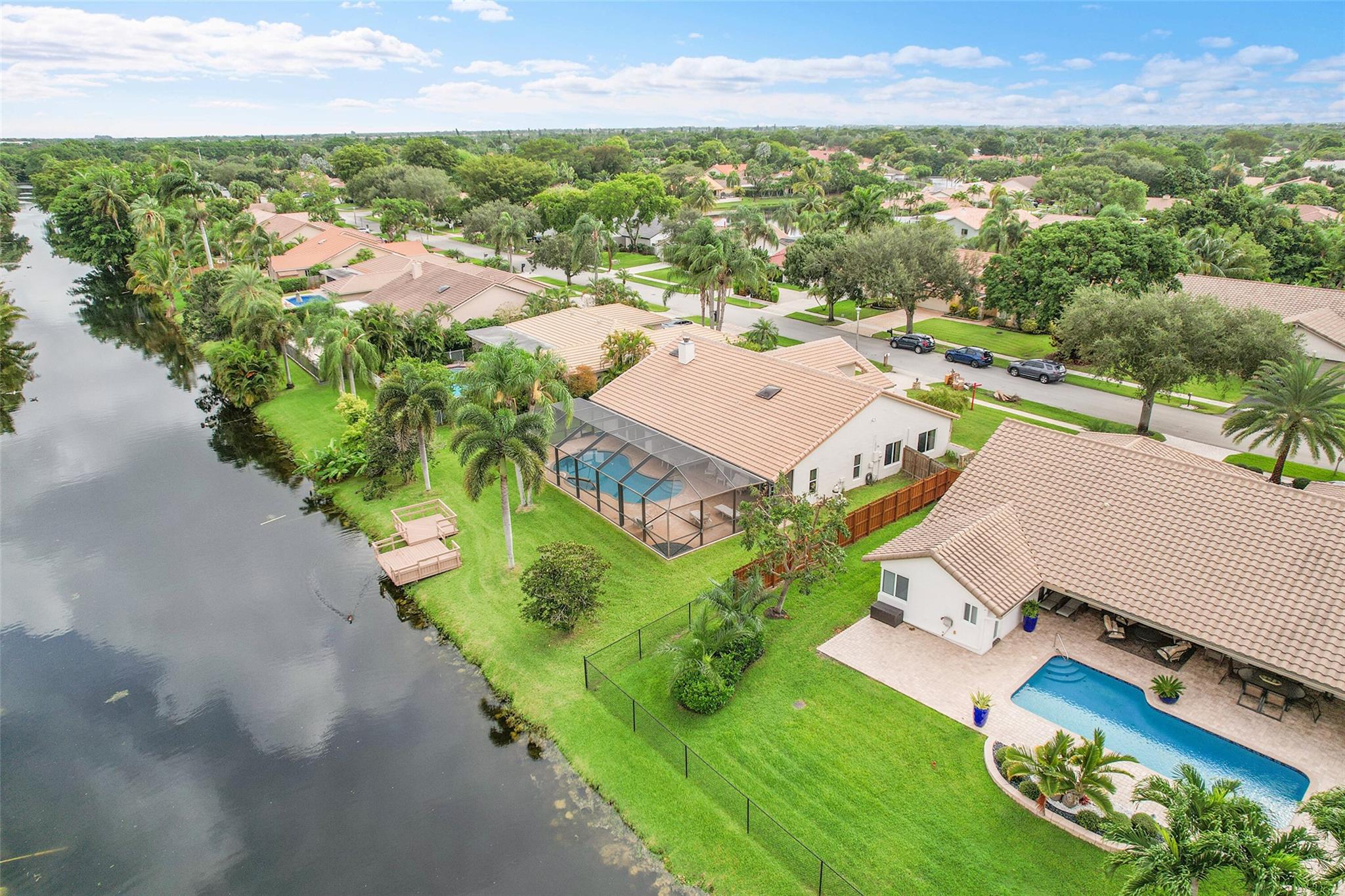 Light, bright & beautifully spacious! Located in sought-after Jacaranda Lakes, this inviting home welcomes you with soaring vaulted ceilings, a formal dining area, open family room, wet bar, and a cozy sunken conversation area with fireplace and natural stone wall. The large kitchen offers a skylight, breakfast nook & private patio—perfect for morning coffee. Enjoy sunset views from the oversized screened pool, ideal for entertaining, overlooking serene waterfront & private dock. 4 beds, 2 baths, NEW barrel tile roof, 2 new A/C units, impact windows/doors, laundry room, 2-car garage & lake-fed sprinkler system. Peaceful streets, friendly neighbors, and lush surroundings make this the perfect place to call home—just bring your personal touch and start making memories!