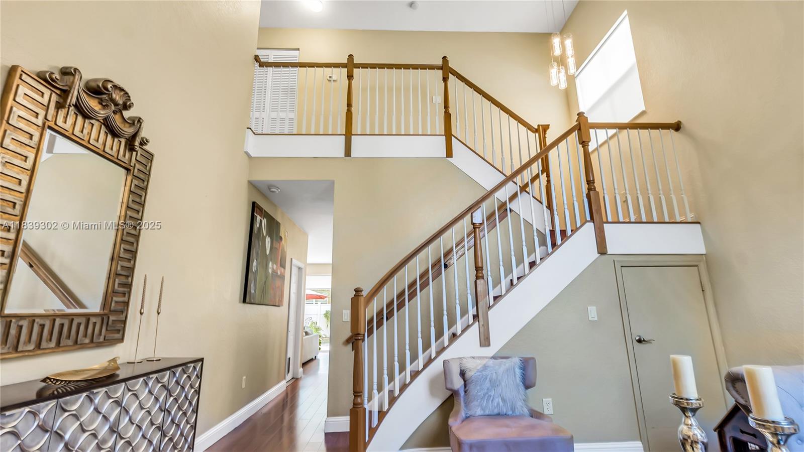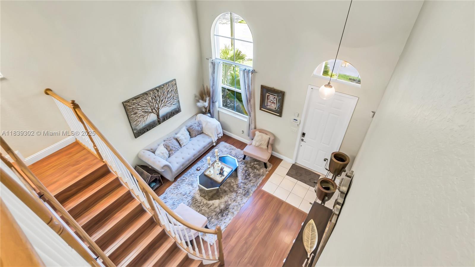 Welcome to this elegant 4-bedroom, 2.5-bath home nestled in a beautifully maintained community. This two-story residence offers a spacious and inviting layout with soaring ceilings, abundant natural light, and stylish wood flooring throughout the main living areas. The formal living room features a dramatic double-height window and graceful staircase, creating a grand first impression. Enjoy a well-appointed kitchen and separate laundry room with modern appliances. All bedrooms are located upstairs, providing privacy from the living spaces. The primary suite includes ample closet space and a comfortable layout for relaxing. Additional features include a powder room on the main level, a two-car garage, and a fenced backyard with mature landscaping.