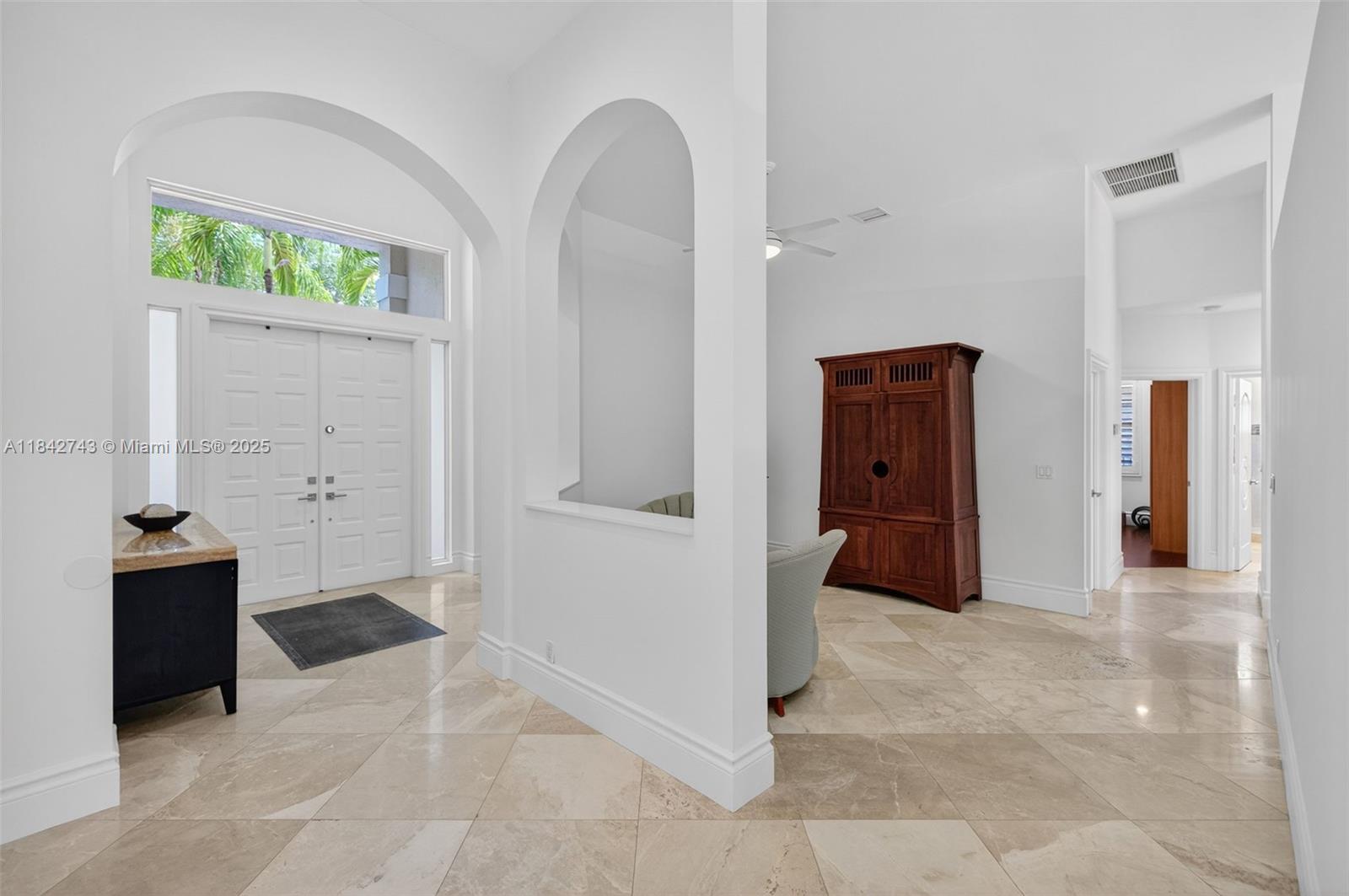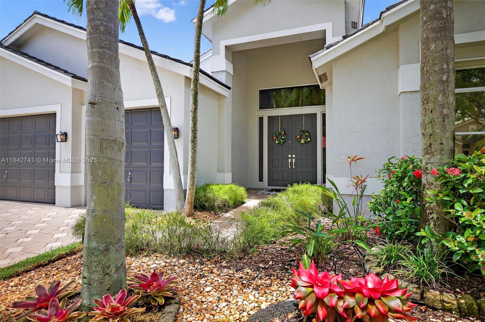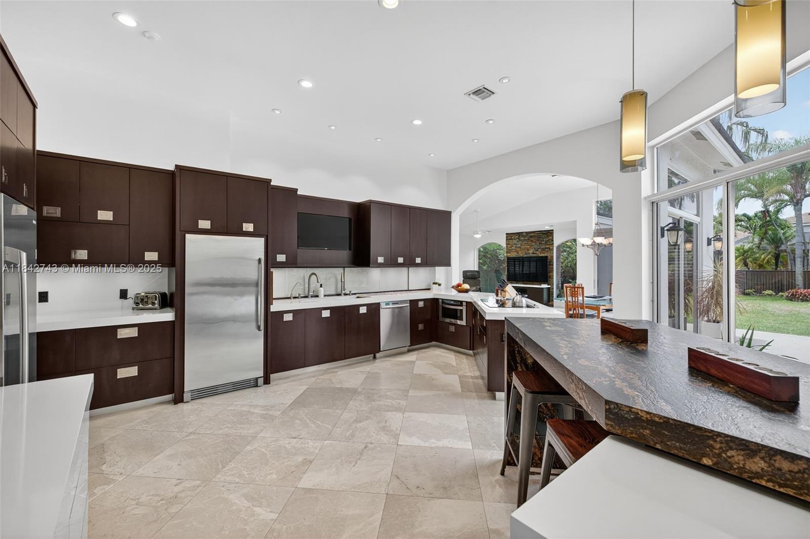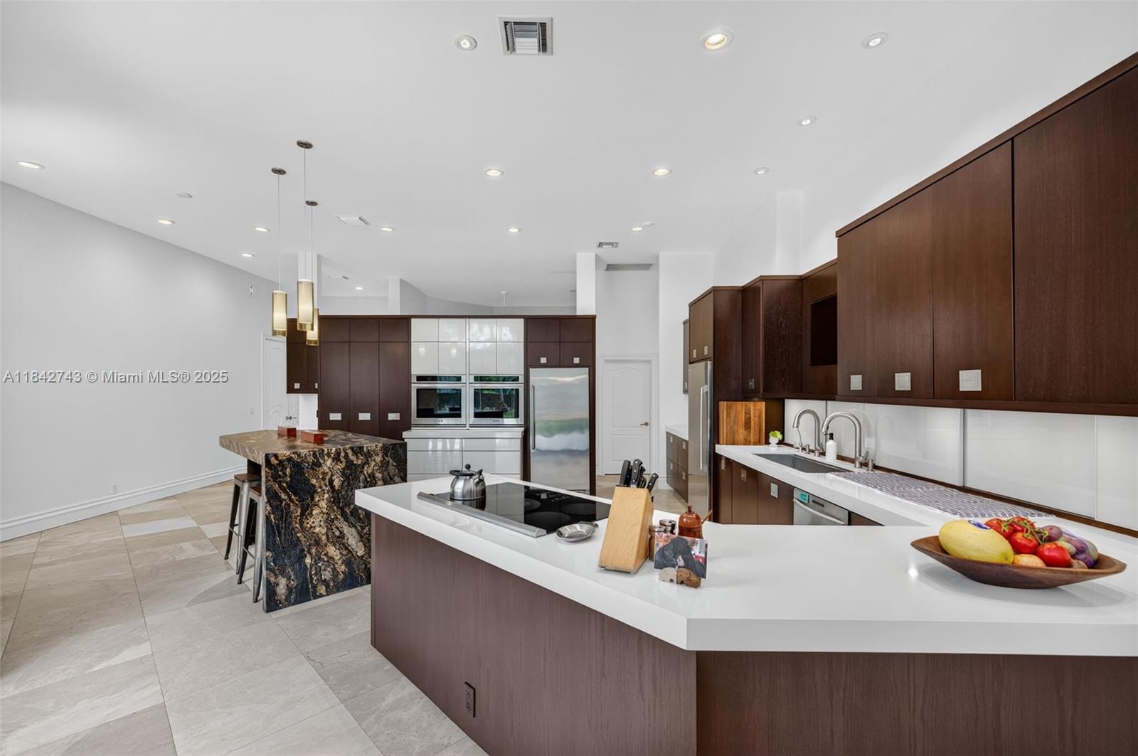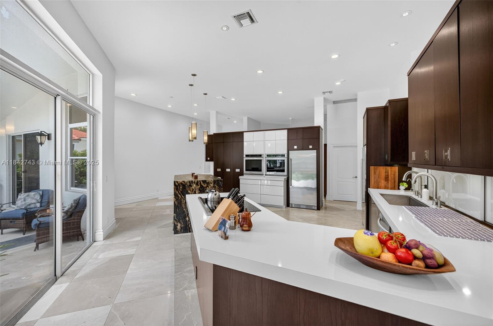 Located in a quiet, pet-friendly neighborhood with 24-hr manned gate and walkable access to the town center, this 4/3 features a Grand foyer, high ceilings and marble floors. Open kitchen with quartz counters, granite tabletop, prep sink, full-length appliance garage, retractable island, pull-out pantry, induction stove, double ovens, soft-close drawers, and built-in hutch. Master suite has flex room, sound-buffered walls, soaking tub, dual shower heads, floating furniture, and floor-to-ceiling closets. Guest suite is also sound-buffered. Living room features impact picture windows and floating TV unit. Wired for ceiling speakers. Accordion shutters, tinted windows, fenced yard, 3-car garage with workbench. Community has basketball, volleyball, and playground.