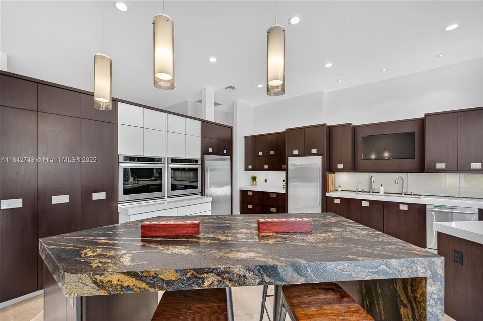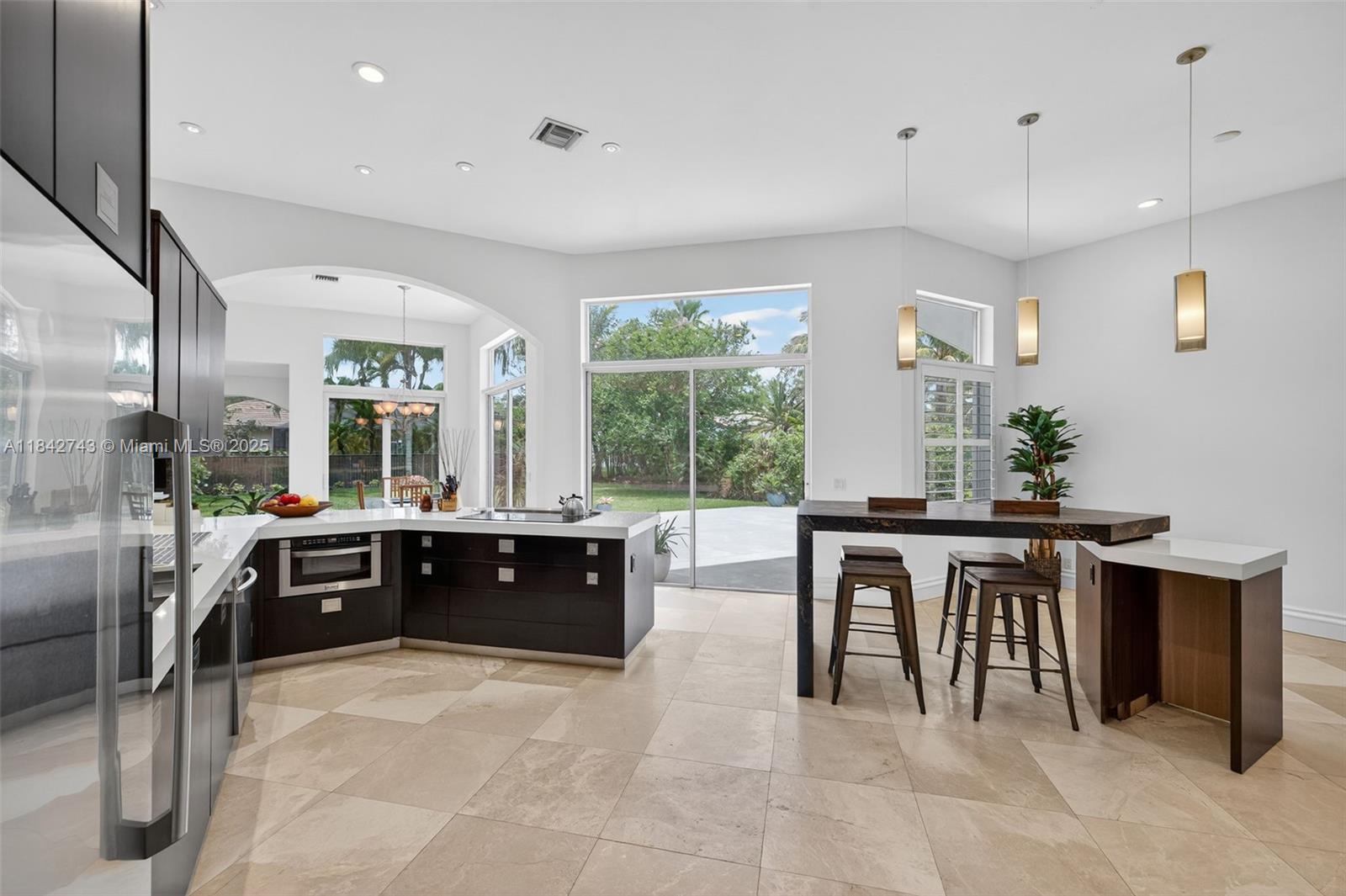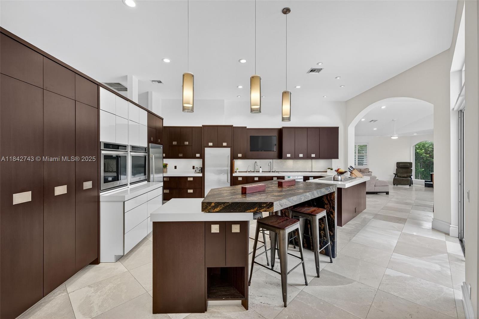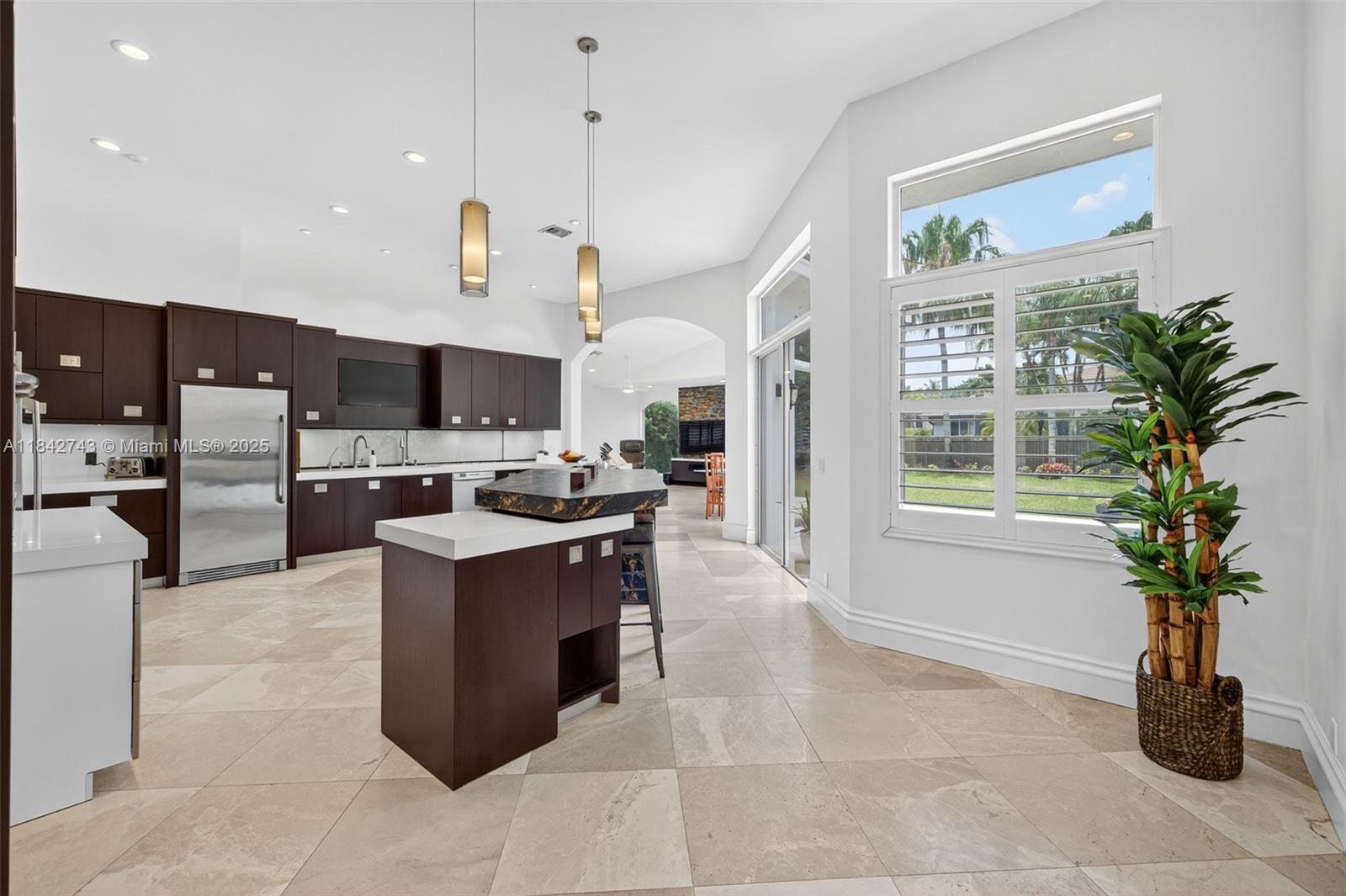 Located in a quiet, pet-friendly neighborhood with 24-hr manned gate and walkable access to the town center, this 4/3 features a Grand foyer, high ceilings and marble floors. Open kitchen with quartz counters, granite tabletop, prep sink, full-length appliance garage, retractable island, pull-out pantry, induction stove, double ovens, soft-close drawers, and built-in hutch. Master suite has flex room, sound-buffered walls, soaking tub, dual shower heads, floating furniture, and floor-to-ceiling closets. Guest suite is also sound-buffered. Living room features impact picture windows and floating TV unit. Wired for ceiling speakers. Accordion shutters, tinted windows, fenced yard, 3-car garage with workbench. Community has basketball, volleyball, and playground.