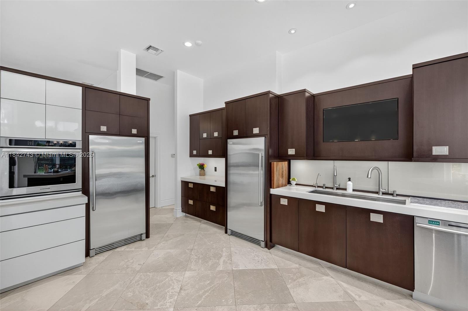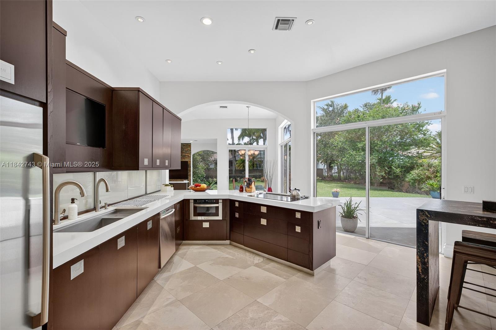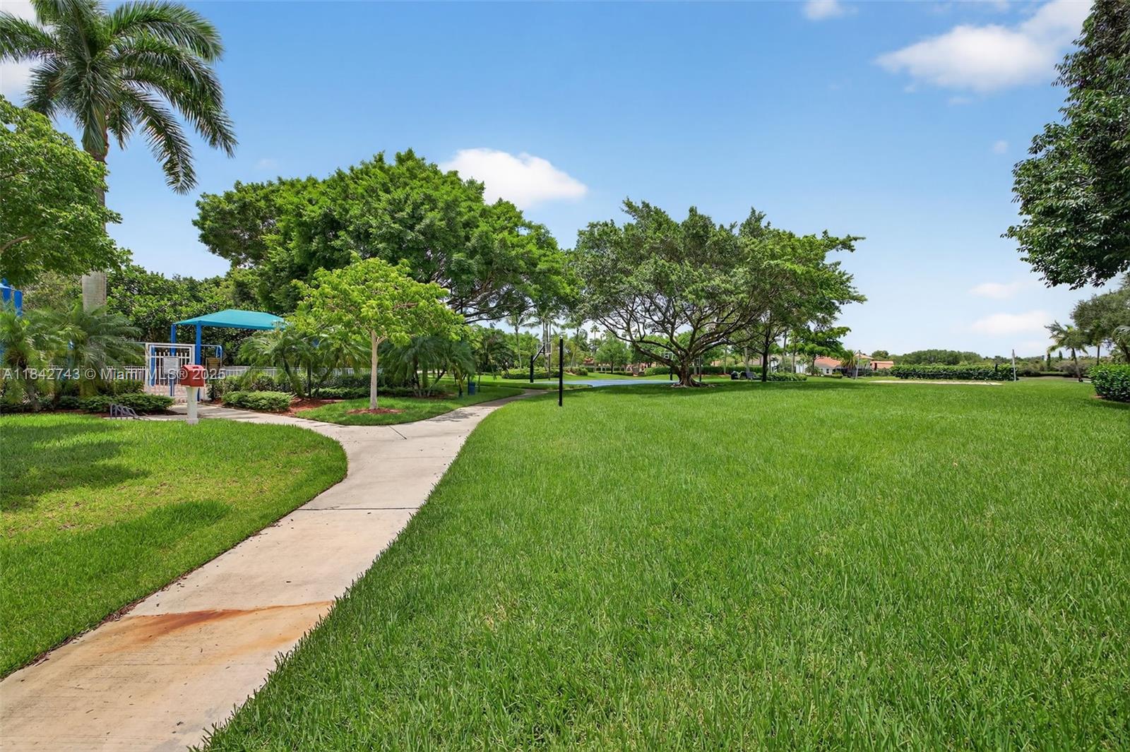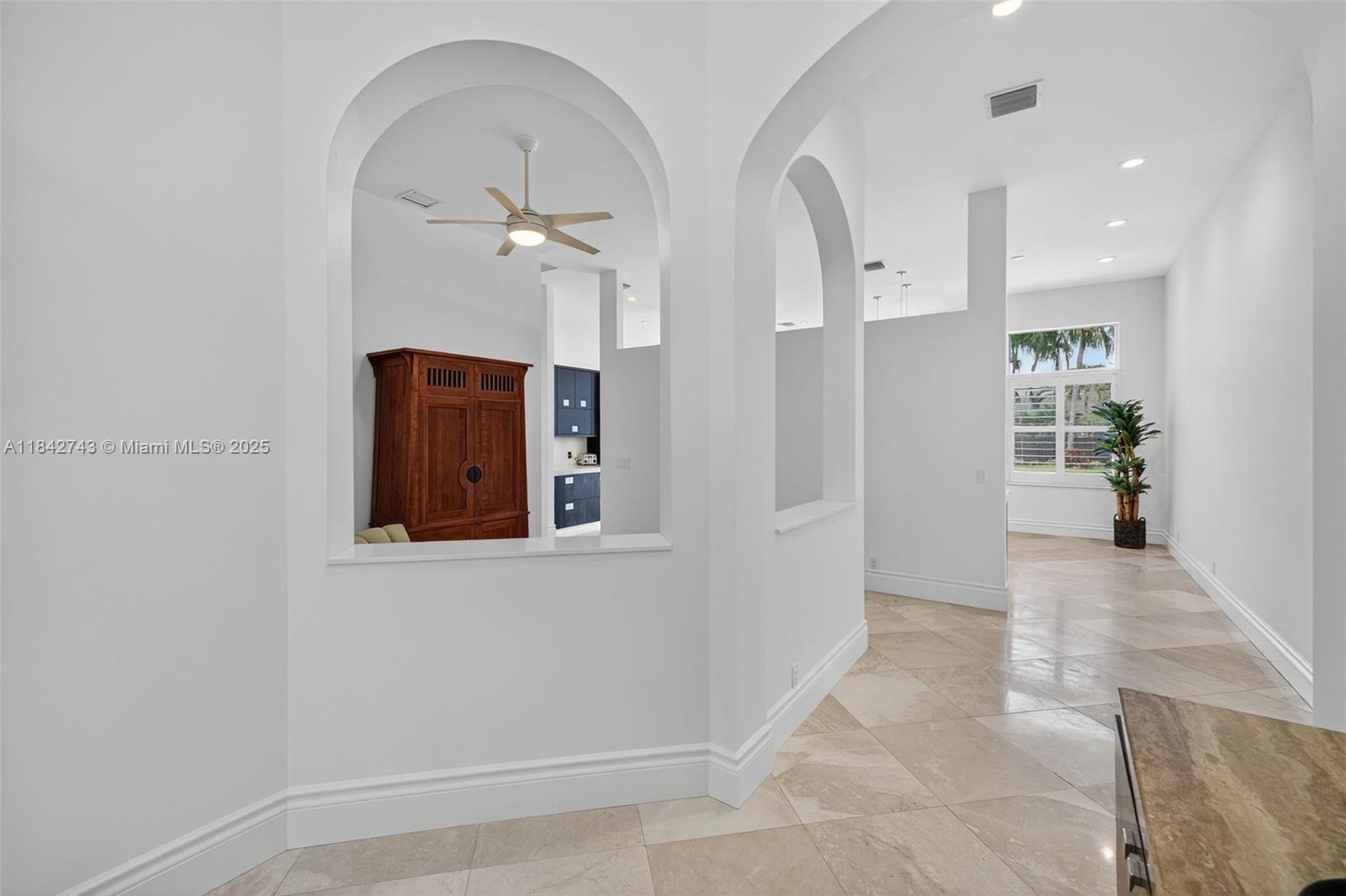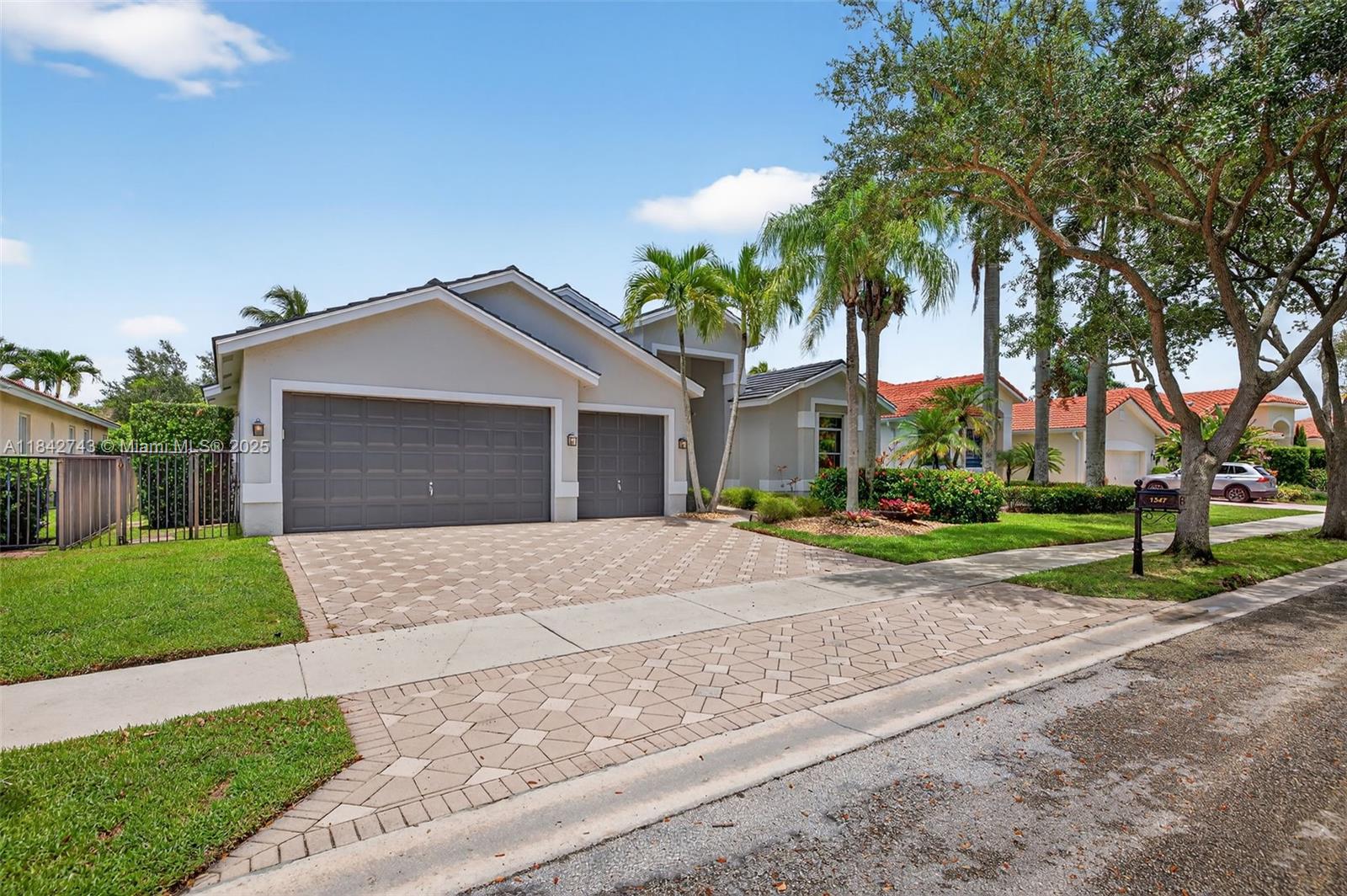 Located in a quiet, pet-friendly neighborhood with 24-hr manned gate and walkable access to the town center, this 4/3 features a Grand foyer, high ceilings and marble floors. Open kitchen with quartz counters, granite tabletop, prep sink, full-length appliance garage, retractable island, pull-out pantry, induction stove, double ovens, soft-close drawers, and built-in hutch. Master suite has flex room, sound-buffered walls, soaking tub, dual shower heads, floating furniture, and floor-to-ceiling closets. Guest suite is also sound-buffered. Living room features impact picture windows and floating TV unit. Wired for ceiling speakers. Accordion shutters, tinted windows, fenced yard, 3-car garage with workbench. Community has basketball, volleyball, and playground.