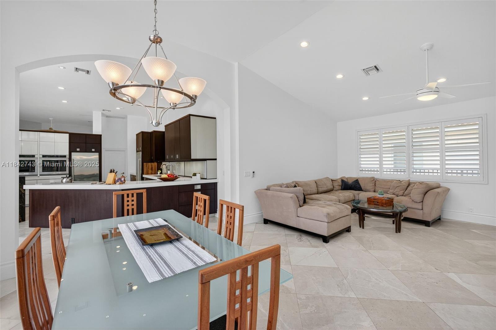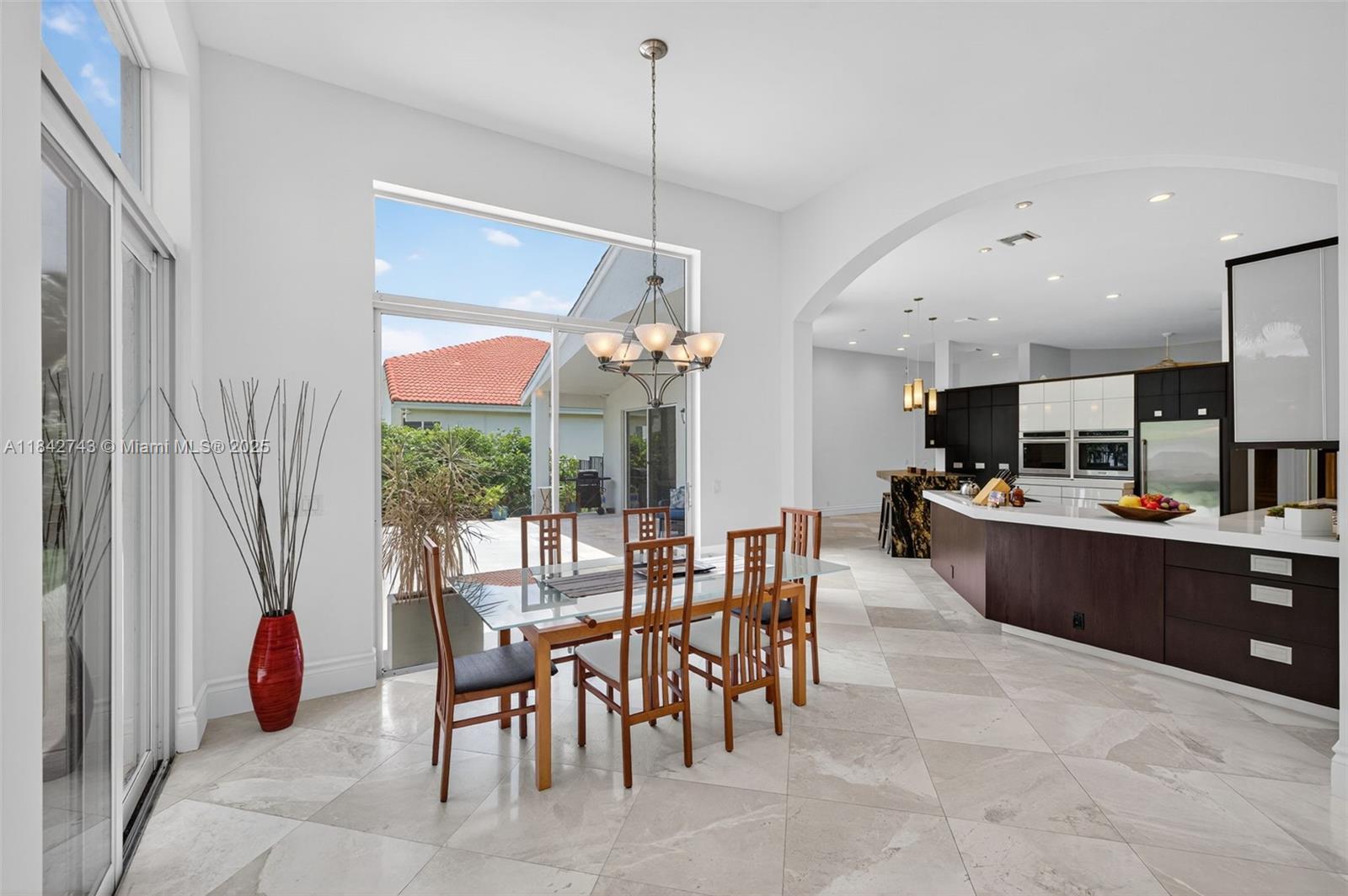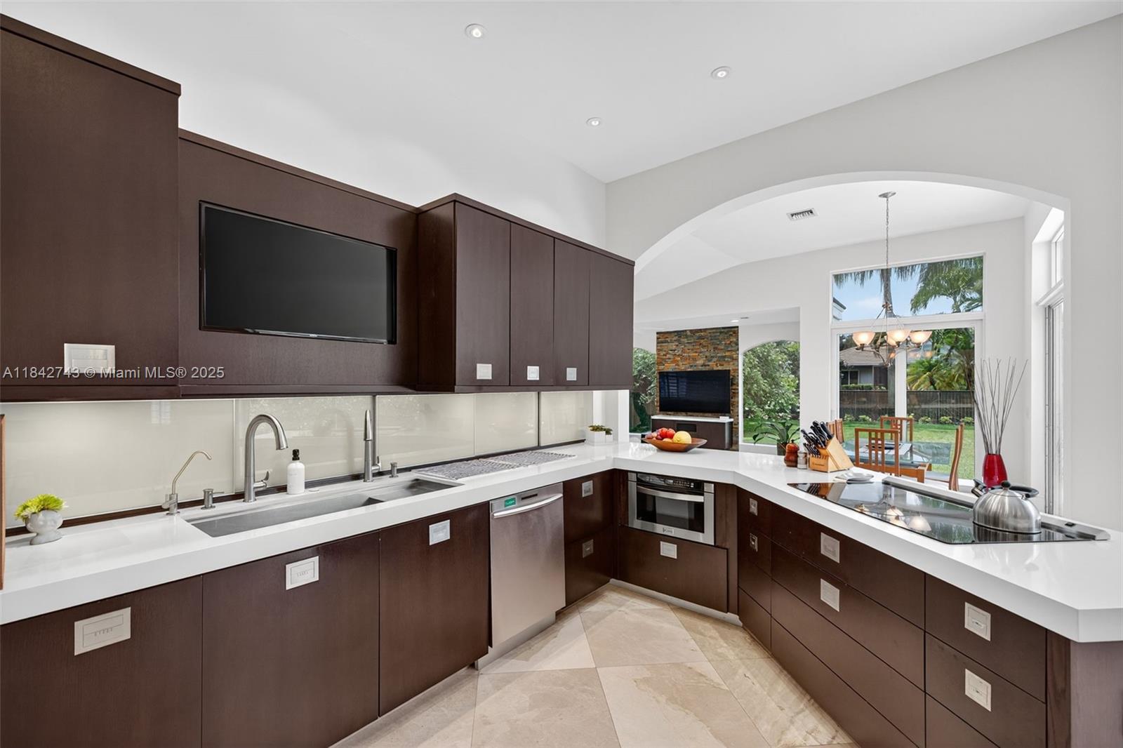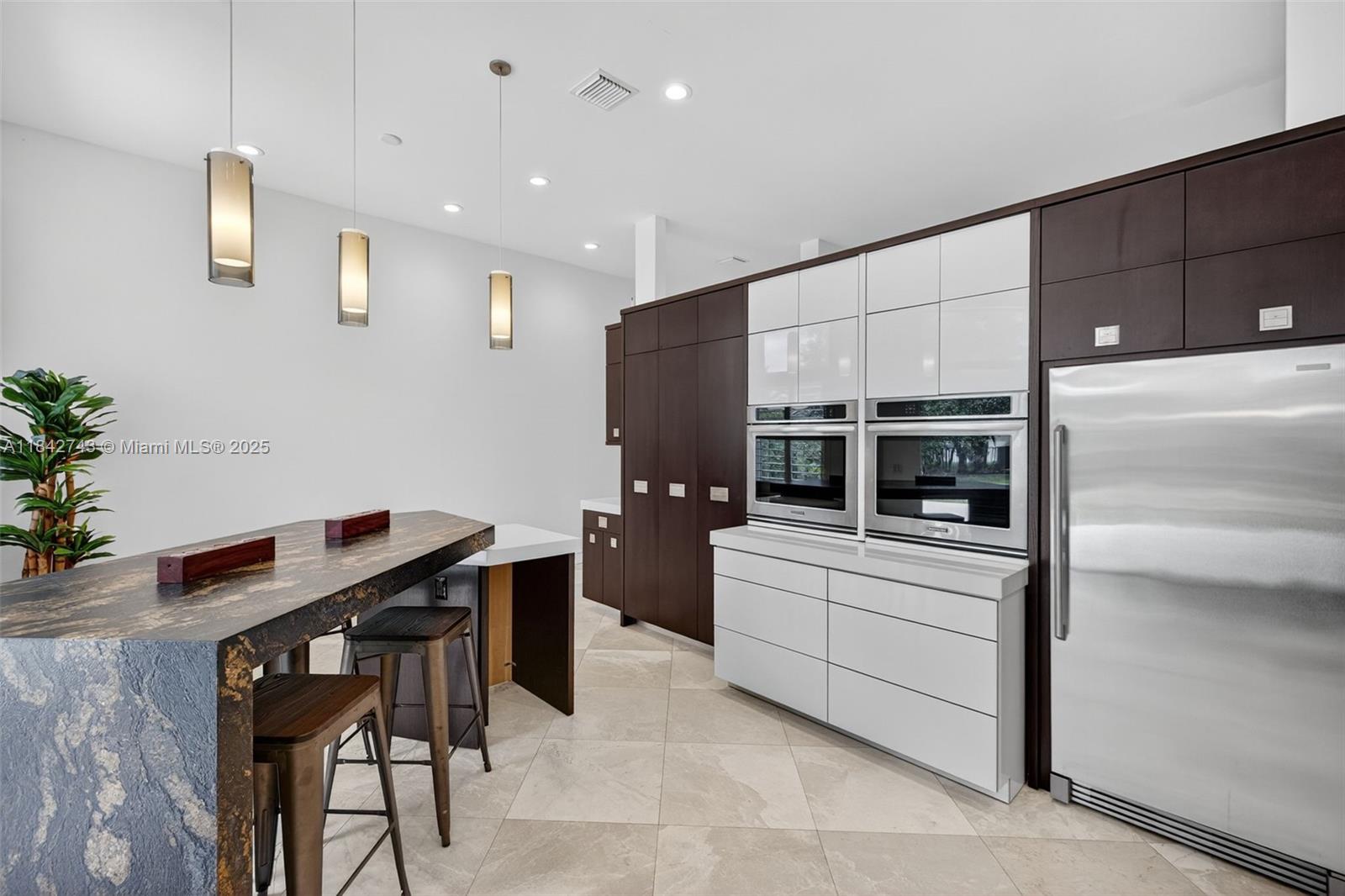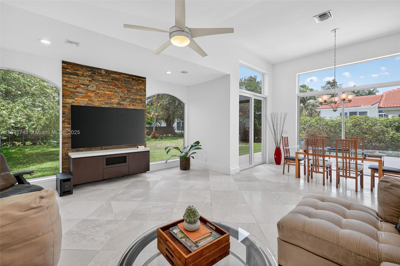 Located in a quiet, pet-friendly neighborhood with 24-hr manned gate and walkable access to the town center, this 4/3 features a Grand foyer, high ceilings and marble floors. Open kitchen with quartz counters, granite tabletop, prep sink, full-length appliance garage, retractable island, pull-out pantry, induction stove, double ovens, soft-close drawers, and built-in hutch. Master suite has flex room, sound-buffered walls, soaking tub, dual shower heads, floating furniture, and floor-to-ceiling closets. Guest suite is also sound-buffered. Living room features impact picture windows and floating TV unit. Wired for ceiling speakers. Accordion shutters, tinted windows, fenced yard, 3-car garage with workbench. Community has basketball, volleyball, and playground.