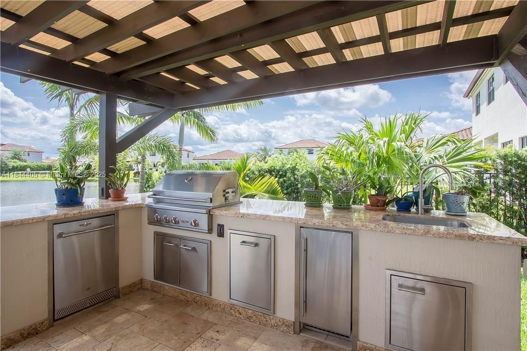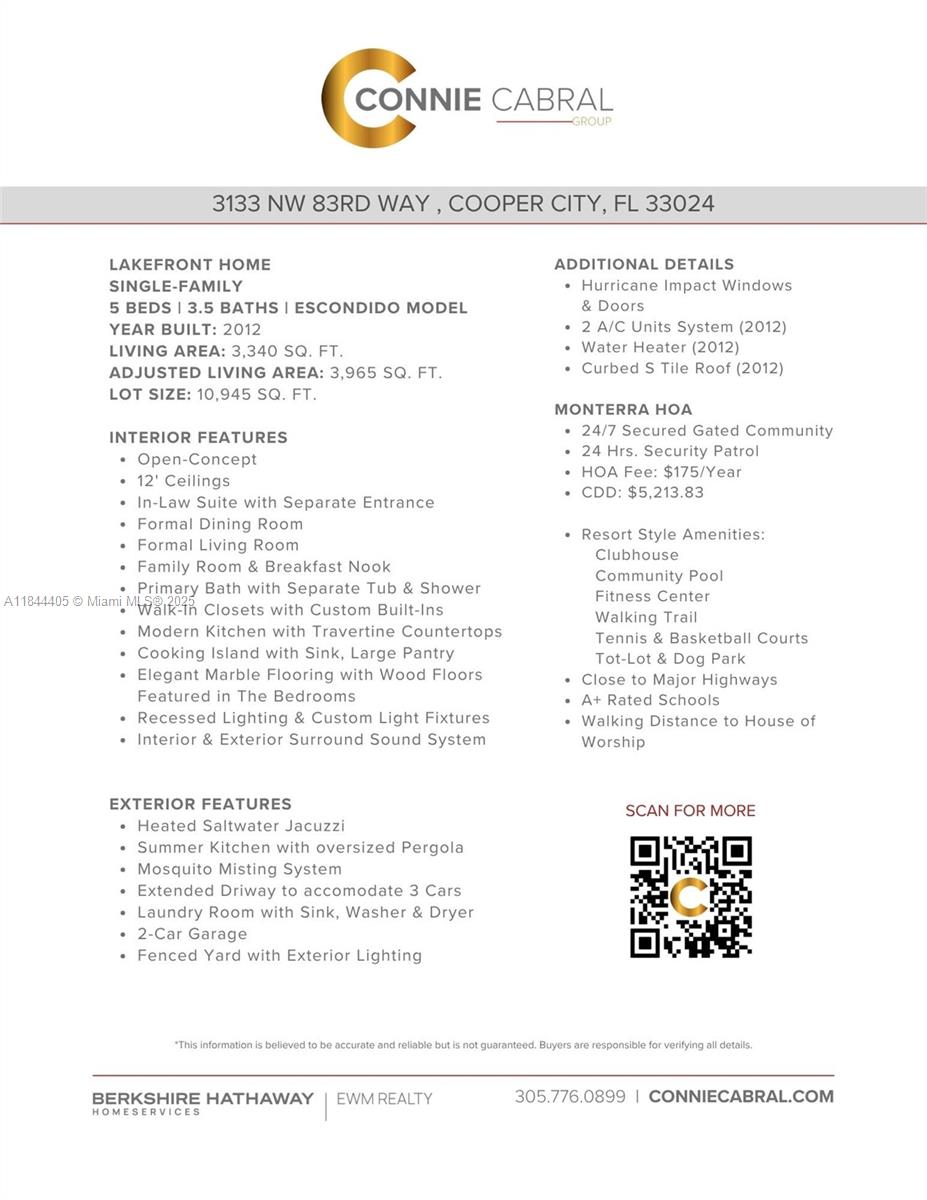 PRIME WATERFRONT LOT IN COOPER CITY’S MOST SOUGHT-AFTER GATED COMMUNITY! WELCOME TO THIS ONE-STORY ESCONDIDO MODEL, OFFERING A 5-BEDROOM, 3.5-BATHROOM FLOOR PLAN WITH IN LAW SUITE WITH SEPARATE ENTRACE. THE SPACIOUS PRIMARY SUITE OFFERS GENEROUS WALK-IN CUSTOM BUILT CLOSETS. THE OPEN-CONCEPT LAYOUT IS BEAUTIFULLY HIGHLIGHTED BY ELEGANT MARBLE FLOORING, WITH WOOD FLOORS FEATURED IN THE BEDROOMS. ADDITIONAL FEATURES INCLUDE 2 CAR GARAGE, HURRICANE IMPACT WINDOWS. ENJOY AN EXQUISITE FENCED IN BACKYARD FEATURING A SERENE WATER VIEW, JACUZZI, MOSQUITO MISTING SYSTEM, PERGOLA, AND A FULLY EQUIPPED OUTDOOR KITCHEN. RESORT-STYLE AMENITIES INCLUDE CLUBHOUSE, FITNESS CENTER, BASKETBALL & TENNIS COURTS, DOG PARK, AND WALKING TRAILS. A+ RATED SCHOOLS AND CONVENIENT ACCESS TO HOUSE OF WORSHIP.