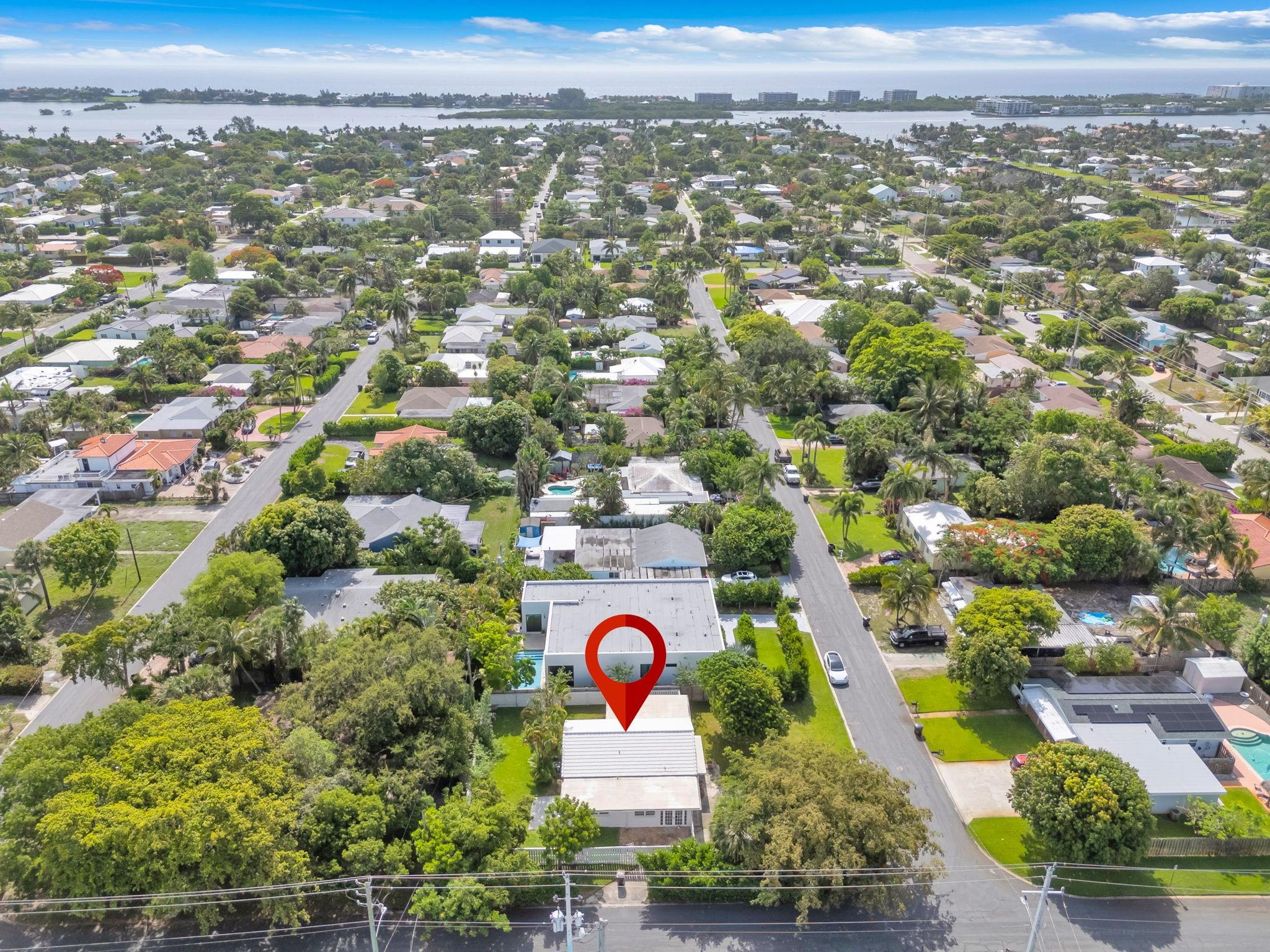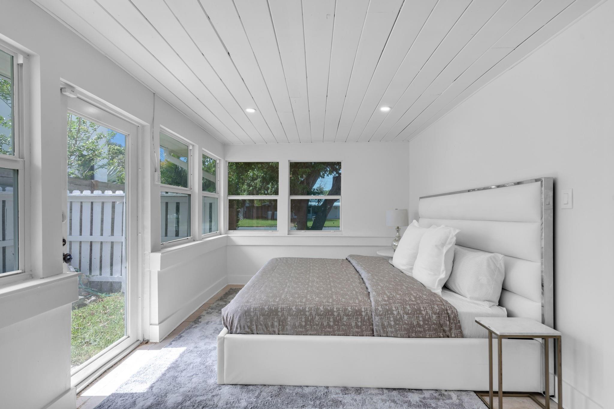 Updated home nestled just a few blocks from the Intracoastal in SoSo! This 4 bedroom, 2 bathroom home is in the heart of Southend very close to the new pickleball courts. The home is tiled throughout and updated with partial impact windows. Light and bright sunroom doubles as a flex space and can be whatever you imagine. One bedroom serves as a walk through nursery or office with another bedroom having an exterior door. The back yard is big enough for a pool with multi million dollar homes lining the street and neighborhood. This gem is turnkey enough to move in or a great sized lot to build your own multi-million dollar estate. Home has chic upgrades including a herringbone design Italian tile and travertine floors. The yard is fenced and includes olive and lychee trees.