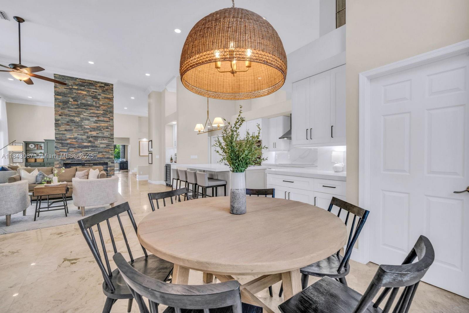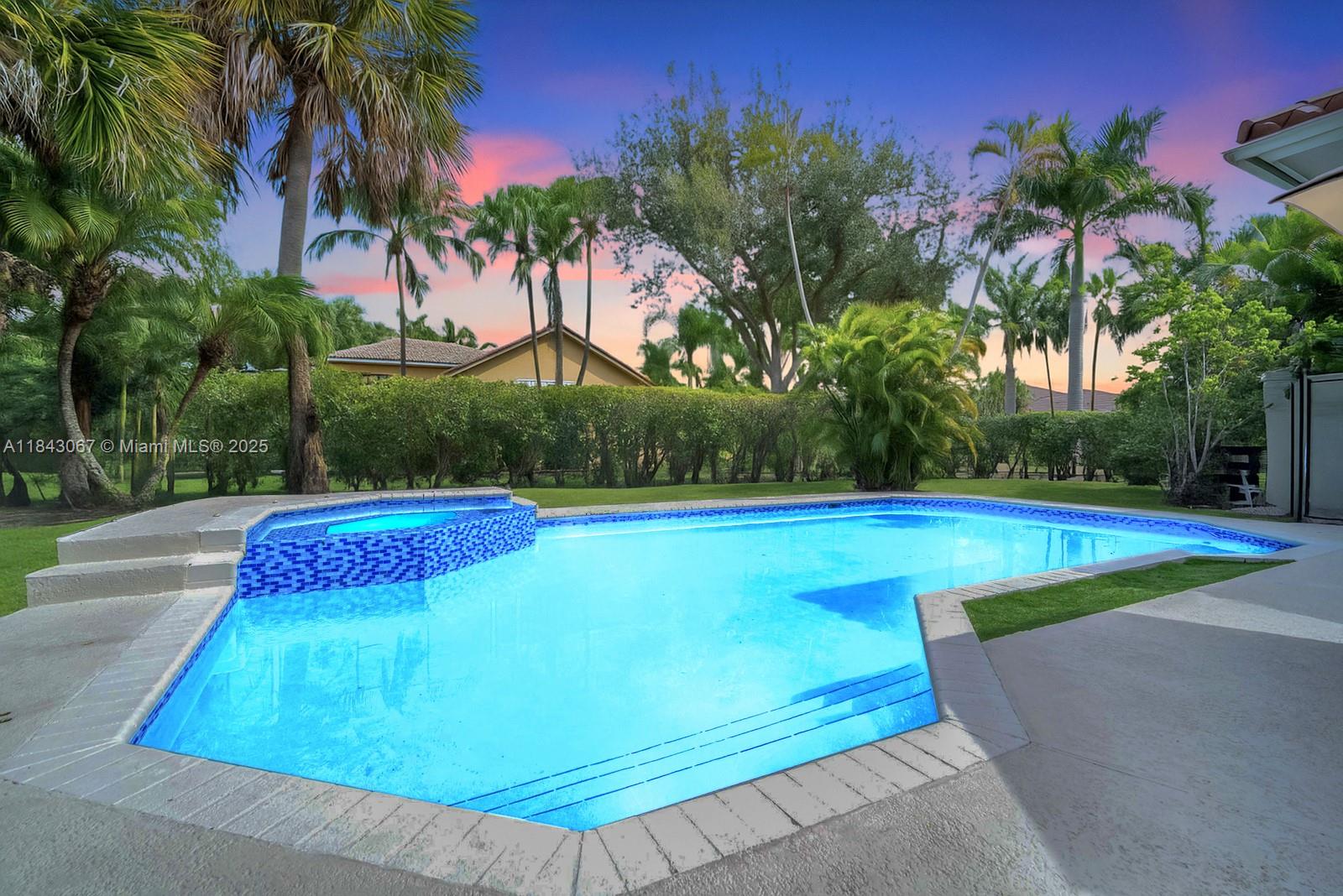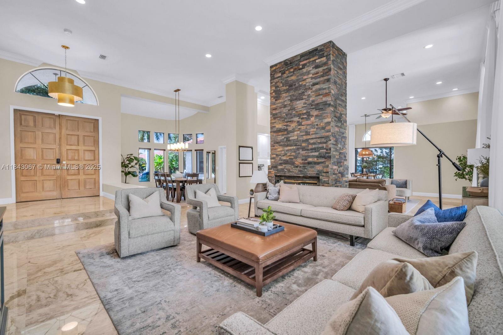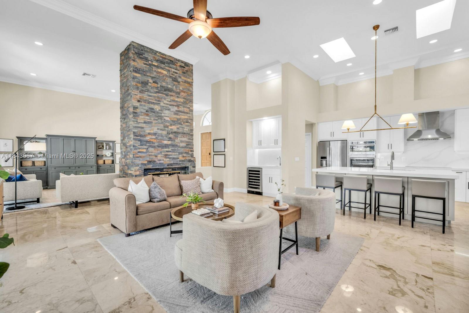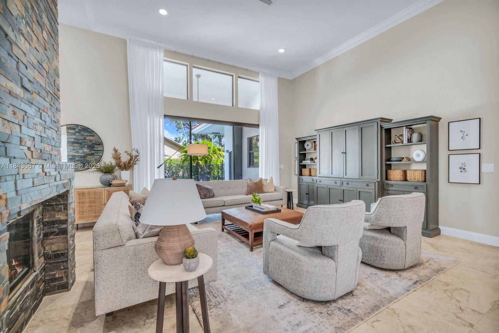 Exquisite 5 bed, 3.5 bath remodeled pool home on premium 15,818 sq ft corner lot in the prestigious gated community of Palm Island, Weston. Enjoy luxury & comfort in elegant, open floor plan w natural light cascading through large windows w custom curtains & electric binds & spectacular 2 sided stone fireplace at the heart of the home. Chef's kitchen features new stainless appliances, large island, custom cabinetry & wet bar w wine fridge. Split floor plan with spacious primary suite w luxurious spa-like en-suite bath & designer closet. Freshly painted inside & out, crown molding, new electrical panels, lighting, new AC units, dreamy laundry room & gorgeous flooring throughout. Outdoor private patio oasis w sparkling, refinished refreshing pool & heated spa w a picturesque backdrop.