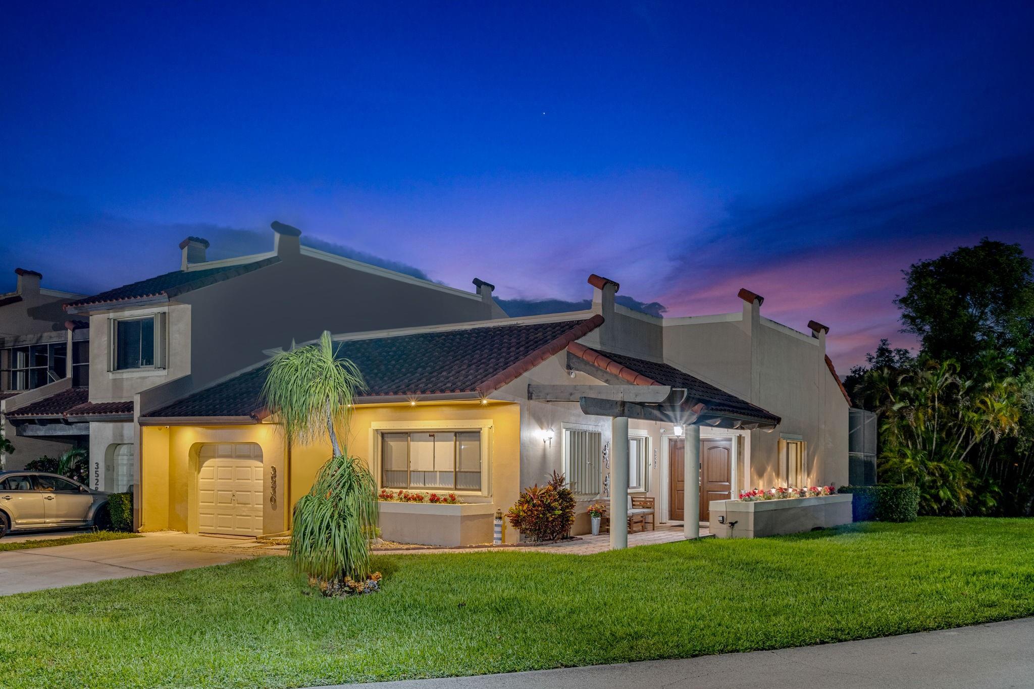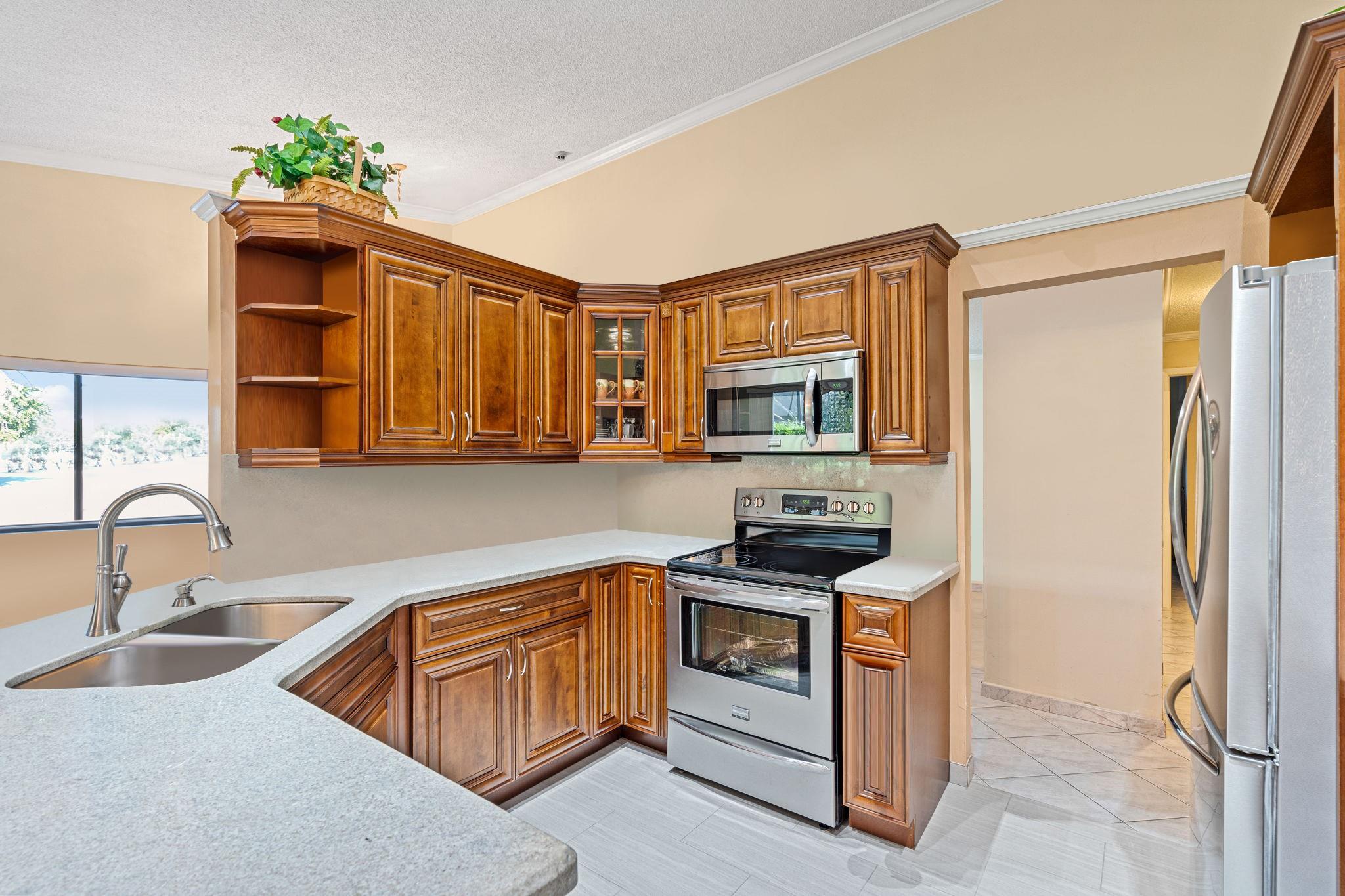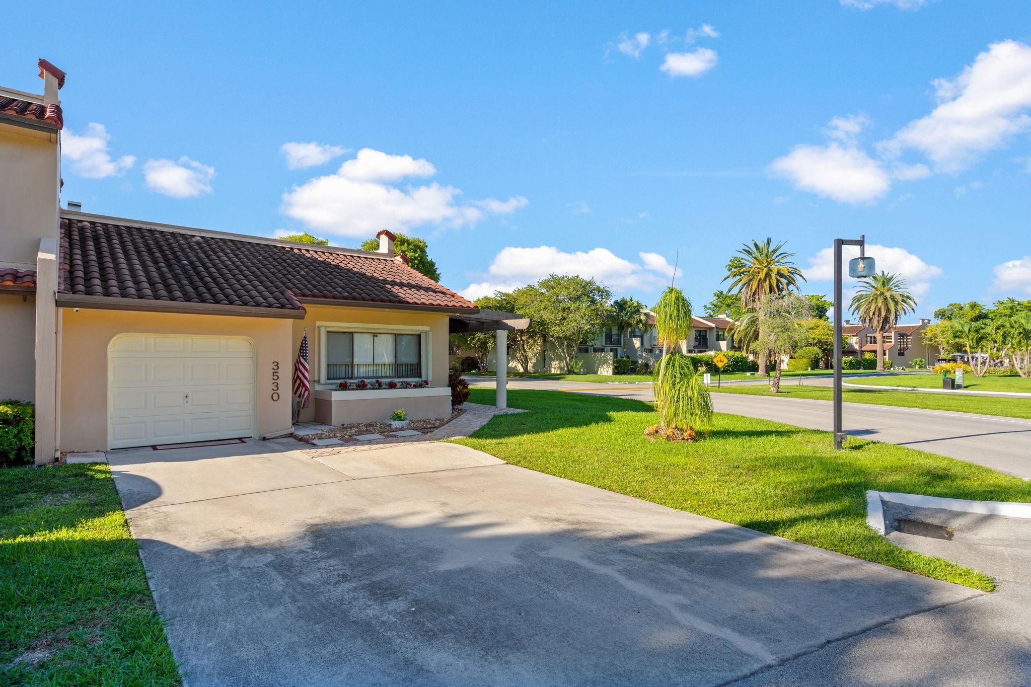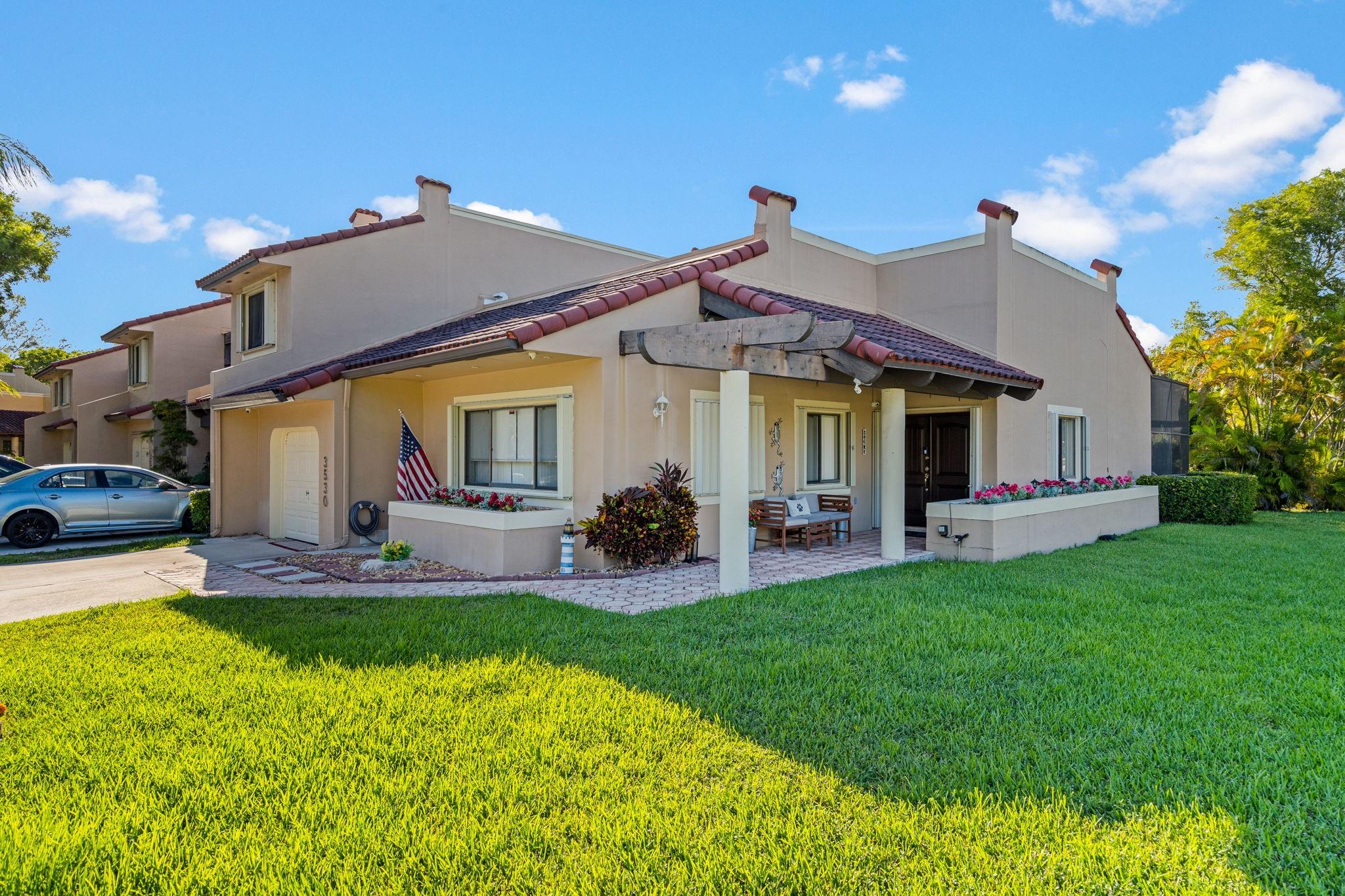 ONE STORY! CORNER! Golf & Water-views! Beautifully maintained 3-bed, 2 Bath LED exterior lighting! No Expense spared! Vaulted ceilings, Updated kitchen, Bath remodel, tiled floors, CCTV Cameras. Breathtaking views every room, large green space in backyard. Spacious living & dining filled w/natural light. Floored & lighted attic w/easy step-up ladder for extra storage, custom garage cabinets & custom garage floor finish. Storm ready, full accordion shutters, Impact Door, Impact Garage Door. AC 2024. Steps to clubhouse, 18-hole golf, restaurant on lake, tennis, basketball, pool, & jogging path. On-site management, 24-hour sec. guard entry. HOA INCLUDES Exterior & Roof Ins. Water, HD Cable, Internet, Driveway, Exterior paint, Trash, Landscaping, & common areas. Some pics photoshopped