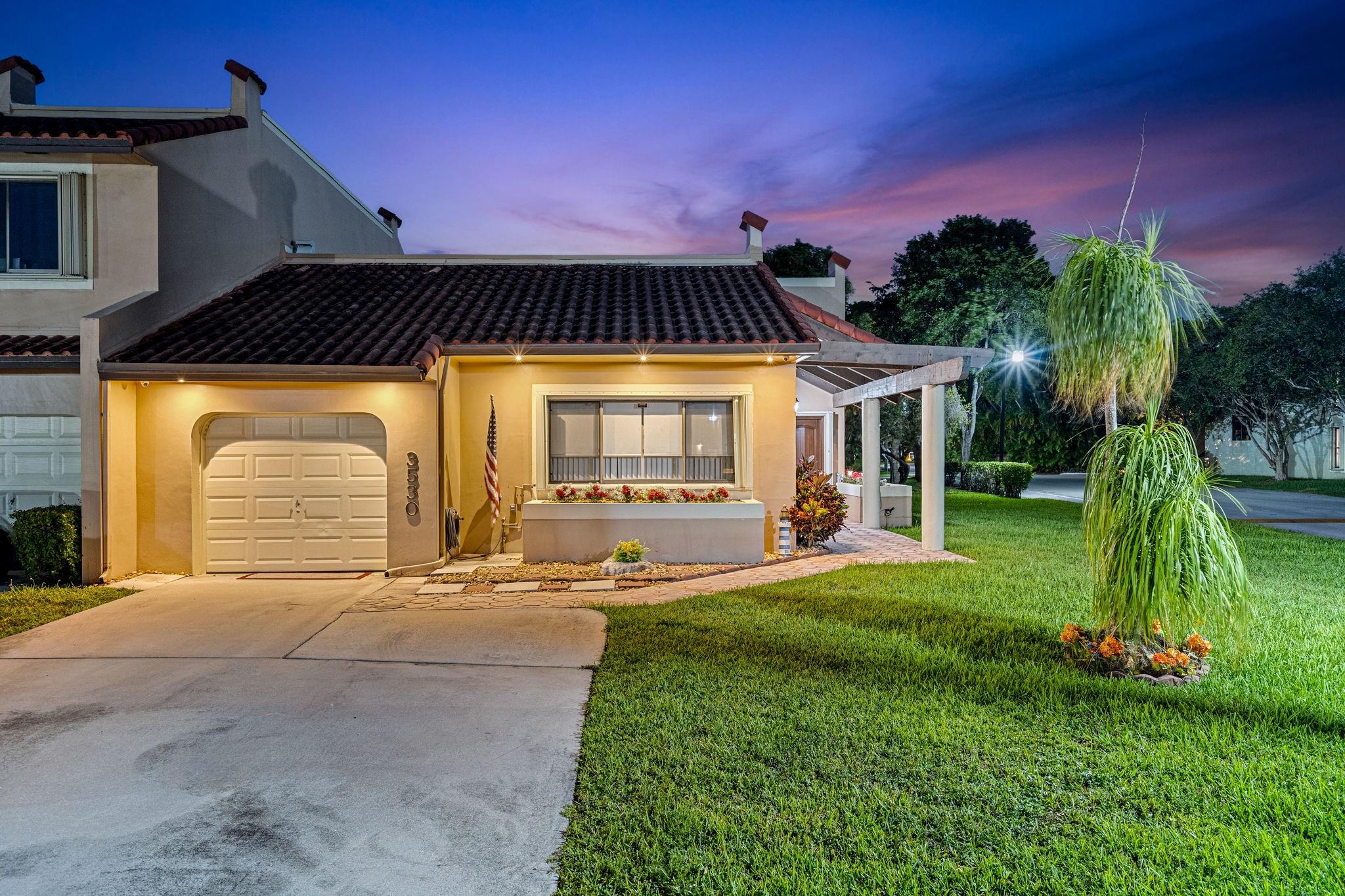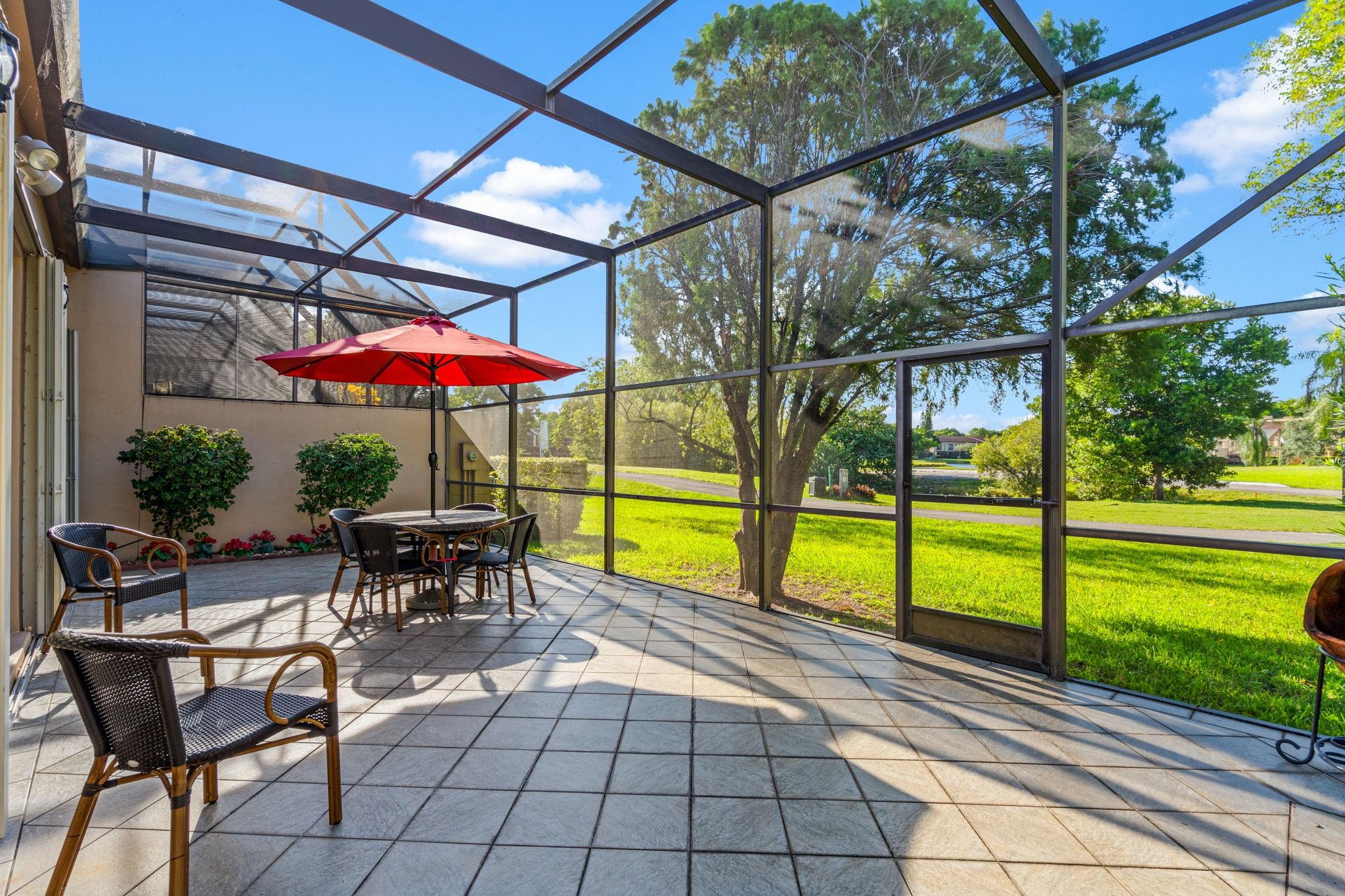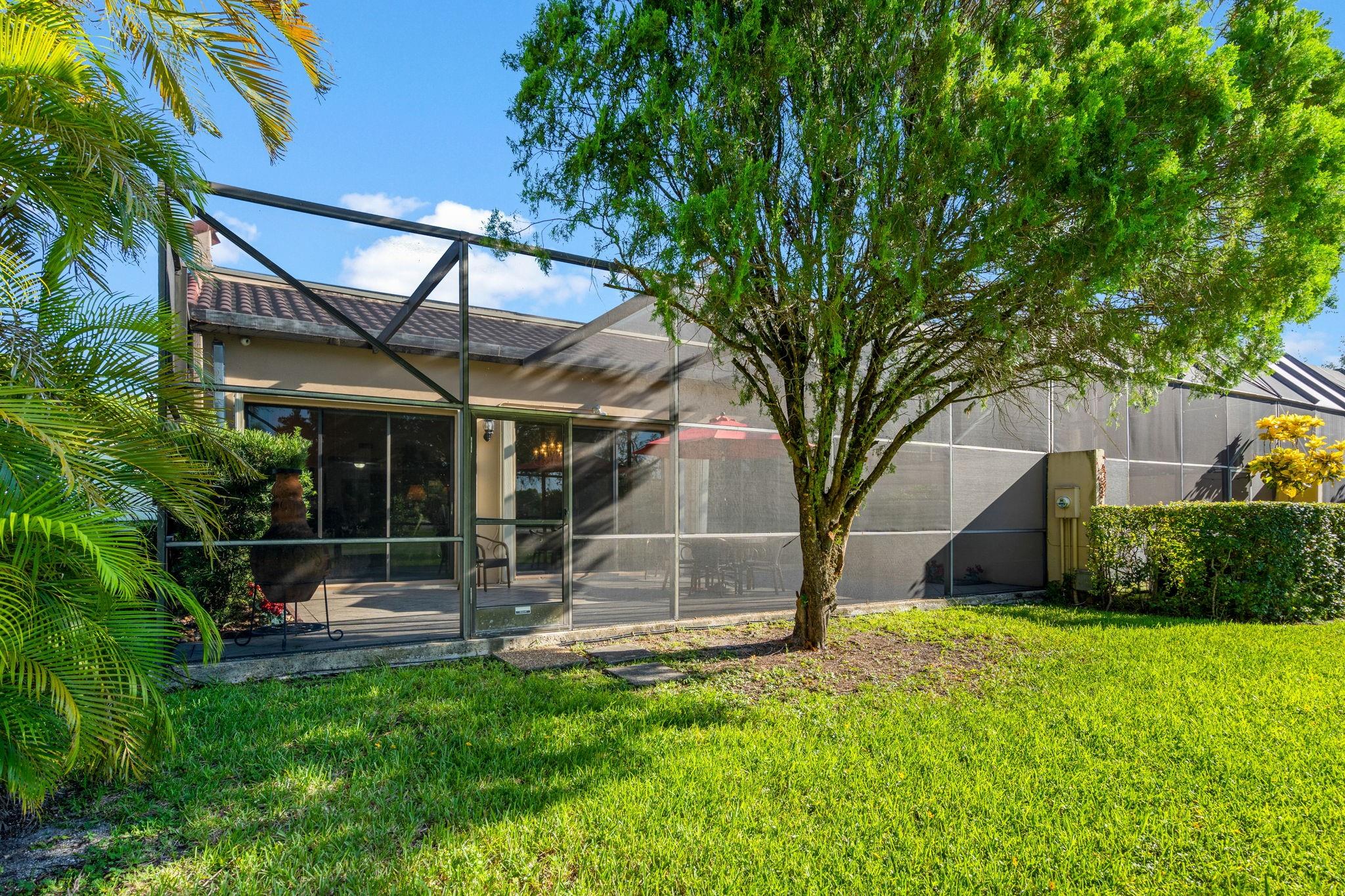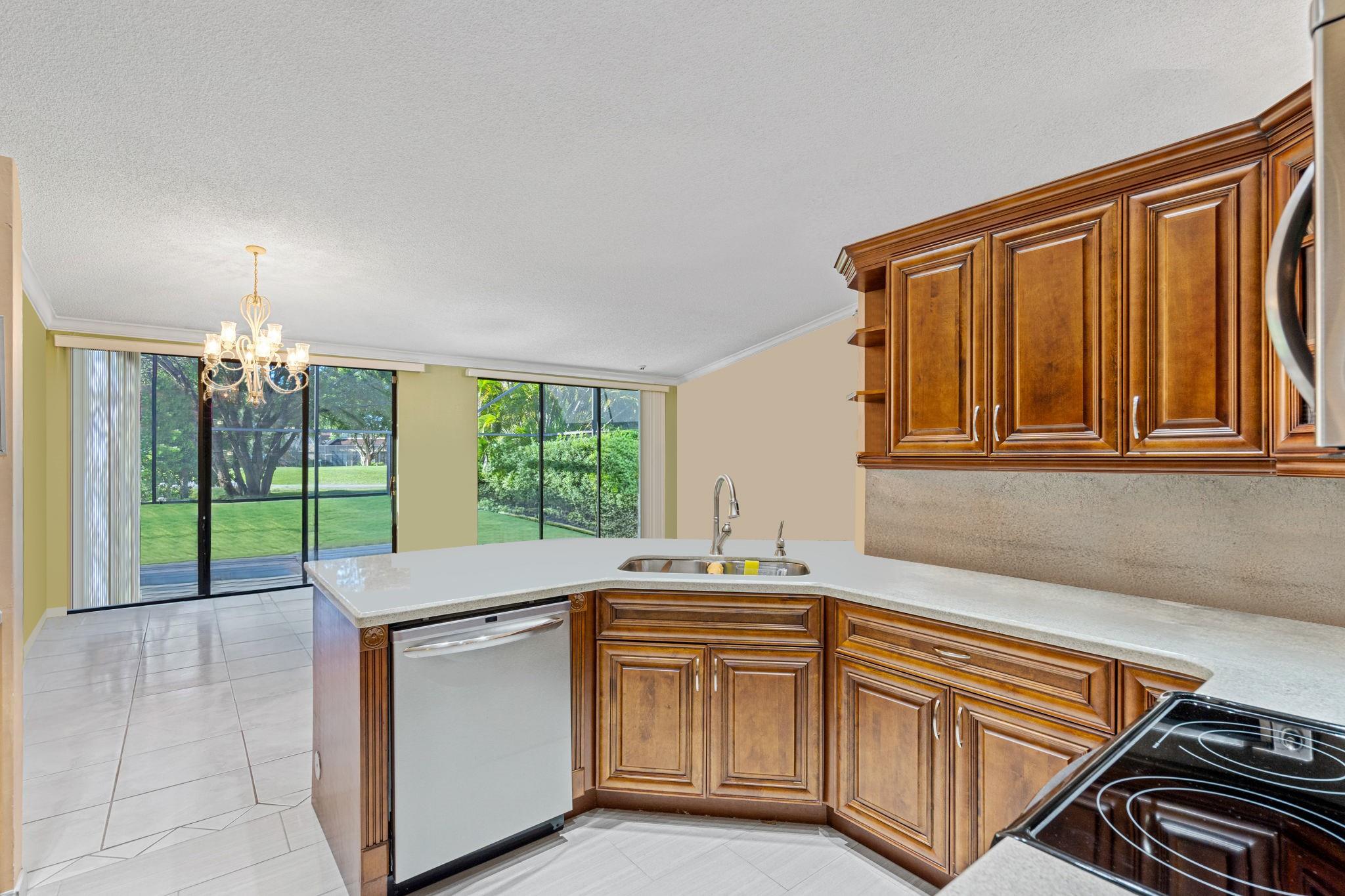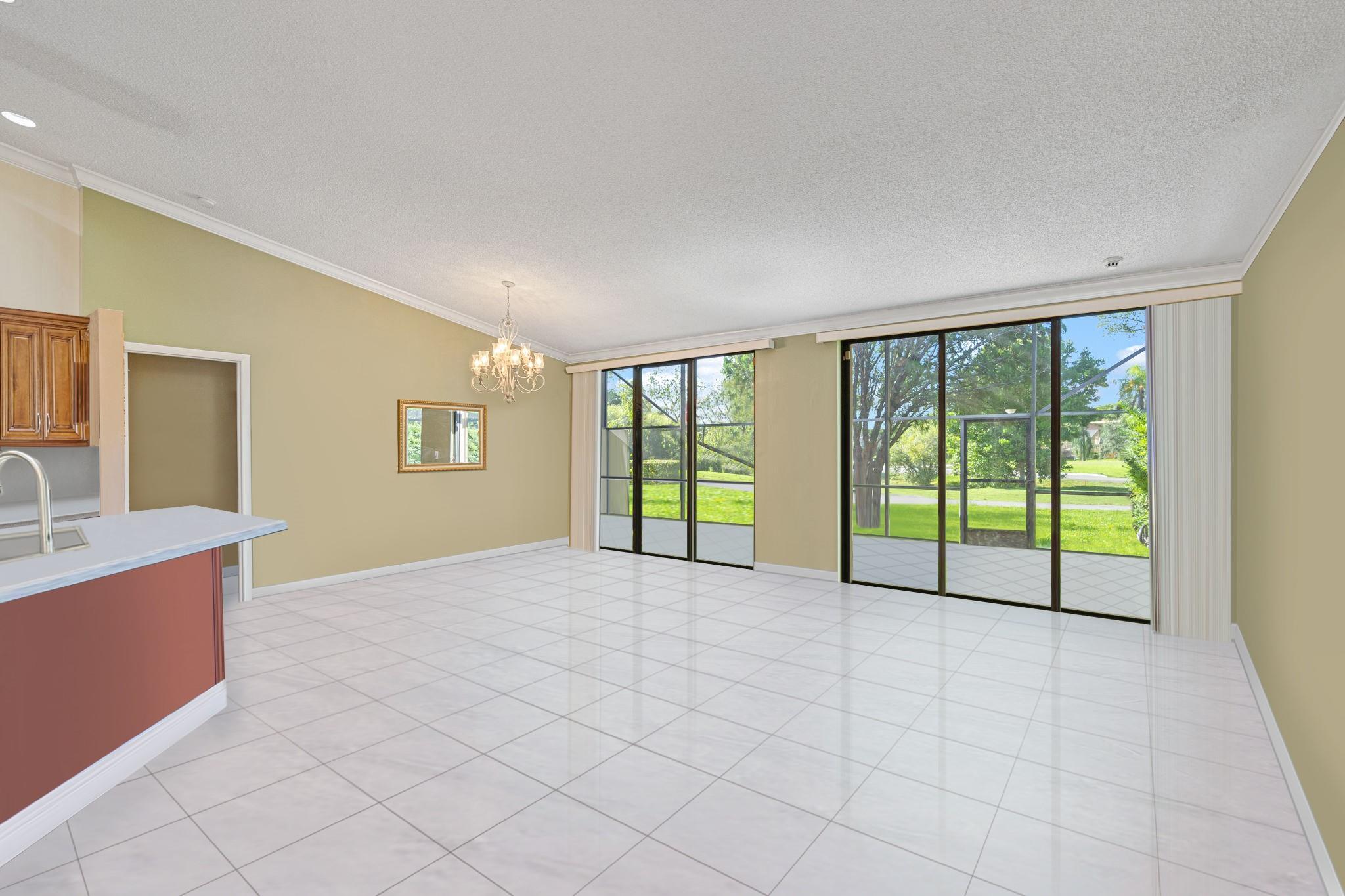ONE STORY! CORNER! Golf & Water-views! Beautifully maintained 3-bed, 2 Bath LED exterior lighting! No Expense spared! Vaulted ceilings, Updated kitchen, Bath remodel, tiled floors, CCTV Cameras. Breathtaking views every room, large green space in backyard. Spacious living & dining filled w/natural light. Floored & lighted attic w/easy step-up ladder for extra storage, custom garage cabinets & custom garage floor finish. Storm ready, full accordion shutters, Impact Door, Impact Garage Door. AC 2024. Steps to clubhouse, 18-hole golf, restaurant on lake, tennis, basketball, pool, & jogging path. On-site management, 24-hour sec. guard entry. HOA INCLUDES Exterior & Roof Ins. Water, HD Cable, Internet, Driveway, Exterior paint, Trash, Landscaping, & common areas. Some pics photoshopped