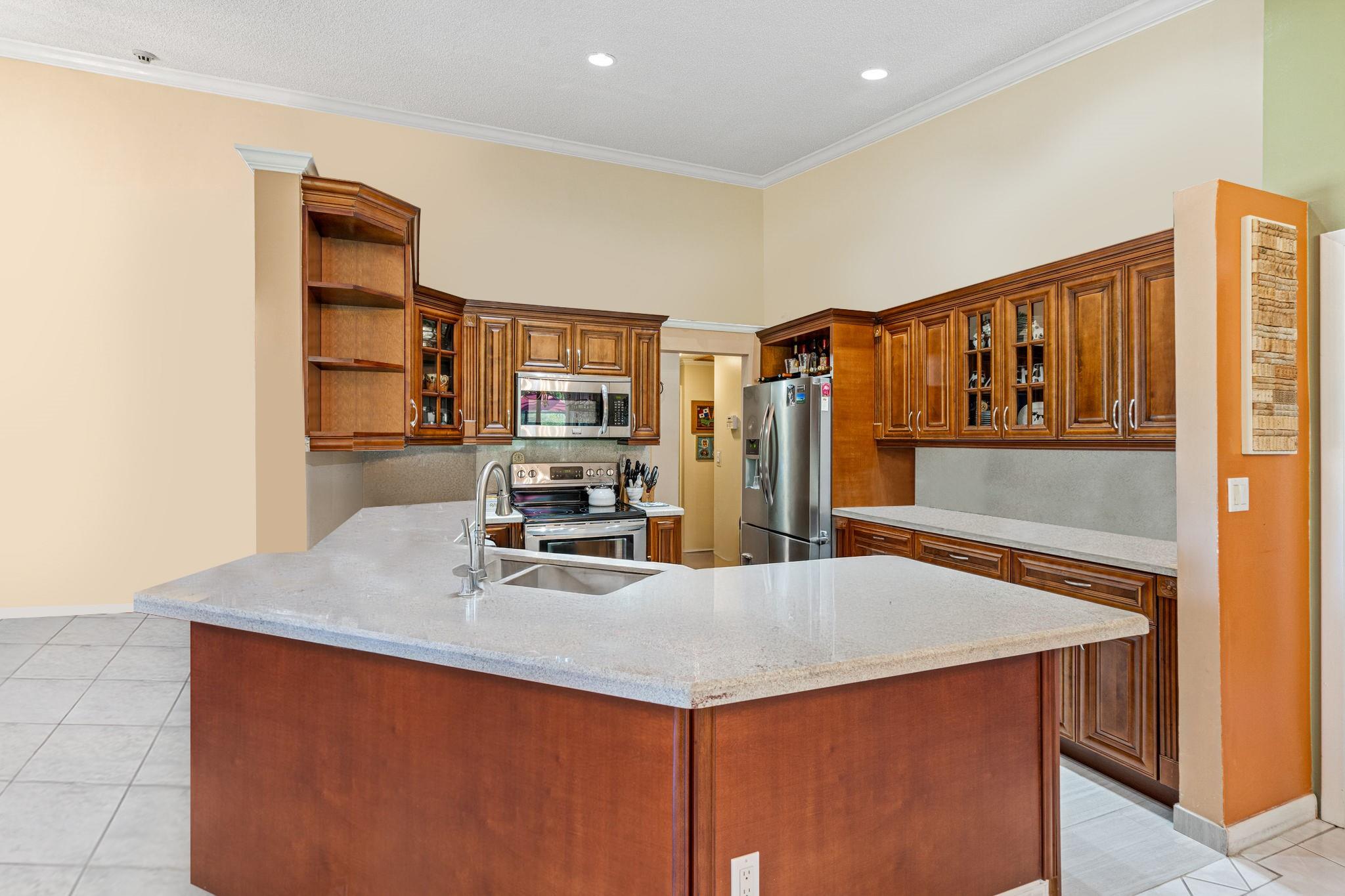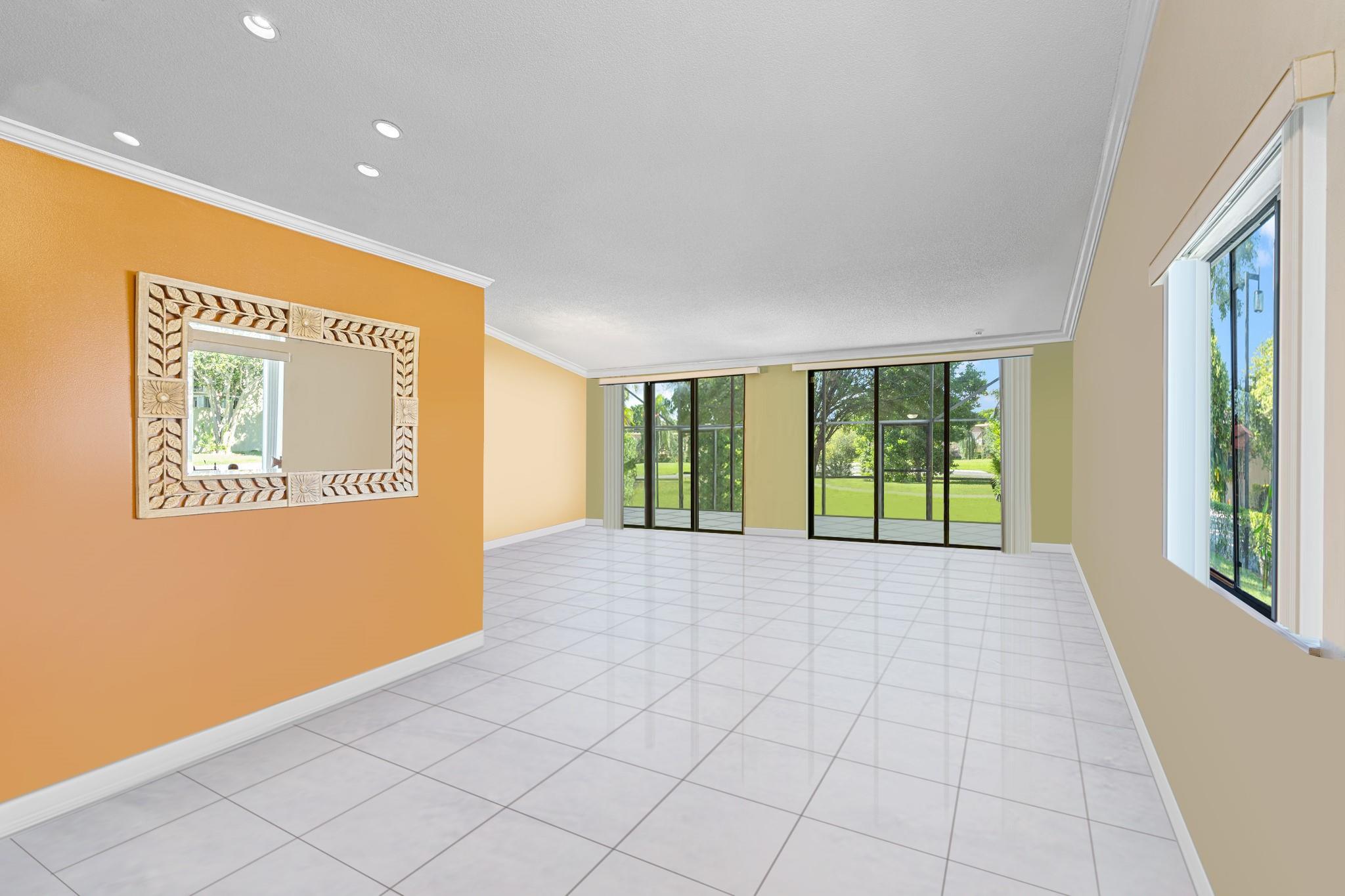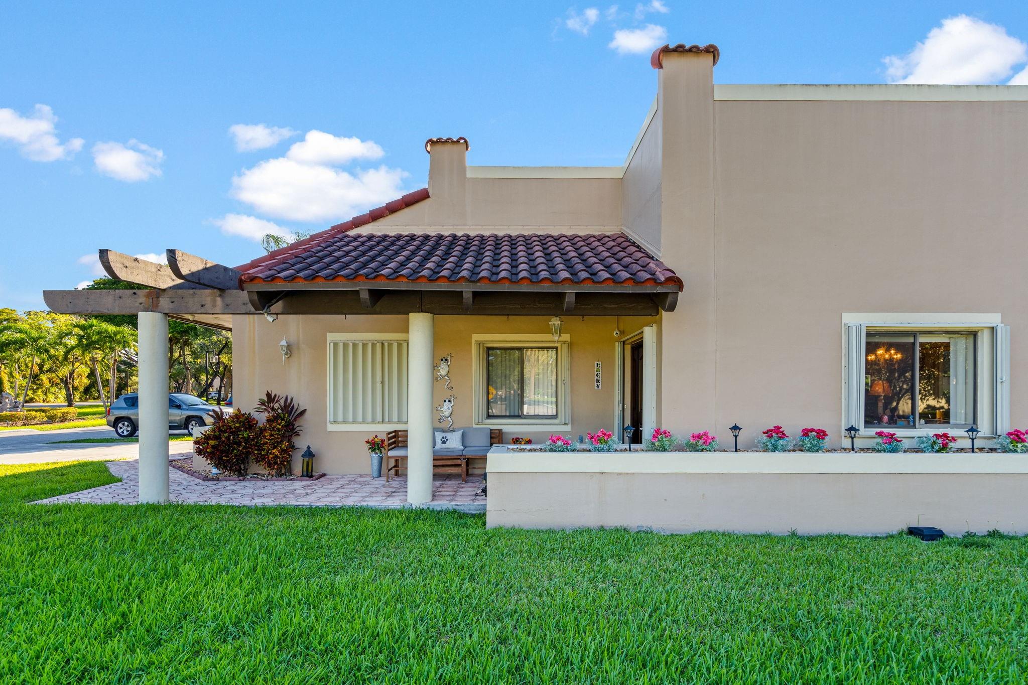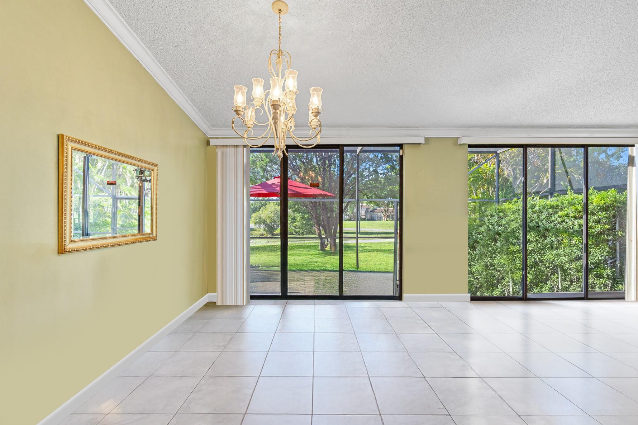 ONE STORY! CORNER! Golf & Water-views! Beautifully maintained 3-bed, 2 Bath LED exterior lighting! No Expense spared! Vaulted ceilings, Updated kitchen, Bath remodel, tiled floors, CCTV Cameras. Breathtaking views every room, large green space in backyard. Spacious living & dining filled w/natural light. Floored & lighted attic w/easy step-up ladder for extra storage, custom garage cabinets & custom garage floor finish. Storm ready, full accordion shutters, Impact Door, Impact Garage Door. AC 2024. Steps to clubhouse, 18-hole golf, restaurant on lake, tennis, basketball, pool, & jogging path. On-site management, 24-hour sec. guard entry. HOA INCLUDES Exterior & Roof Ins. Water, HD Cable, Internet, Driveway, Exterior paint, Trash, Landscaping, & common areas. Some pics photoshopped