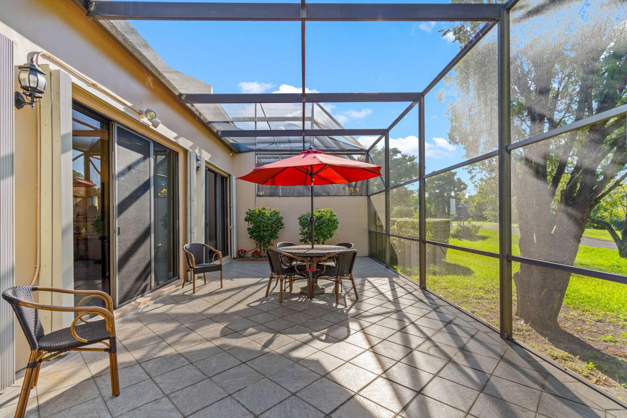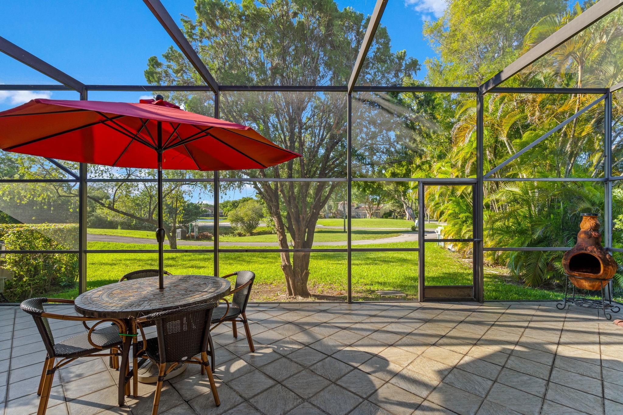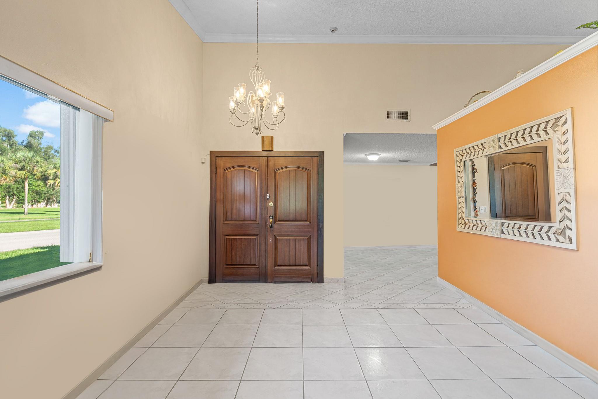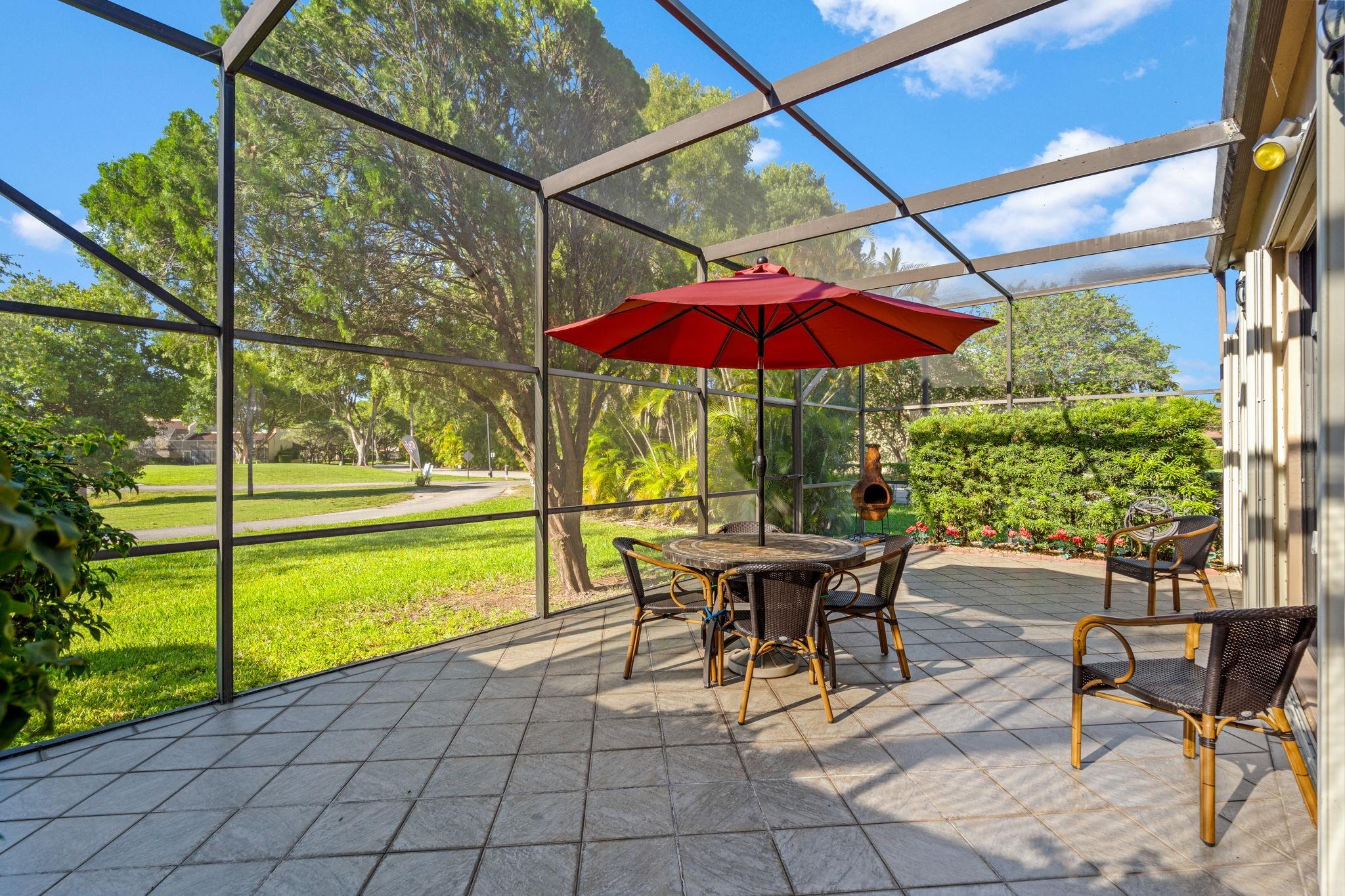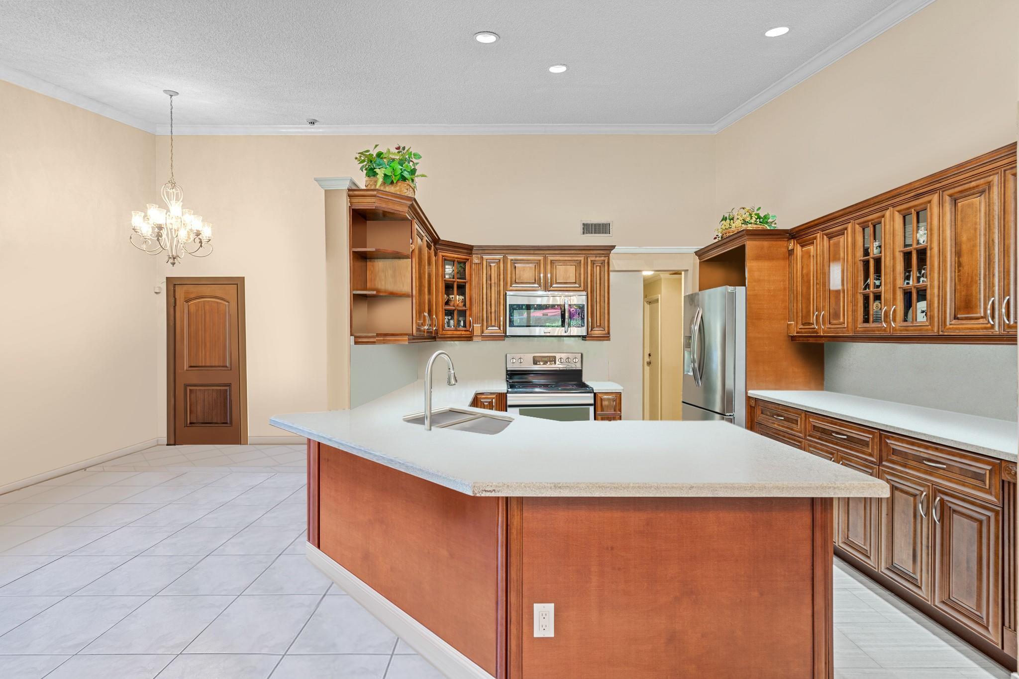 ONE STORY! CORNER! Golf & Water-views! Beautifully maintained 3-bed, 2 Bath LED exterior lighting! No Expense spared! Vaulted ceilings, Updated kitchen, Bath remodel, tiled floors, CCTV Cameras. Breathtaking views every room, large green space in backyard. Spacious living & dining filled w/natural light. Floored & lighted attic w/easy step-up ladder for extra storage, custom garage cabinets & custom garage floor finish. Storm ready, full accordion shutters, Impact Door, Impact Garage Door. AC 2024. Steps to clubhouse, 18-hole golf, restaurant on lake, tennis, basketball, pool, & jogging path. On-site management, 24-hour sec. guard entry. HOA INCLUDES Exterior & Roof Ins. Water, HD Cable, Internet, Driveway, Exterior paint, Trash, Landscaping, & common areas. Some pics photoshopped