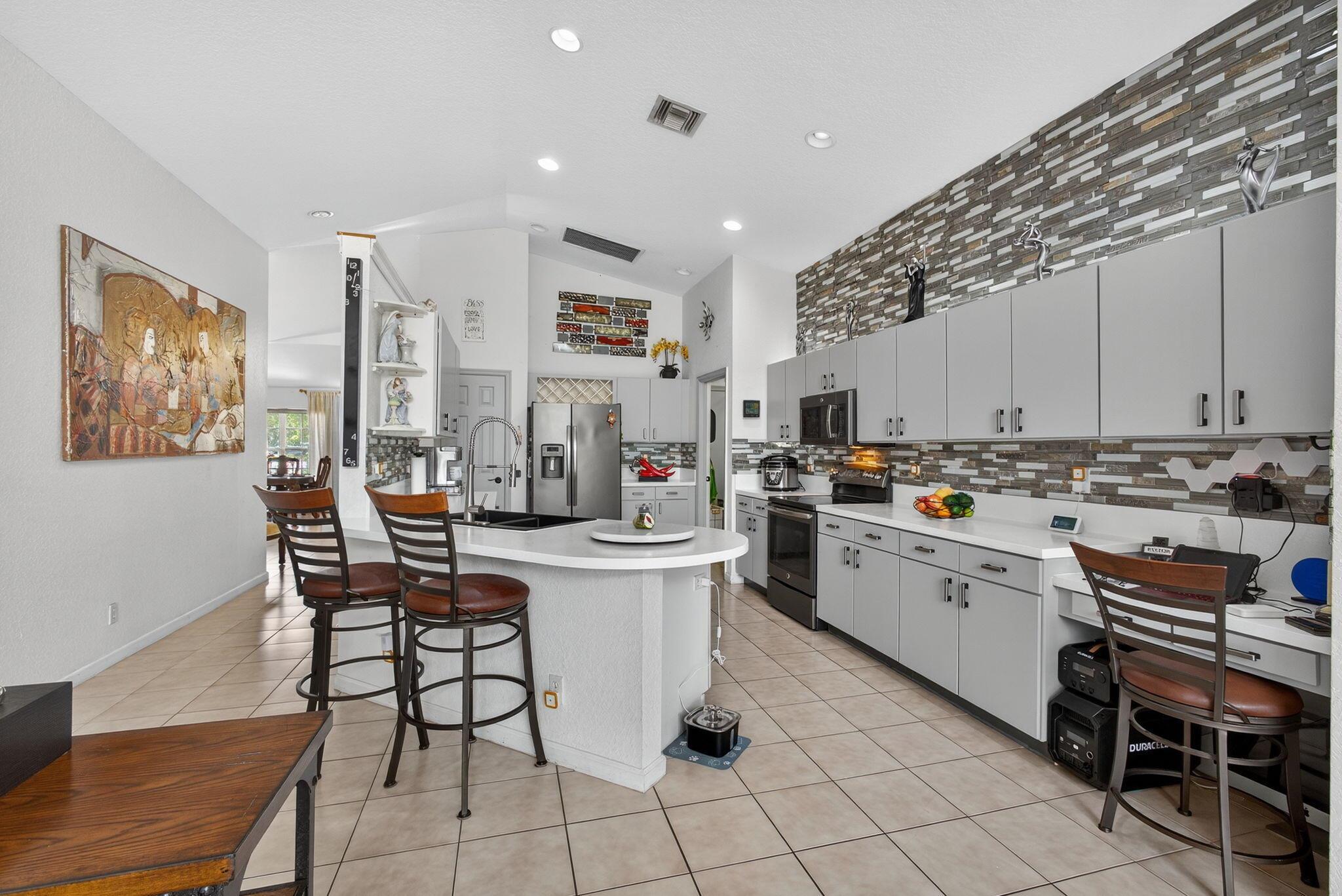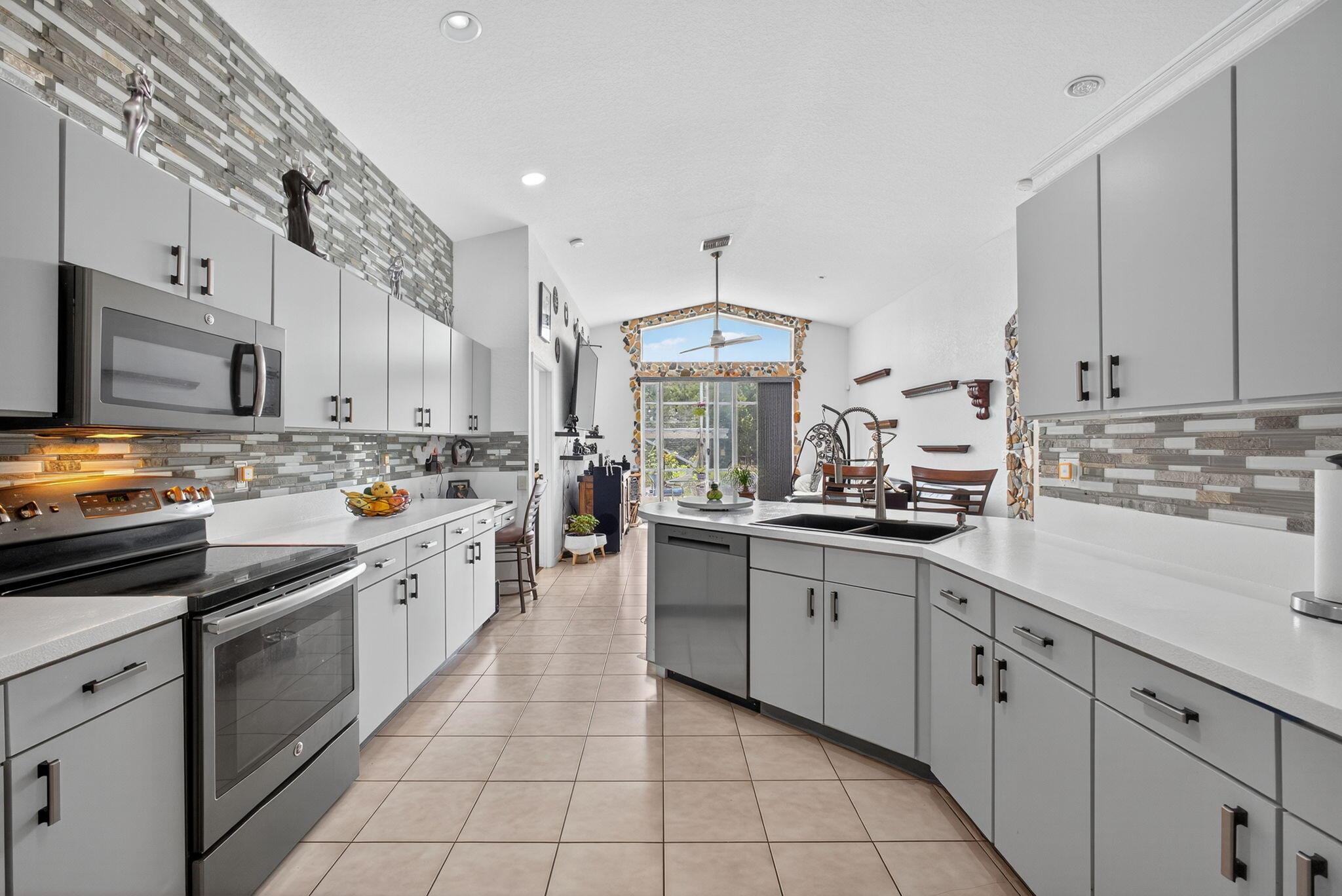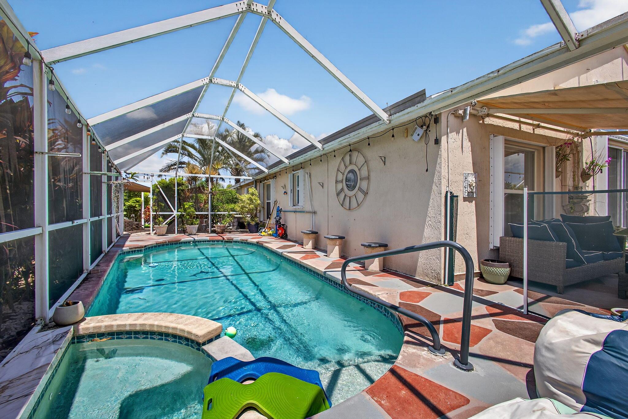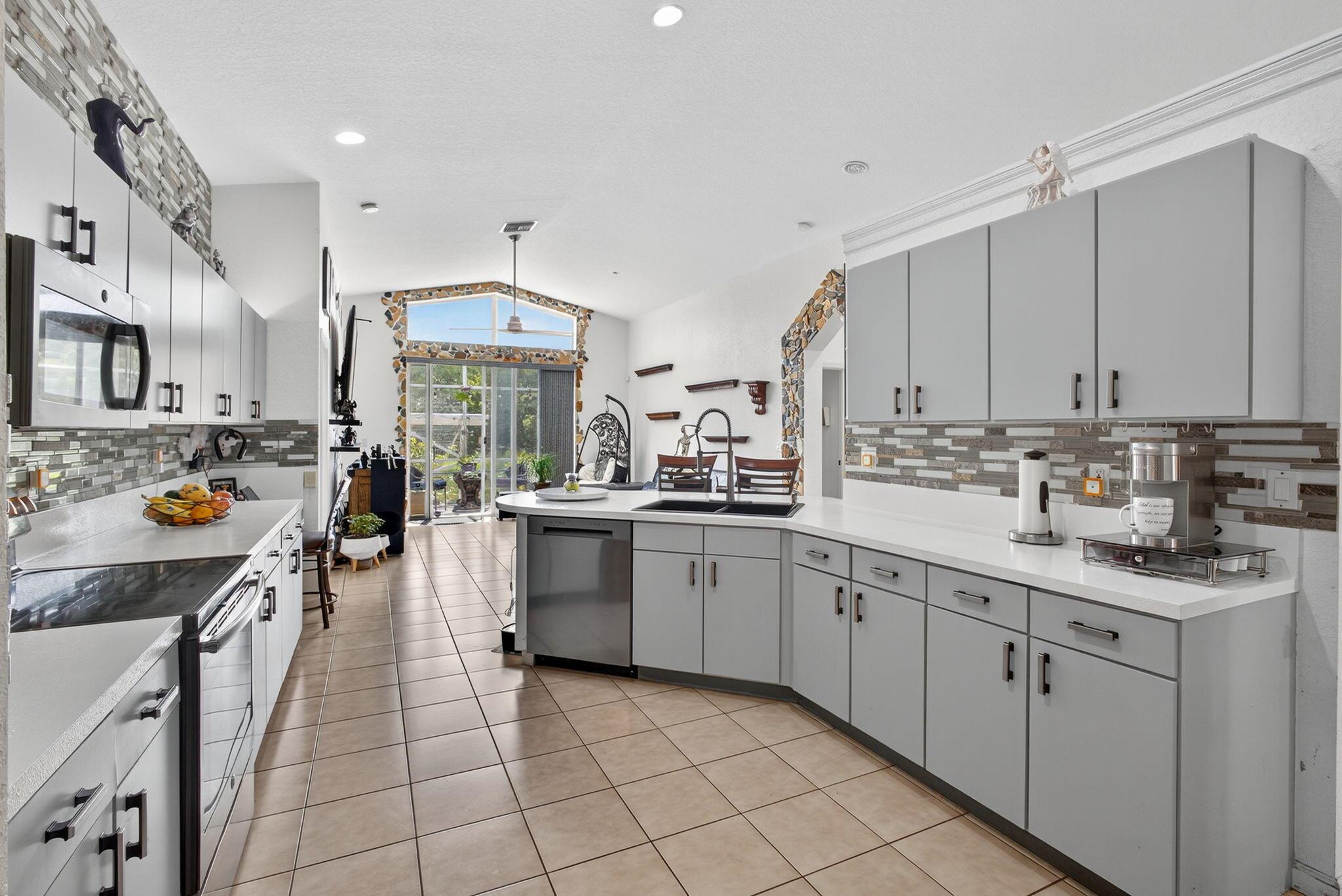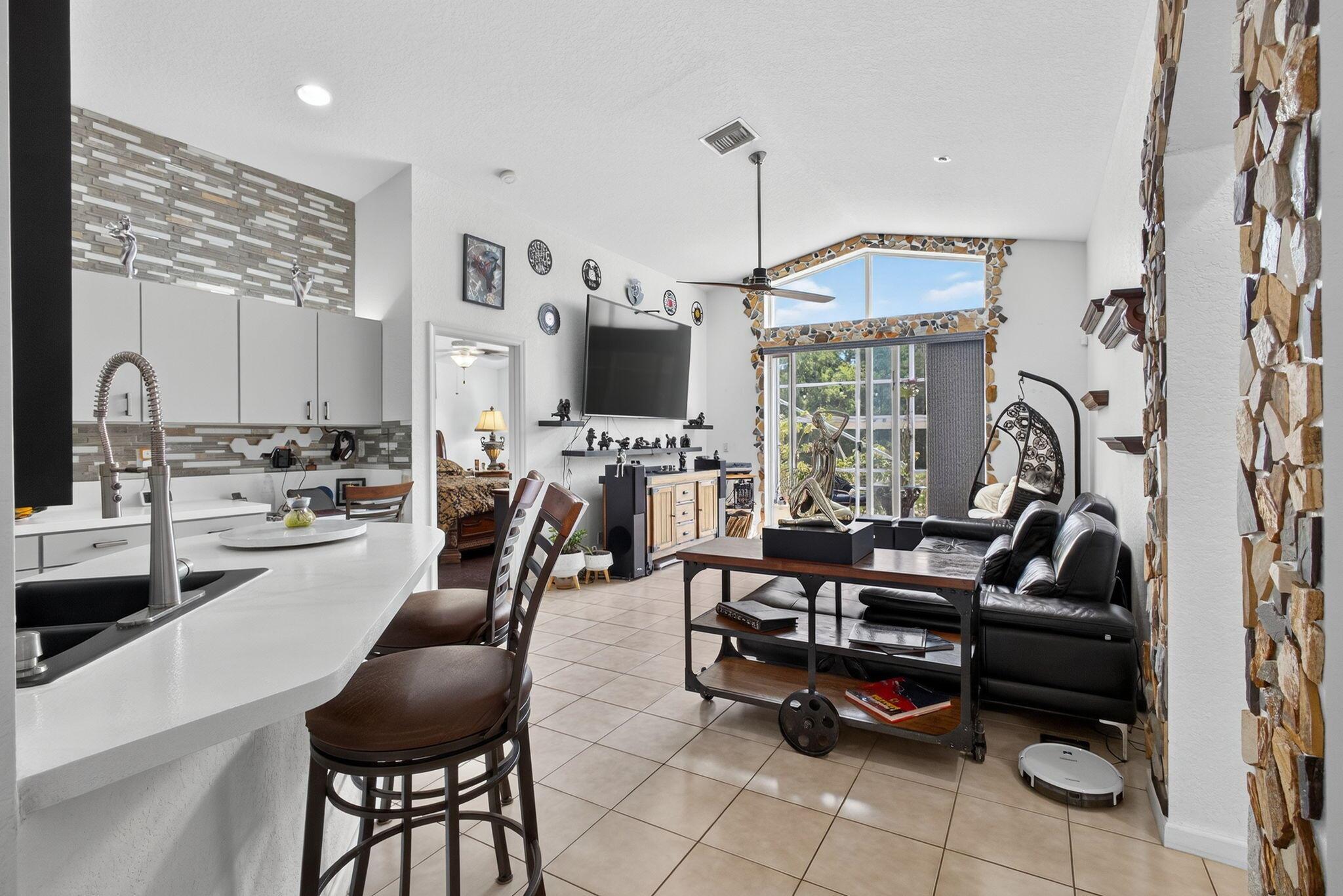 BRAND NEW ROOF 2024!! Stunning lakefront home with 3 bedrooms, 2 baths, a 2-car garage, screened-in pool and spa, and low HOA fee. This move-in-ready property features tile floors throughout the main living areas, custom built closet, vaulted ceilings and recessed lighting. The kitchen and living areas are enhanced with incredible stone accents and decorative backsplashes. The luxurious primary suite boasts a fully renovated bath with floor-to-ceiling porcelain tile, an oversized soaking tub, and elegant finishes. Enjoy your very own tropical oasis through the fenced-in pool and spa surrounded by a serene lake view and mature fruit trees. The heated pool includes a newer pool pump (2023). Full hurricane protection throughout of shutters and hurricane glass