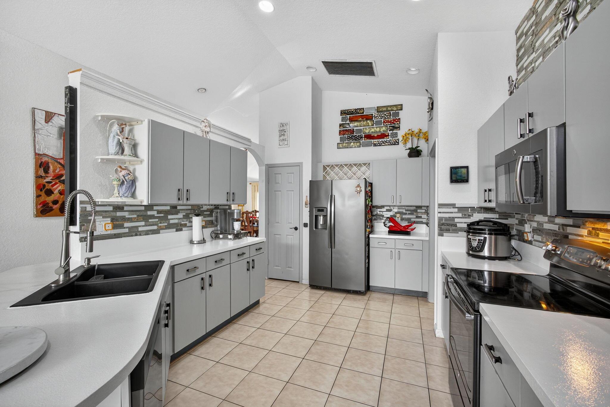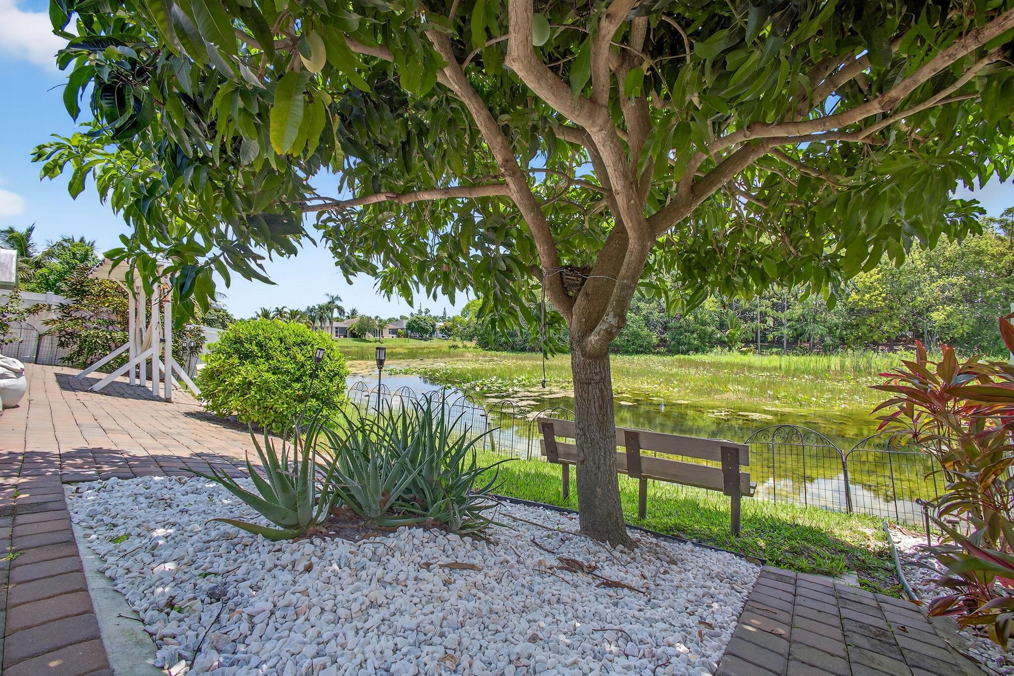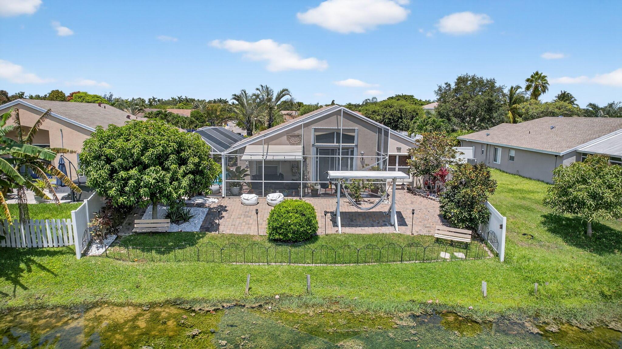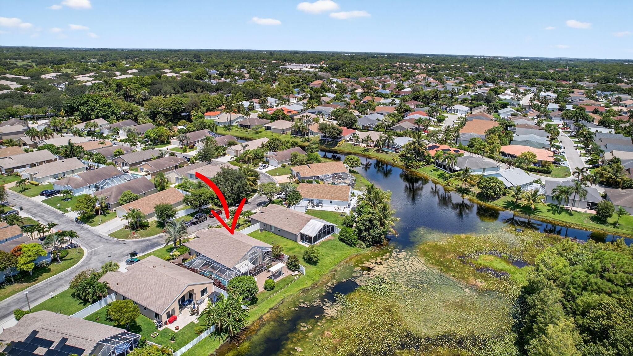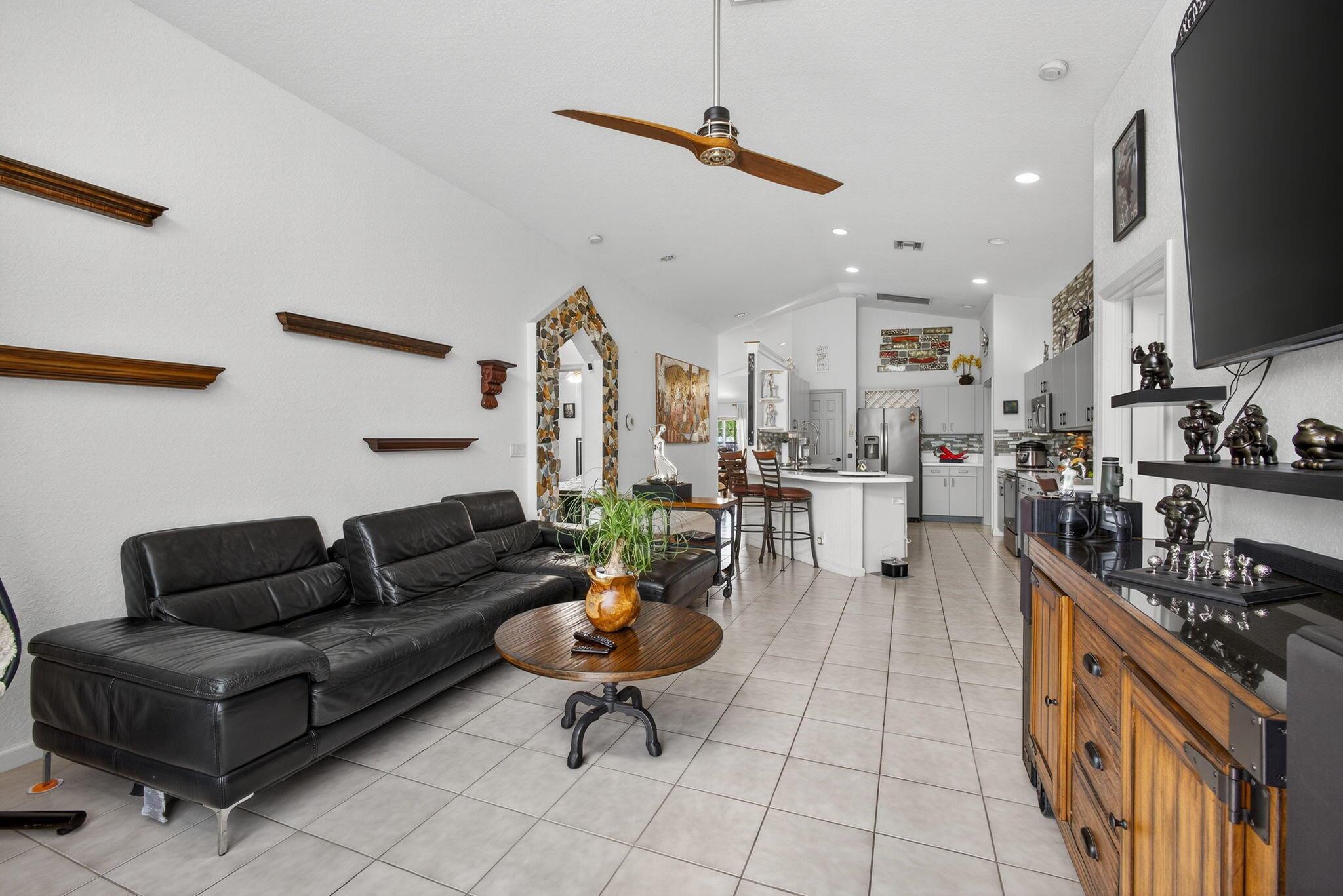 BRAND NEW ROOF 2024!! Stunning lakefront home with 3 bedrooms, 2 baths, a 2-car garage, screened-in pool and spa, and low HOA fee. This move-in-ready property features tile floors throughout the main living areas, custom built closet, vaulted ceilings and recessed lighting. The kitchen and living areas are enhanced with incredible stone accents and decorative backsplashes. The luxurious primary suite boasts a fully renovated bath with floor-to-ceiling porcelain tile, an oversized soaking tub, and elegant finishes. Enjoy your very own tropical oasis through the fenced-in pool and spa surrounded by a serene lake view and mature fruit trees. The heated pool includes a newer pool pump (2023). Full hurricane protection throughout of shutters and hurricane glass