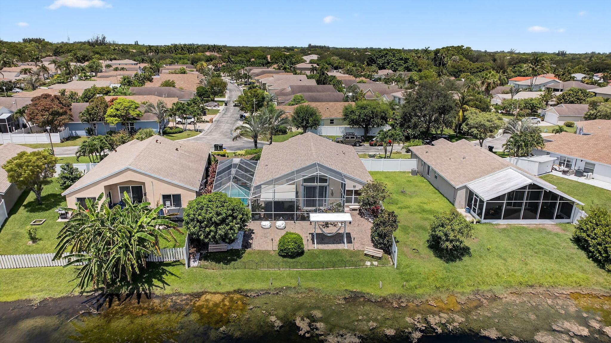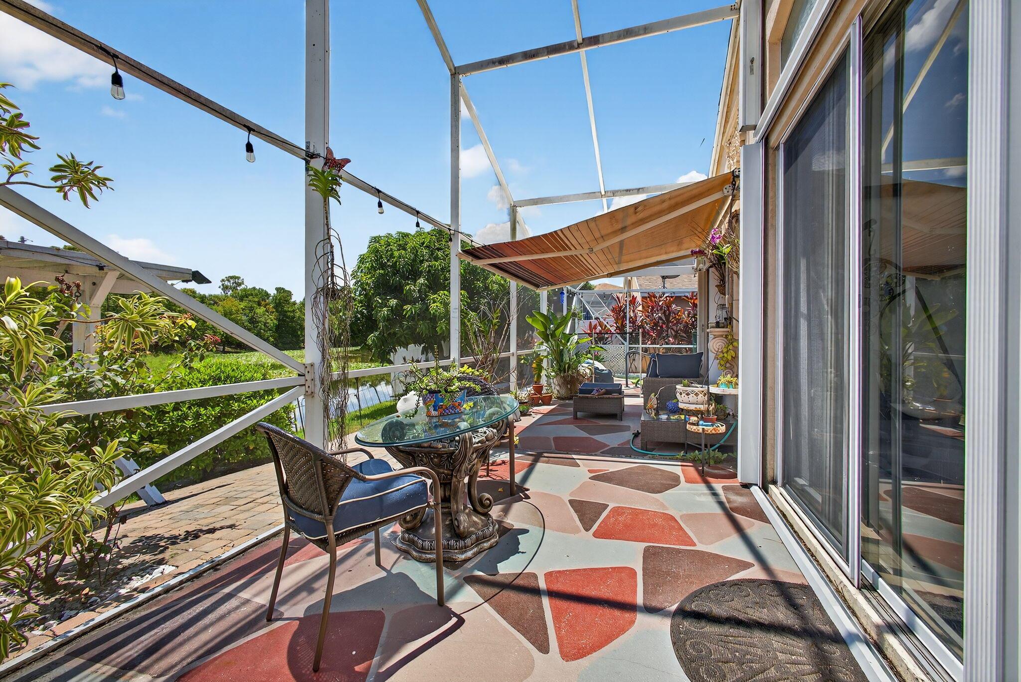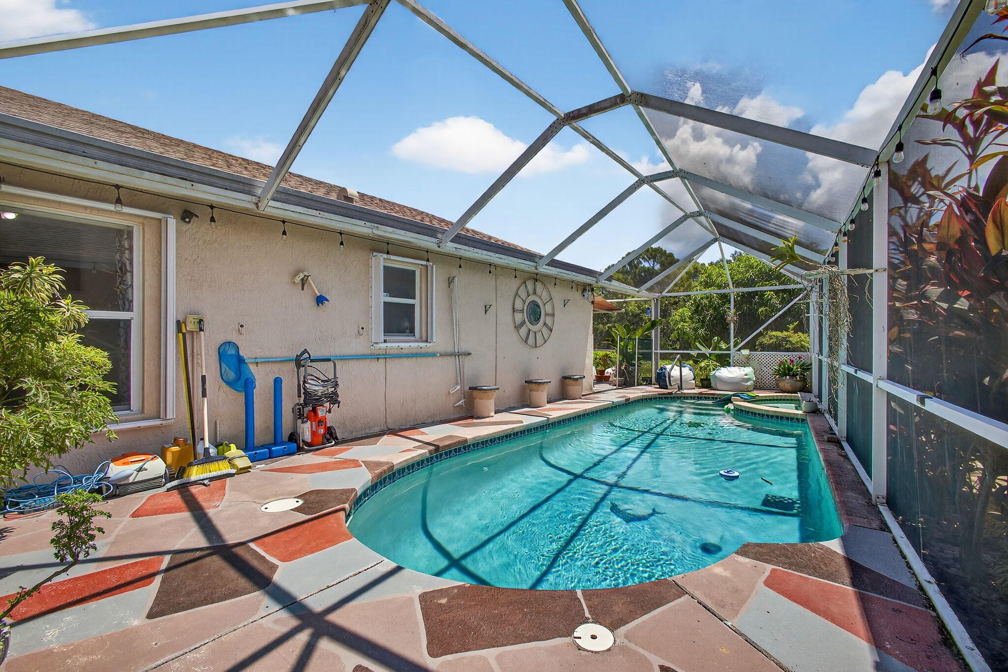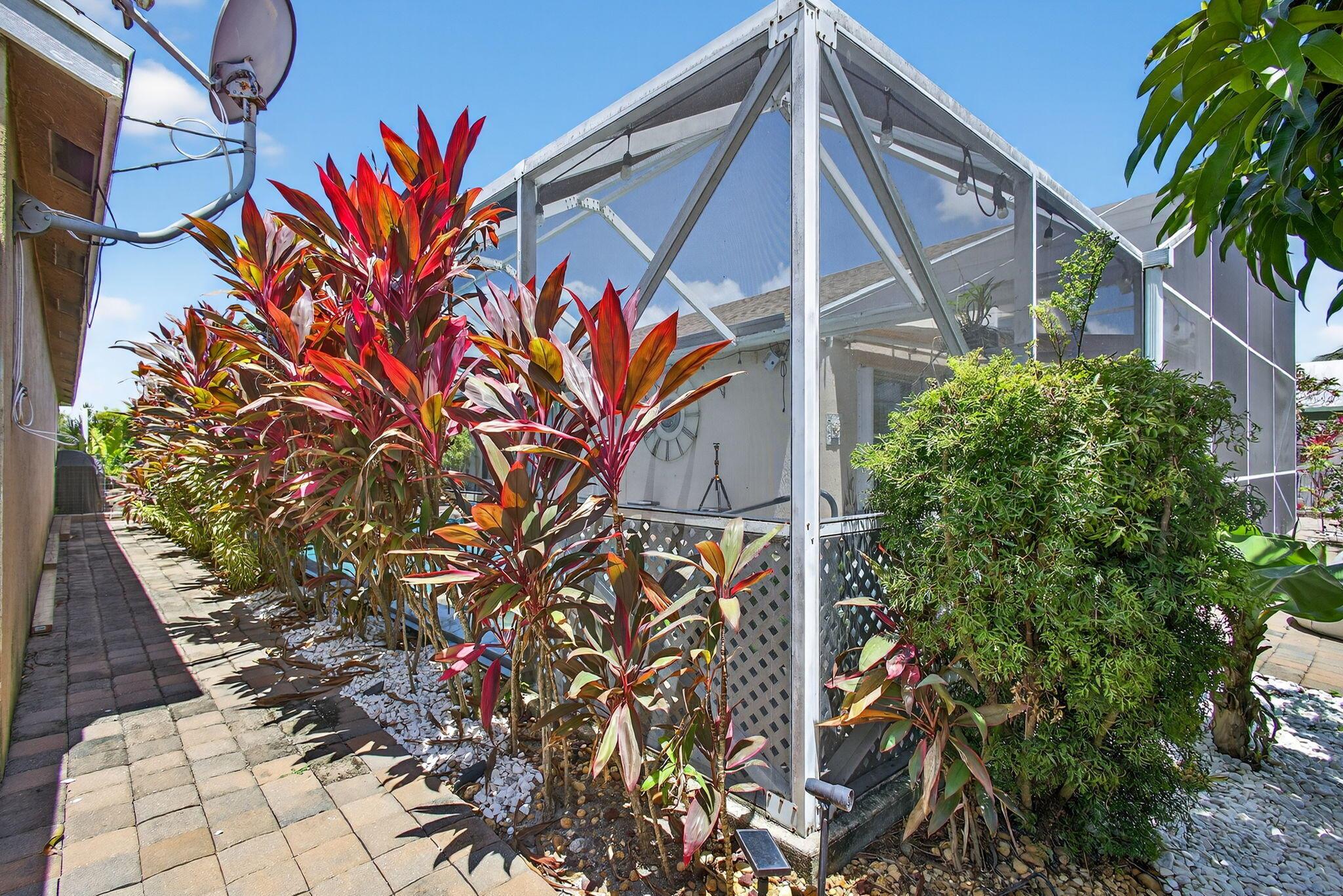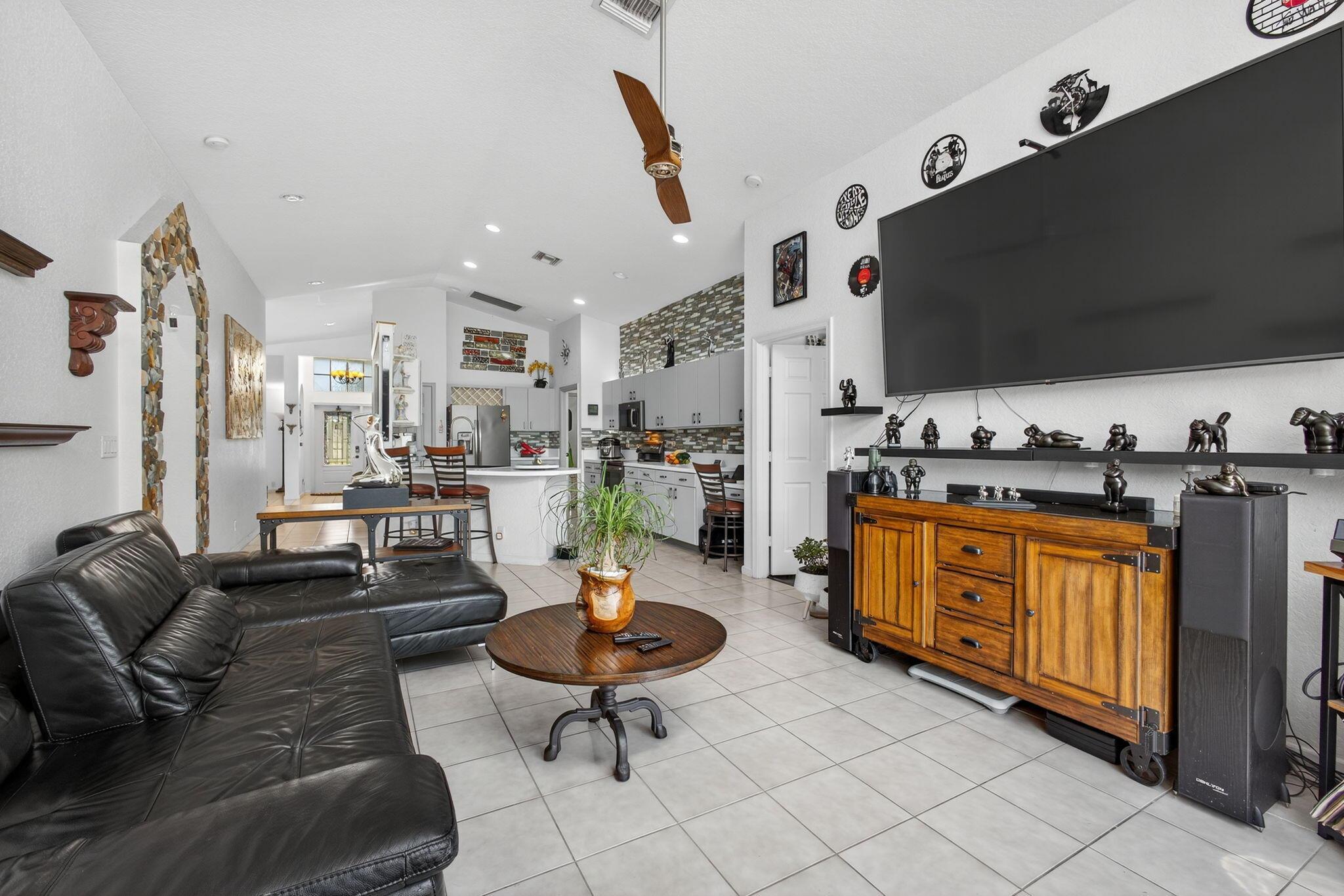 BRAND NEW ROOF 2024!! Stunning lakefront home with 3 bedrooms, 2 baths, a 2-car garage, screened-in pool and spa, and low HOA fee. This move-in-ready property features tile floors throughout the main living areas, custom built closet, vaulted ceilings and recessed lighting. The kitchen and living areas are enhanced with incredible stone accents and decorative backsplashes. The luxurious primary suite boasts a fully renovated bath with floor-to-ceiling porcelain tile, an oversized soaking tub, and elegant finishes. Enjoy your very own tropical oasis through the fenced-in pool and spa surrounded by a serene lake view and mature fruit trees. The heated pool includes a newer pool pump (2023). Full hurricane protection throughout of shutters and hurricane glass