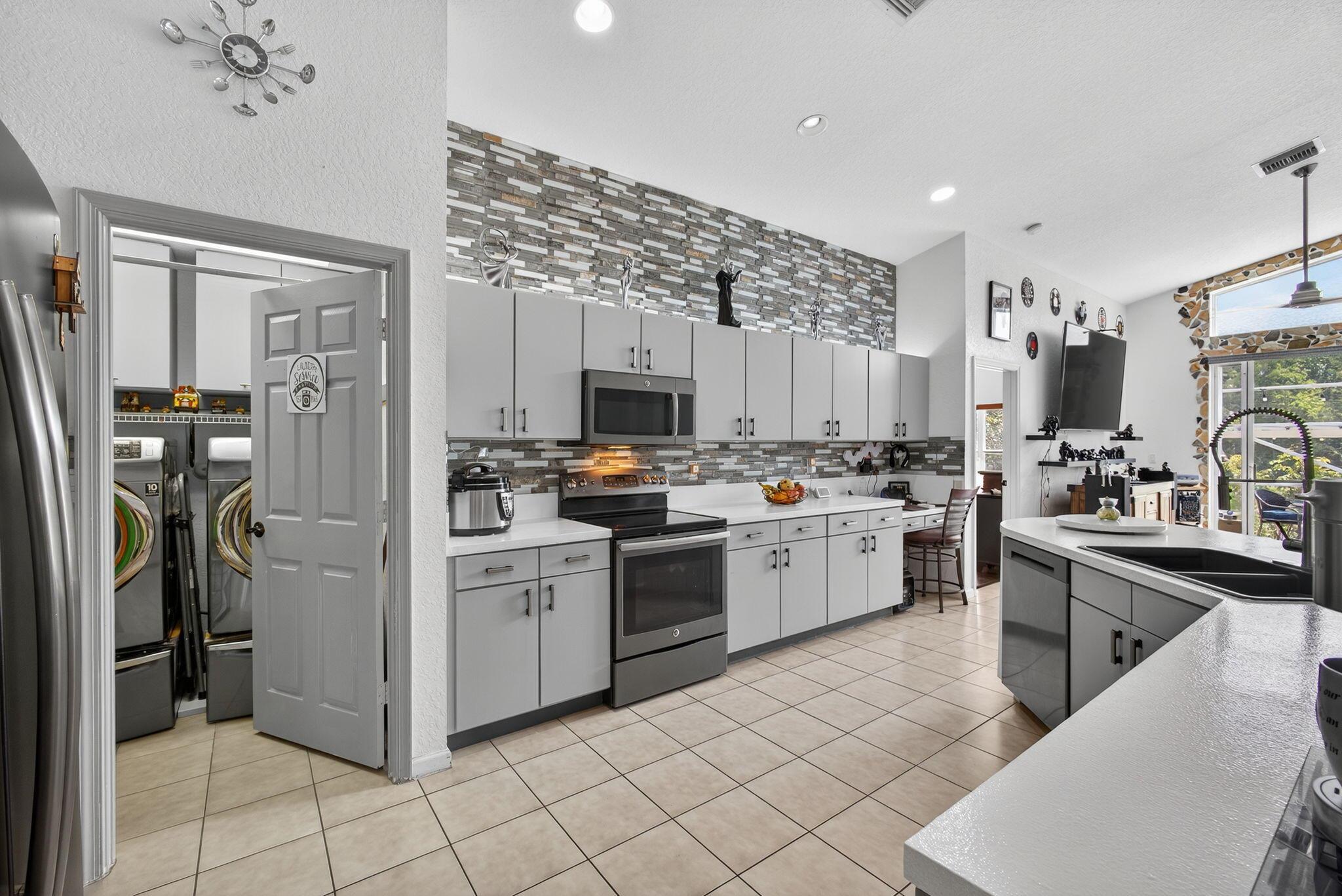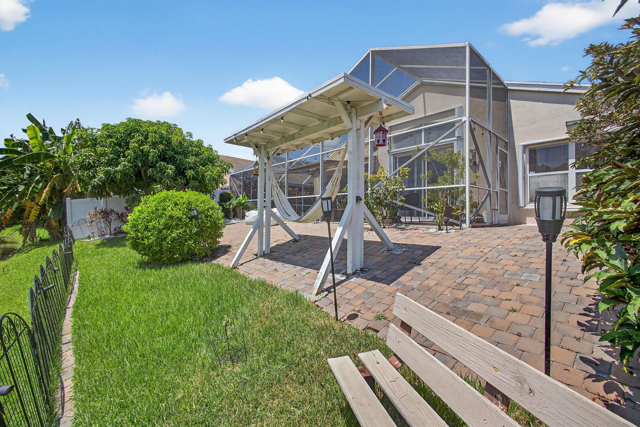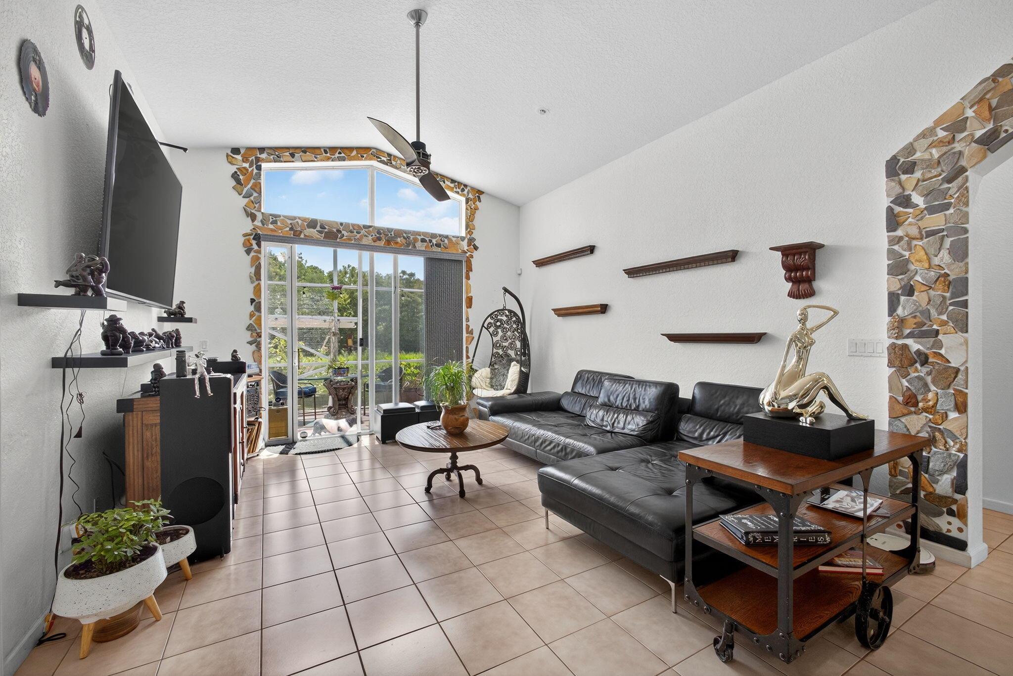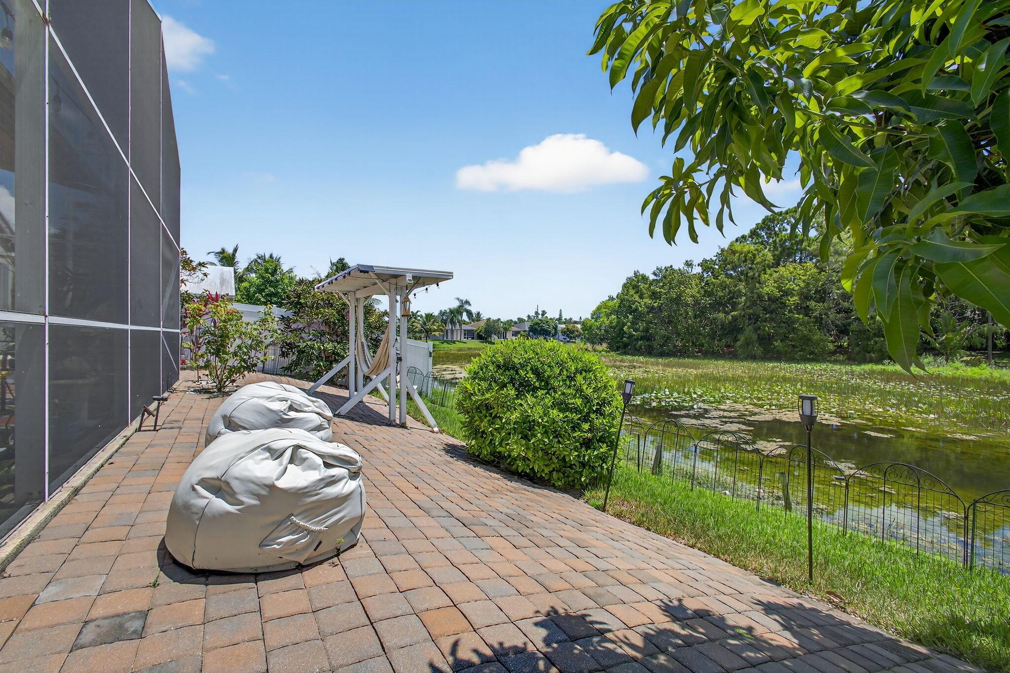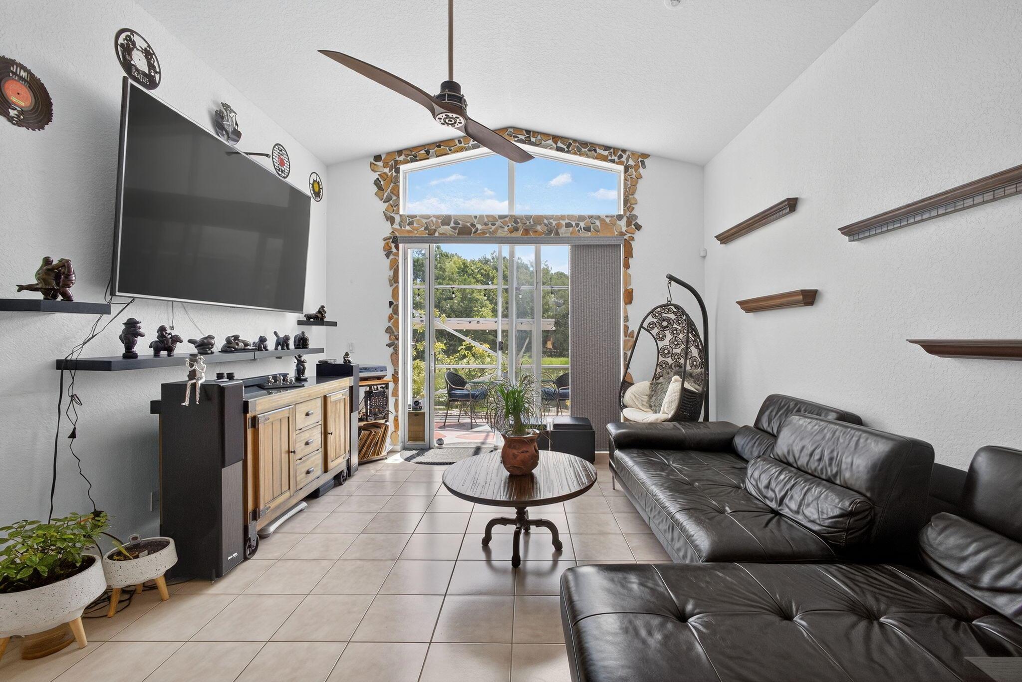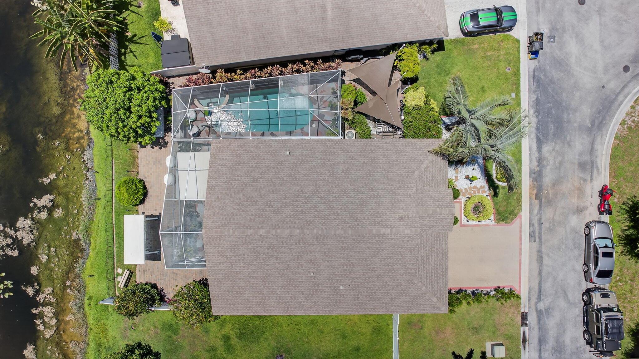 BRAND NEW ROOF 2024!! Stunning lakefront home with 3 bedrooms, 2 baths, a 2-car garage, screened-in pool and spa, and low HOA fee. This move-in-ready property features tile floors throughout the main living areas, custom built closet, vaulted ceilings and recessed lighting. The kitchen and living areas are enhanced with incredible stone accents and decorative backsplashes. The luxurious primary suite boasts a fully renovated bath with floor-to-ceiling porcelain tile, an oversized soaking tub, and elegant finishes. Enjoy your very own tropical oasis through the fenced-in pool and spa surrounded by a serene lake view and mature fruit trees. The heated pool includes a newer pool pump (2023). Full hurricane protection throughout of shutters and hurricane glass