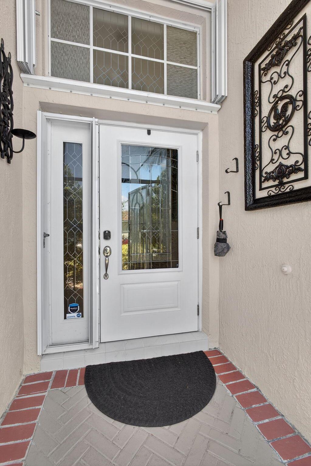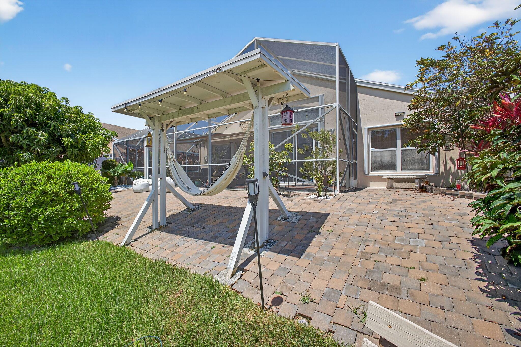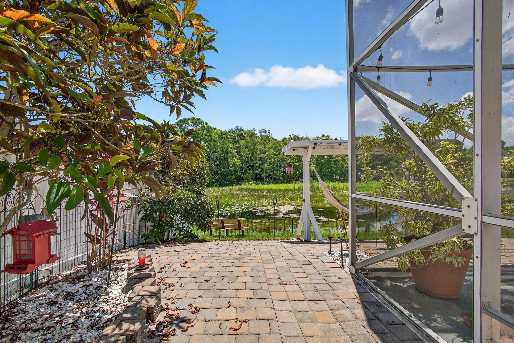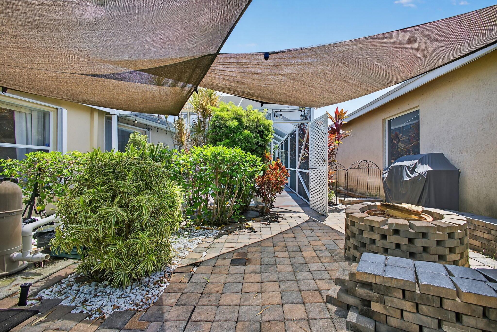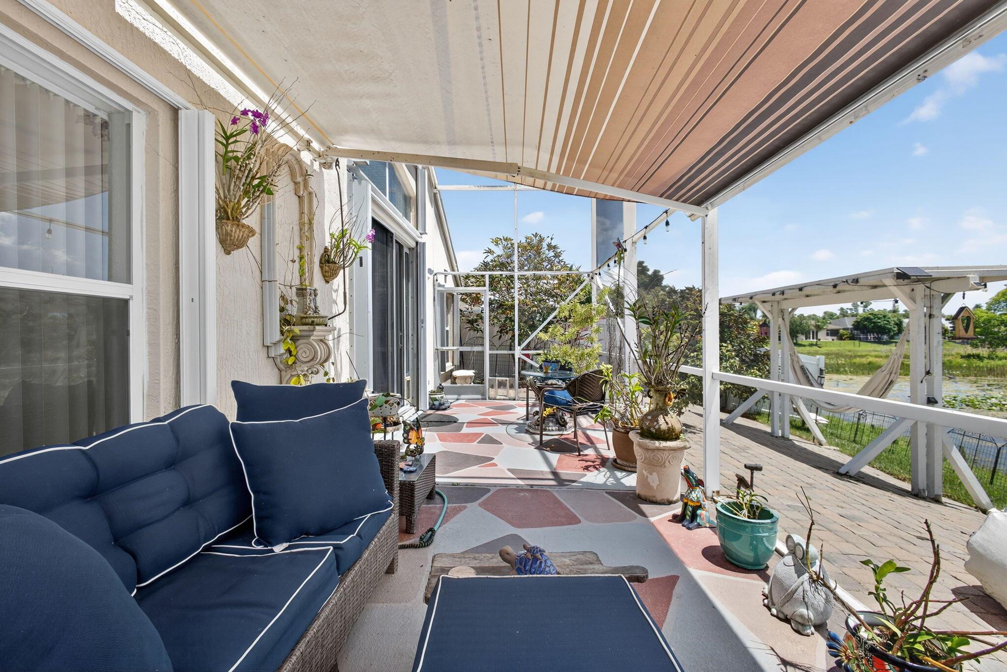BRAND NEW ROOF 2024!! Stunning lakefront home with 3 bedrooms, 2 baths, a 2-car garage, screened-in pool and spa, and low HOA fee. This move-in-ready property features tile floors throughout the main living areas, custom built closet, vaulted ceilings and recessed lighting. The kitchen and living areas are enhanced with incredible stone accents and decorative backsplashes. The luxurious primary suite boasts a fully renovated bath with floor-to-ceiling porcelain tile, an oversized soaking tub, and elegant finishes. Enjoy your very own tropical oasis through the fenced-in pool and spa surrounded by a serene lake view and mature fruit trees. The heated pool includes a newer pool pump (2023). Full hurricane protection throughout of shutters and hurricane glass