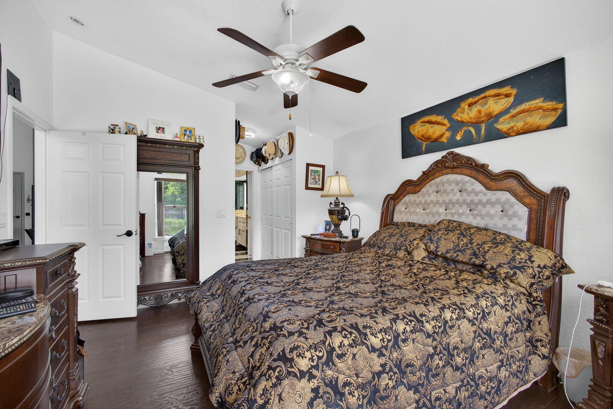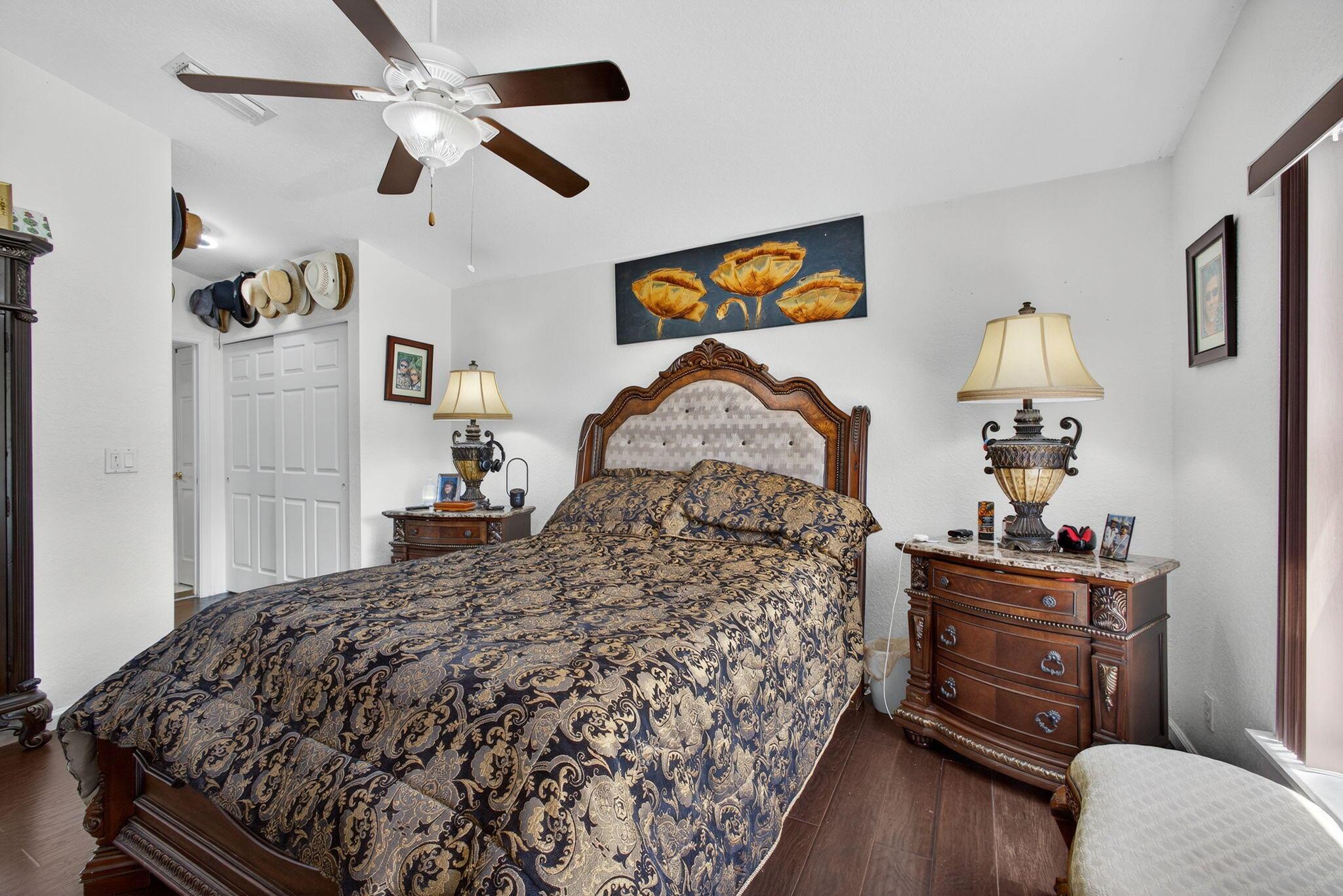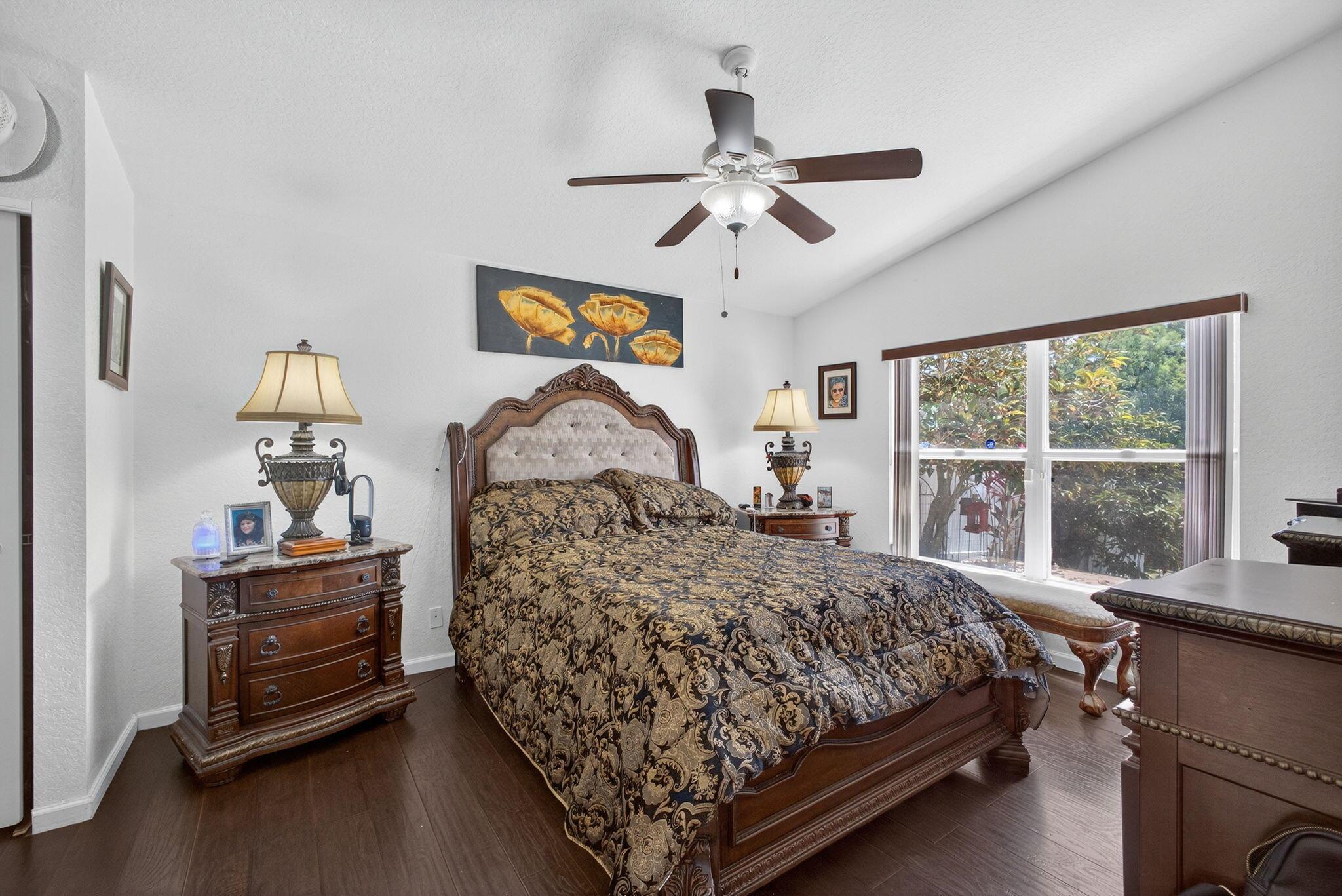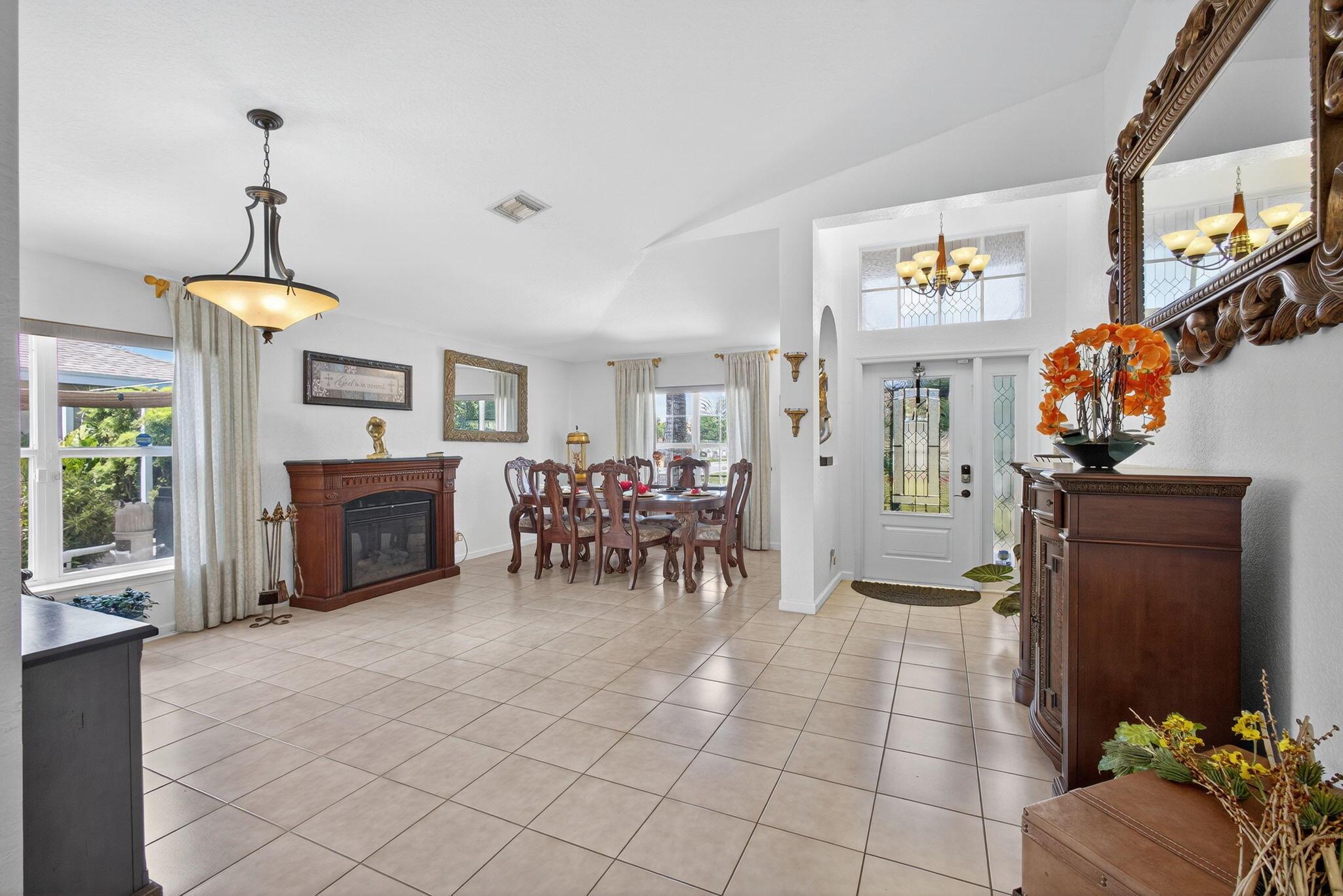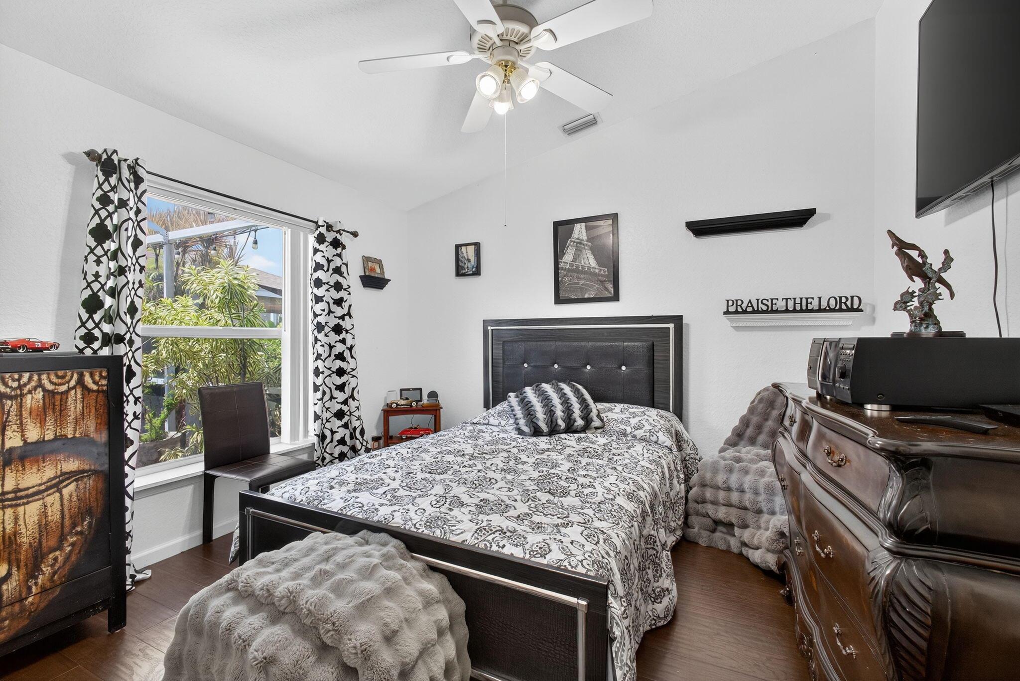 BRAND NEW ROOF 2024!! Stunning lakefront home with 3 bedrooms, 2 baths, a 2-car garage, screened-in pool and spa, and low HOA fee. This move-in-ready property features tile floors throughout the main living areas, custom built closet, vaulted ceilings and recessed lighting. The kitchen and living areas are enhanced with incredible stone accents and decorative backsplashes. The luxurious primary suite boasts a fully renovated bath with floor-to-ceiling porcelain tile, an oversized soaking tub, and elegant finishes. Enjoy your very own tropical oasis through the fenced-in pool and spa surrounded by a serene lake view and mature fruit trees. The heated pool includes a newer pool pump (2023). Full hurricane protection throughout of shutters and hurricane glass