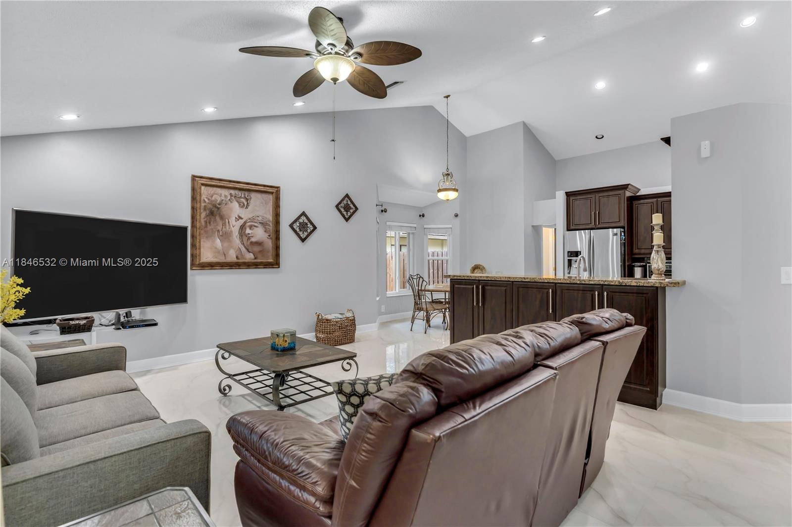 Stunning 4-bed, 2.5-bath ranch-style home in Coral Springs with modern upgrades throughout! Enjoy vaulted ceilings, oversized porcelain tile floors in the living areas, and a freshly painted interior. The spacious kitchen boasts stainless steel appliances and plenty of cabinet space with an open concept to the living room. The primary suite features tray ceilings and sliding doors that lead out to the pool area. A/C (2019) two thermostat dual zone unit. Water heater 2023. Impact windows and doors offer peace of mind, while the oversized paved driveway adds convenience for plenty of parking. Step outside to your private backyard oasis with a sparkling screened in pool—perfect for entertaining which includes specialty lighting. No HOA, great location, and move-in ready! Don't miss this gem!