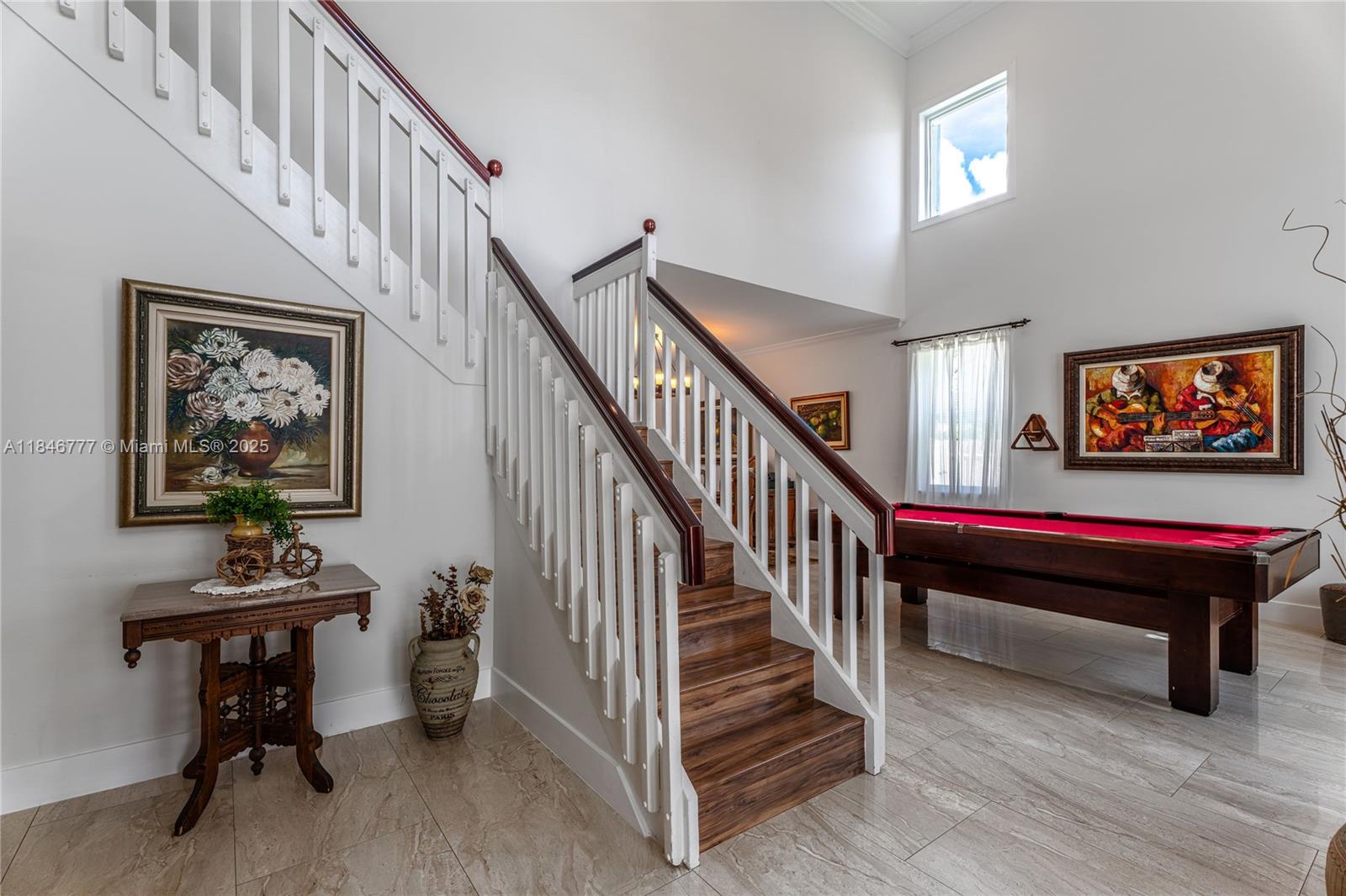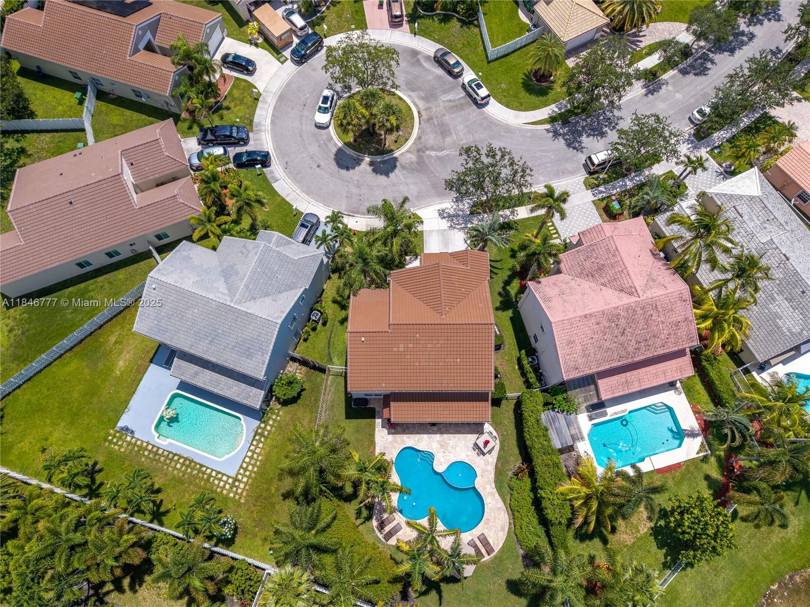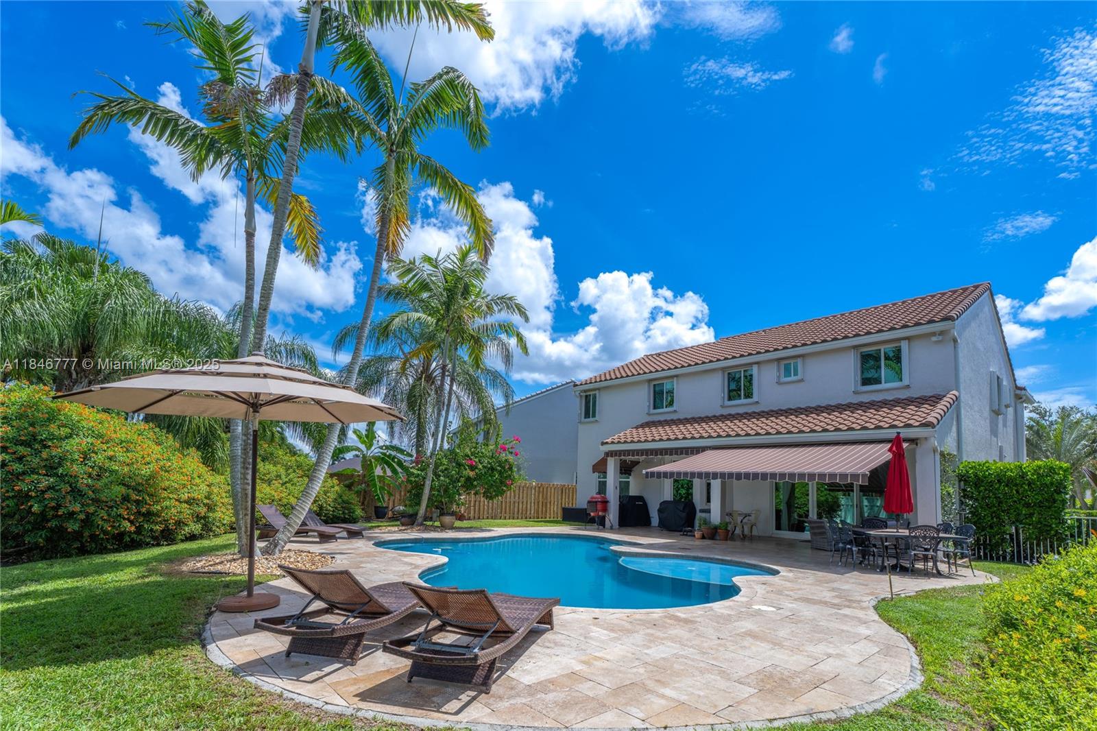 Welcome to your dream home! This beautiful 5-bedroom, 3.5-bath residence offers the perfect elegance and comfort. Enjoy peace of mind with a NEW ROOF and NEW IMPACT WINDOWS AND DOORS throughout. The spacious layout is ideal for both everyday living. This home features a gourmet kitchen with wood cabinets and stainless steal appliances. Resort-style POOL, PRIVATE and fully FENCED BACKYARD, covered patio, and child safety pool fence—perfect for entertaining. Serene lake view with no water access. Quiet cul-de-sac in a family-oriented community, The Falls. Gated community offers pool, playground and a basketball court. Roof 2022, Impact windows 2022, interior paint 2023, exterior paint 2022, AC 2023 condenser unit (outdoor)/2009 Evaporator Coil/Air Handler (indoor). All bedrooms are upstairs.