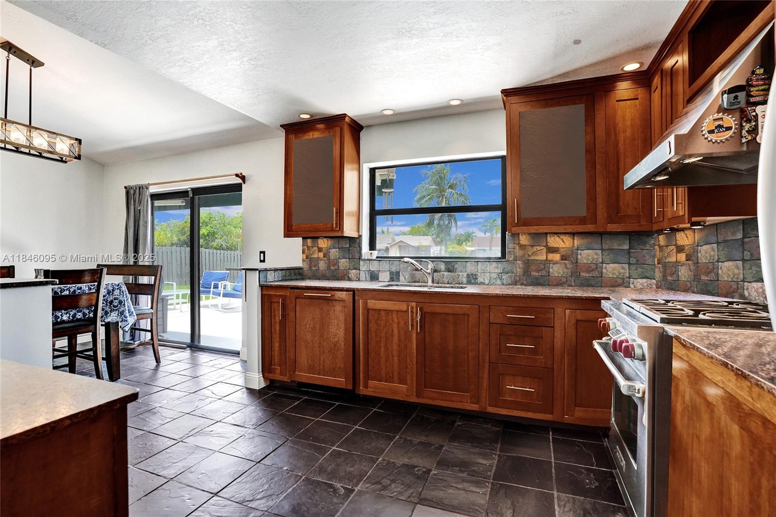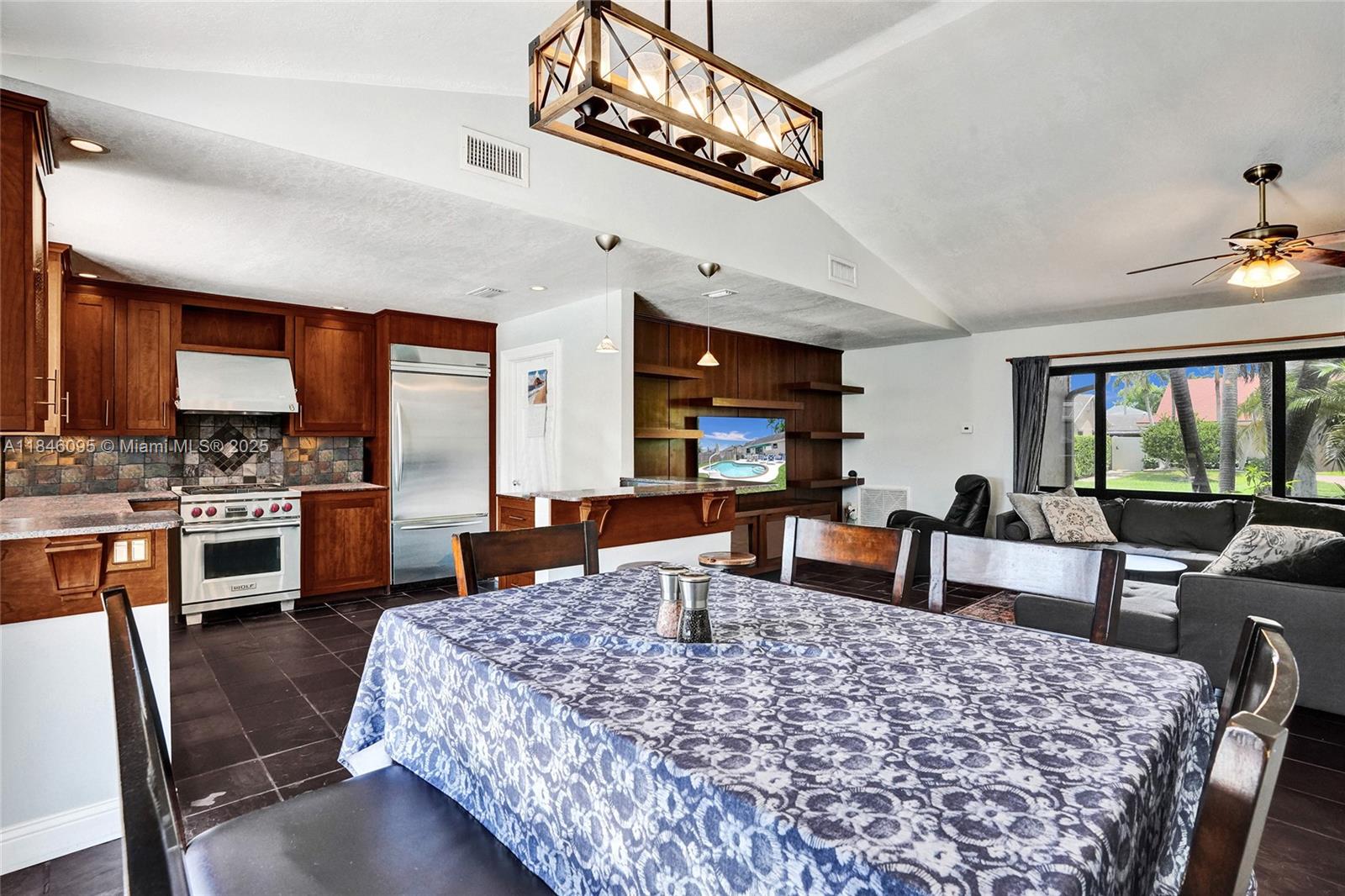 Nicely upgraded home featuring a magnificent pool and patio overlooking a breathtaking waterfront. Enjoy cooking in the gourmet kitchen with wood cabinets, granite countertops, high-end stainless-steel appliances, and a snack bar. This home offers Gas Range, Water Heater, and Home Generator (whole home). Other features include genuine slate floors, vaulted ceilings, crown molding, and a custom built-in entertainment unit. Bathrooms have been recently renovated with modern finishes and freshly painted. Homes is protected with impact glass windows, alarm system, generator, ceiling fans, paver driveway, and lush landscaping for that added curb appeal. Close to major highways for easy commute, many restaurants around the area, shopping malls, hospitals, schools and more.