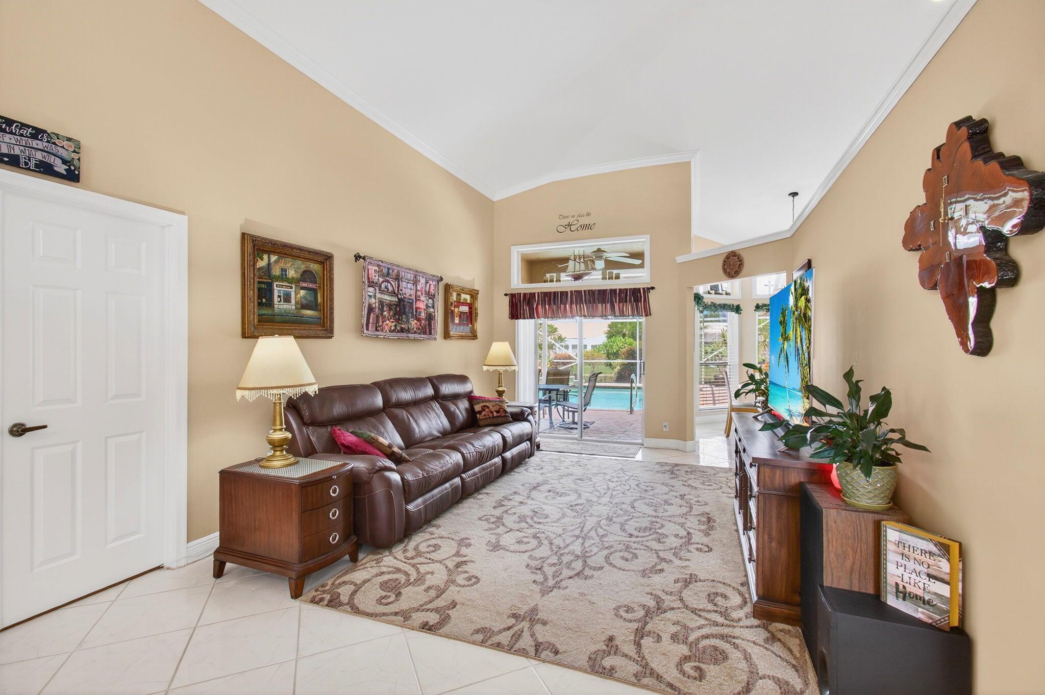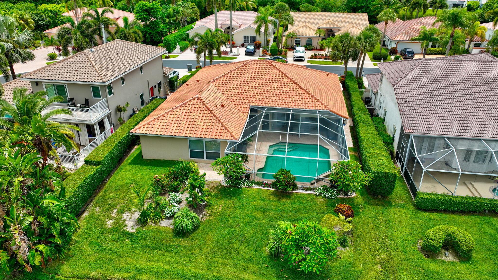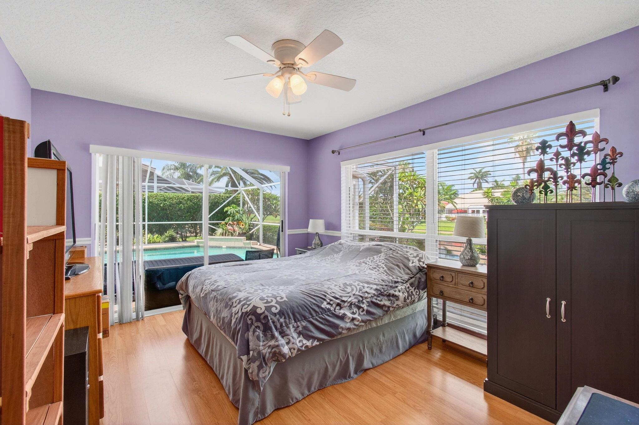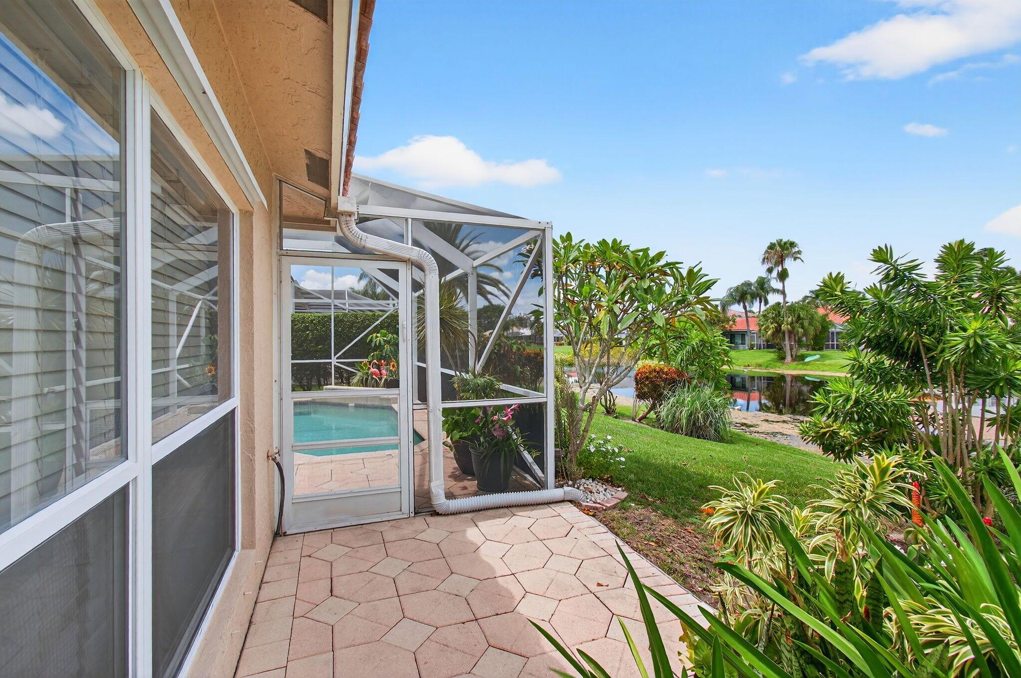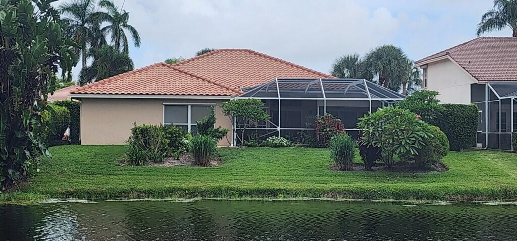 Rare opportunity to live in the boutique gated community of Boynton Waters. This beautifully maintained and updated 4 bedroom / 3 bath pool home. A new roof was installed Sept 2024 with a 15 year transferable warranty. Open floor plan features vaulted ceilings, crown molding and custom blinds. The gourmet kitchen features wood cabinetry, granite counters, slate appliances and a breakfast bar that opens to the family room. The oversized owner's suite boasts a walk-in closet and ensuite bath with a soaking tub, dual vanities, marble shower and floors plus sliding door access to the outdoor patio. The split floor plan offers privacy and the secondary bedroom features an ensuite handicap accessible bathroom.
