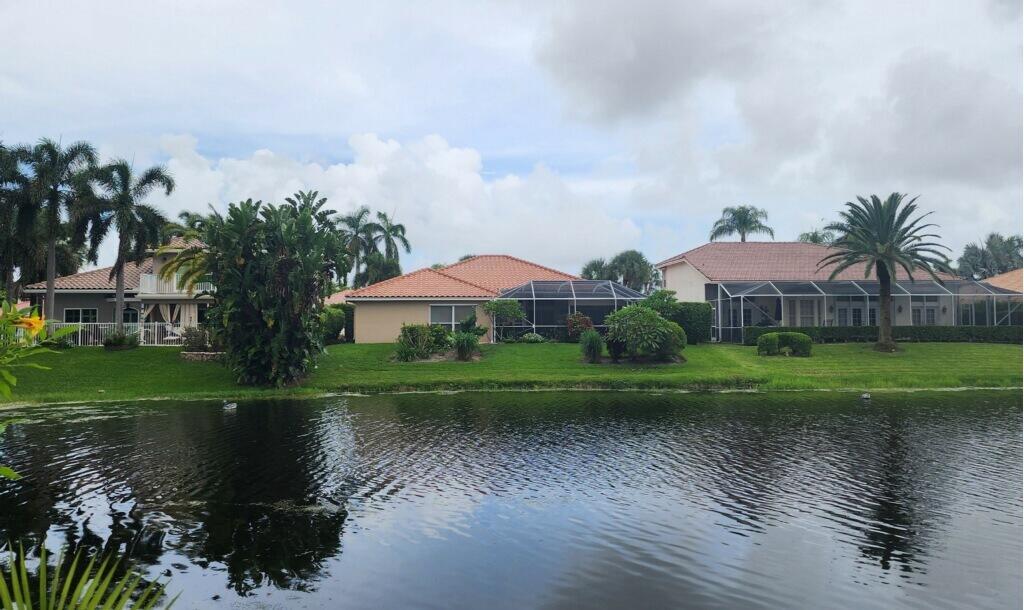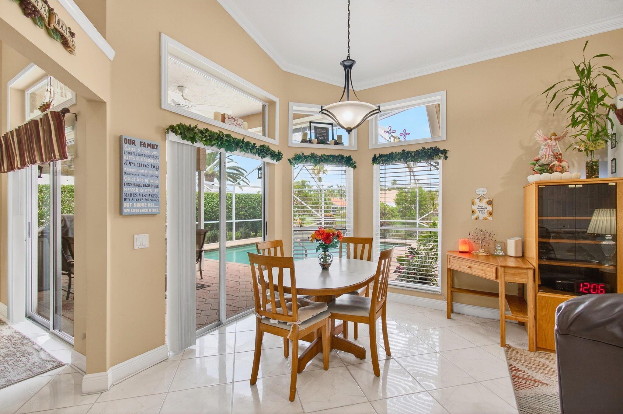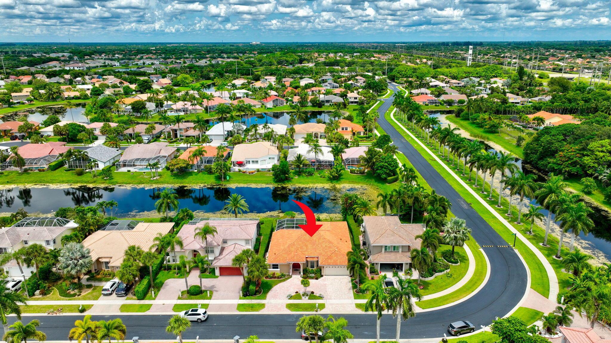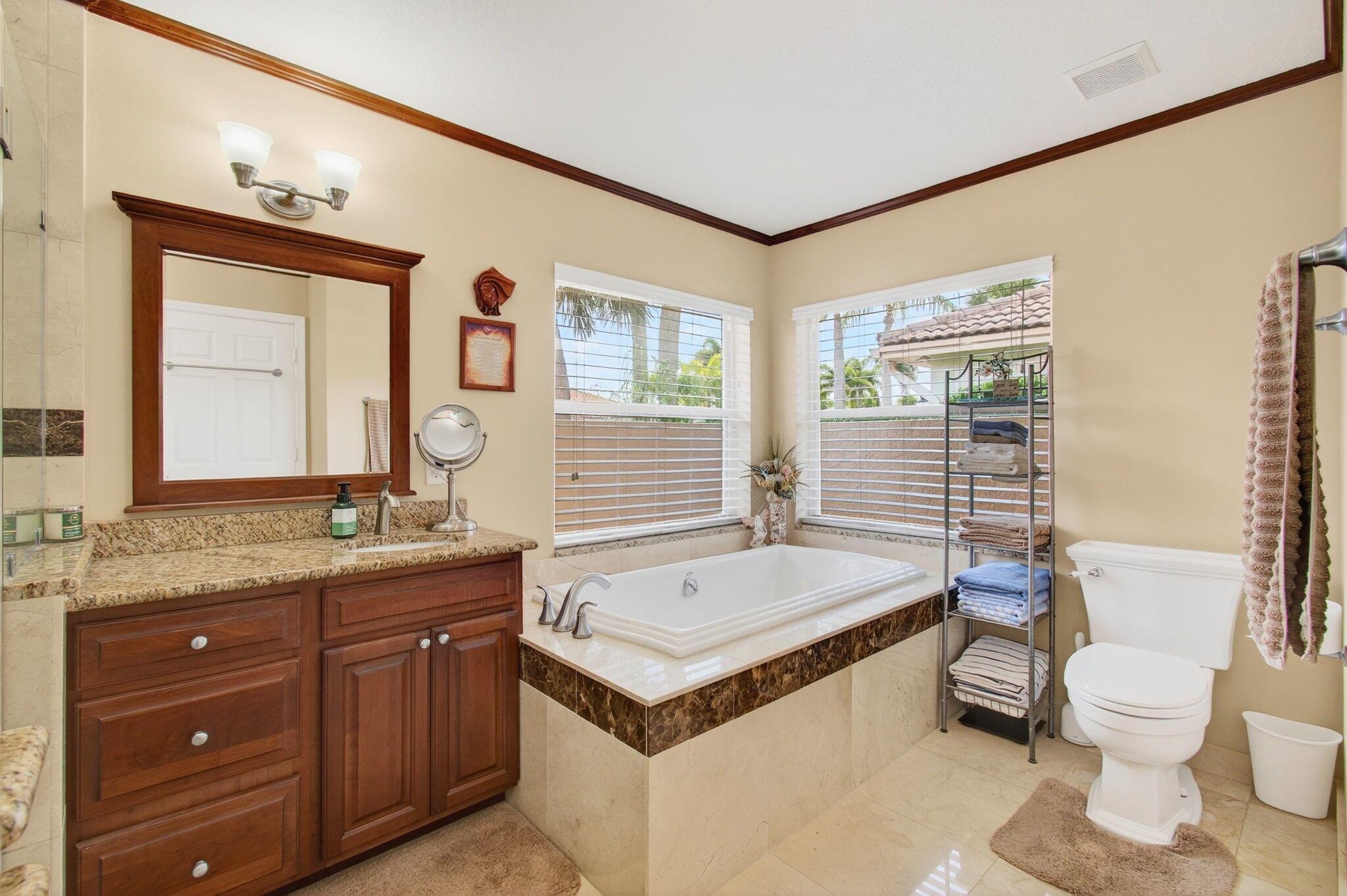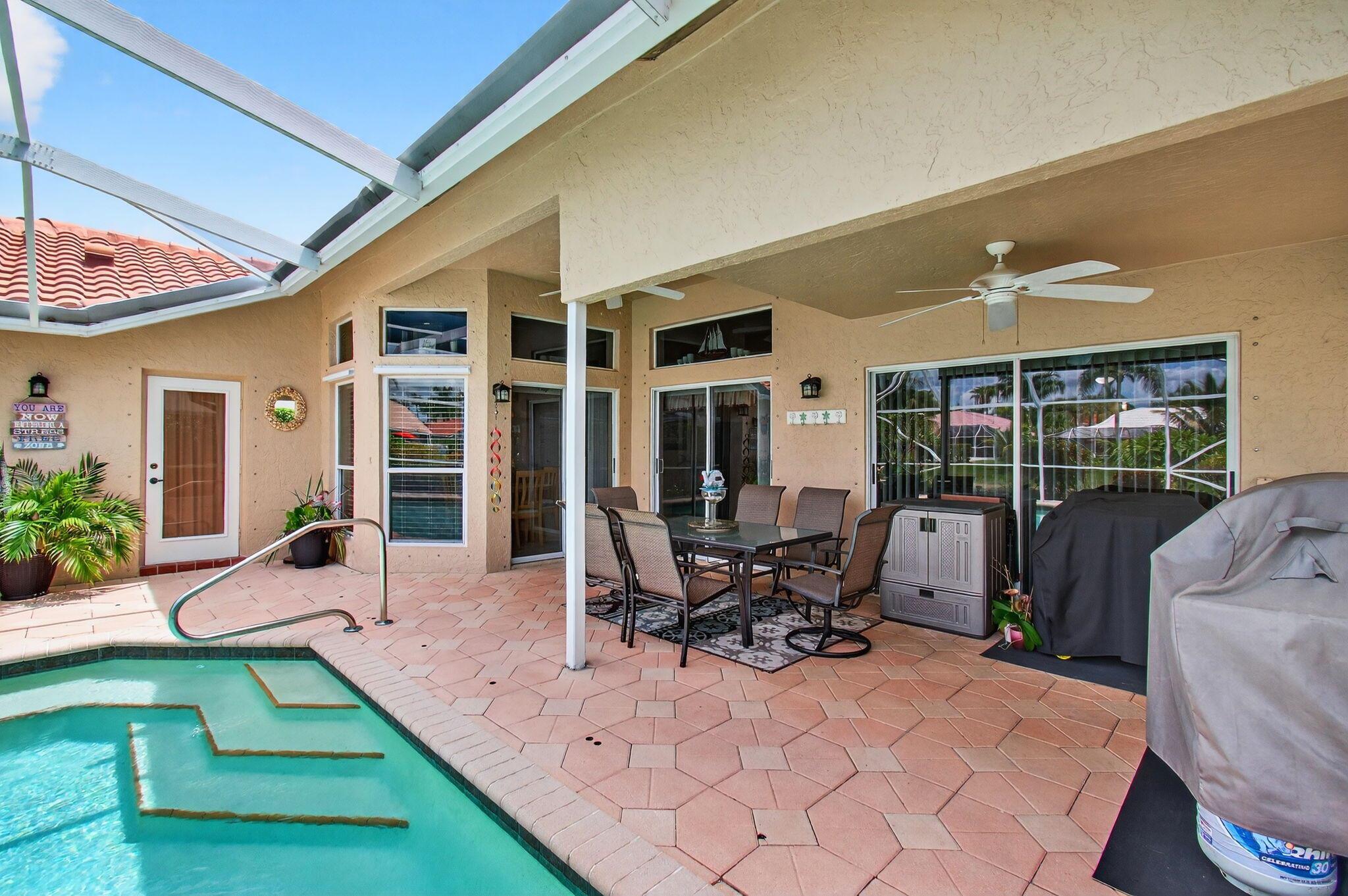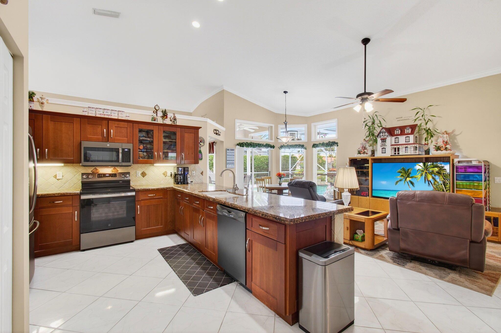 Rare opportunity to live in the boutique gated community of Boynton Waters. This beautifully maintained and updated 4 bedroom / 3 bath pool home. A new roof was installed Sept 2024 with a 15 year transferable warranty. Open floor plan features vaulted ceilings, crown molding and custom blinds. The gourmet kitchen features wood cabinetry, granite counters, slate appliances and a breakfast bar that opens to the family room. The oversized owner's suite boasts a walk-in closet and ensuite bath with a soaking tub, dual vanities, marble shower and floors plus sliding door access to the outdoor patio. The split floor plan offers privacy and the secondary bedroom features an ensuite handicap accessible bathroom.