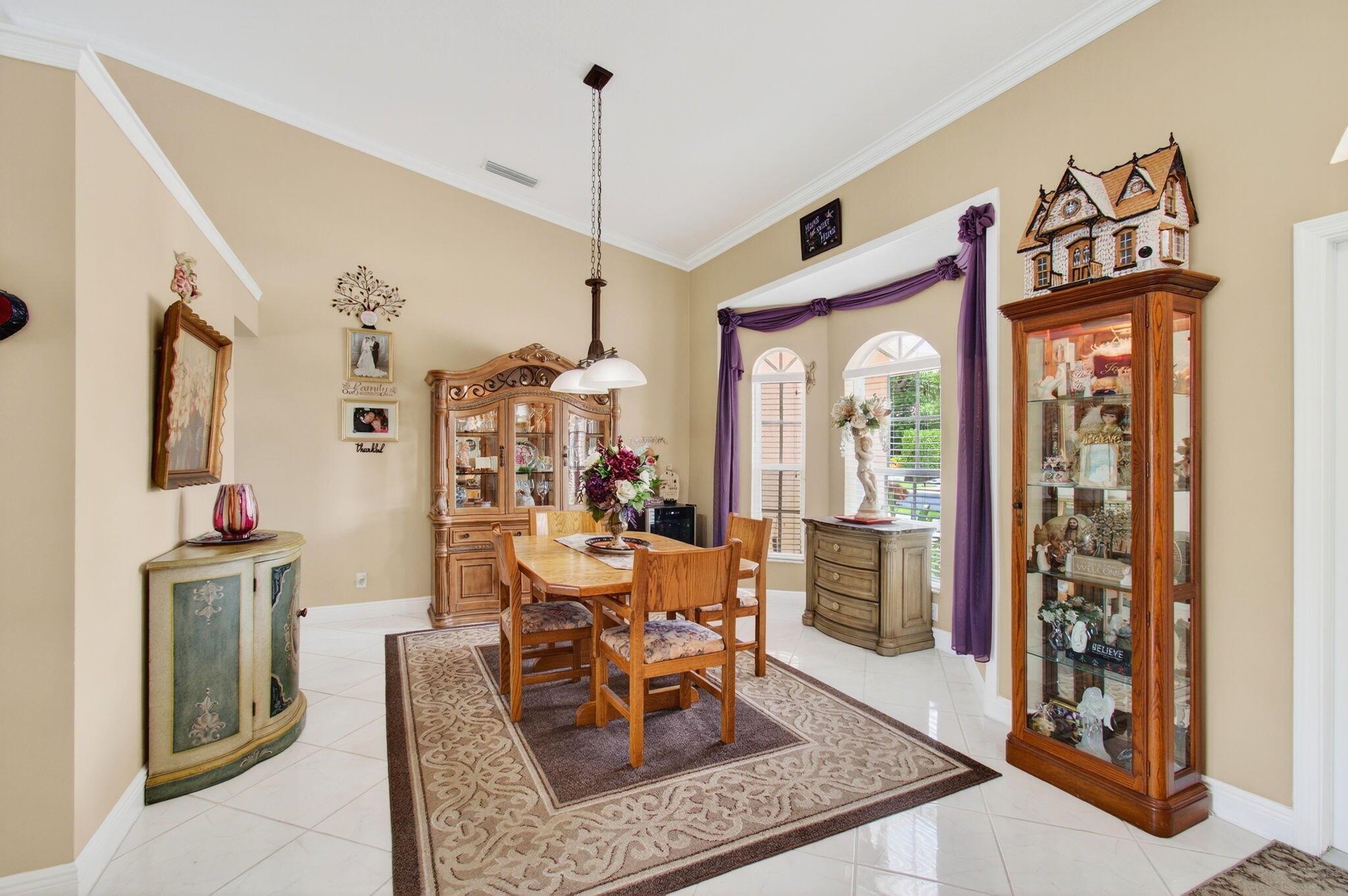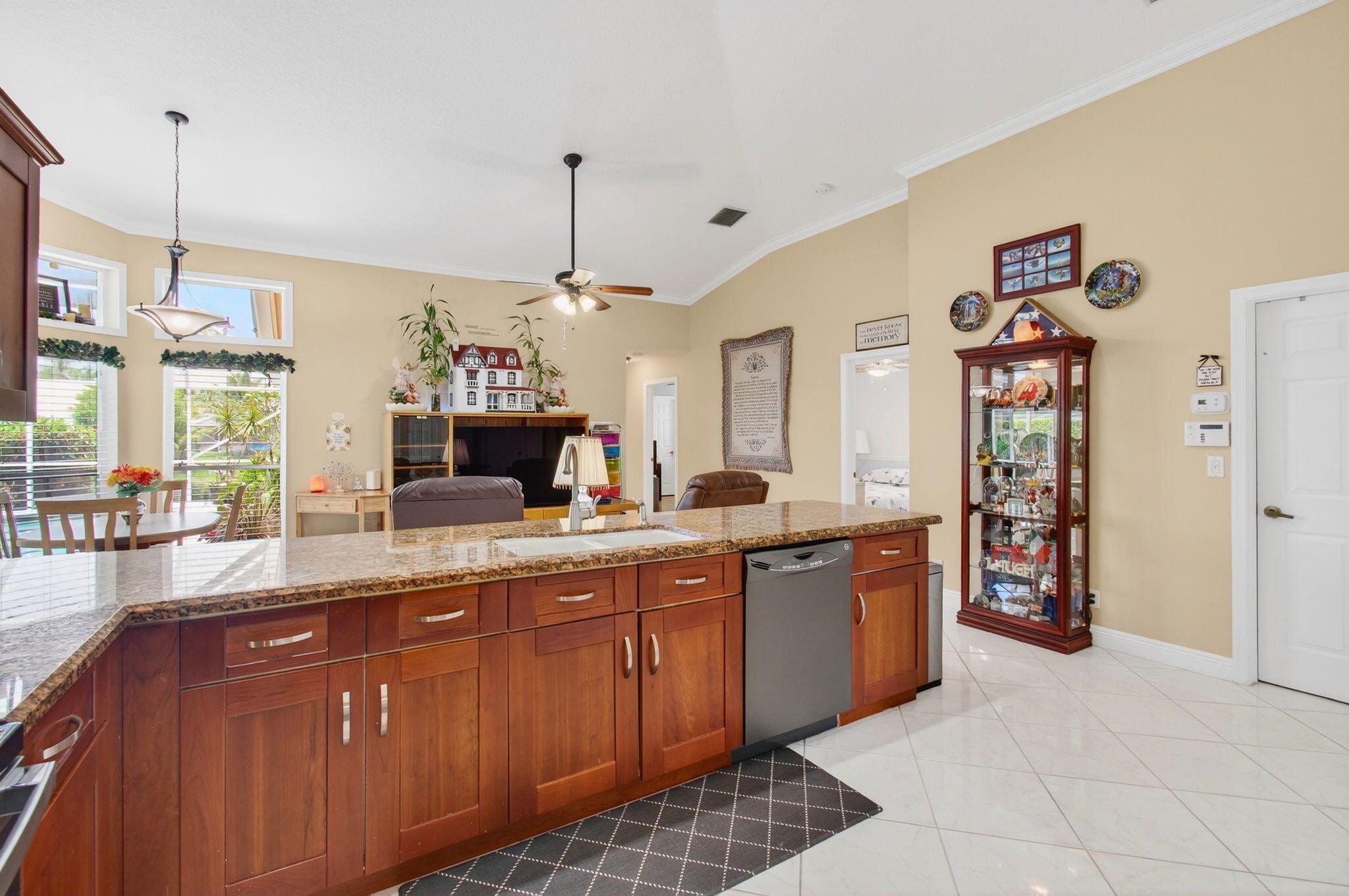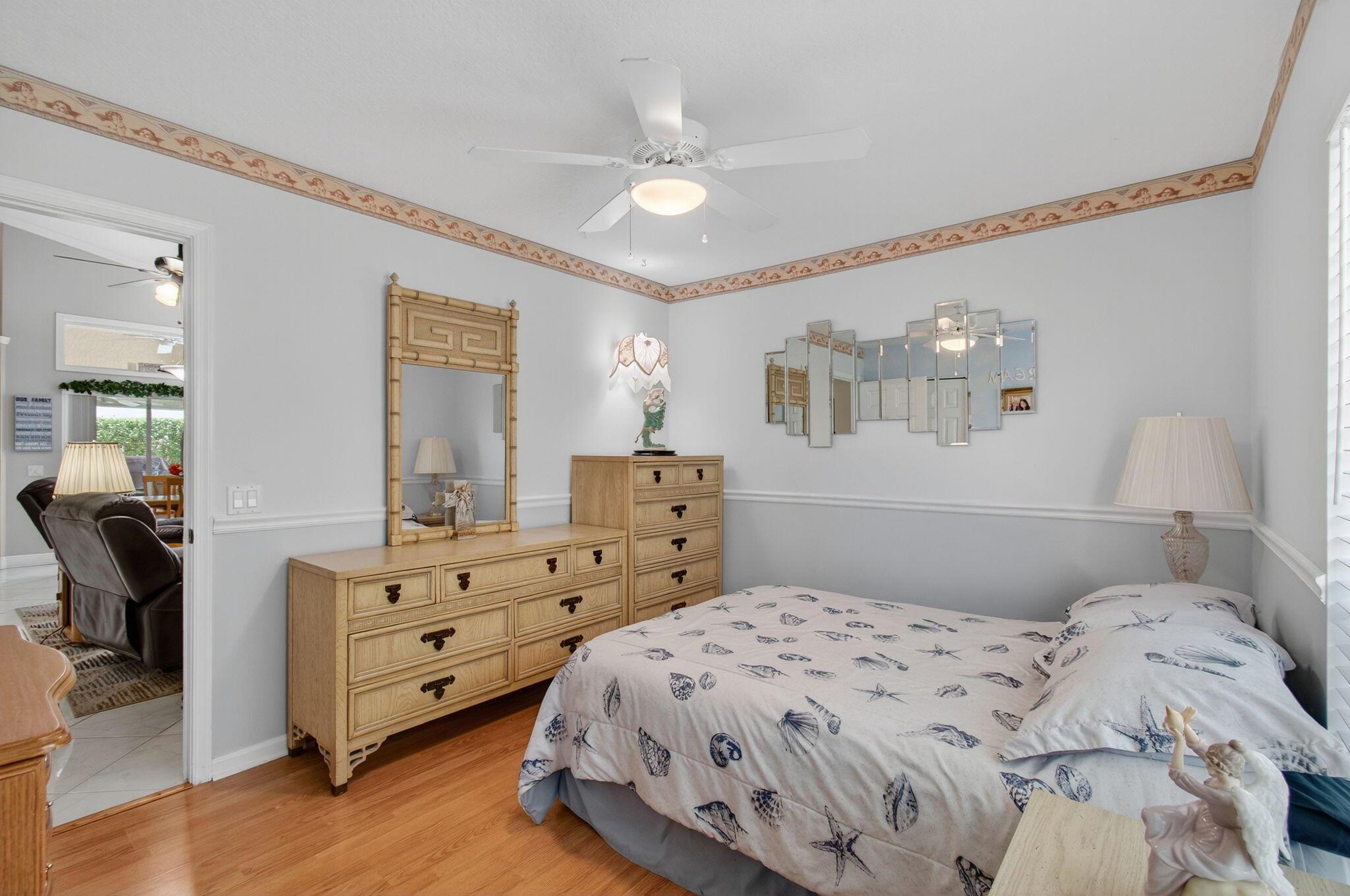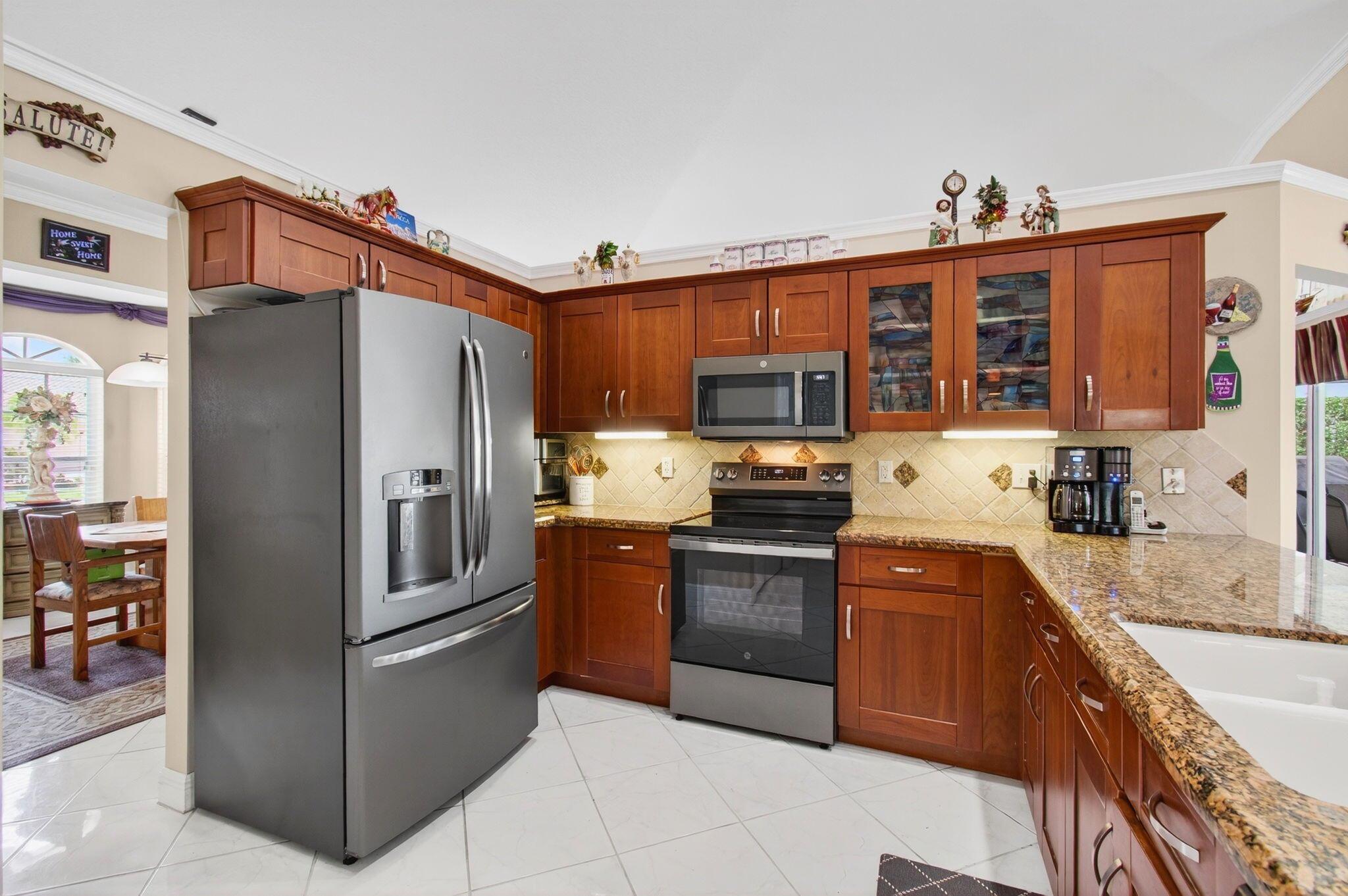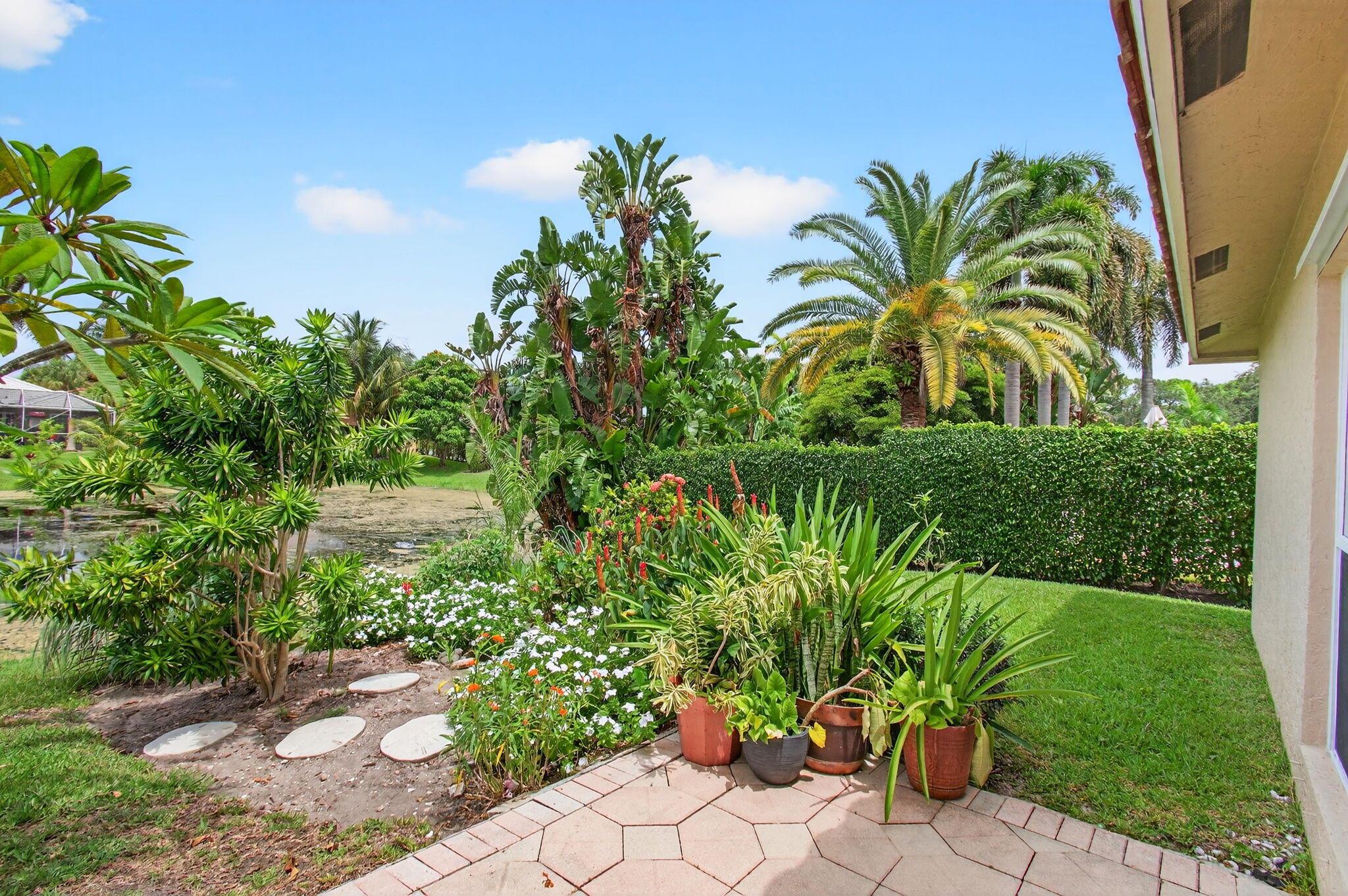 Rare opportunity to live in the boutique gated community of Boynton Waters. This beautifully maintained and updated 4 bedroom / 3 bath pool home. A new roof was installed Sept 2024 with a 15 year transferable warranty. Open floor plan features vaulted ceilings, crown molding and custom blinds. The gourmet kitchen features wood cabinetry, granite counters, slate appliances and a breakfast bar that opens to the family room. The oversized owner's suite boasts a walk-in closet and ensuite bath with a soaking tub, dual vanities, marble shower and floors plus sliding door access to the outdoor patio. The split floor plan offers privacy and the secondary bedroom features an ensuite handicap accessible bathroom.