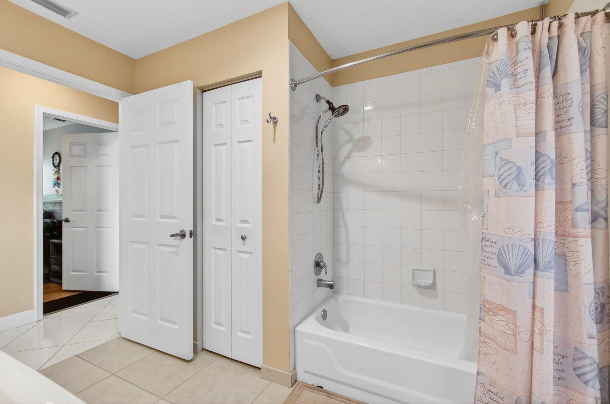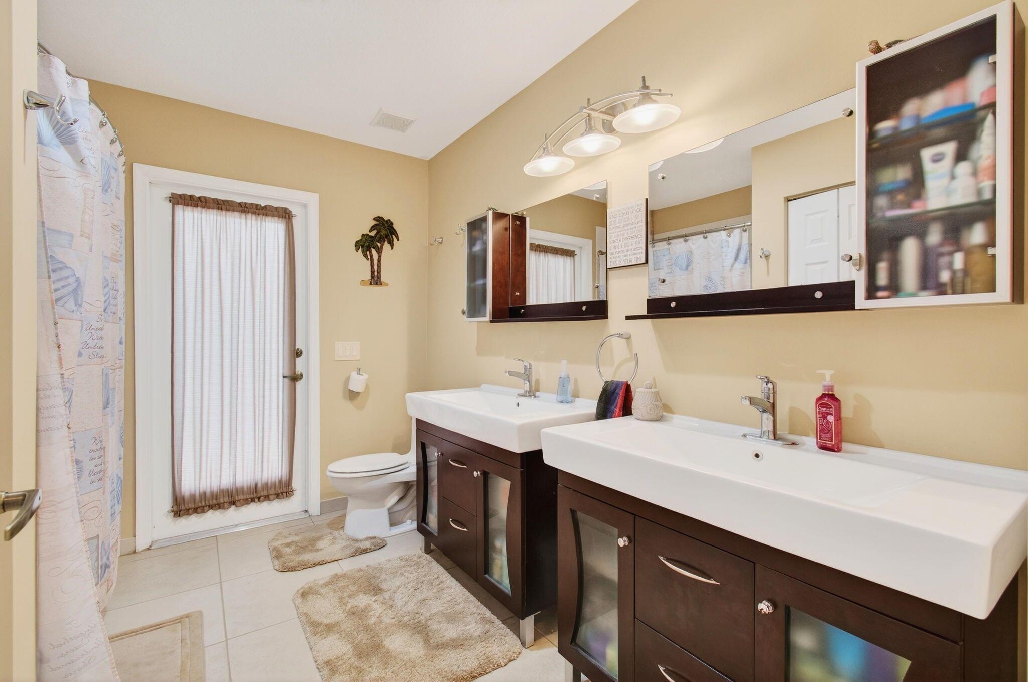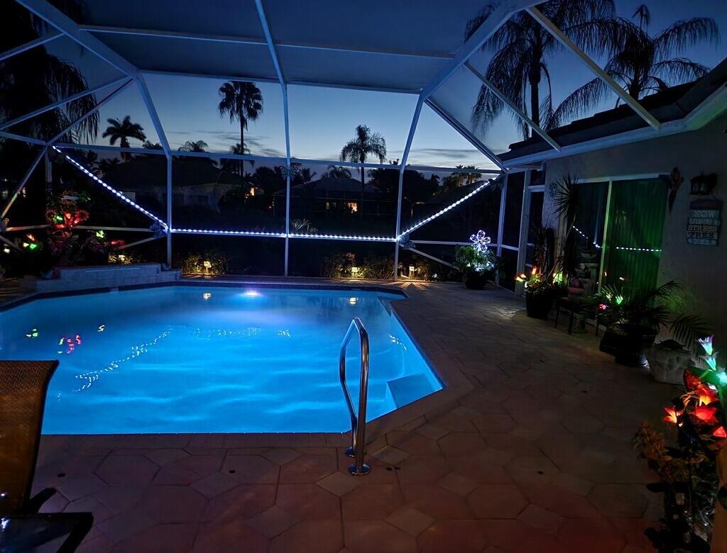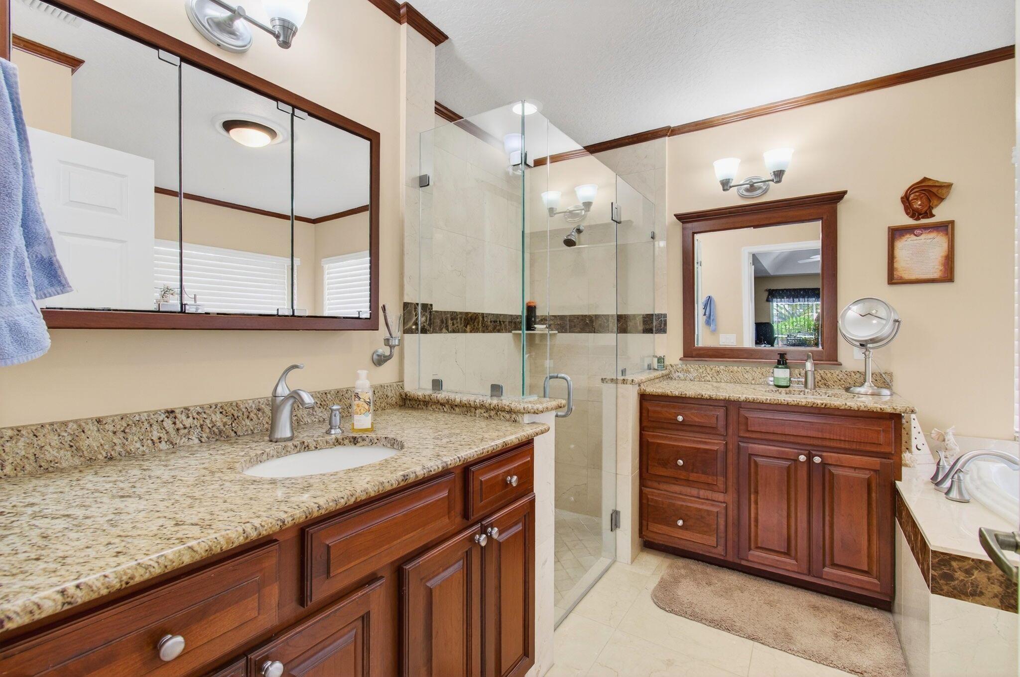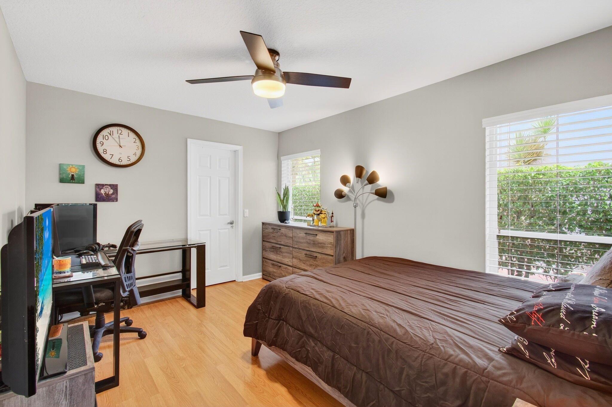 Rare opportunity to live in the boutique gated community of Boynton Waters. This beautifully maintained and updated 4 bedroom / 3 bath pool home. A new roof was installed Sept 2024 with a 15 year transferable warranty. Open floor plan features vaulted ceilings, crown molding and custom blinds. The gourmet kitchen features wood cabinetry, granite counters, slate appliances and a breakfast bar that opens to the family room. The oversized owner's suite boasts a walk-in closet and ensuite bath with a soaking tub, dual vanities, marble shower and floors plus sliding door access to the outdoor patio. The split floor plan offers privacy and the secondary bedroom features an ensuite handicap accessible bathroom.