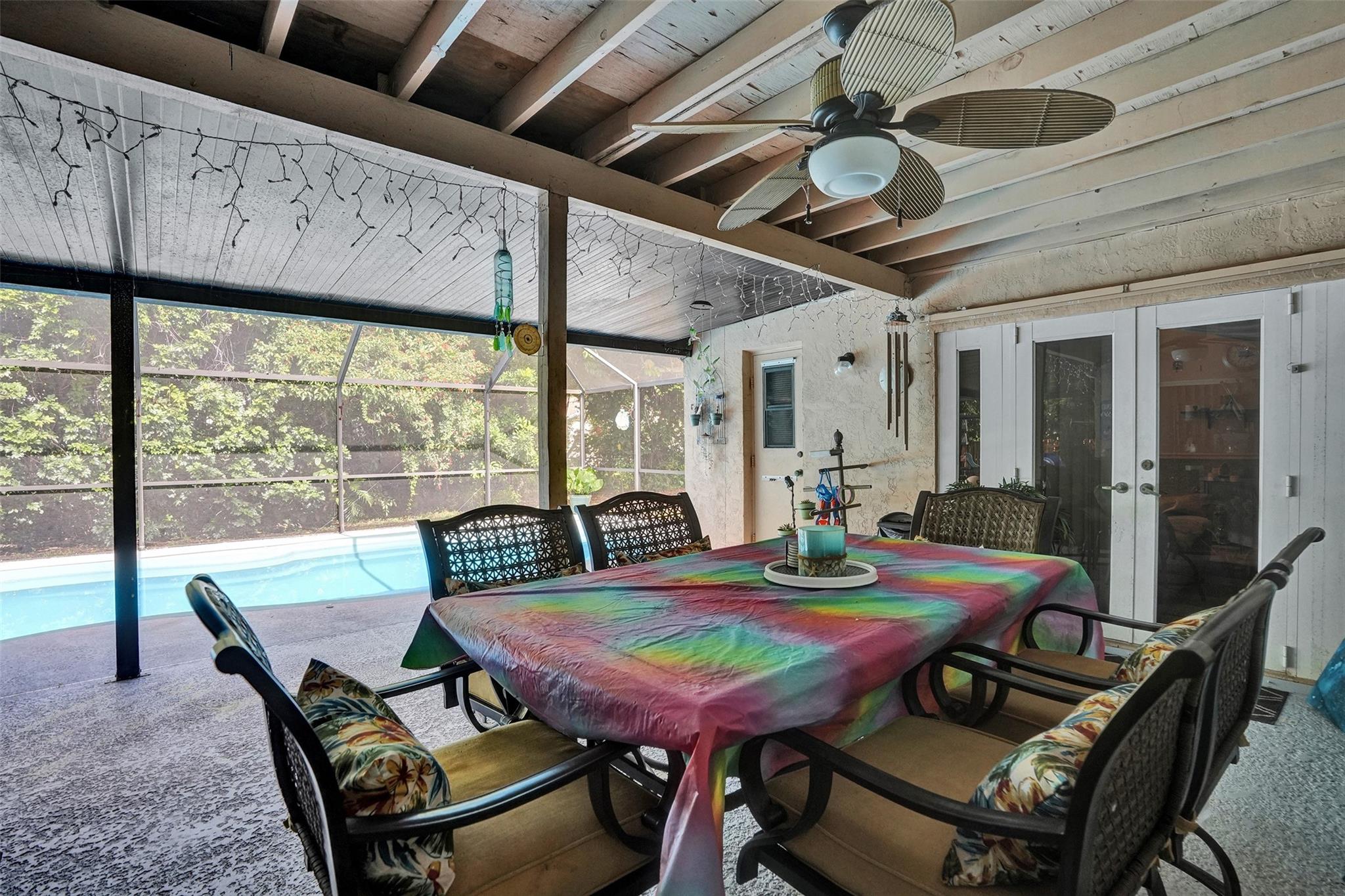 Rarely available 3/2 pool home located on quiet cut de sac. Extra office off of primary bedroom. Open kitchen with pantry and breakfast bar. Pass thru counter to patio. Great for entertaining! Most rooms overlook beautiful screened pool area. Cabana bathroom. Split bedroom plan. Large room sizes. No HOA!! New Roof (2024) New A/C (2023). Hurricane shutters throughout. Large, private backyard. Walking distance to the Walk! Make an appointment today before it's gone!