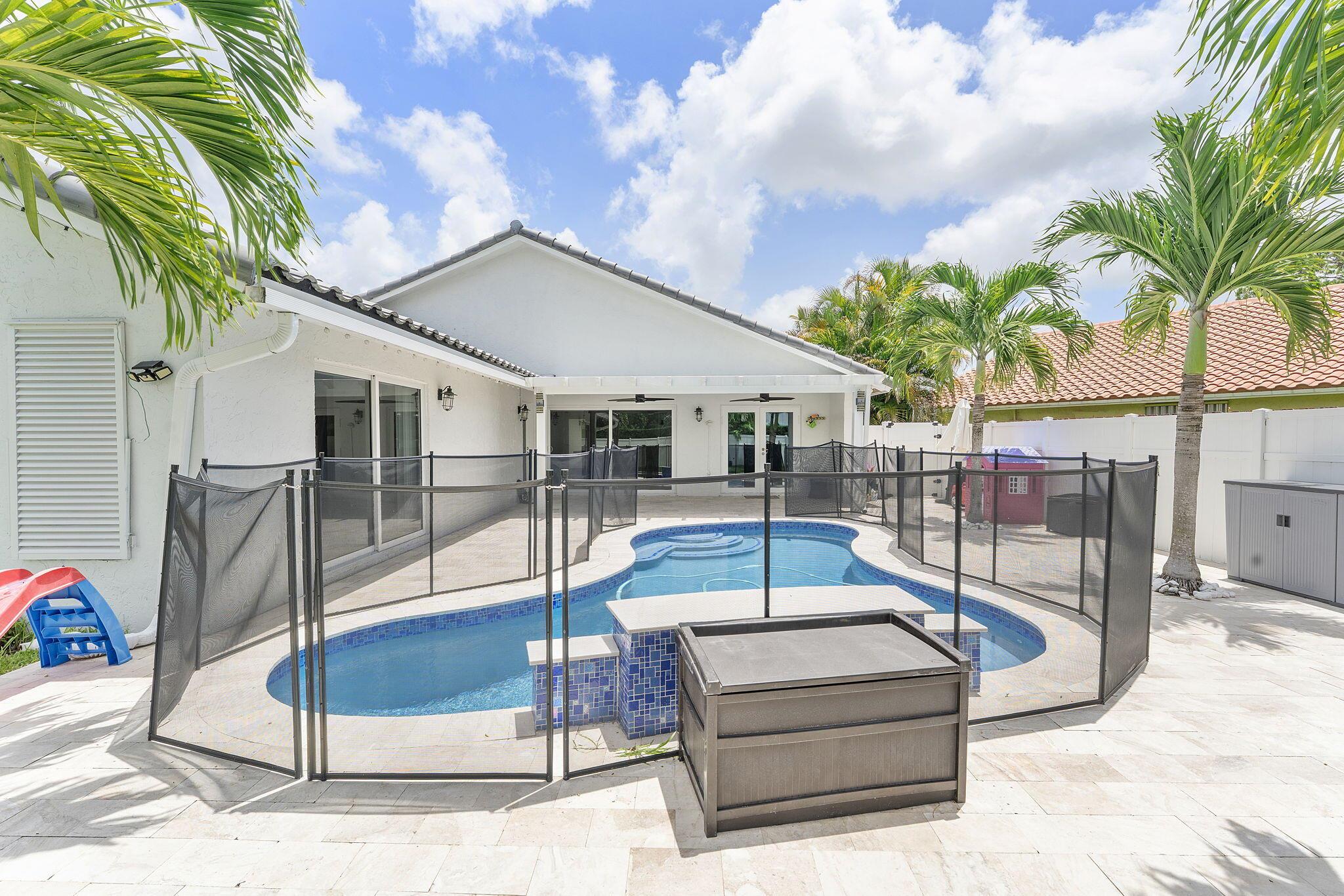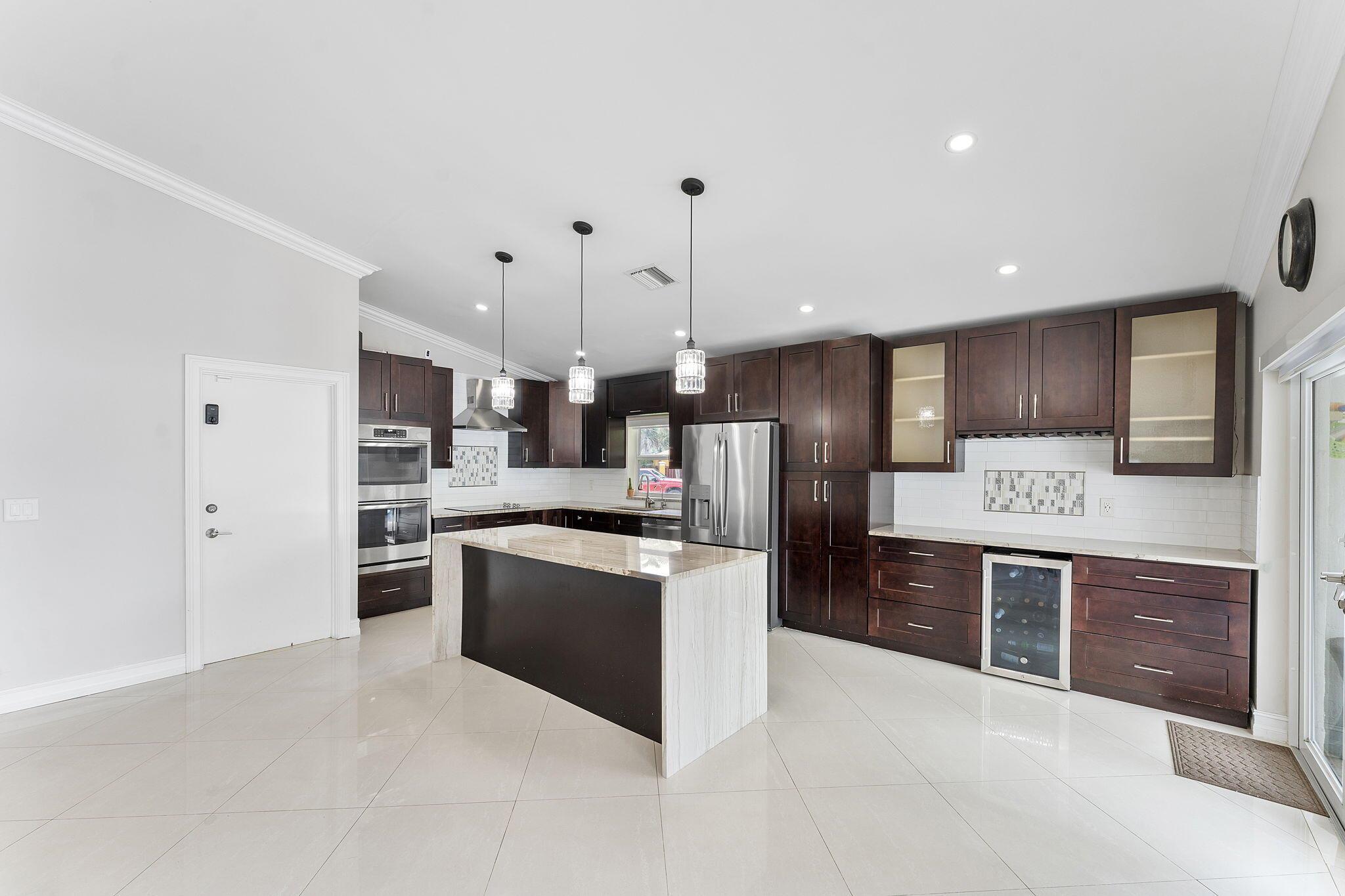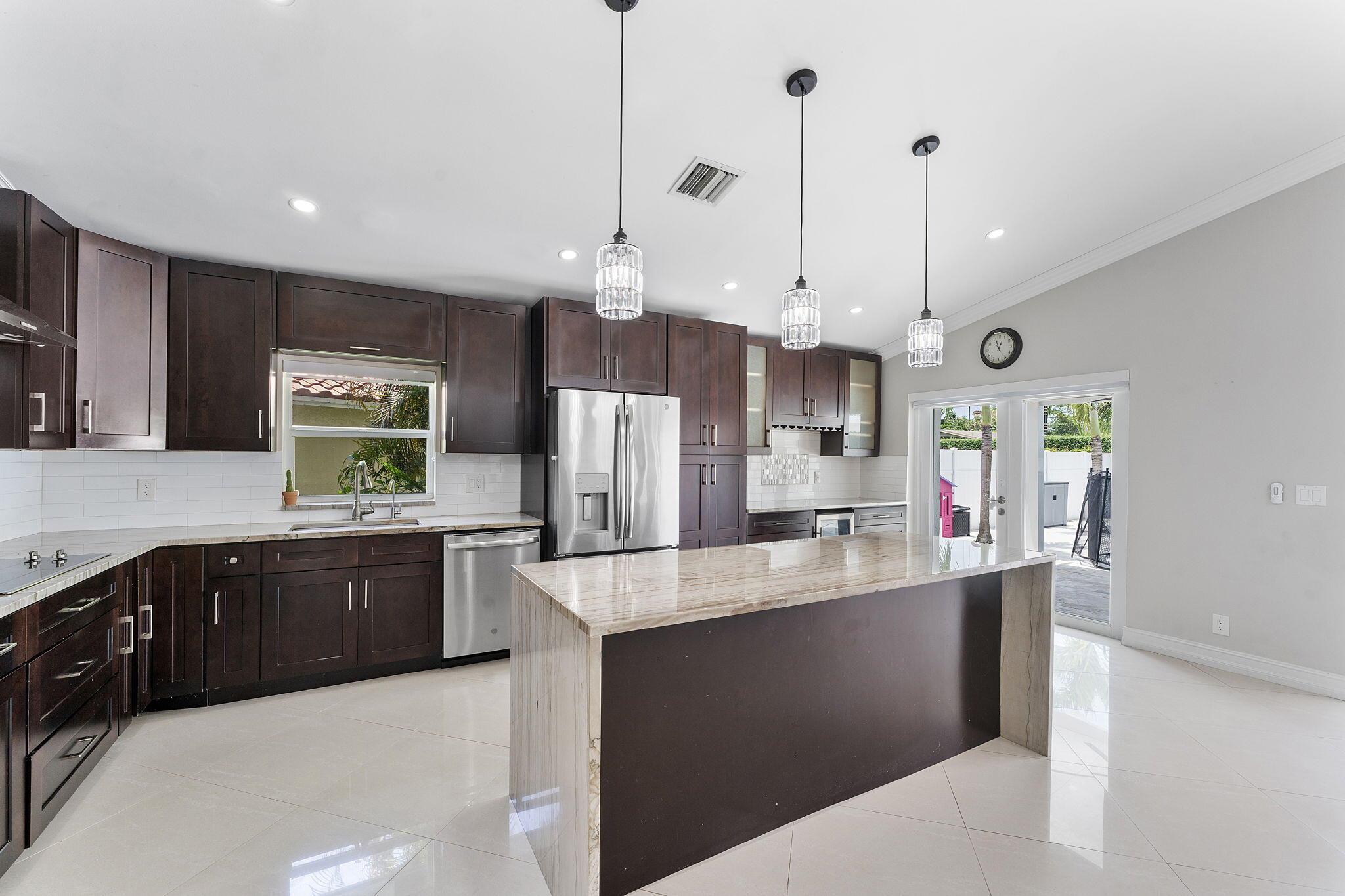 Welcome to this impressive 4-bedroom, 2.5-bathroom pool home with a 2-car garage, perfectly situated on an ultra-private lot just steps from top-rated Del Prado Elementary. Completely renovated from top to bottom with no expense spared, this stunning residence offers refined elegance and modern comfort in the heart of Central Boca Raton. Discover an open and airy layout with soaring vaulted ceilings and sleek porcelain tile flooring throughout. The spacious, chef-inspired kitchen is a true showstopper featuring quartz countertops with a waterfall edge, soft-close cabinetry, and premium stainless steel appliances. Enjoy indoor-outdoor living with a screened patio that opens to a lushly landscaped backyard oasis, complete with a sparkling tropical pool and fully fenced yard