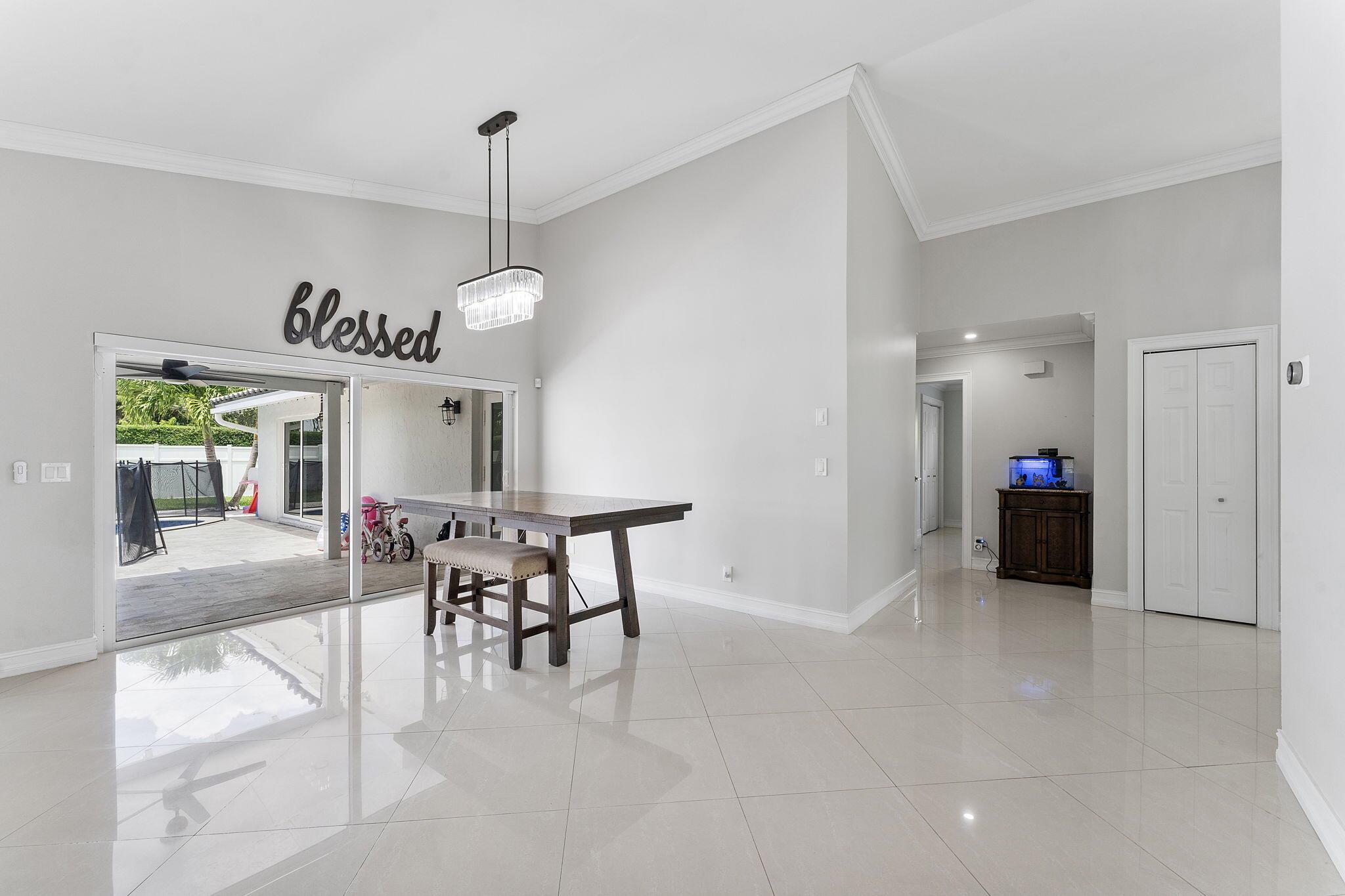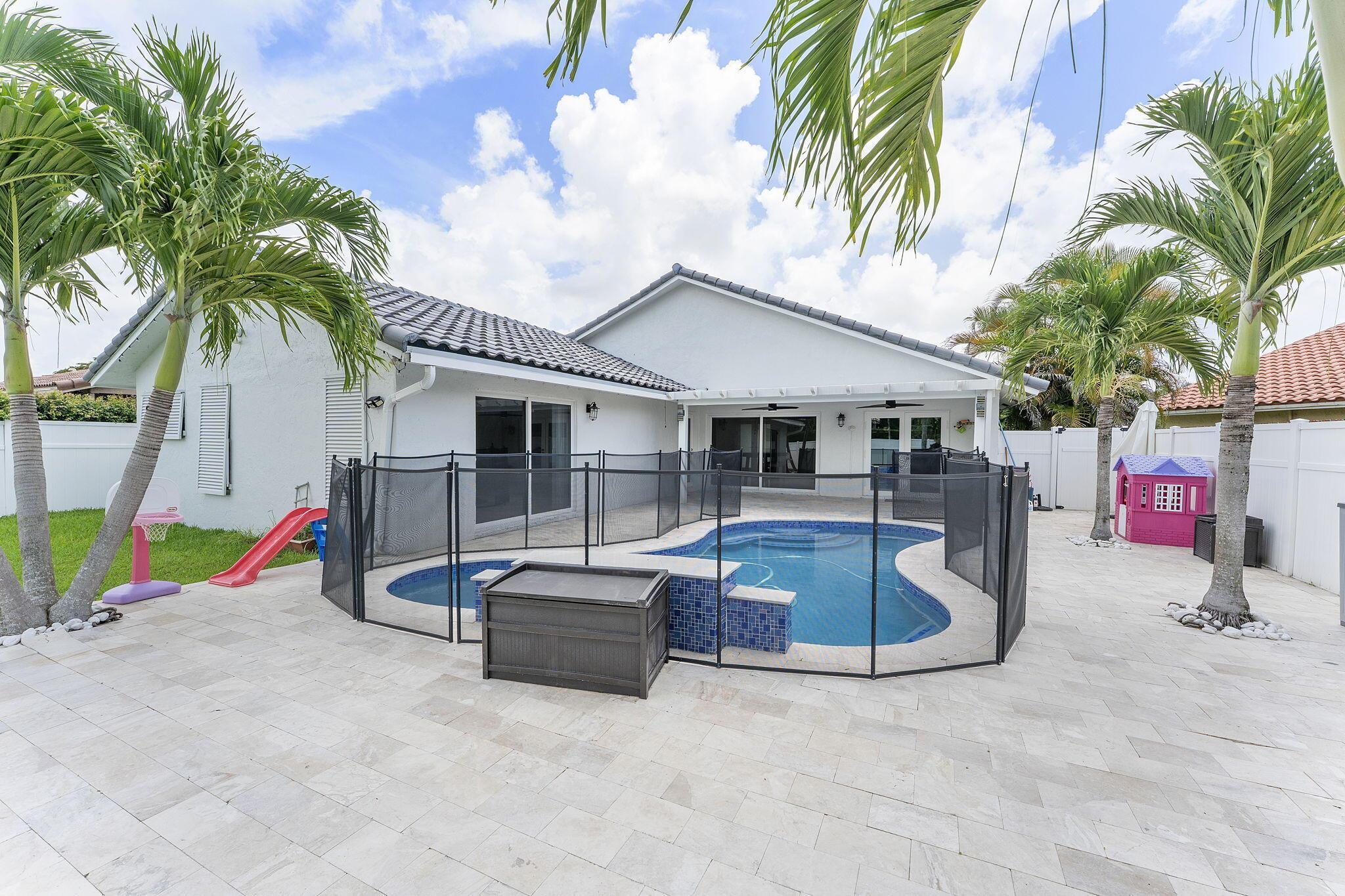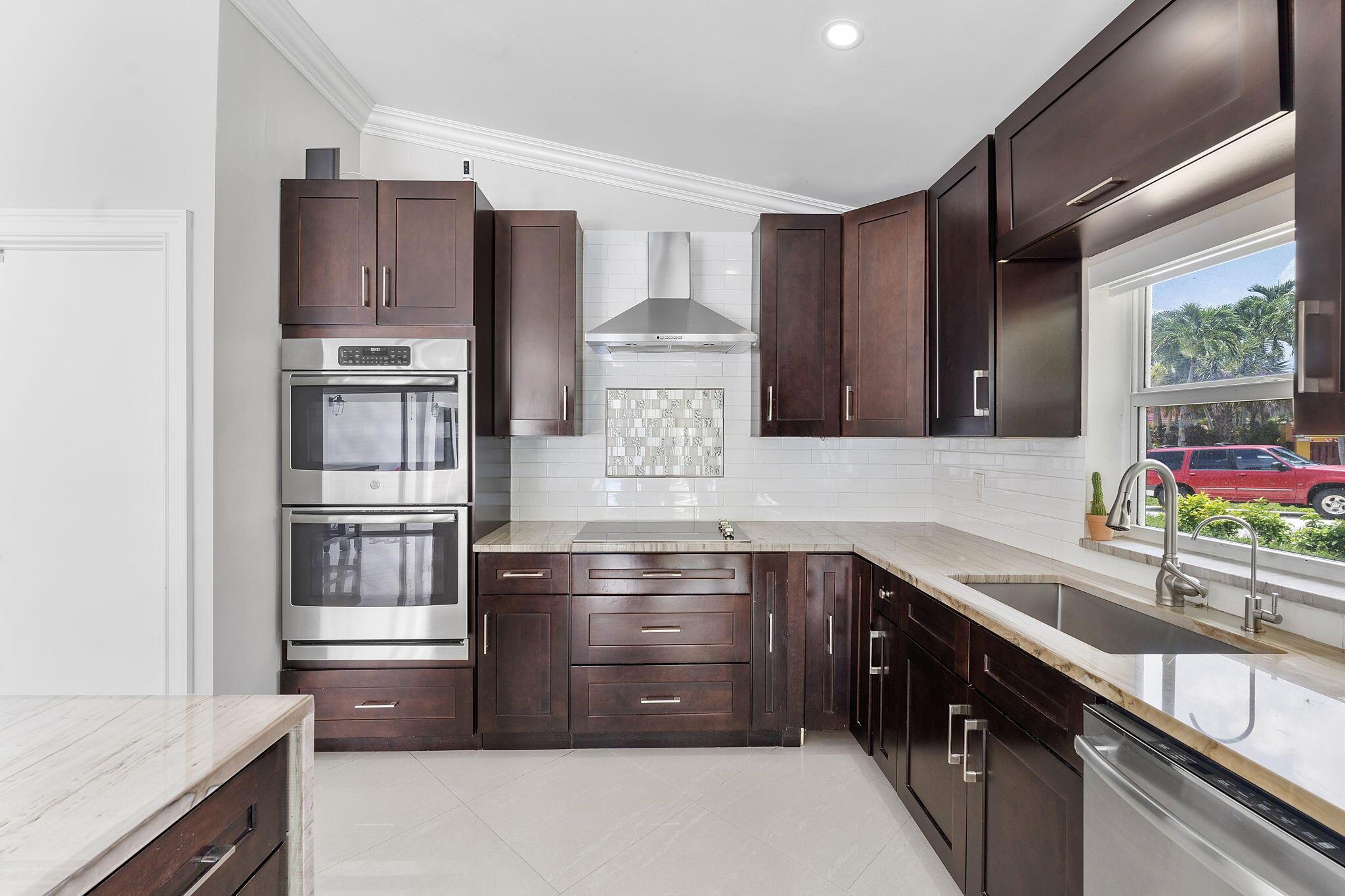 Welcome to this impressive 4-bedroom, 2.5-bathroom pool home with a 2-car garage, perfectly situated on an ultra-private lot just steps from top-rated Del Prado Elementary. Completely renovated from top to bottom with no expense spared, this stunning residence offers refined elegance and modern comfort in the heart of Central Boca Raton. Discover an open and airy layout with soaring vaulted ceilings and sleek porcelain tile flooring throughout. The spacious, chef-inspired kitchen is a true showstopper featuring quartz countertops with a waterfall edge, soft-close cabinetry, and premium stainless steel appliances. Enjoy indoor-outdoor living with a screened patio that opens to a lushly landscaped backyard oasis, complete with a sparkling tropical pool and fully fenced yard