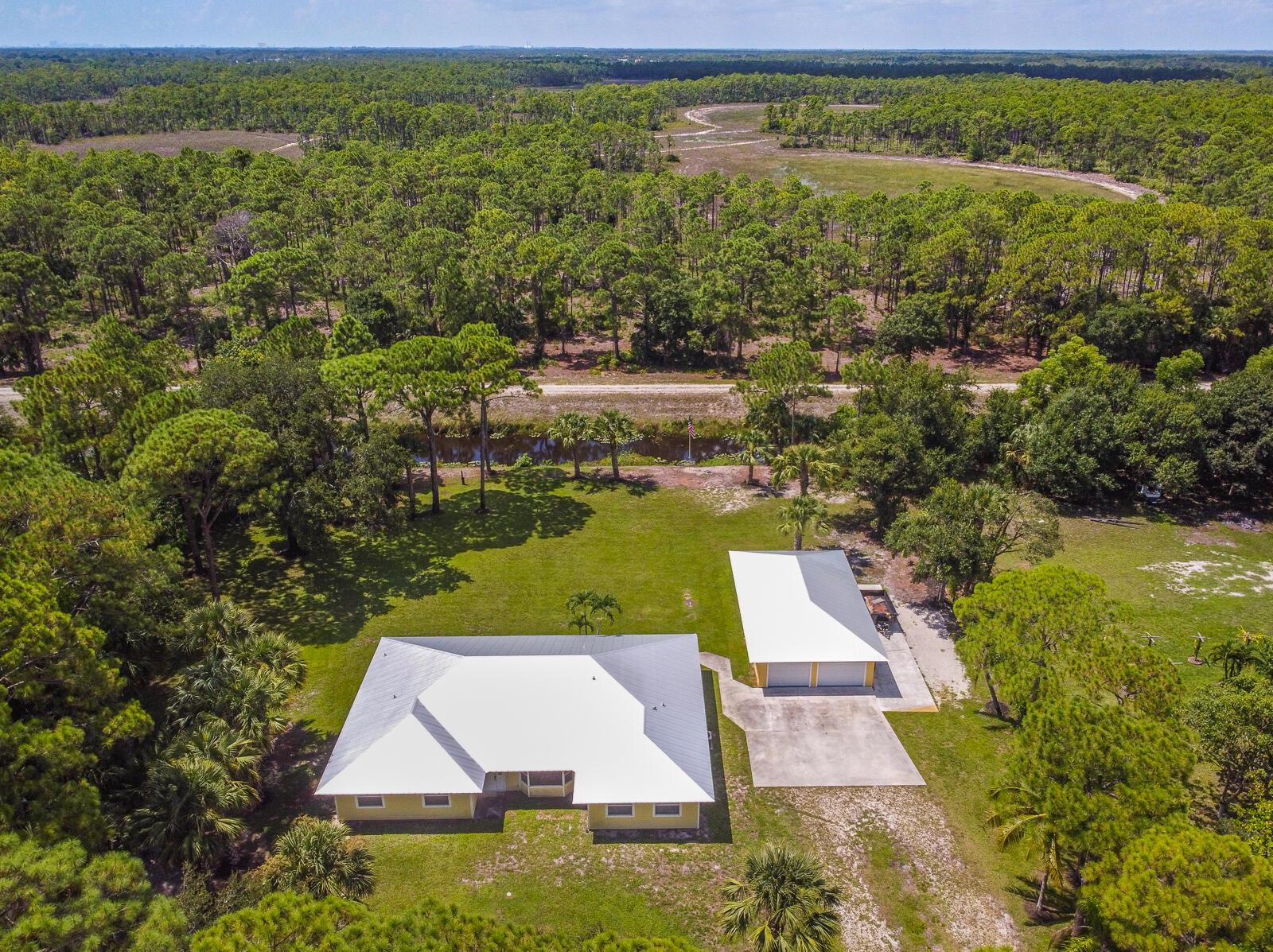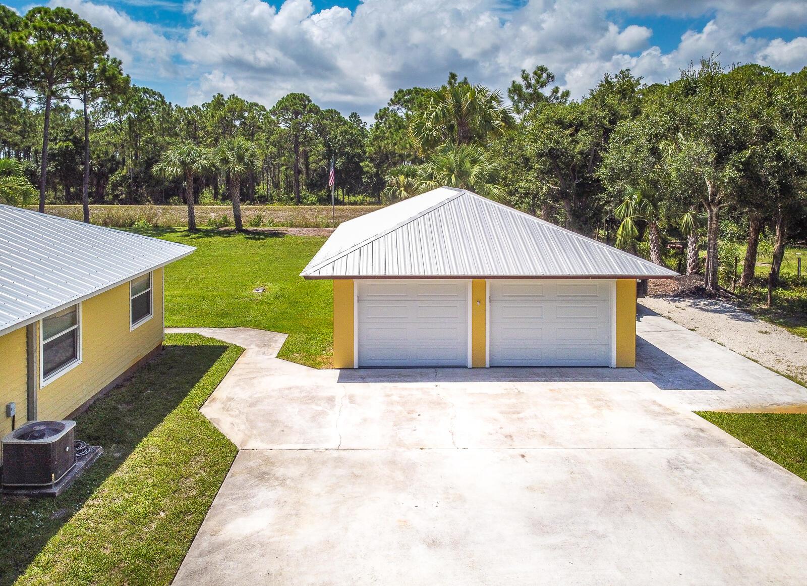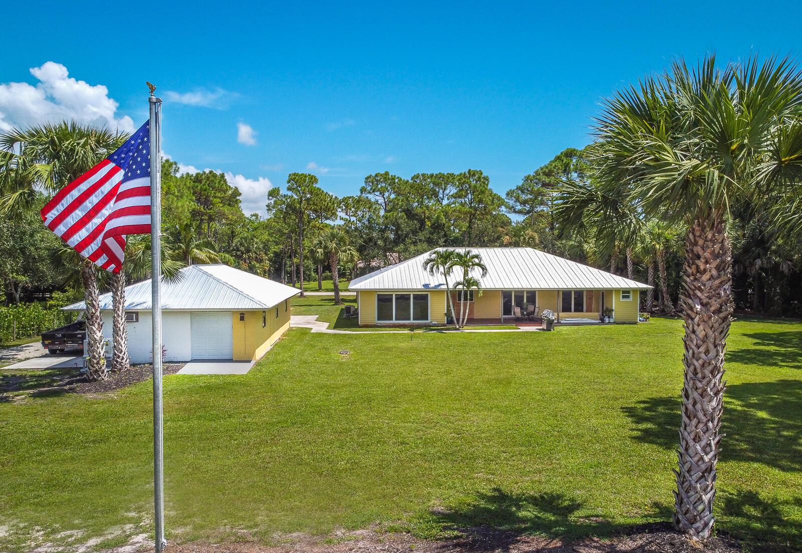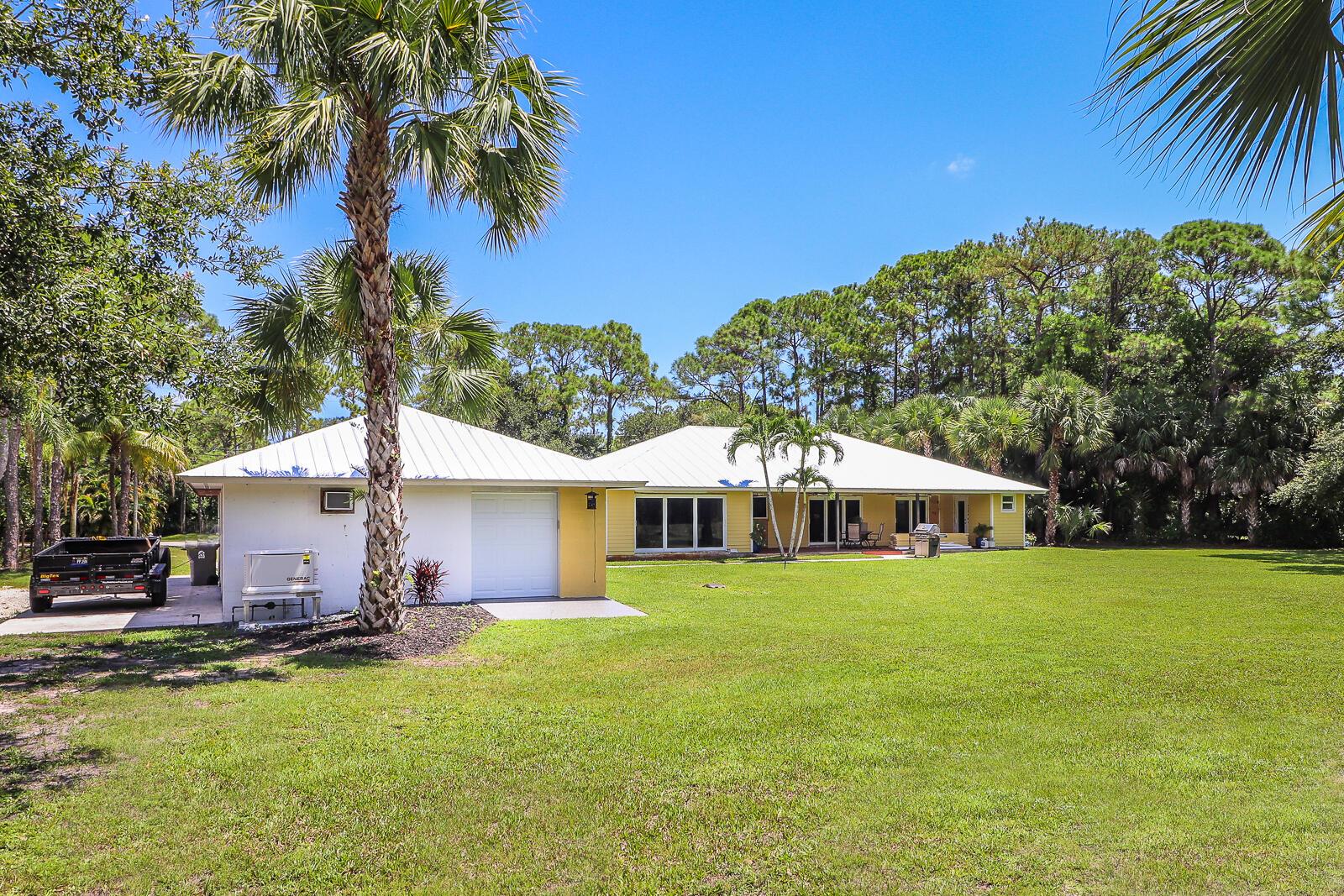 This 4BR/3BA home with a detached 24'x45' garage is the perfect project home - situated on one of the nicest properties in Palm Beach Country Estates: a RARE 1.34-acre lot on a paved road that backs up to a canal and 10,000-acre nature preserve. The interior has been partially gutted down to the studs - ready for new drywall, kitchen, electrical, flooring, etc. Many improvements already installed: NEW metal roof on both house and garage in 2023; NEW 26kW Generac whole-house generator with 1,000 gallon buried propane tank stubbed out for additional future hookups; NEW PGT hurricane impact sliders and cabana door. Two of the three bathrooms are newly-updated.