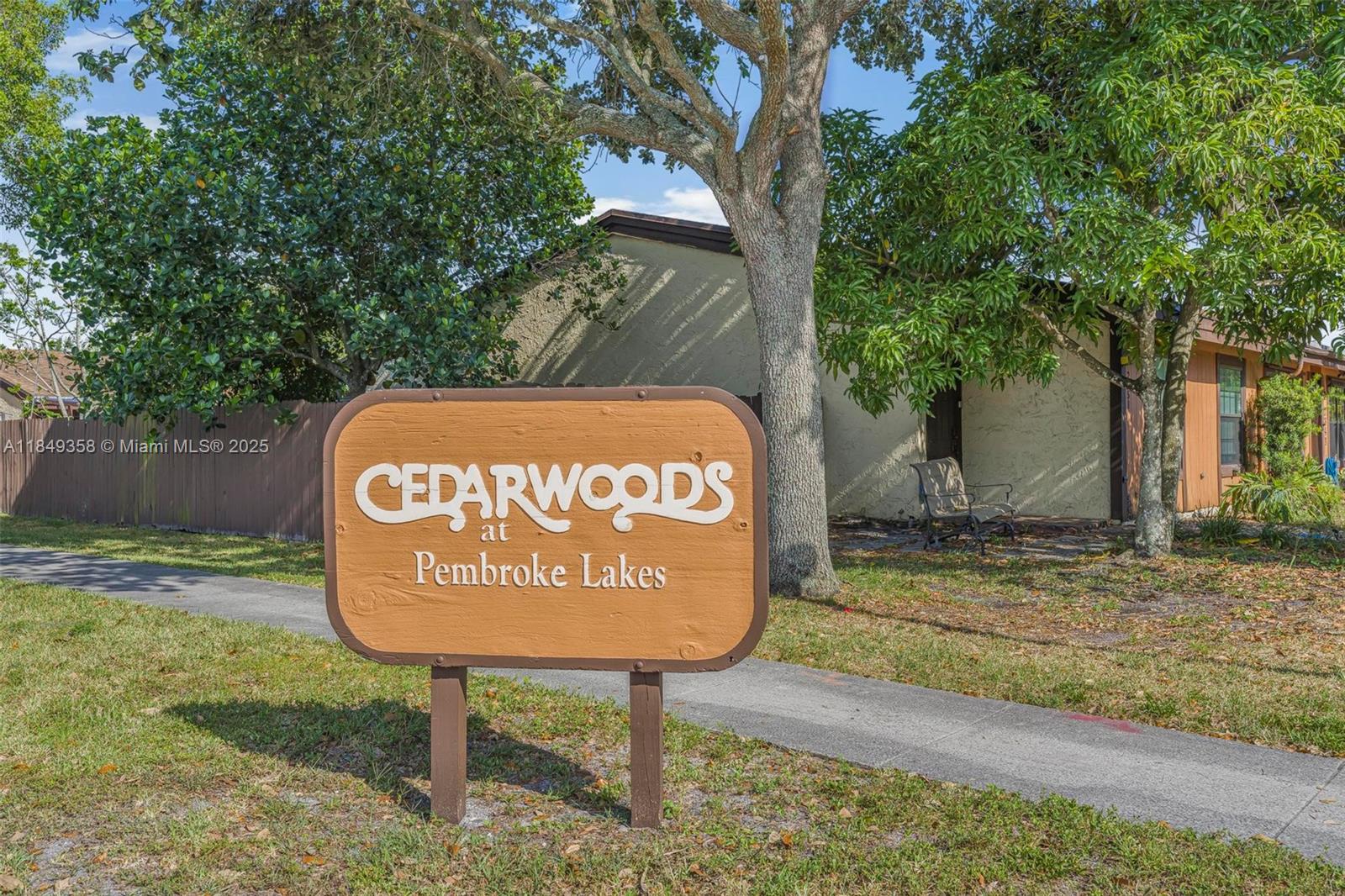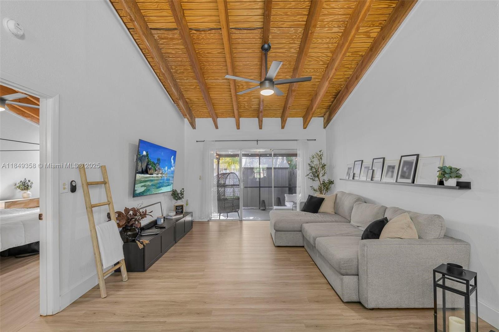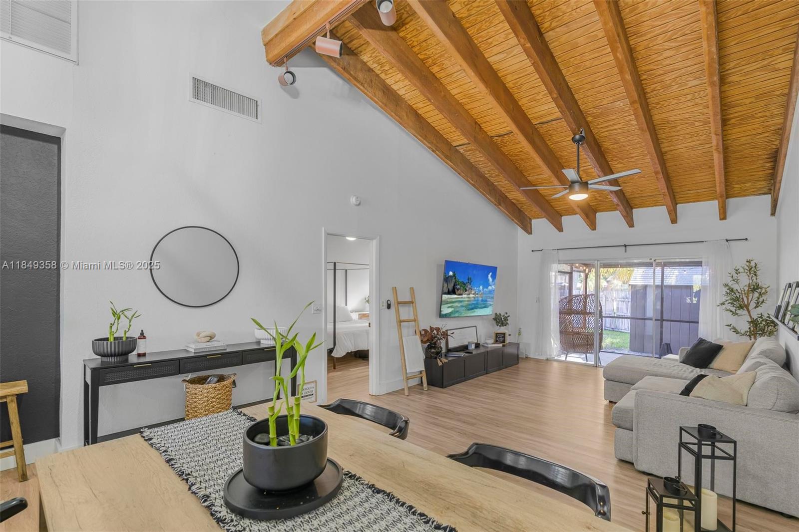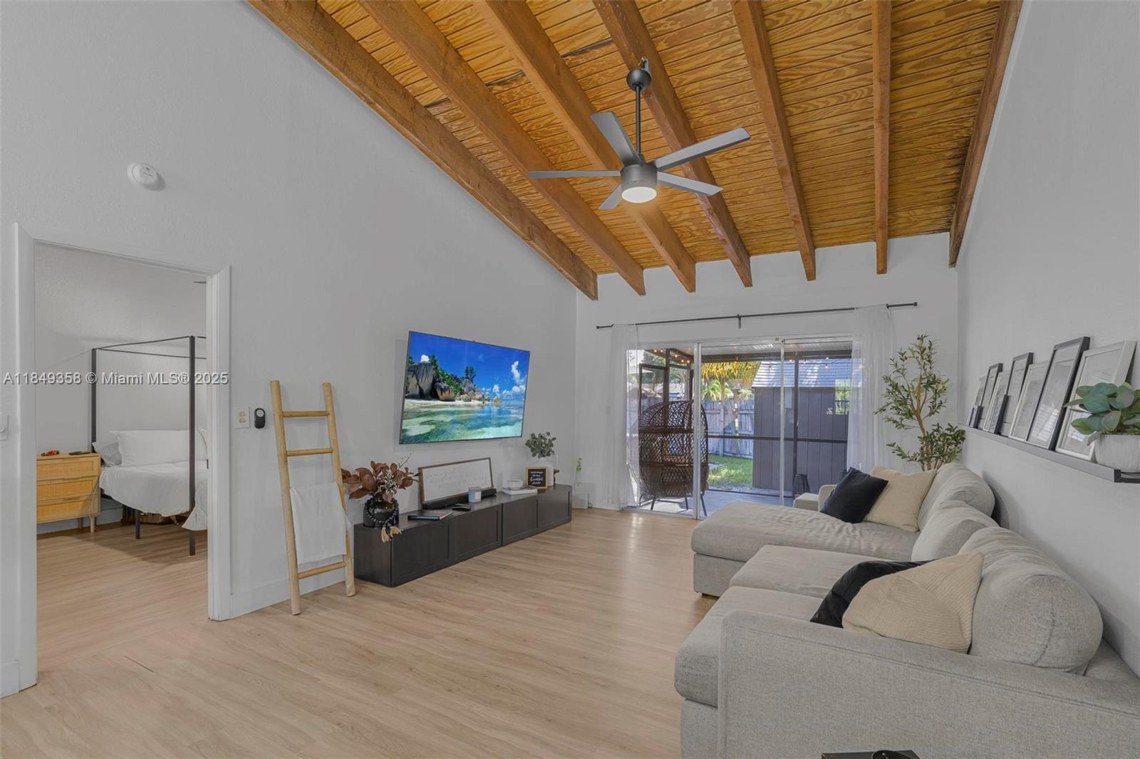 Exquisite 2-bedroom, 2-bath home in the highly desirable Cedarwoods at Pembroke Lakes. This stunning corner unit boasts soaring vaulted ceilings with exposed wood beams, a modern open-concept layout, and warm natural light throughout. The sleek kitchen features white cabinetry, quartz countertops, stainless steel appliances, and a large island that flows seamlessly into the spacious living and dining areas. The primary bedroom includes a walk-in closet and a beautifully updated en-suite bath. Enjoy a private fenced yard with a screened patio, outdoor seating areas, and lush landscaping. Centrally located near shopping, dining, CB Smith Park, top-rated schools, and major highways, this turn-key home offers the perfect balance of comfort, design, and location.