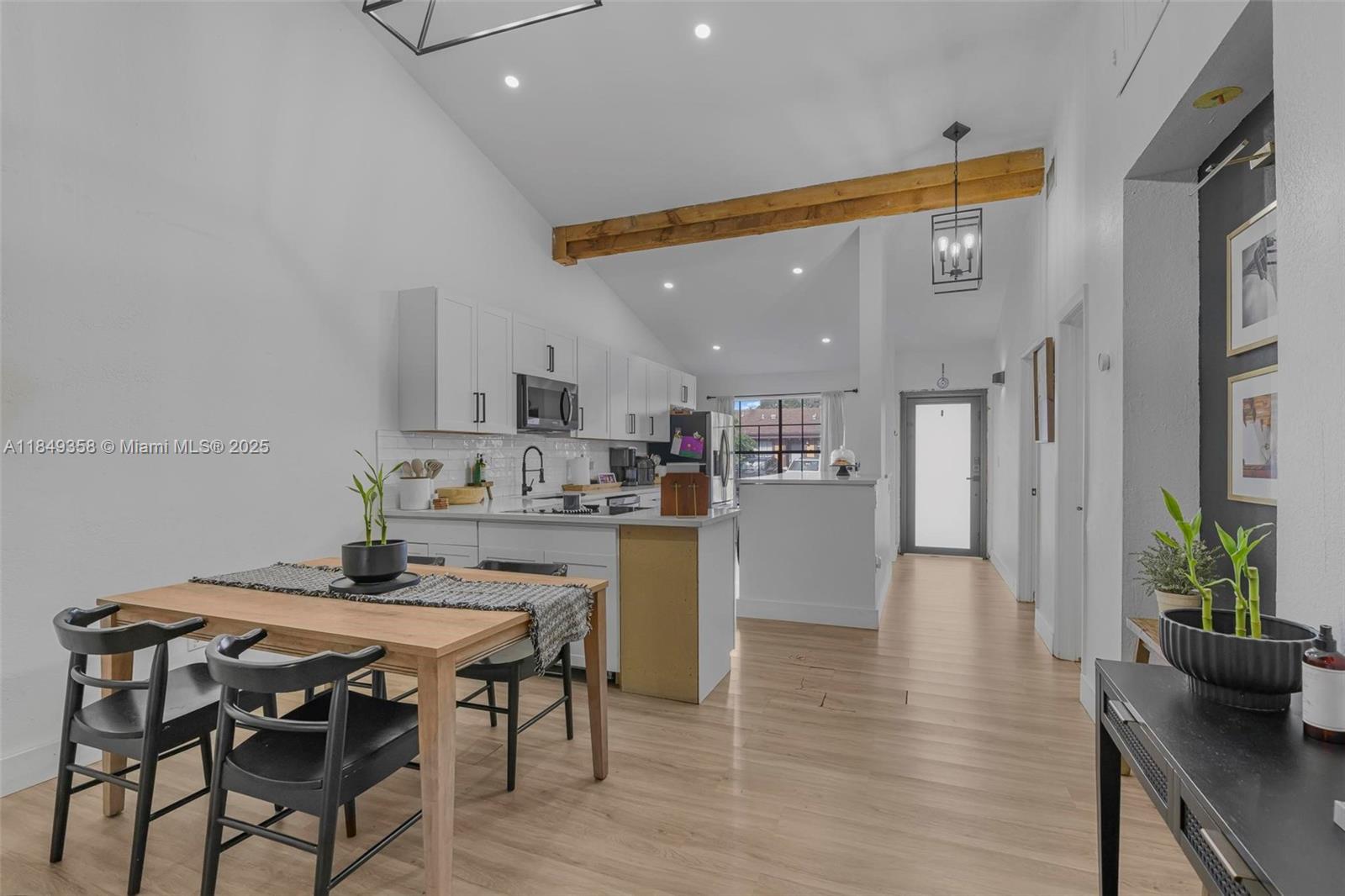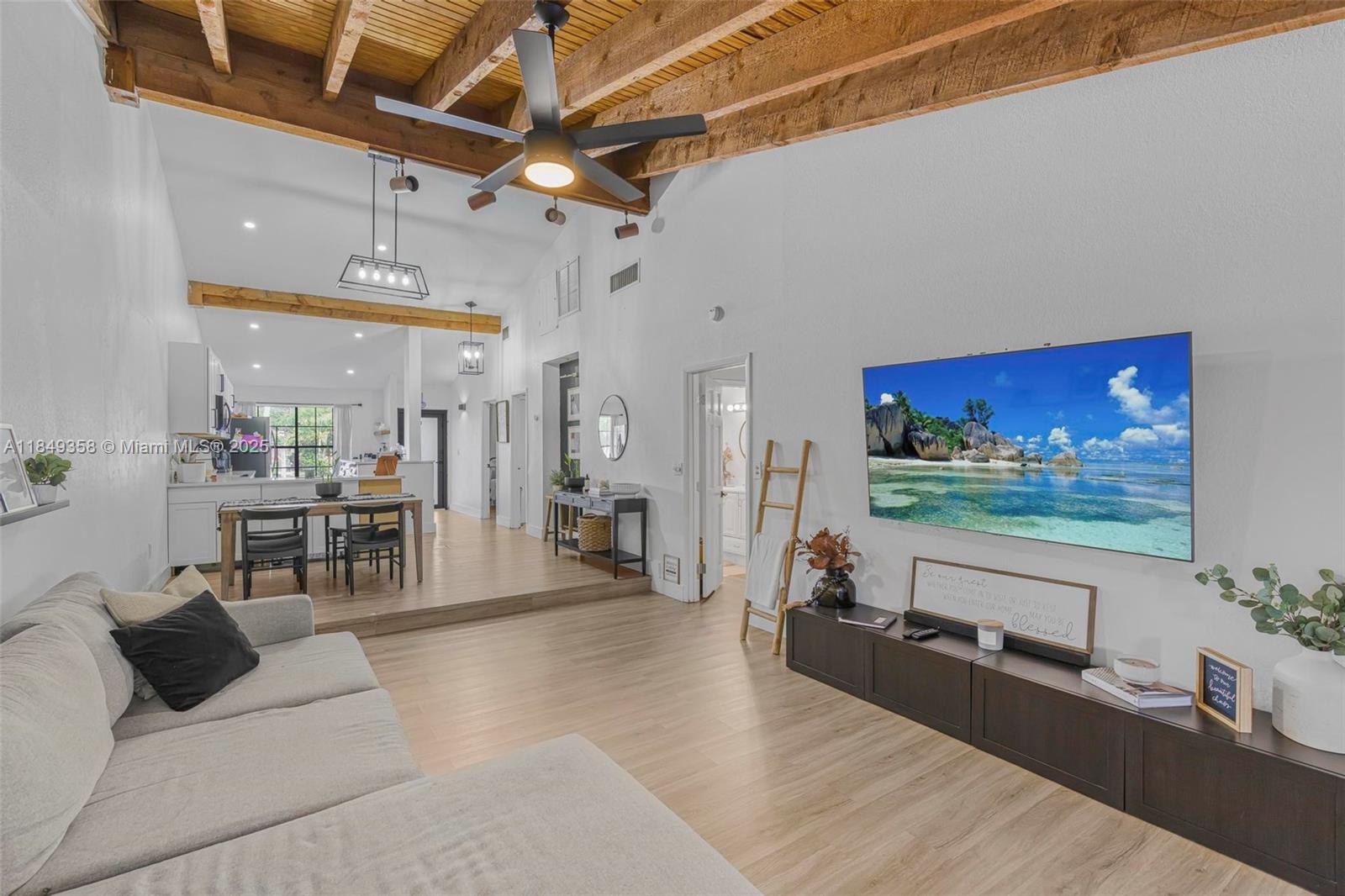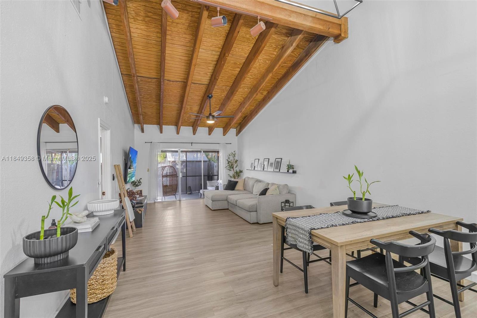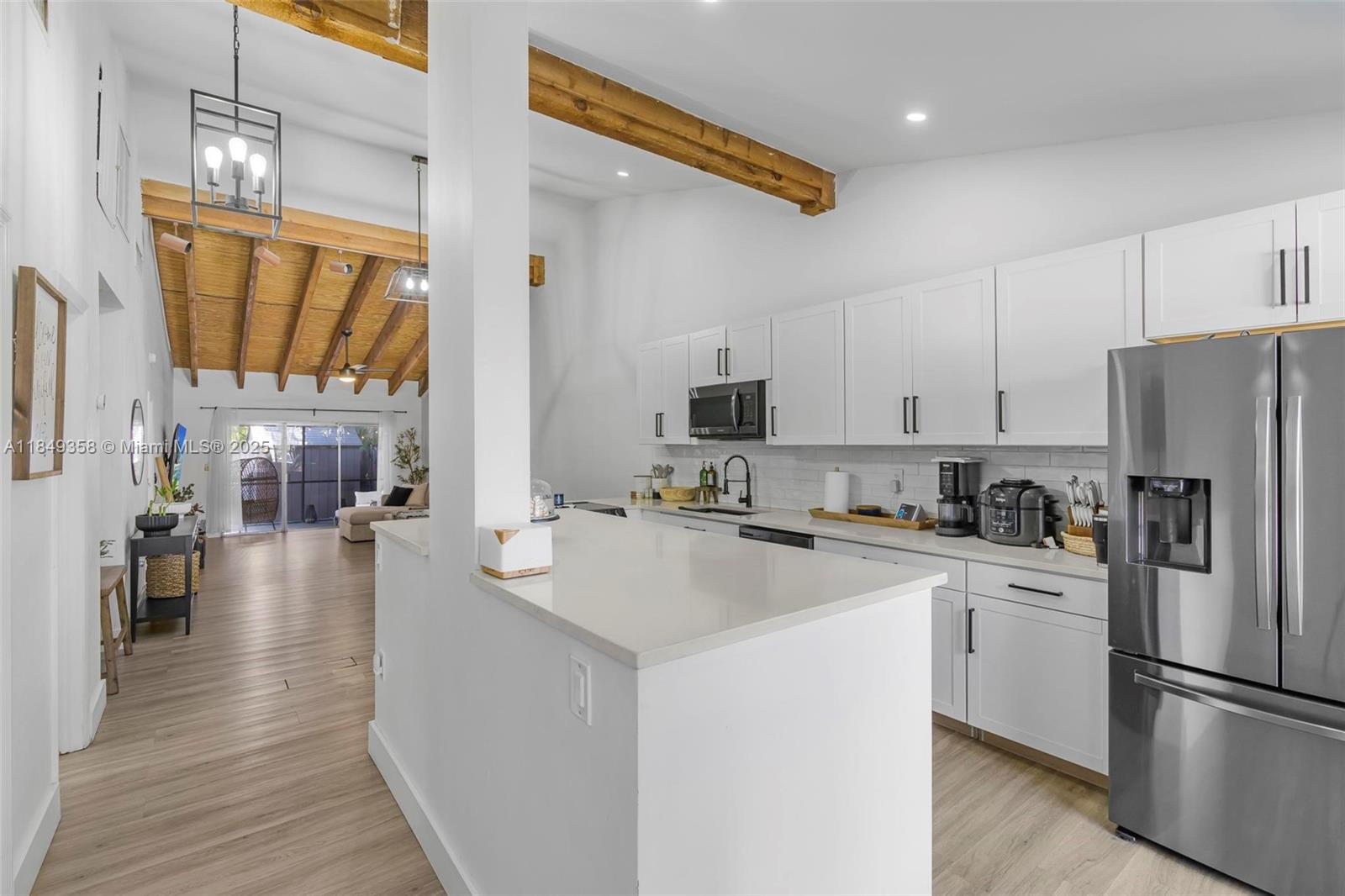 Exquisite 2-bedroom, 2-bath home in the highly desirable Cedarwoods at Pembroke Lakes. This stunning corner unit boasts soaring vaulted ceilings with exposed wood beams, a modern open-concept layout, and warm natural light throughout. The sleek kitchen features white cabinetry, quartz countertops, stainless steel appliances, and a large island that flows seamlessly into the spacious living and dining areas. The primary bedroom includes a walk-in closet and a beautifully updated en-suite bath. Enjoy a private fenced yard with a screened patio, outdoor seating areas, and lush landscaping. Centrally located near shopping, dining, CB Smith Park, top-rated schools, and major highways, this turn-key home offers the perfect balance of comfort, design, and location.