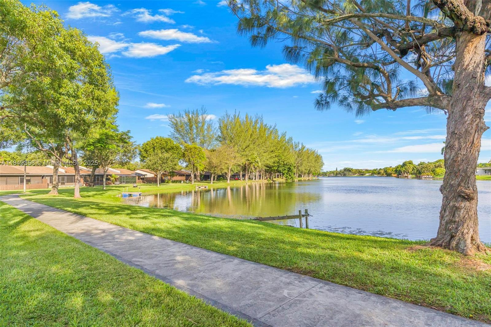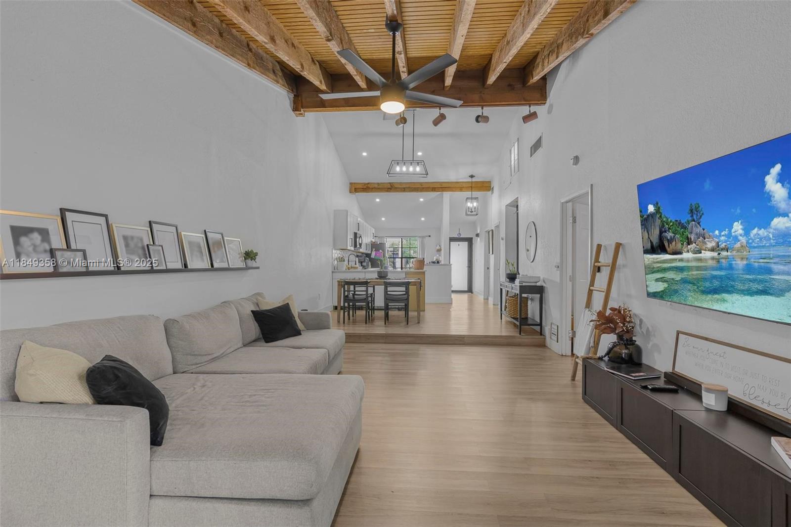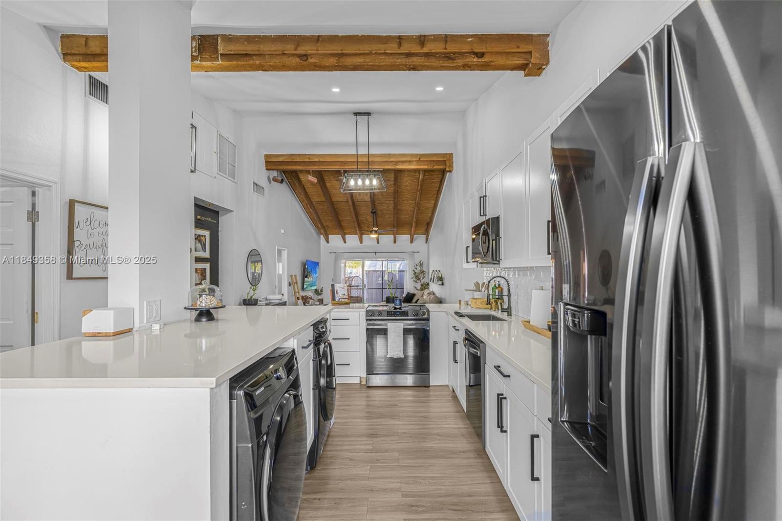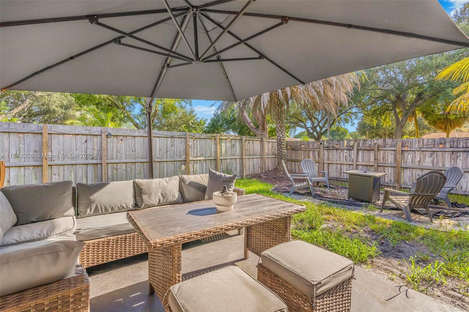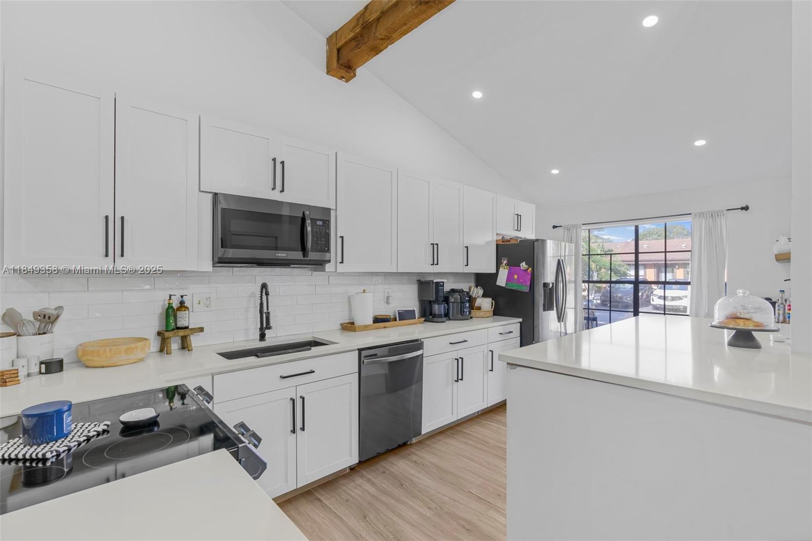 Exquisite 2-bedroom, 2-bath home in the highly desirable Cedarwoods at Pembroke Lakes. This stunning corner unit boasts soaring vaulted ceilings with exposed wood beams, a modern open-concept layout, and warm natural light throughout. The sleek kitchen features white cabinetry, quartz countertops, stainless steel appliances, and a large island that flows seamlessly into the spacious living and dining areas. The primary bedroom includes a walk-in closet and a beautifully updated en-suite bath. Enjoy a private fenced yard with a screened patio, outdoor seating areas, and lush landscaping. Centrally located near shopping, dining, CB Smith Park, top-rated schools, and major highways, this turn-key home offers the perfect balance of comfort, design, and location.