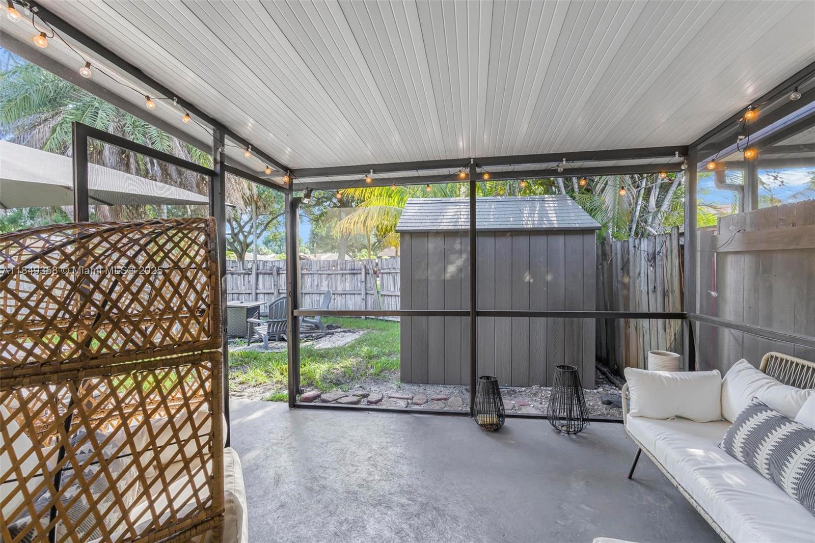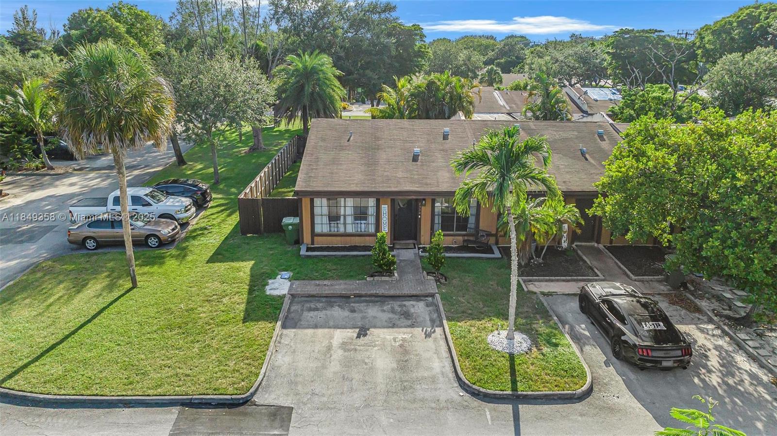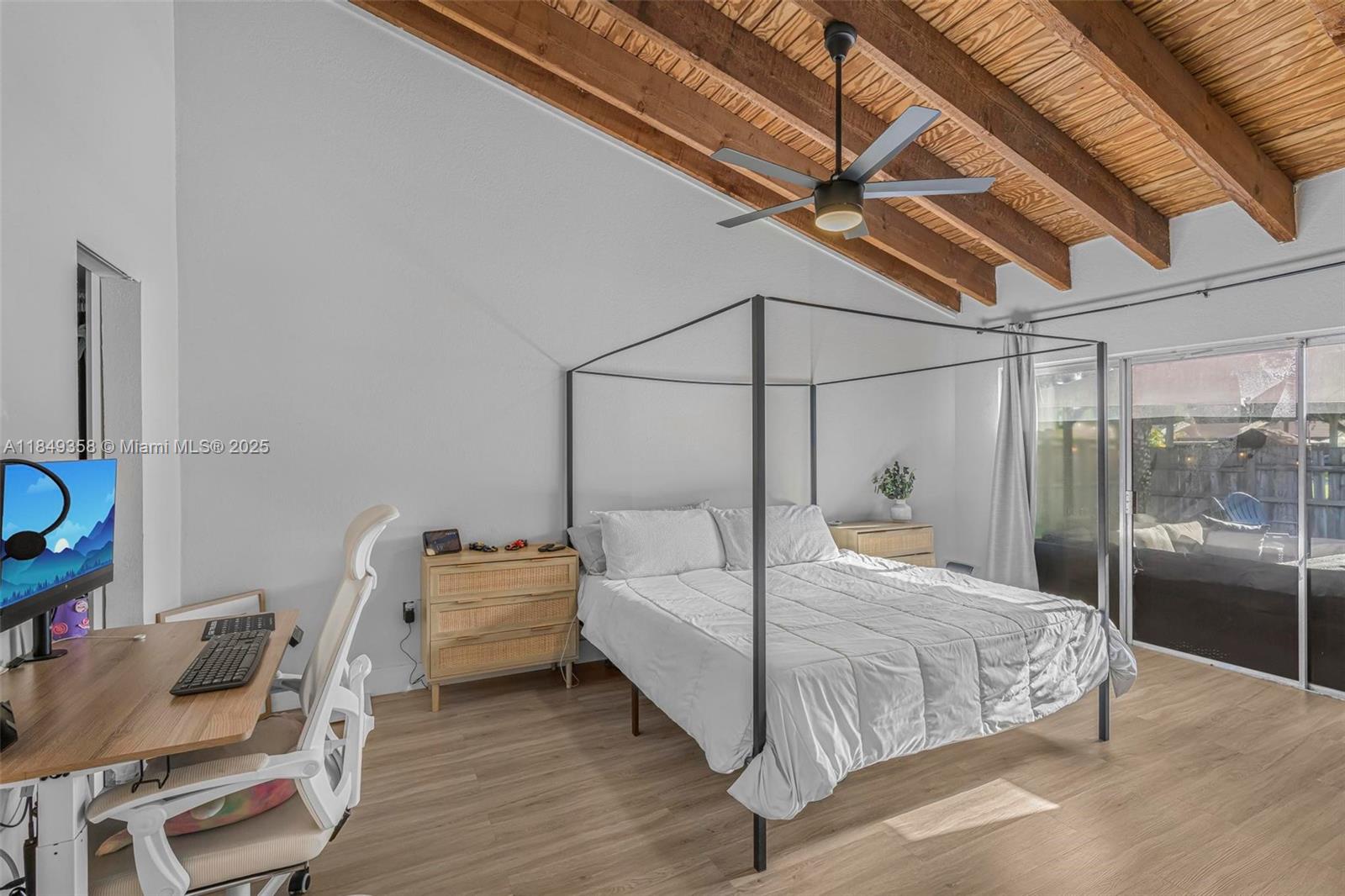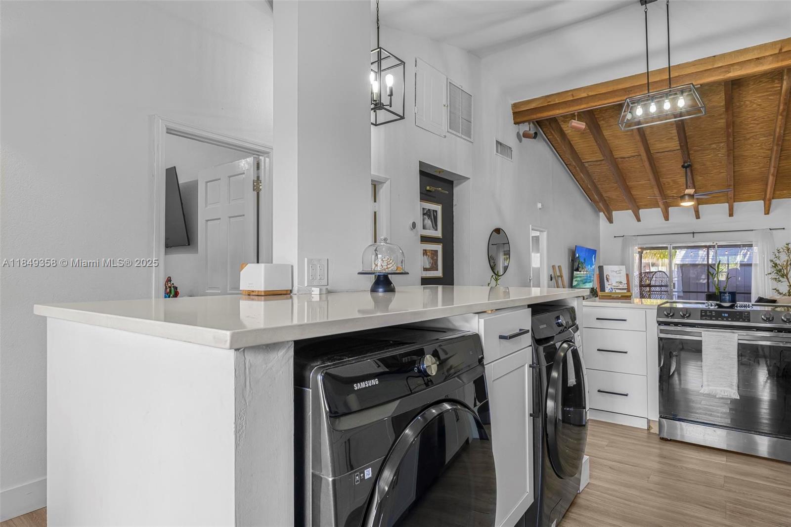 Exquisite 2-bedroom, 2-bath home in the highly desirable Cedarwoods at Pembroke Lakes. This stunning corner unit boasts soaring vaulted ceilings with exposed wood beams, a modern open-concept layout, and warm natural light throughout. The sleek kitchen features white cabinetry, quartz countertops, stainless steel appliances, and a large island that flows seamlessly into the spacious living and dining areas. The primary bedroom includes a walk-in closet and a beautifully updated en-suite bath. Enjoy a private fenced yard with a screened patio, outdoor seating areas, and lush landscaping. Centrally located near shopping, dining, CB Smith Park, top-rated schools, and major highways, this turn-key home offers the perfect balance of comfort, design, and location.