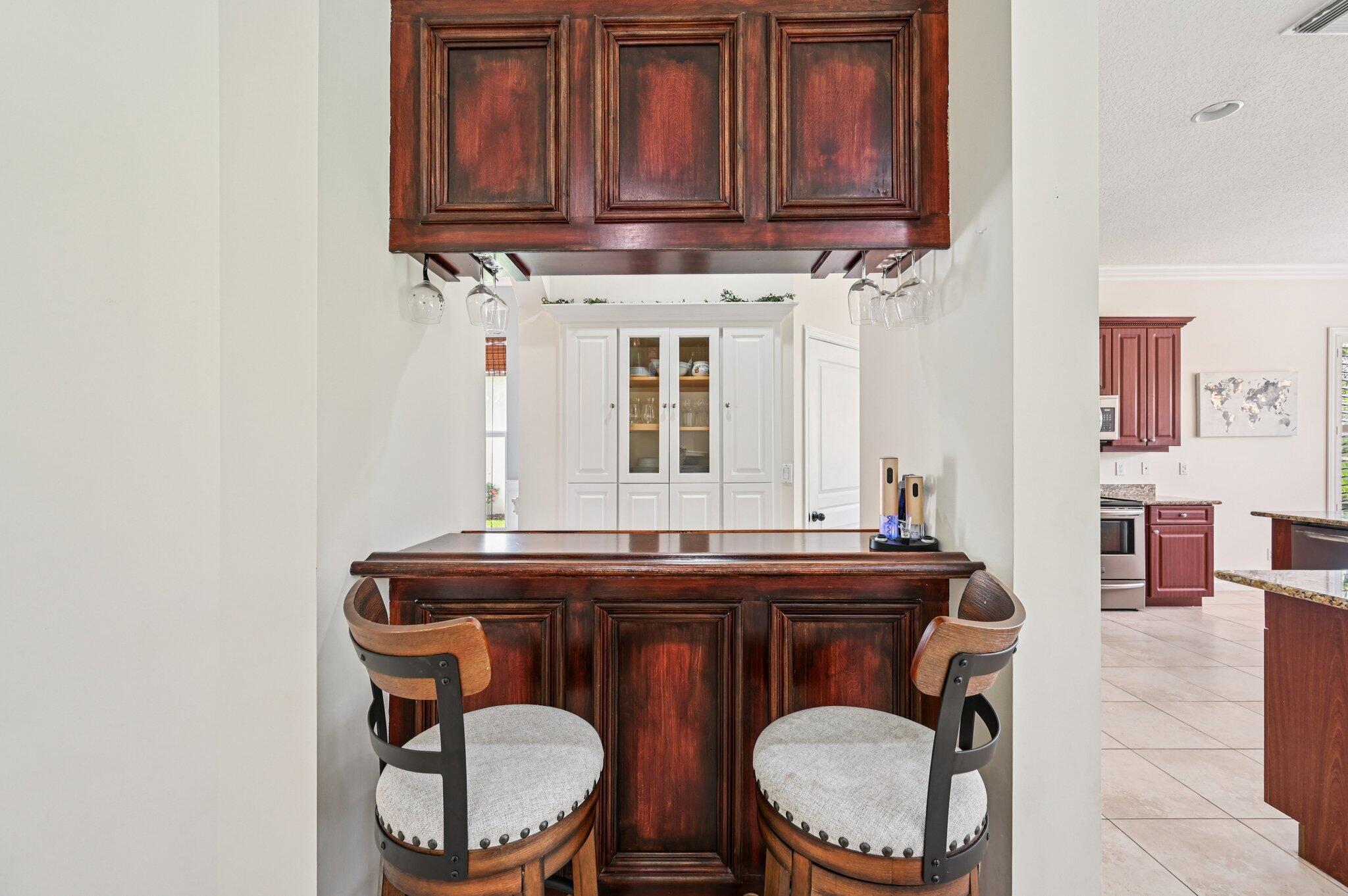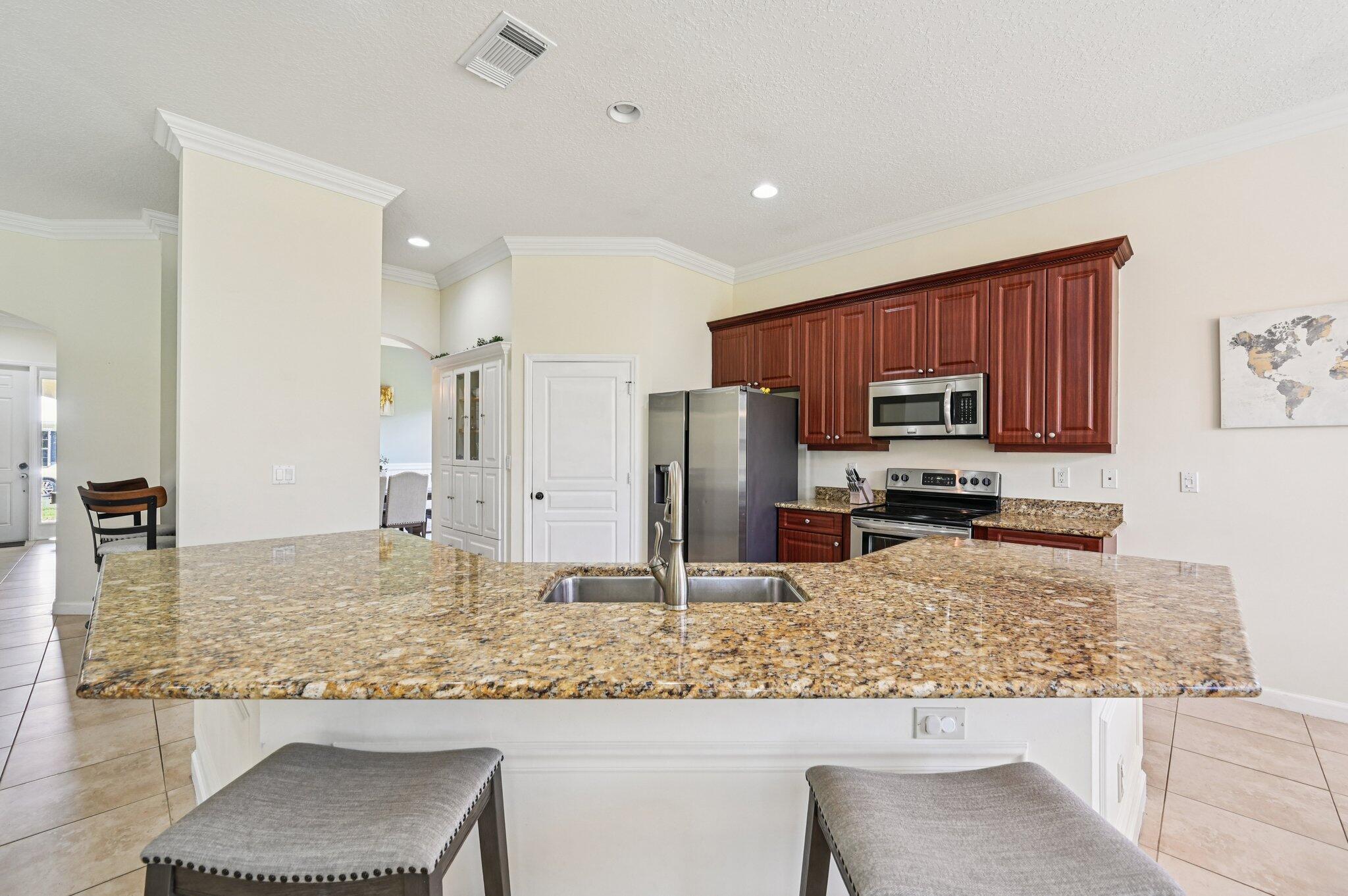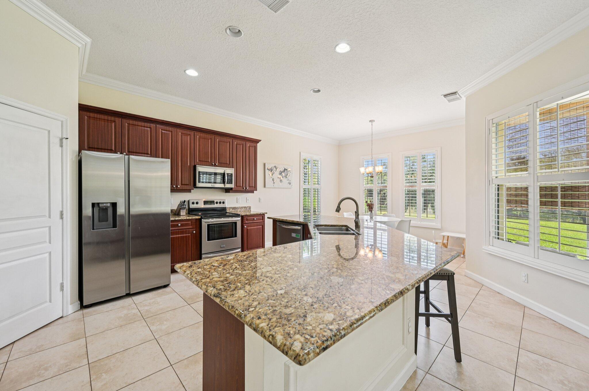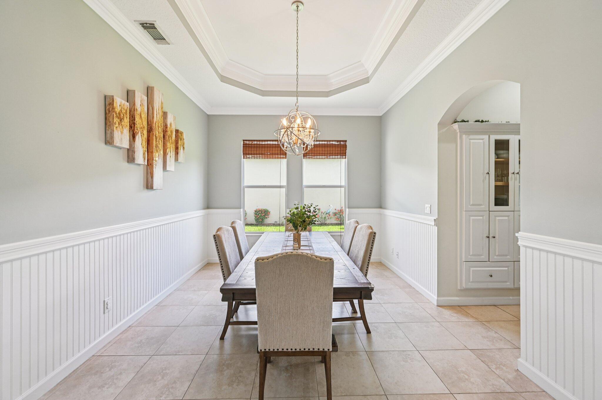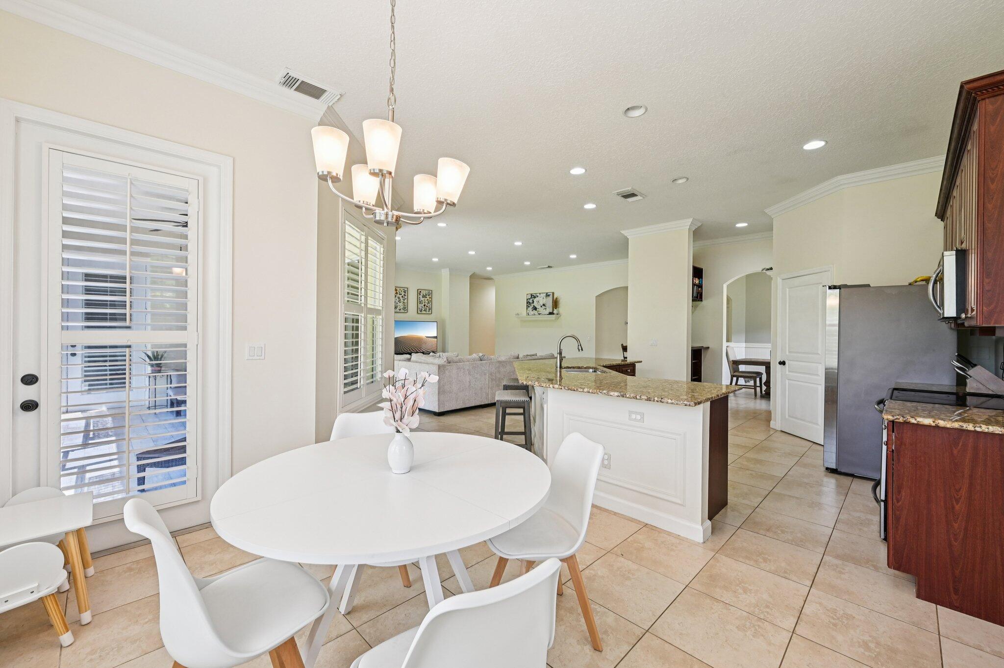 Charming Curb Appeal with Spacious Interior & Resort-Style Living! This inviting home captures attention with its eye-catching curb appeal, featuring three architectural dormers and a spacious front porch that sets the tone for relaxed Florida living. Just inside, you'll be drawn in by the spacious open floor plan, featuring a large family room and tile flooring throughout the main living areas. A custom-built bar area adds the perfect touch for entertaining guests. The dedicated office includes built-in shelving for ample storage, and the formal dining room impresses with coved ceilings and detailed wainscoting. The expansive kitchen offers granite countertops, stainless steel appliances, a large pantry, center island seating, and a breakfast area -